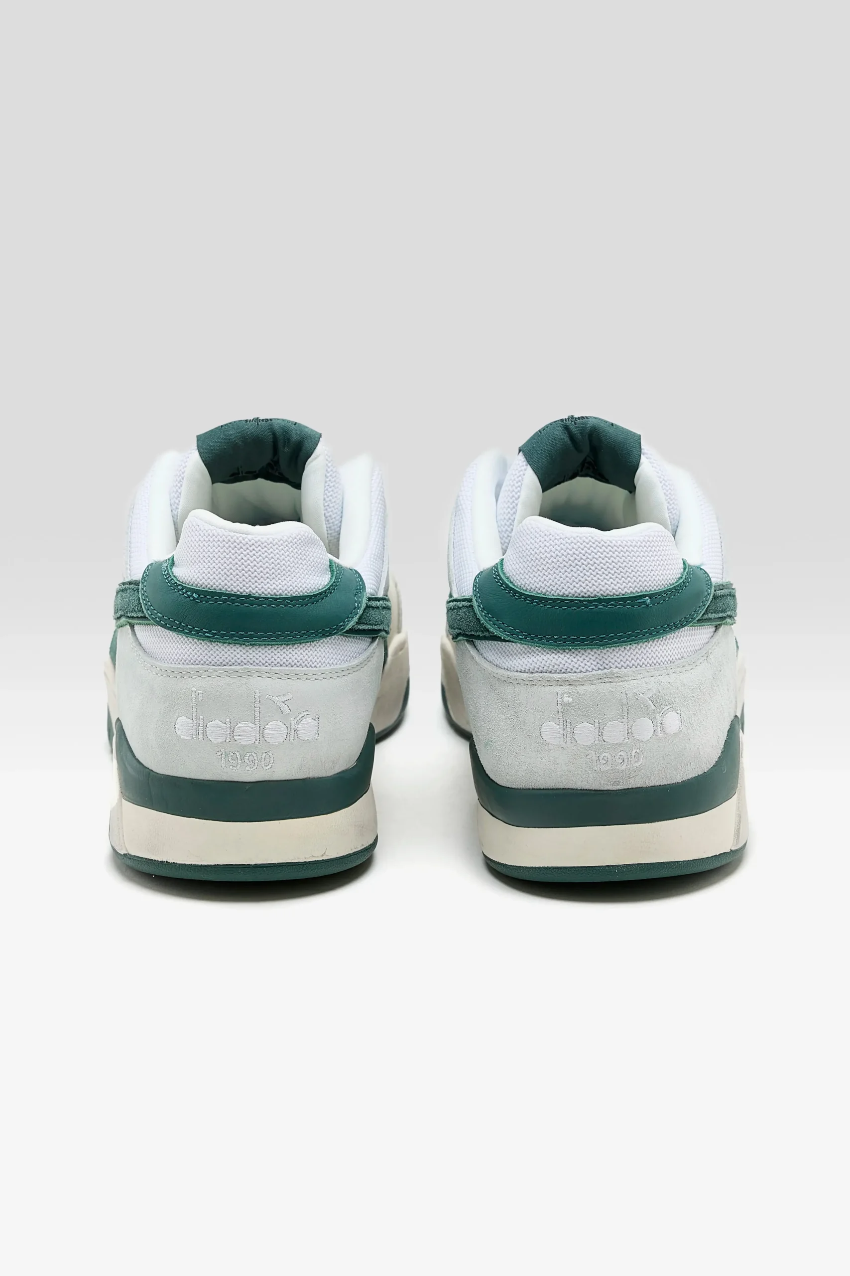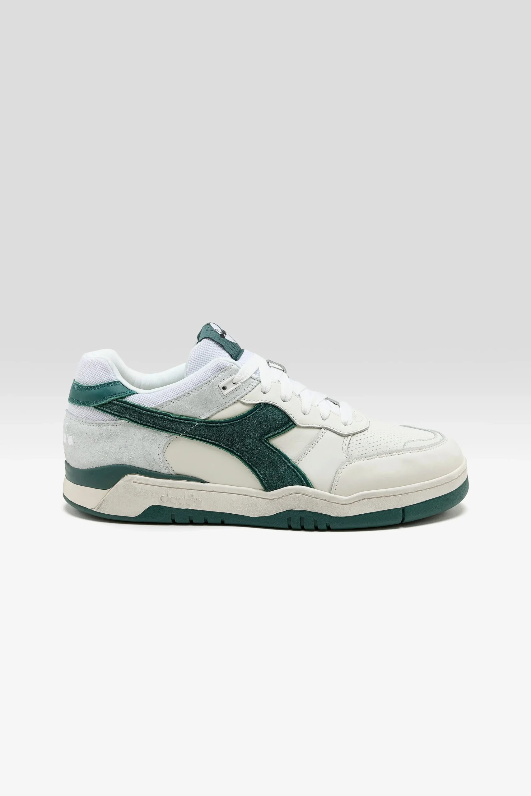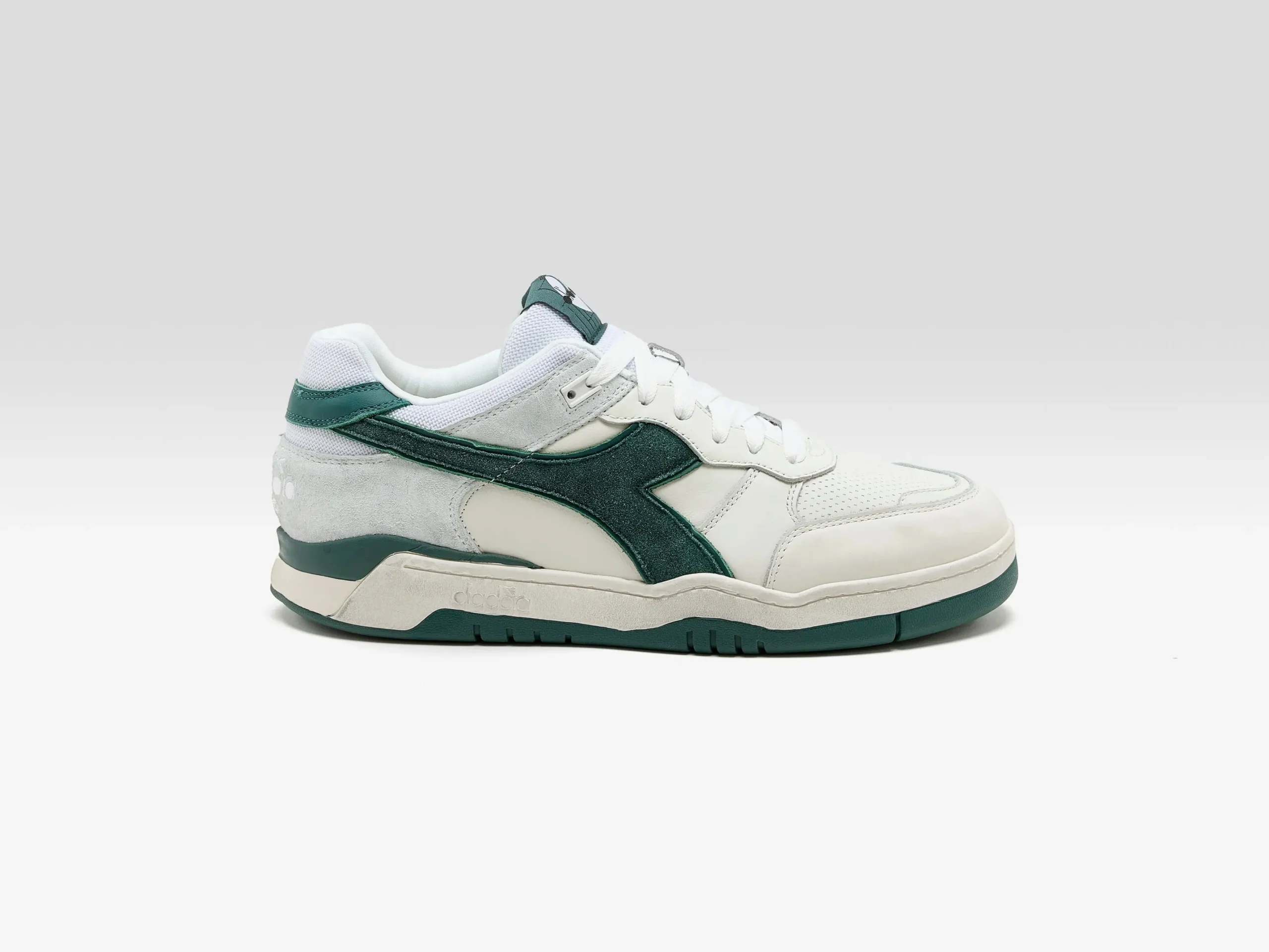 The Diadora B.560 Used heritage sneaker features a full-grain leather upper with canvas, micro-punched details, a waxed treatment, and stone-washed for a vintage effect.