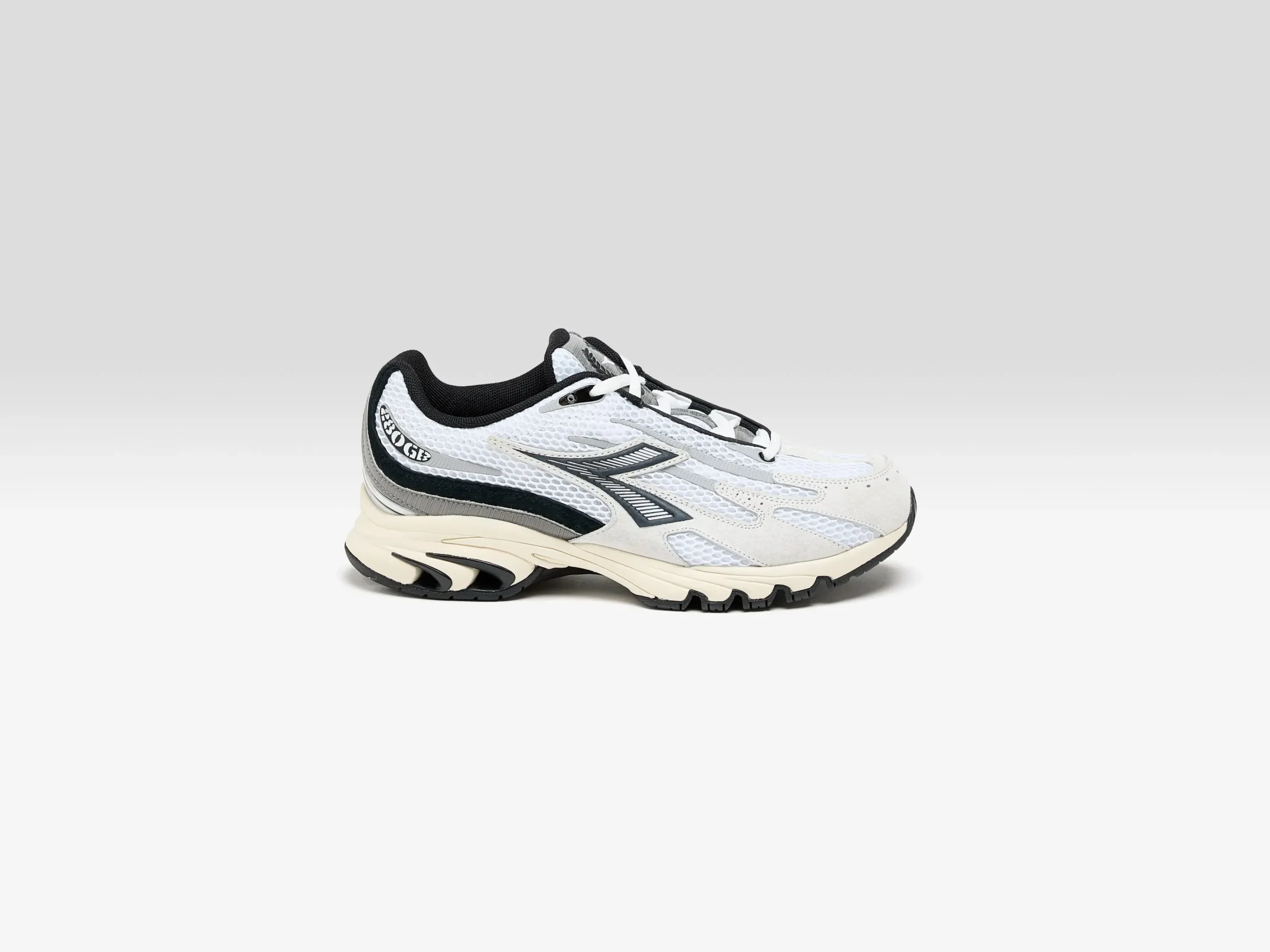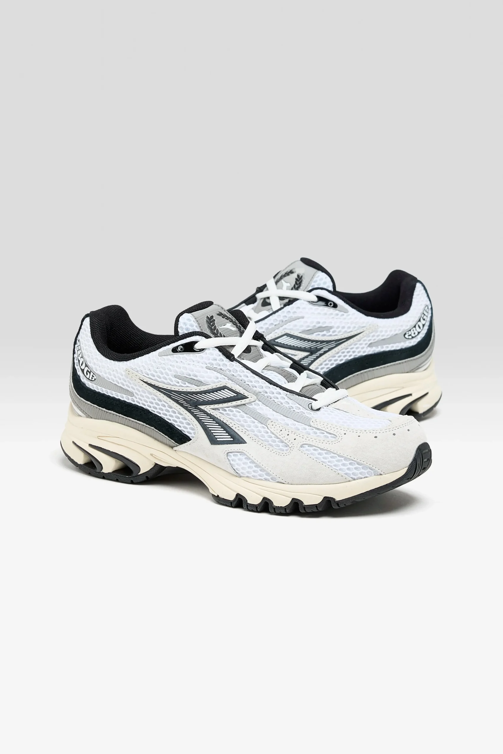 The Diadora Mythos Propulsion 280 Mascotte sport sneakers feature an open mesh upper, pigskin nubuck inserts, and 3D prints.