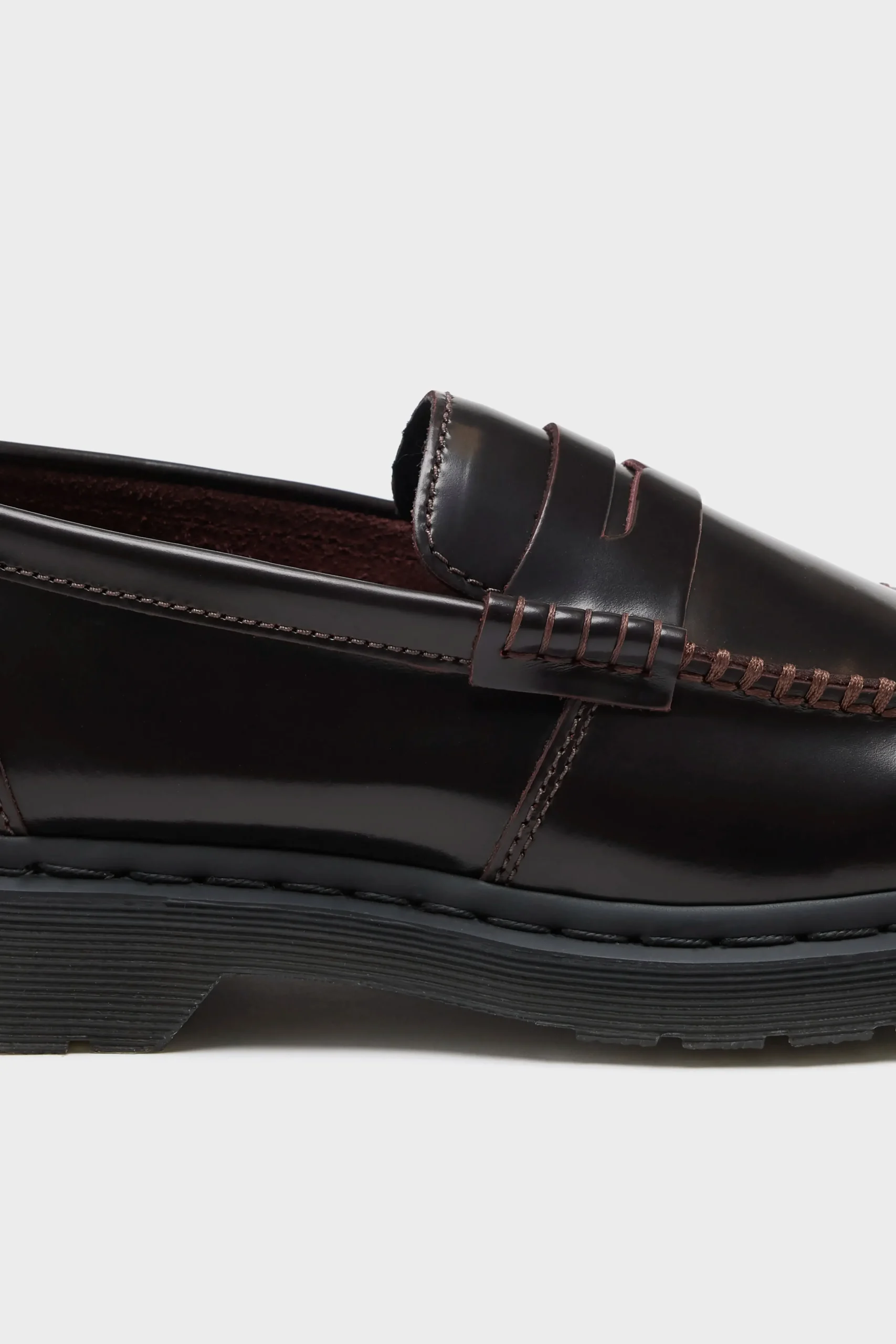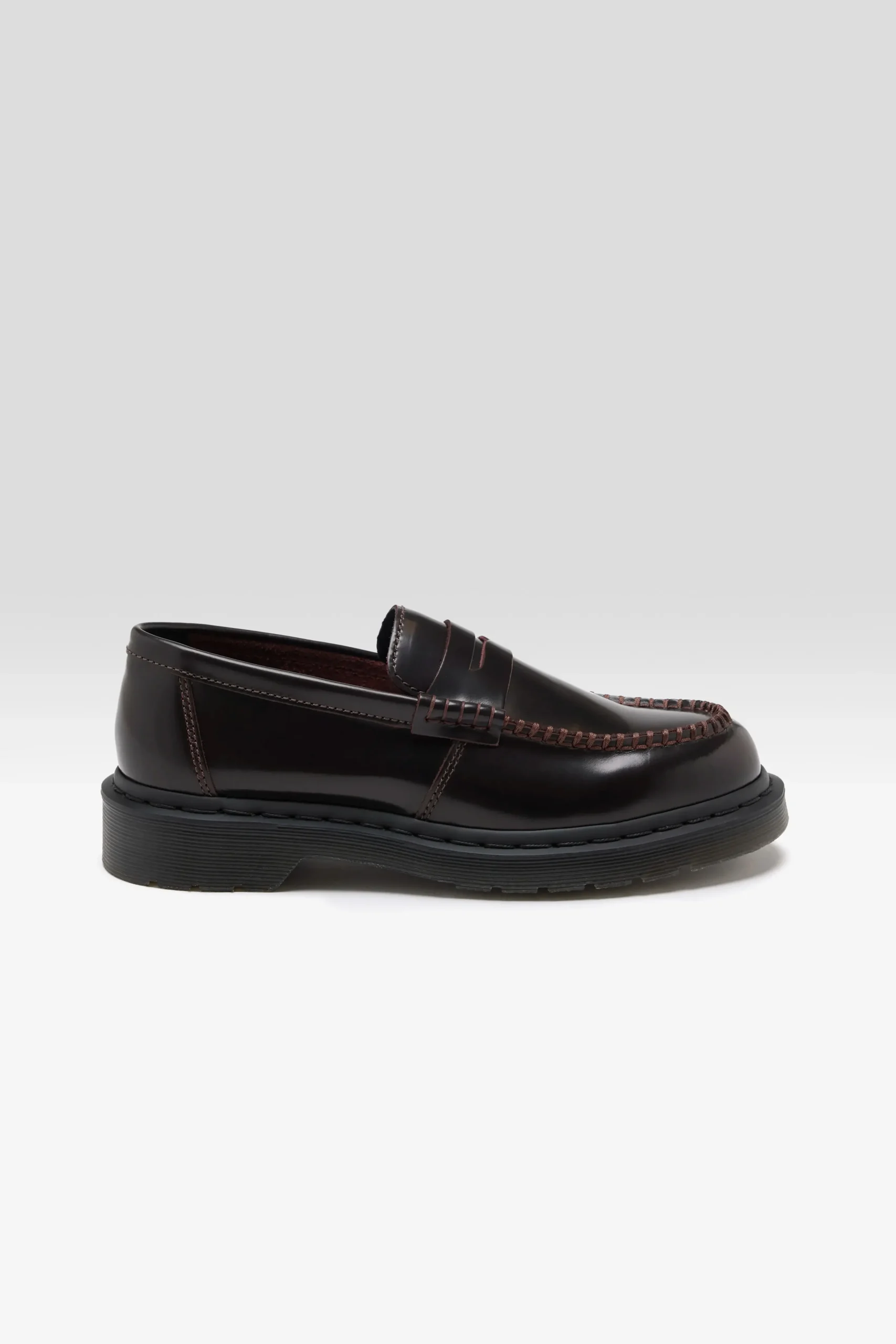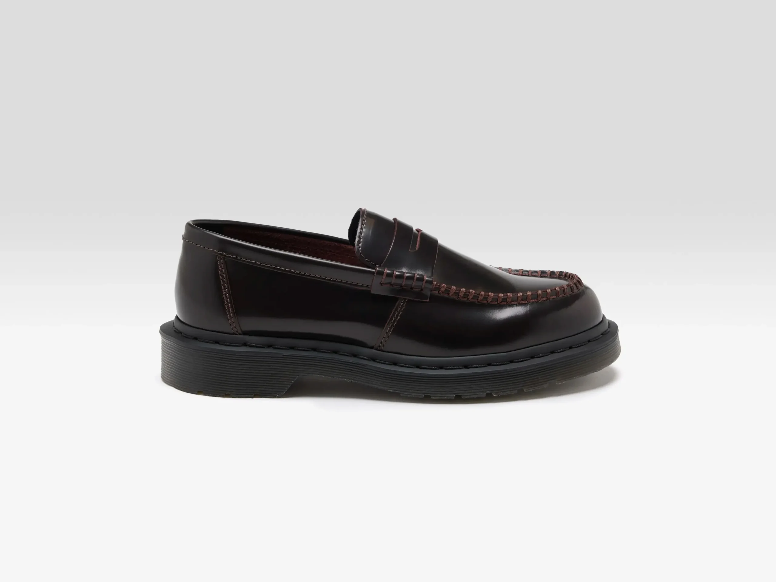 The Dr. Martens Penton Cherry Red Leather Loafers feature a high-shine leather upper with a base dye and contrasting top coat, revealing the underlying colour with wear.
