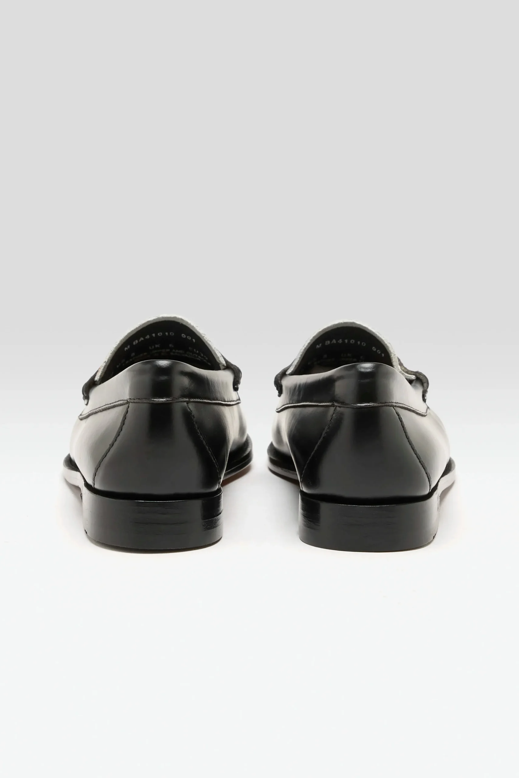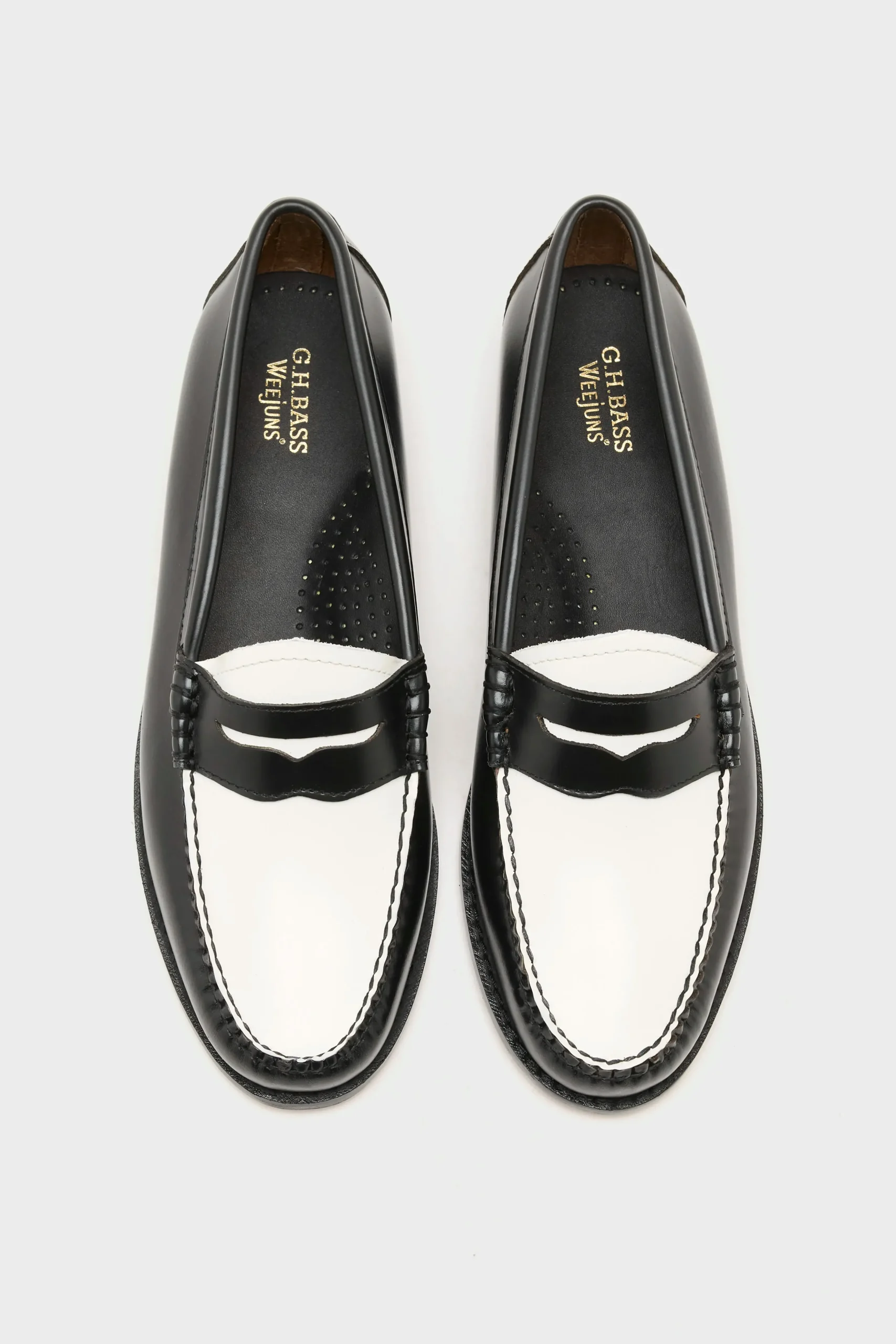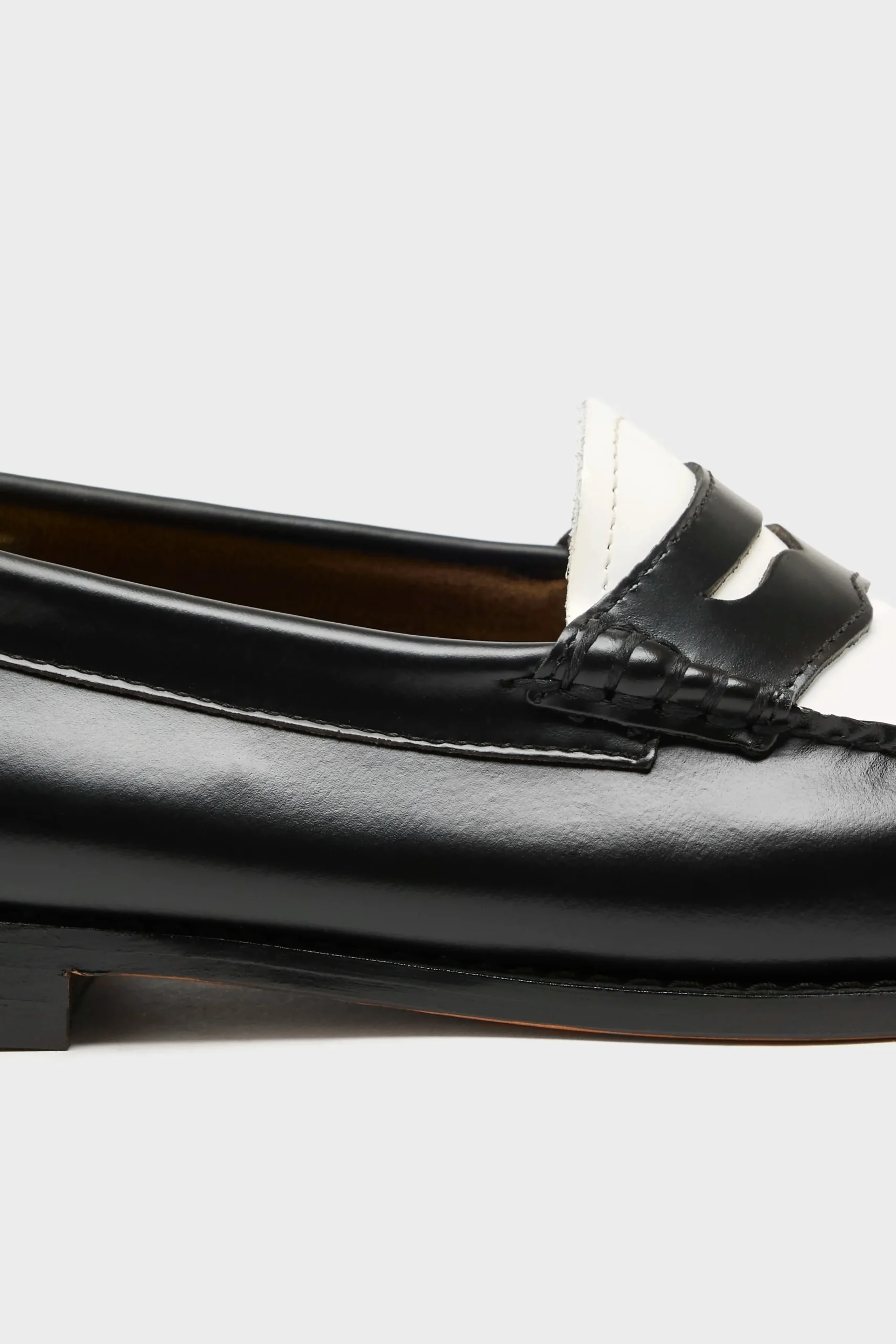 The G. H. Bass Weejuns Penny loafers feature a polished black and white leather upper with hand-stitched seams in tonal waxy thread and leather lining and outsole.