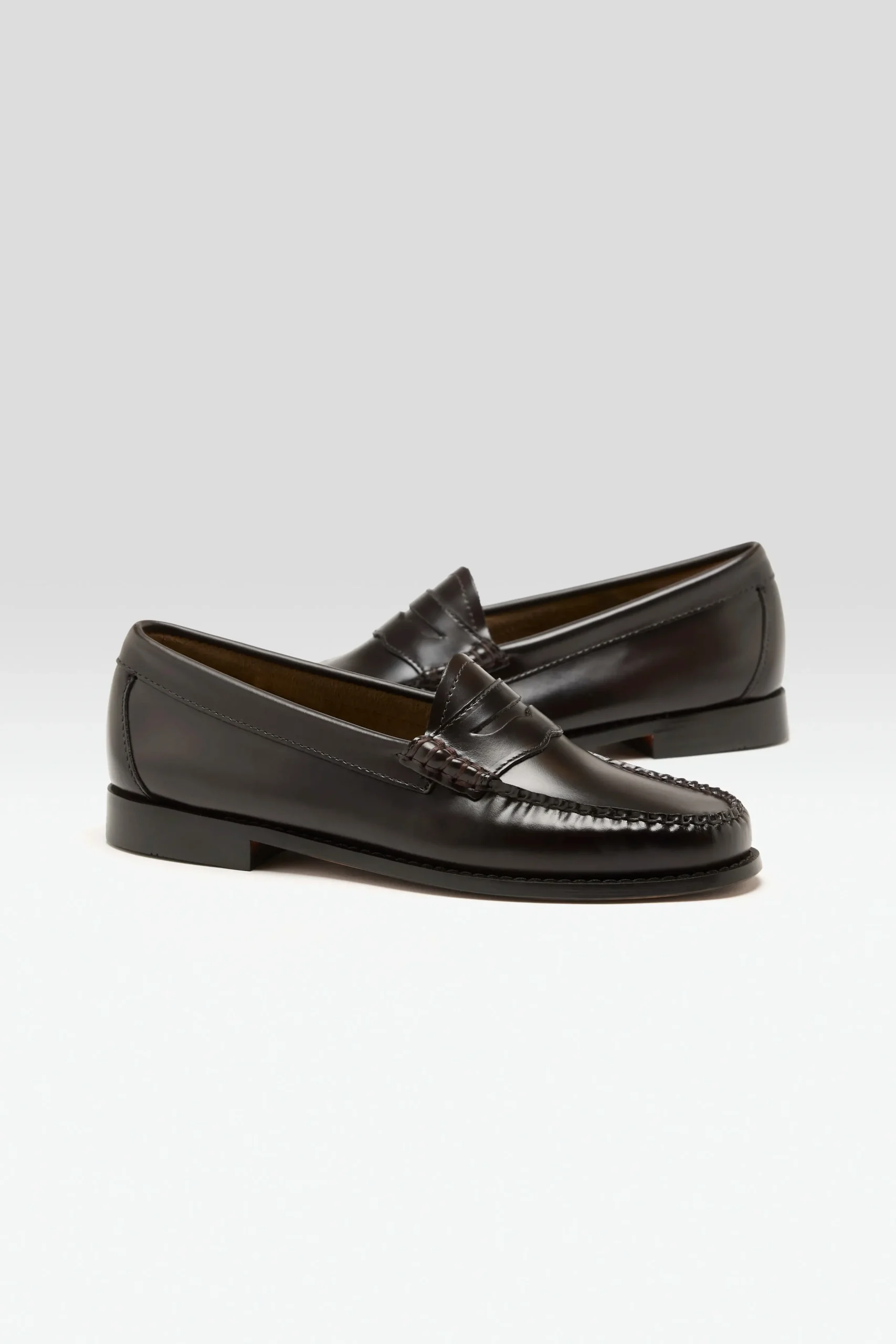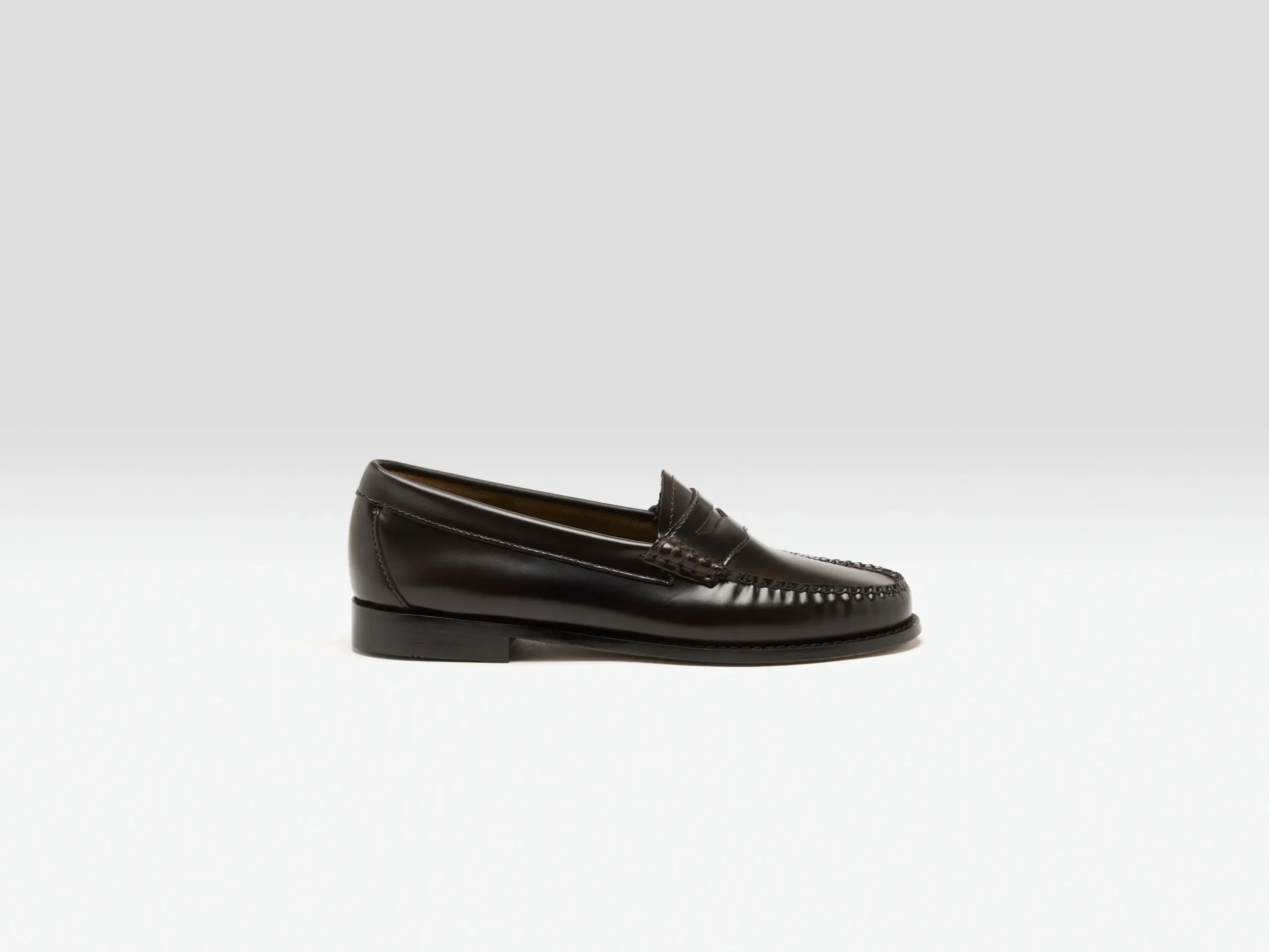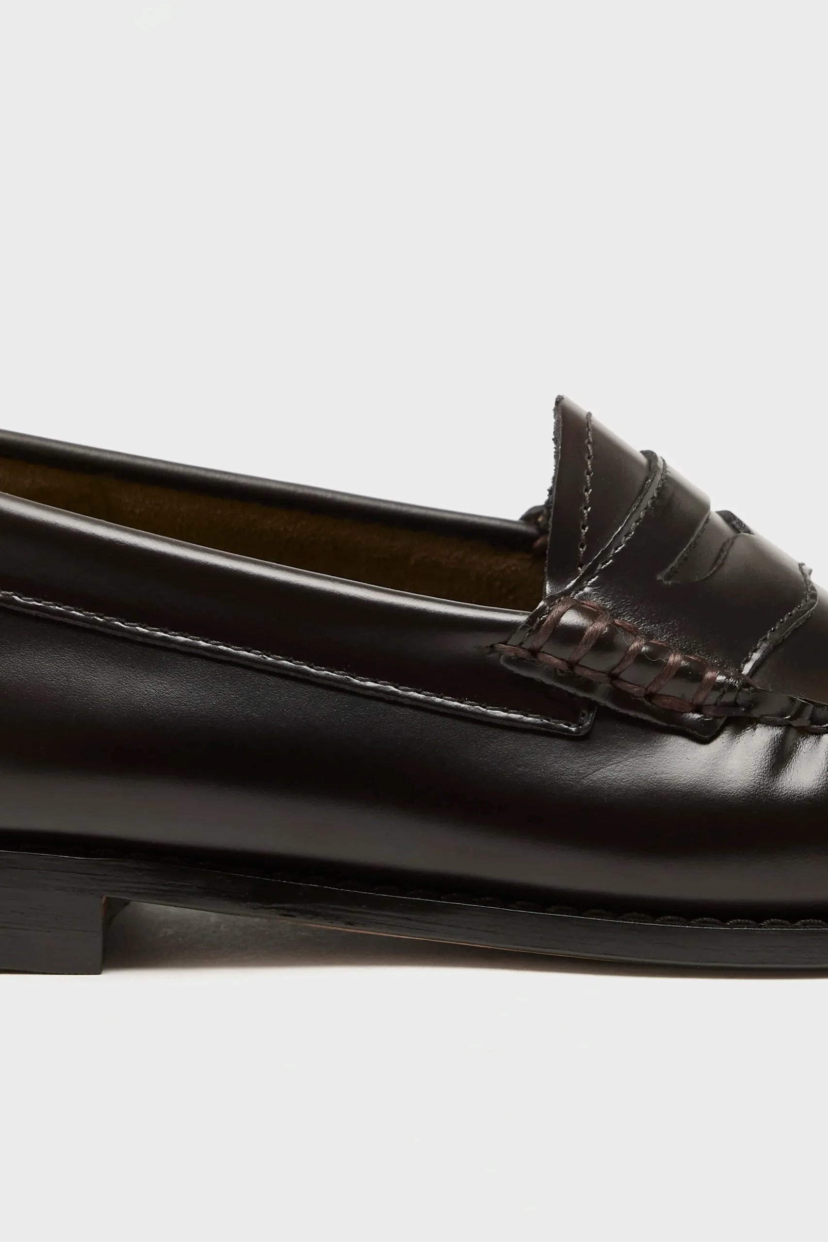 The G. H. Bass Weejuns Penny loafers feature a polished chocolate leather upper with hand-stitched seams in tonal waxy thread and leather lining and outsole.