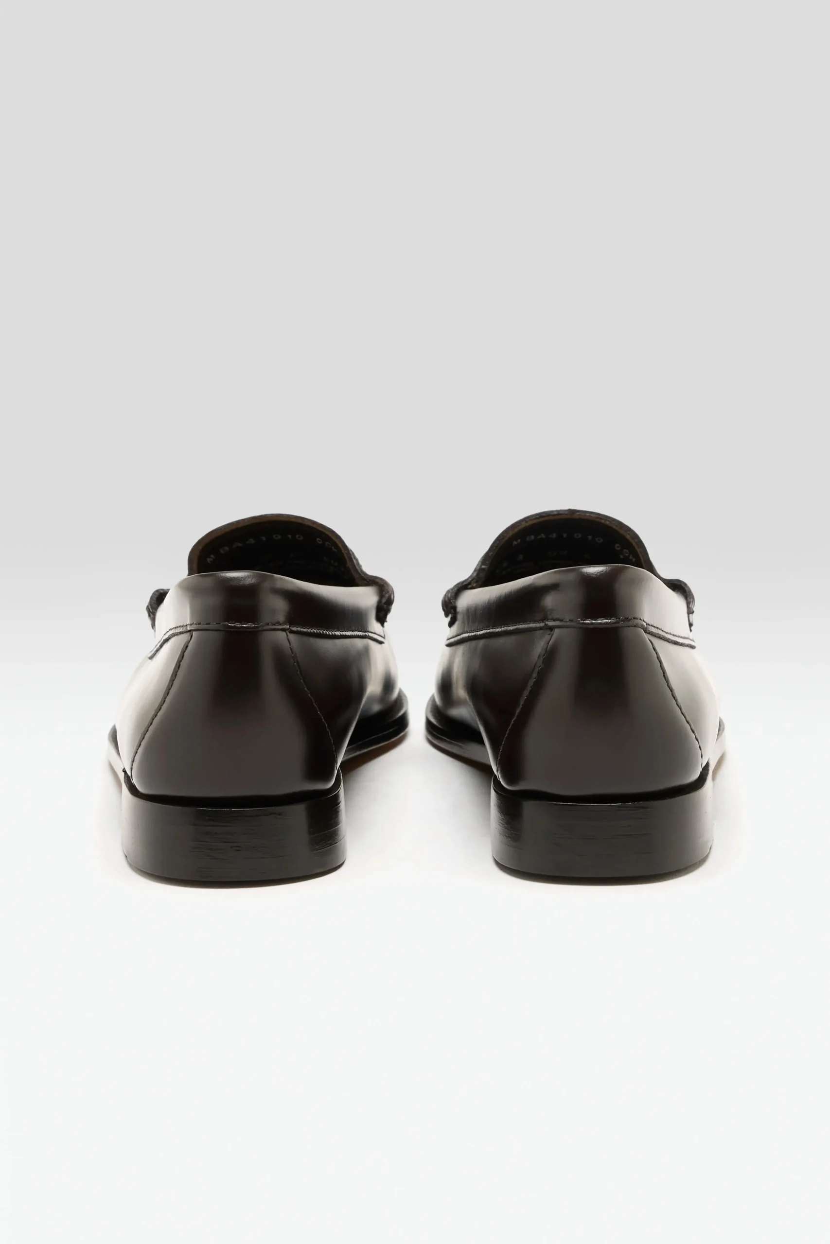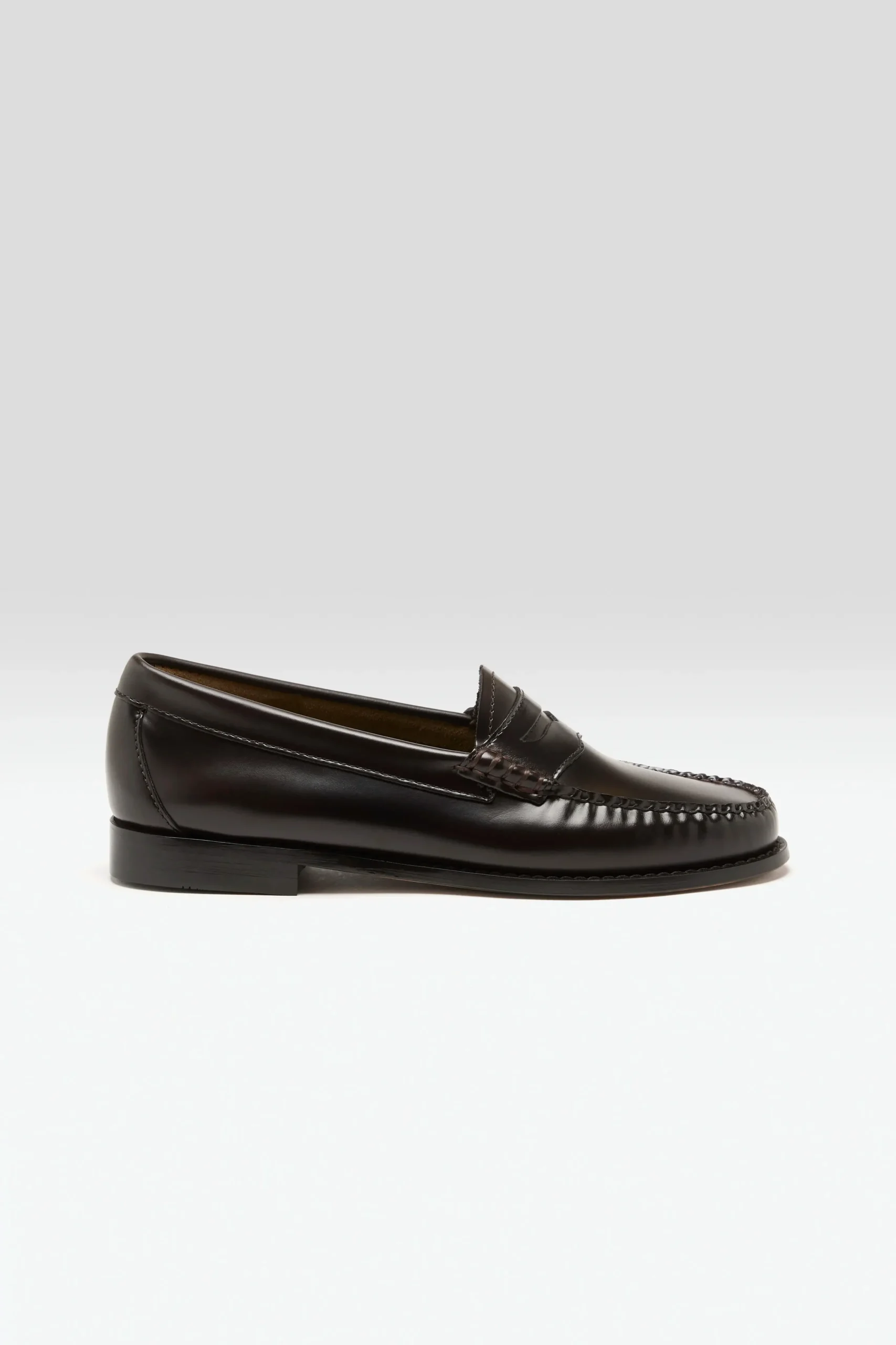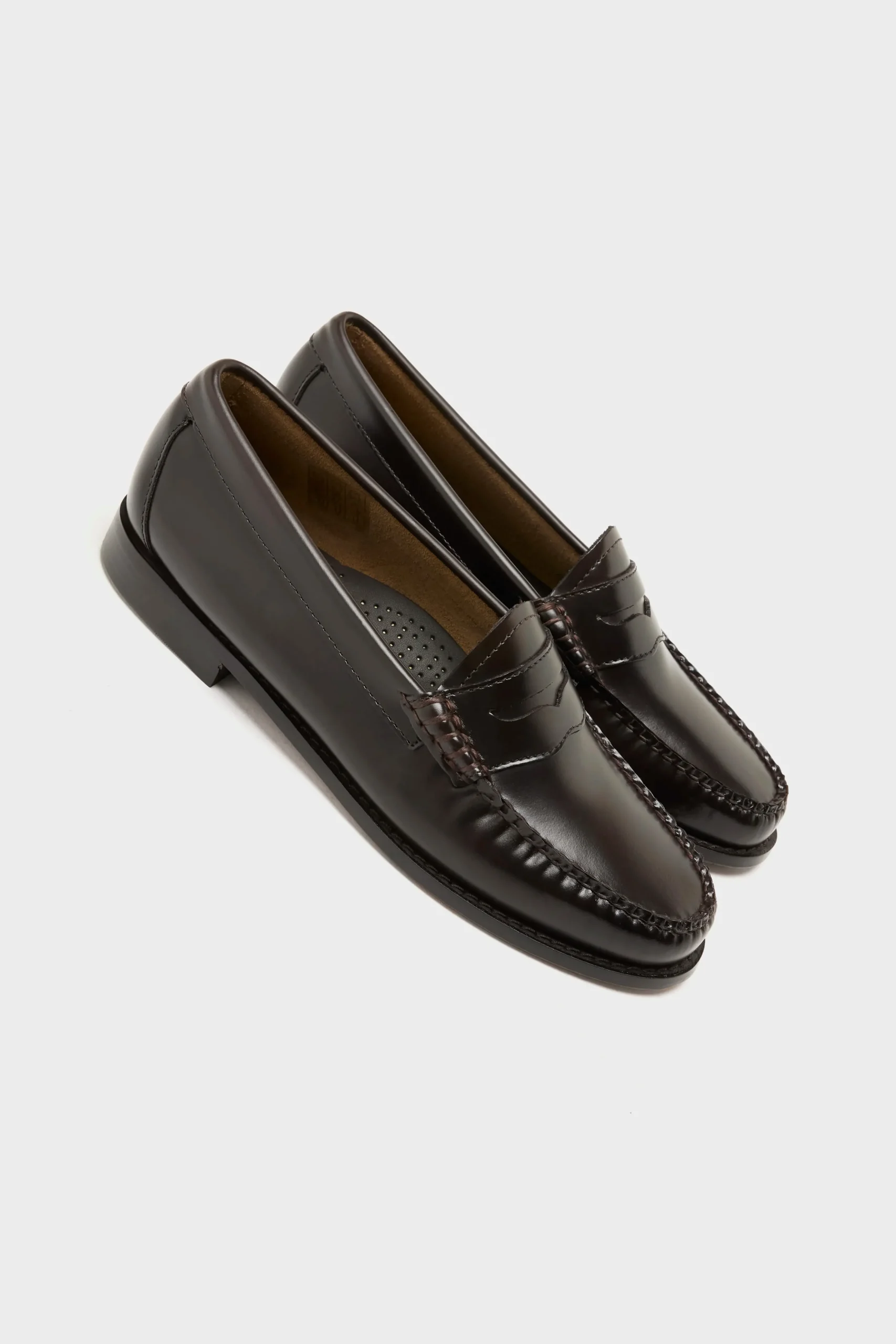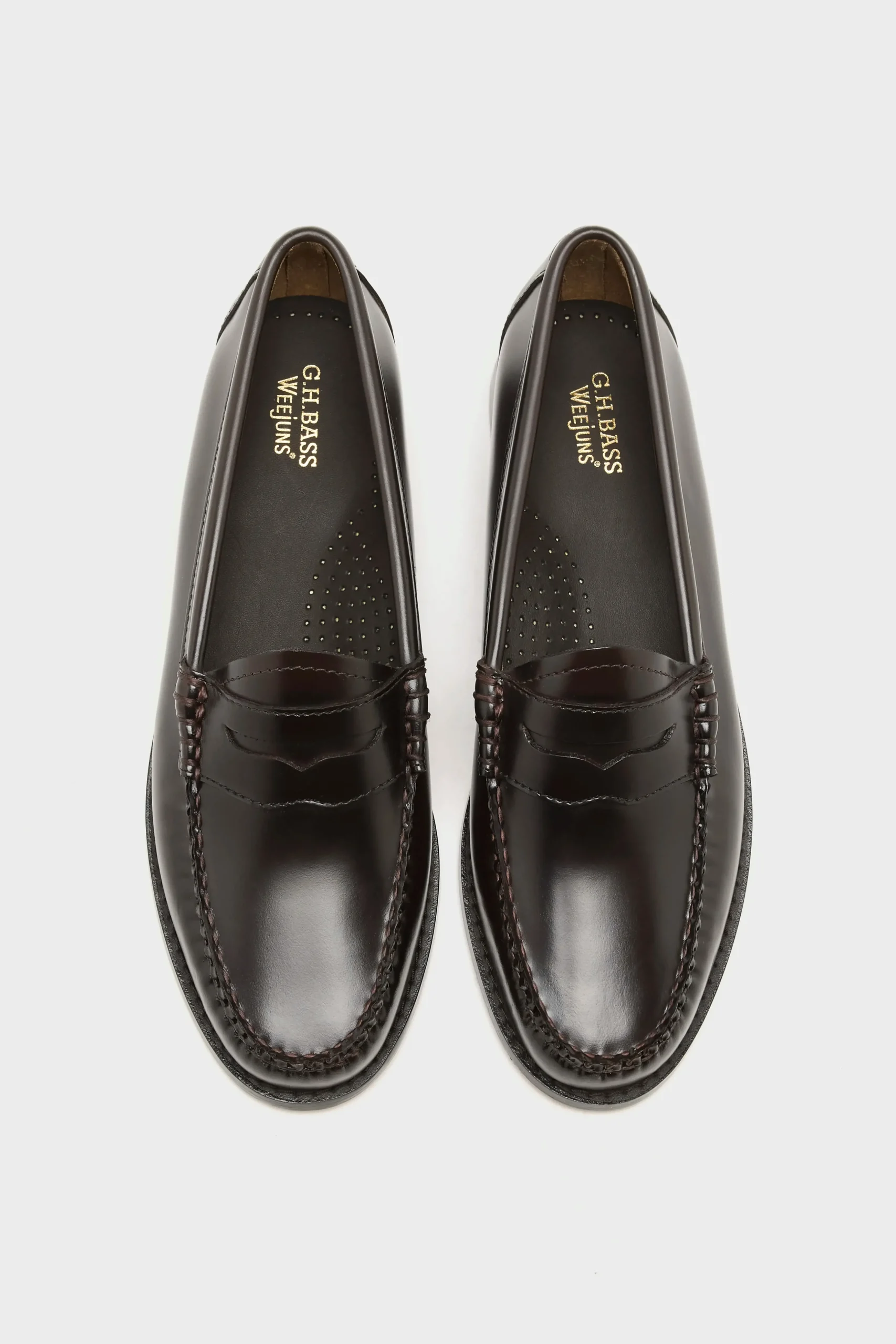 The G. H. Bass Weejuns Penny loafers feature a polished chocolate leather upper with hand-stitched seams in tonal waxy thread and leather lining and outsole.