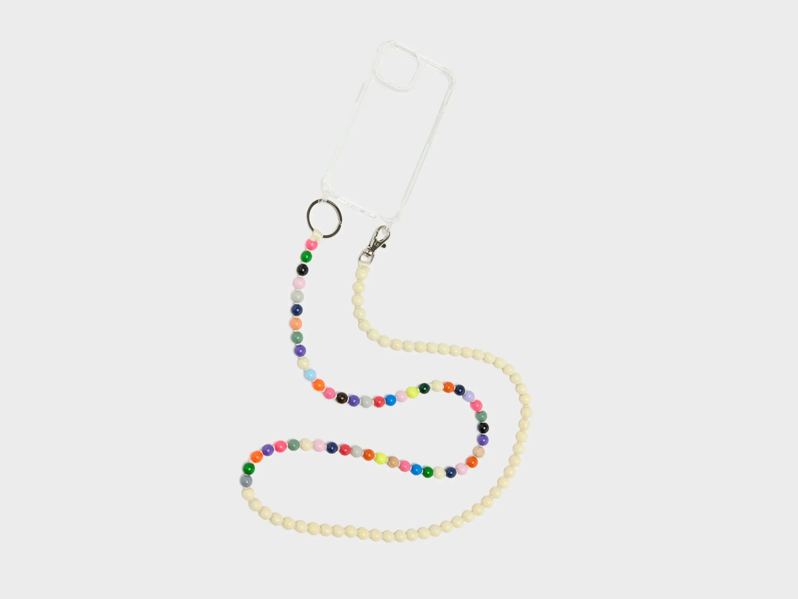 The Ina Seifart Handykette Phone necklace for the iPhone 14 features wooden beads with a vegan, non-toxic finish and a clear phone case.