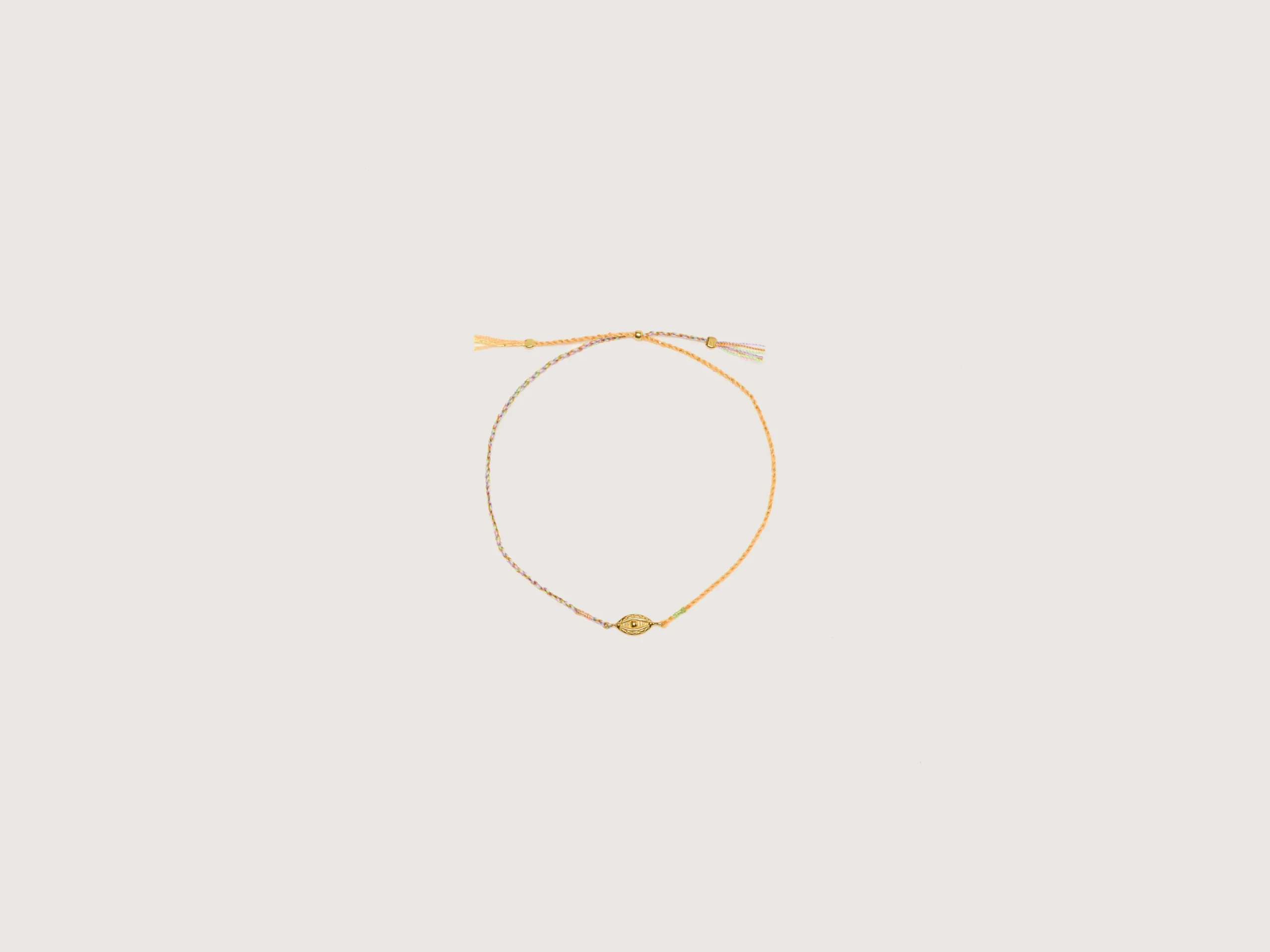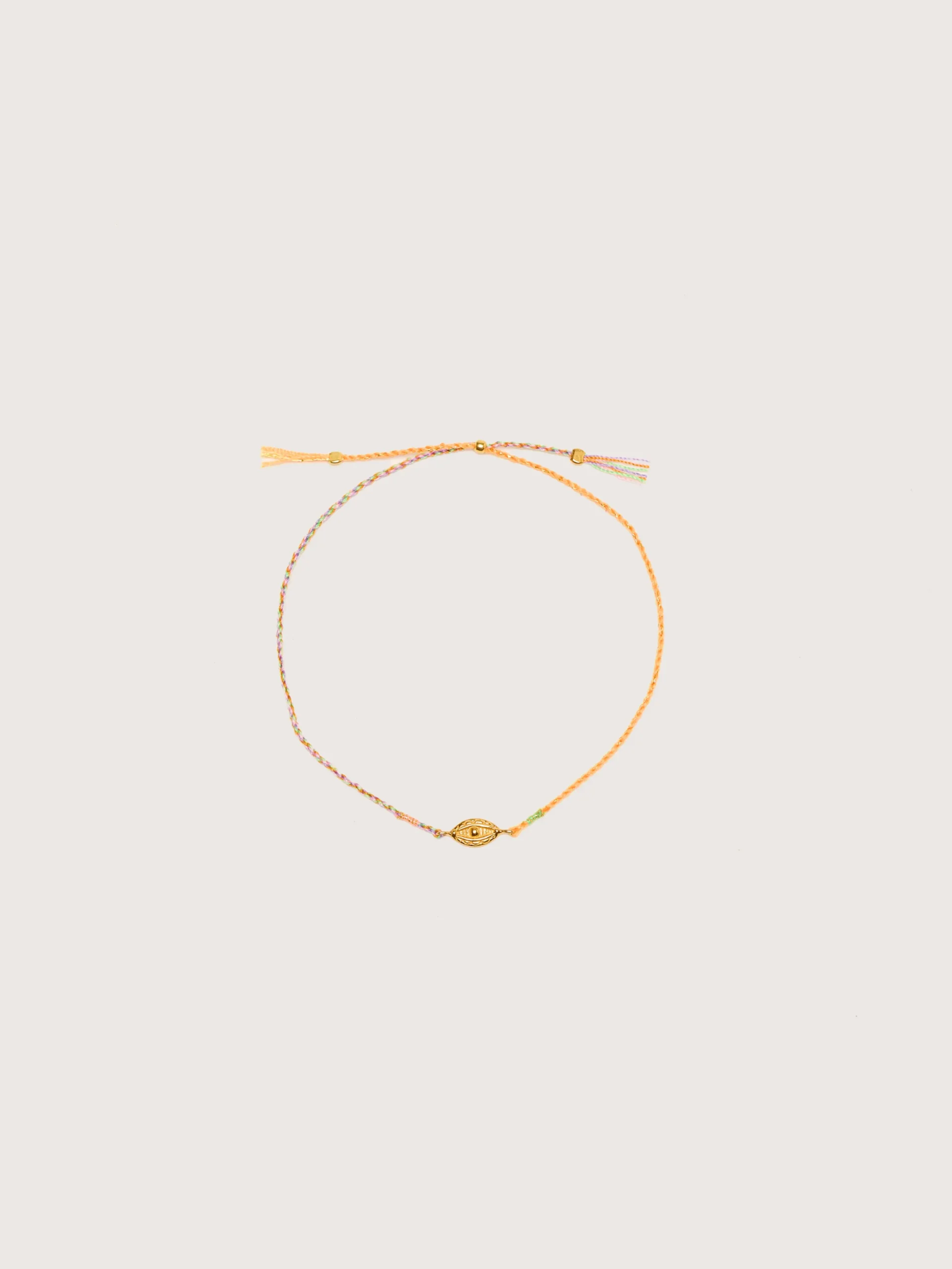 De Ojo armband is een handgemaakte, verstelbare vlecht van fijn koord versierd met een vergulde bedel.Verstelbare lengte: 22 cmStijl: Ojo ArmbandKleur: Oranje