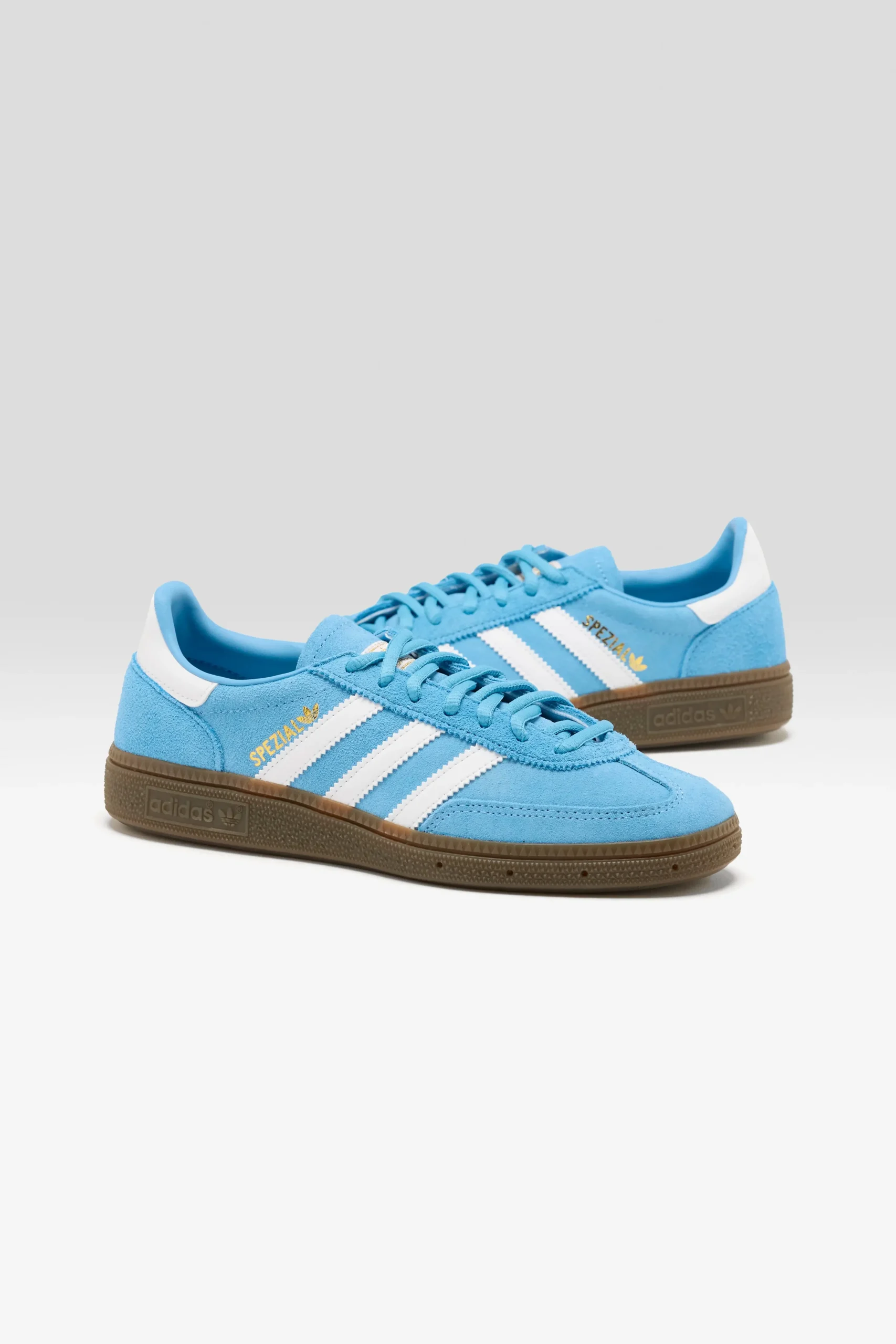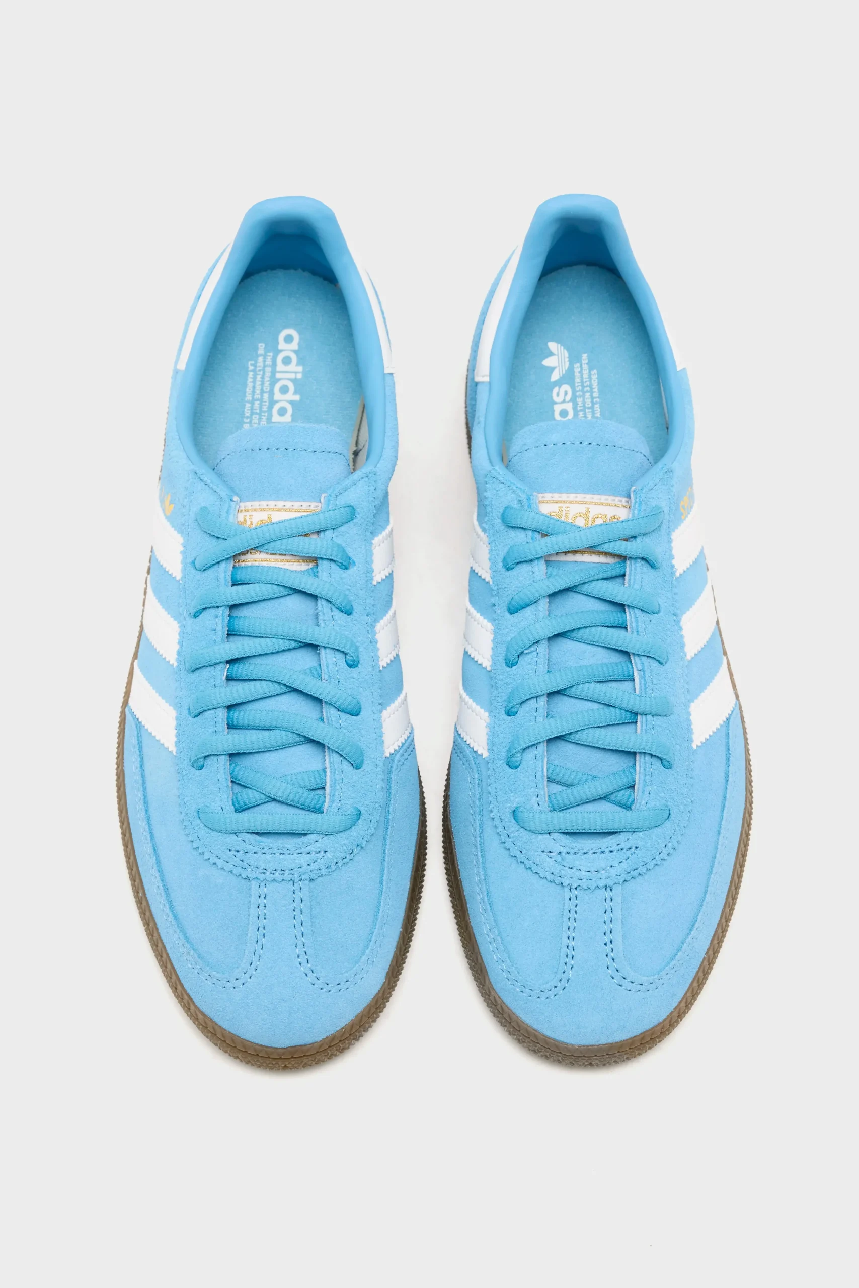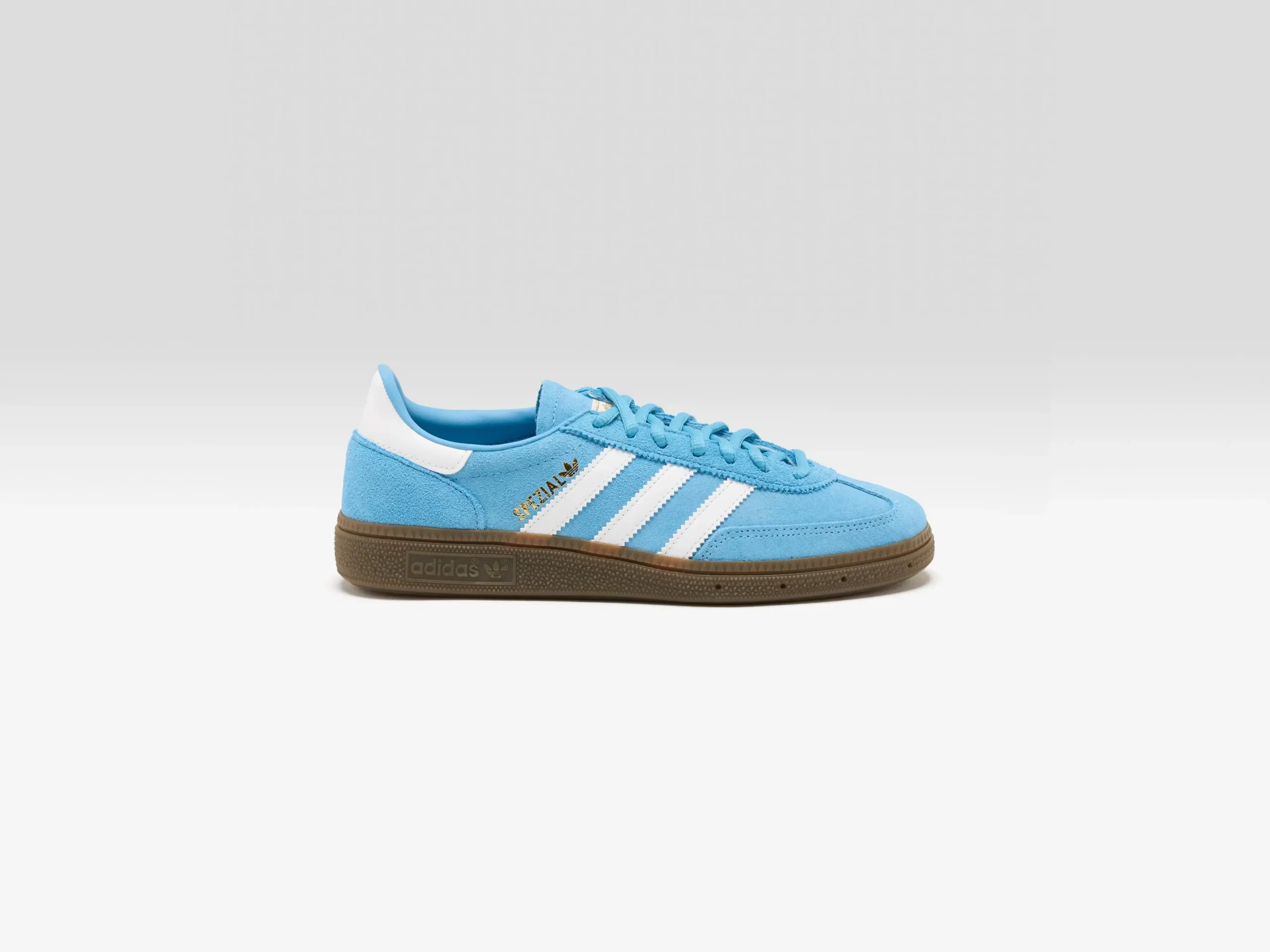 The Adidas Handball Spezial sneakers for juniors feature a durable leather and synthetic upper, rubber cupsole, and metallic brand details.