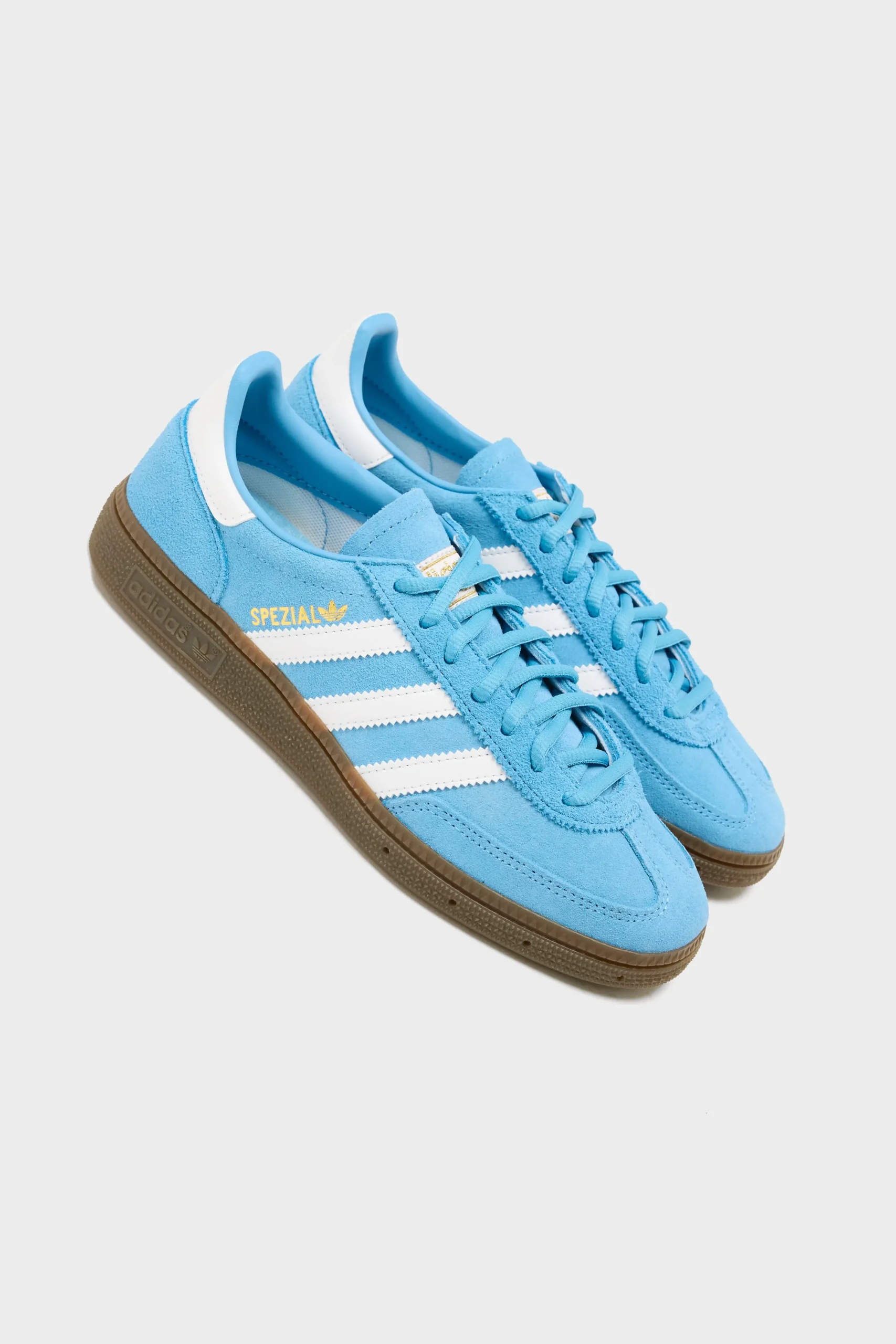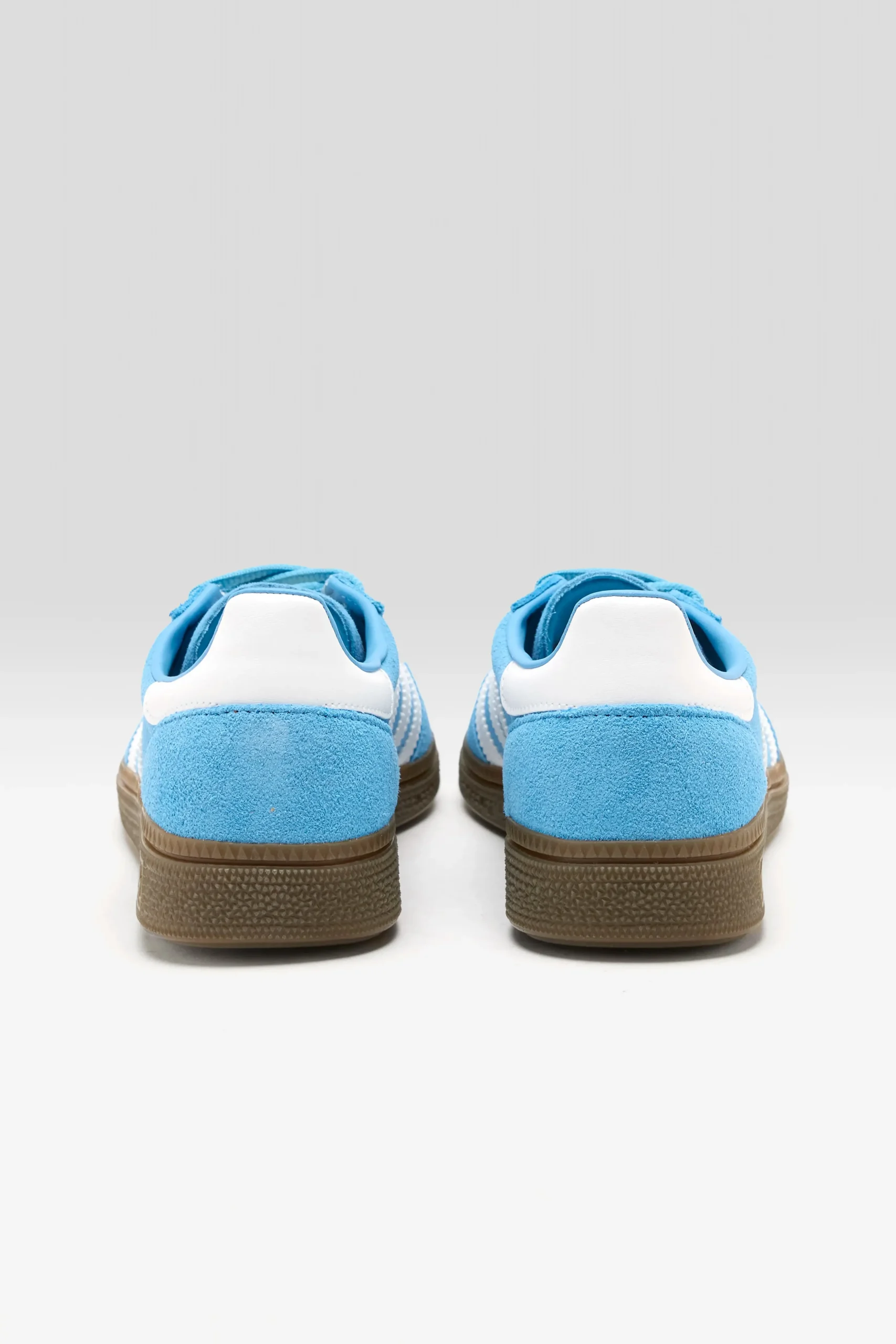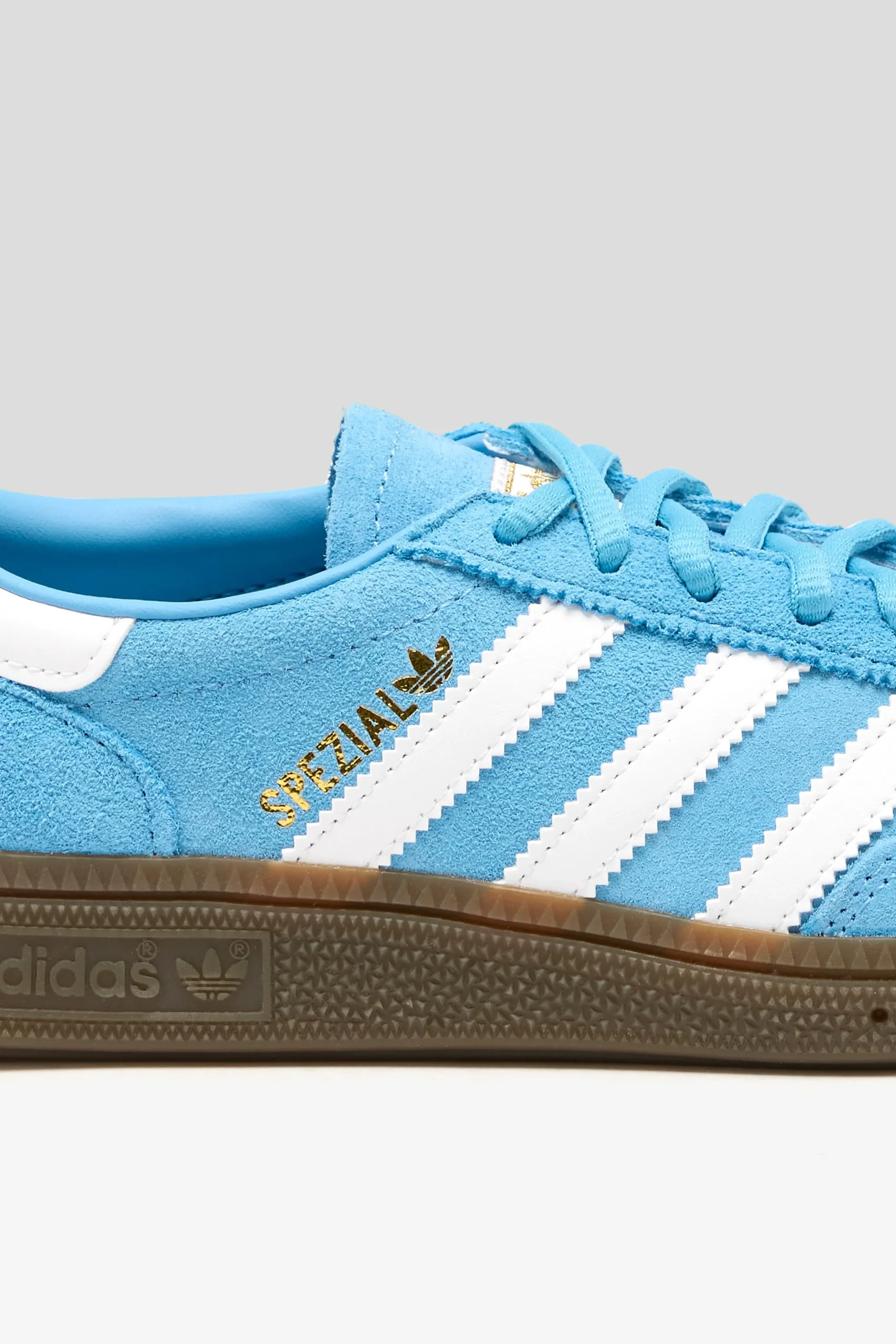 The Adidas Handball Spezial sneakers for juniors feature a durable leather and synthetic upper, rubber cupsole, and metallic brand details.