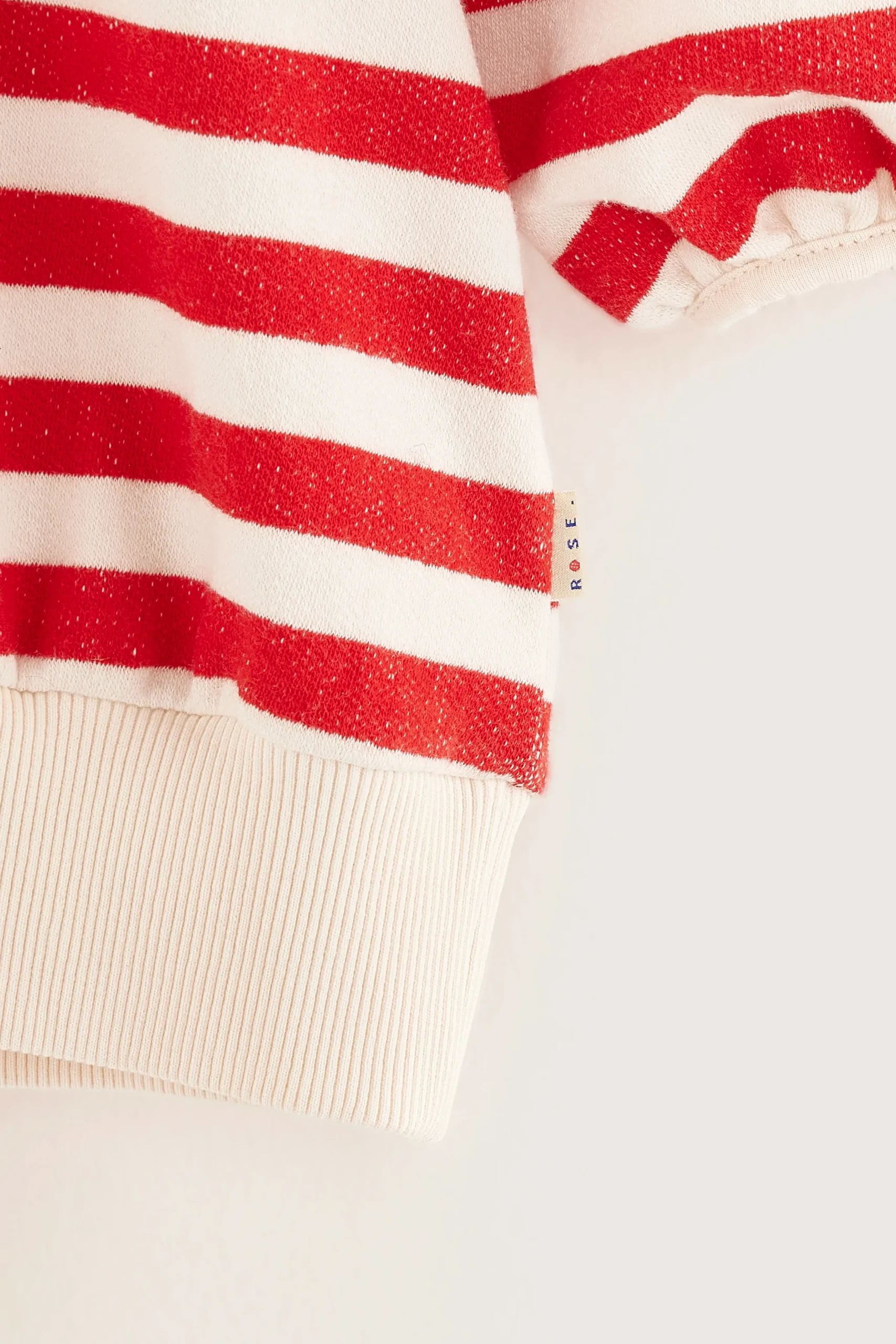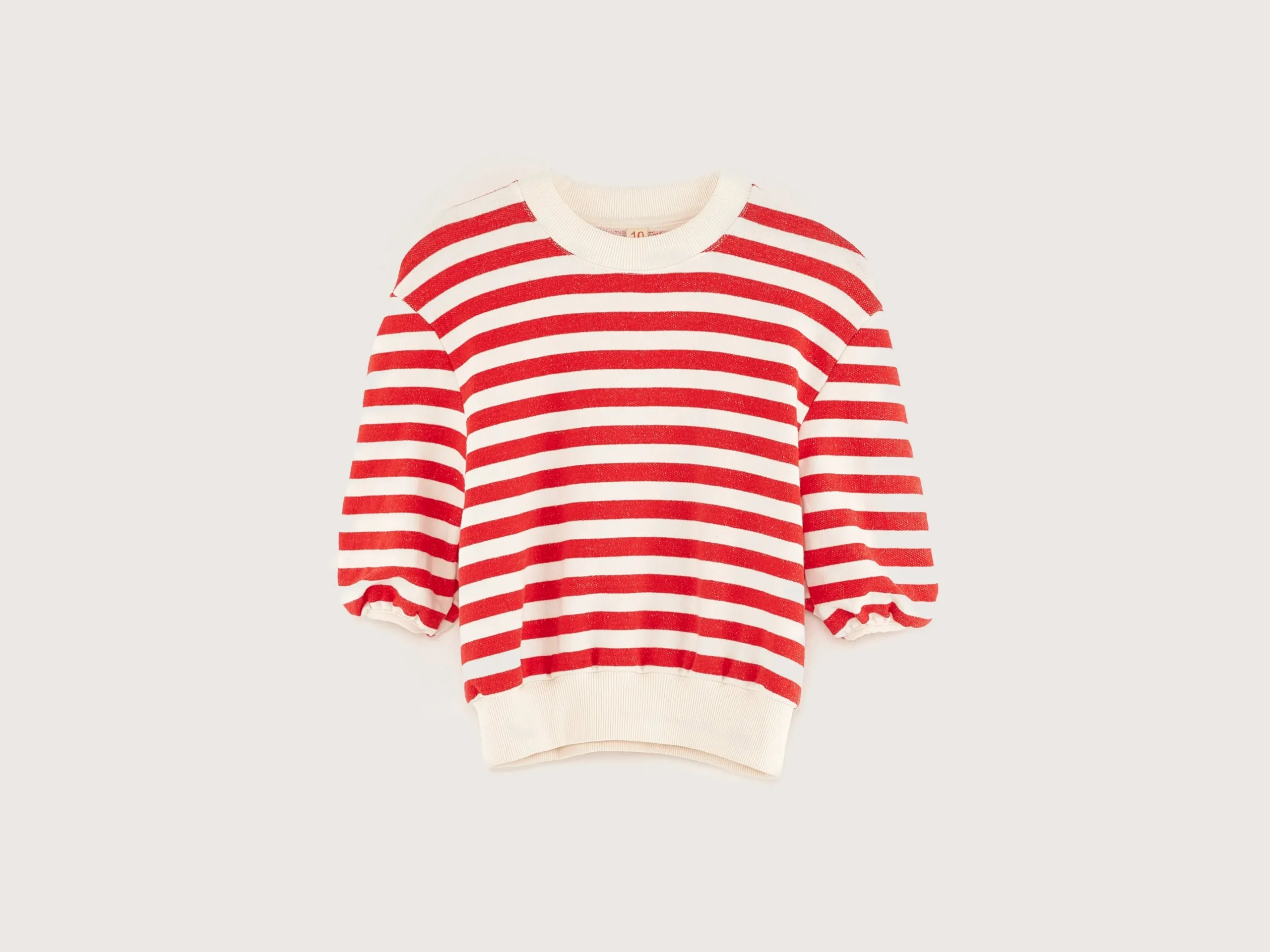 Klassiek sweatshirt met ronde hals, korte ballonmouwen met gerimpelde details en geribde boorden, gemaakt van glad fleecekatoen met ecru en rode strepen.Klassieke pasvormRonde halsKorte mouwen met elastische boorden en gerimpelde detailsGeribde boorden