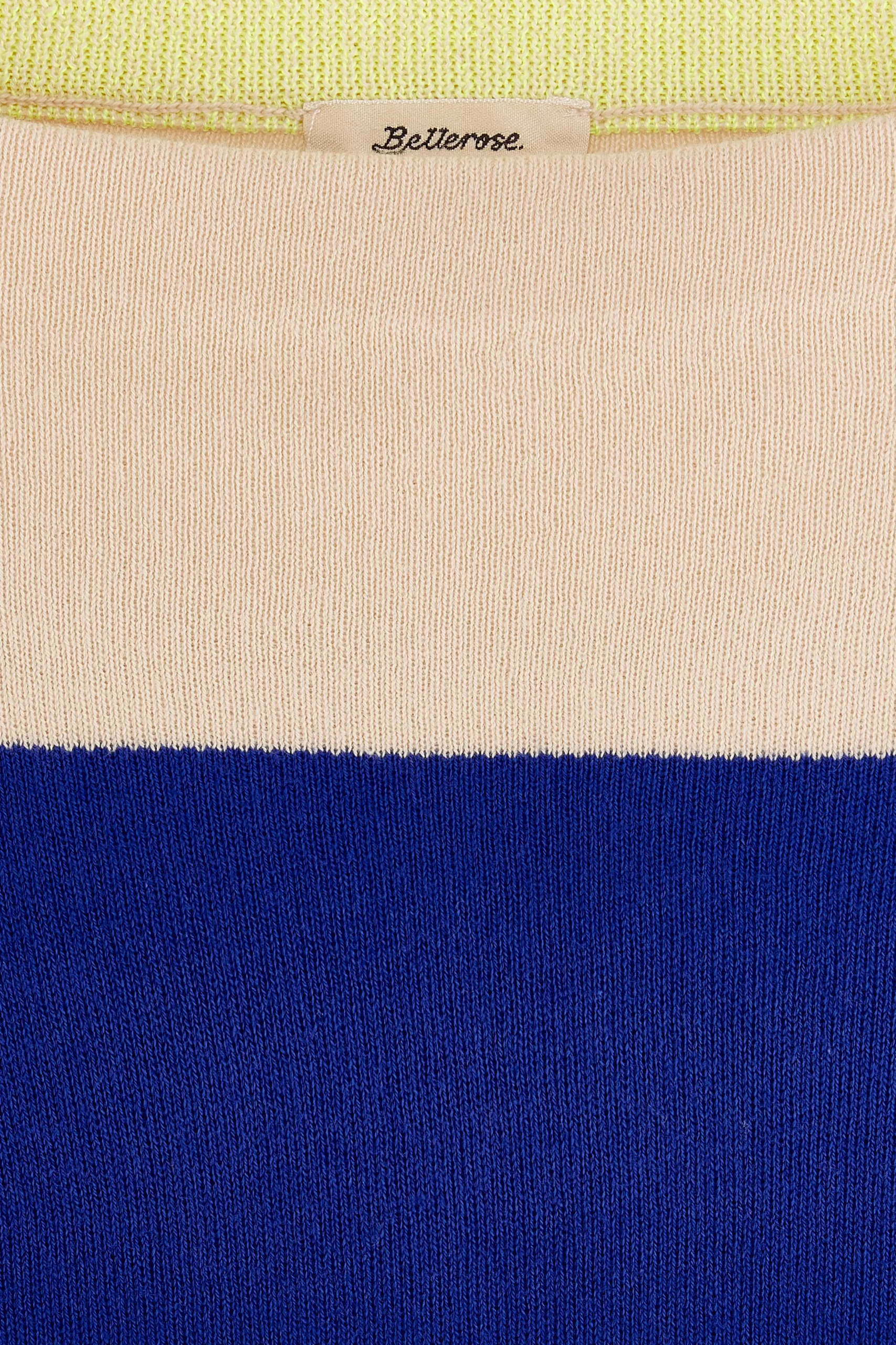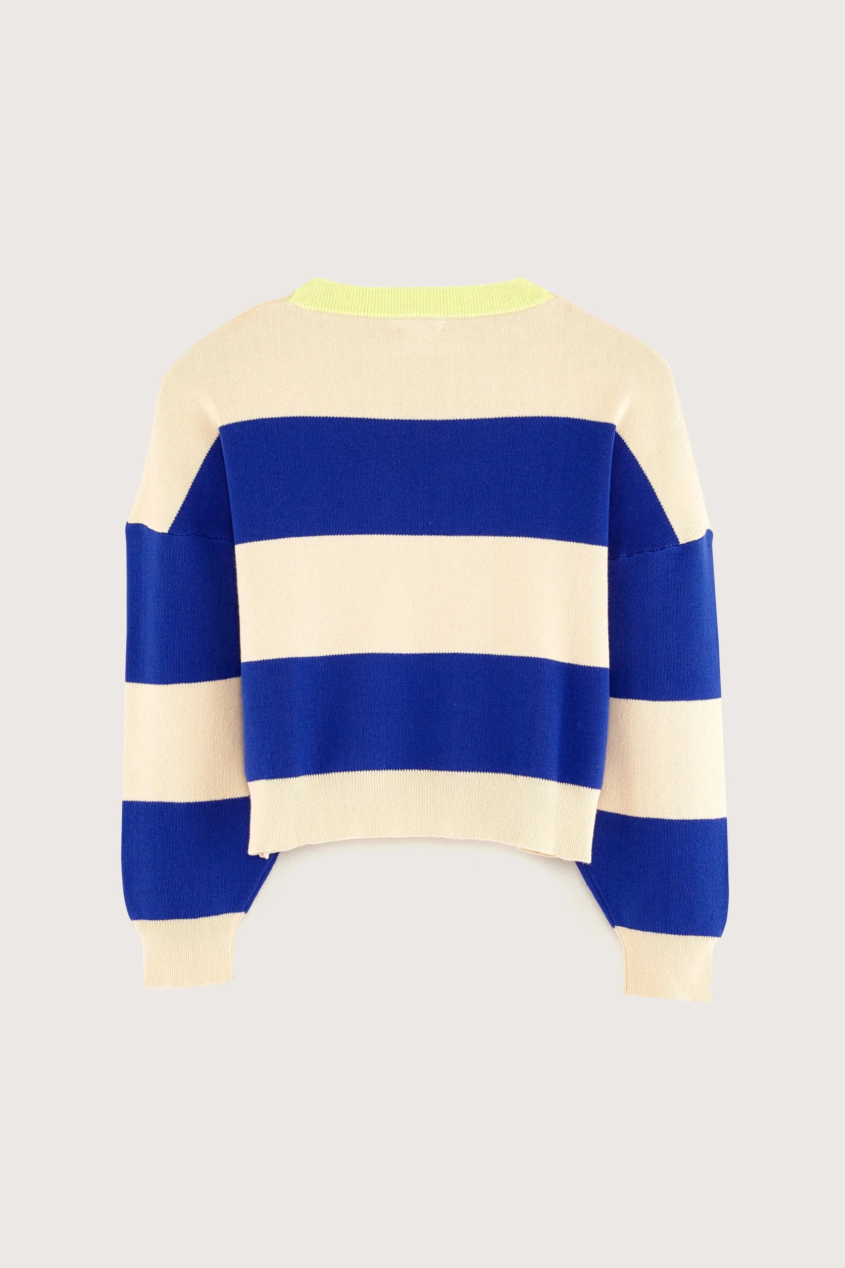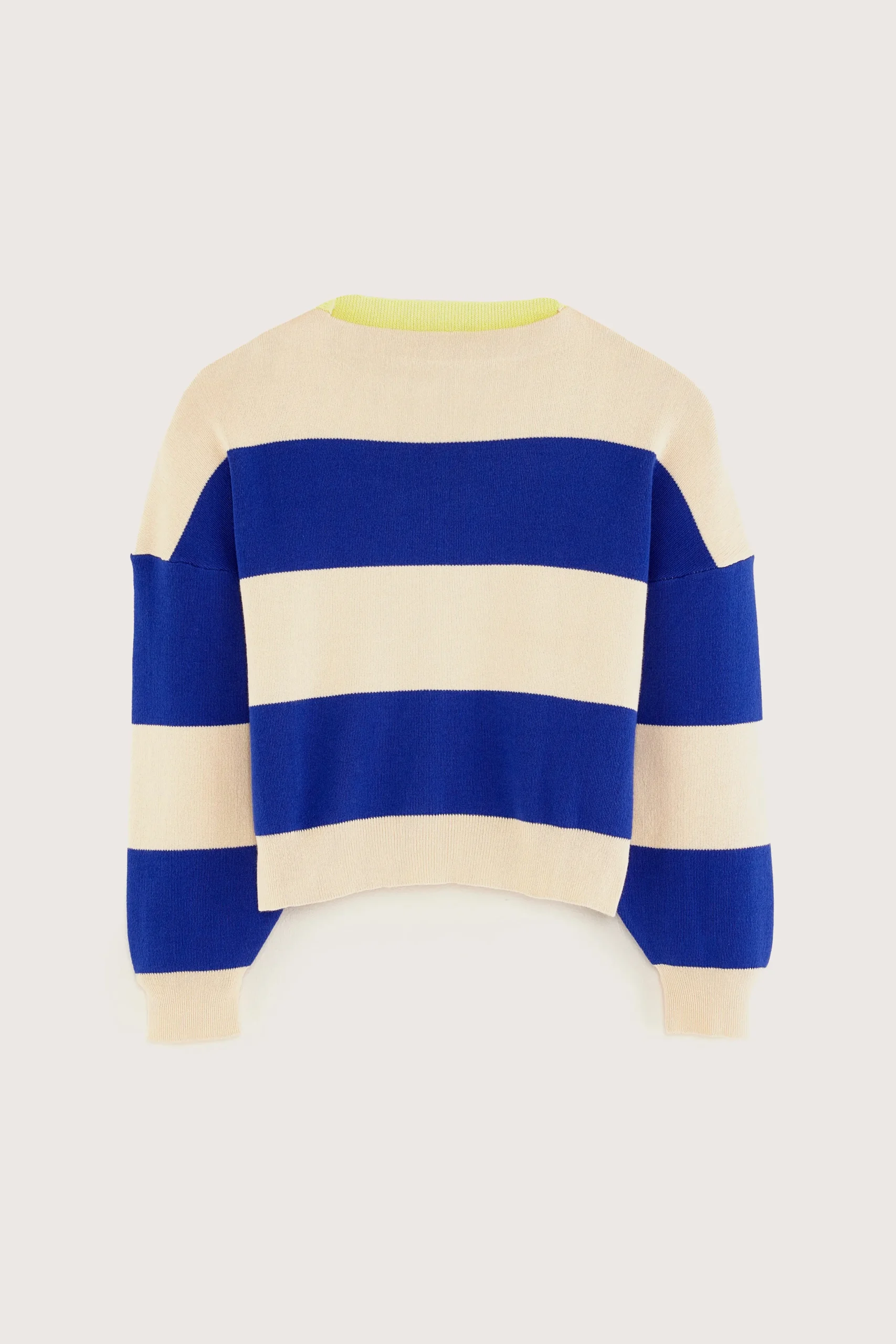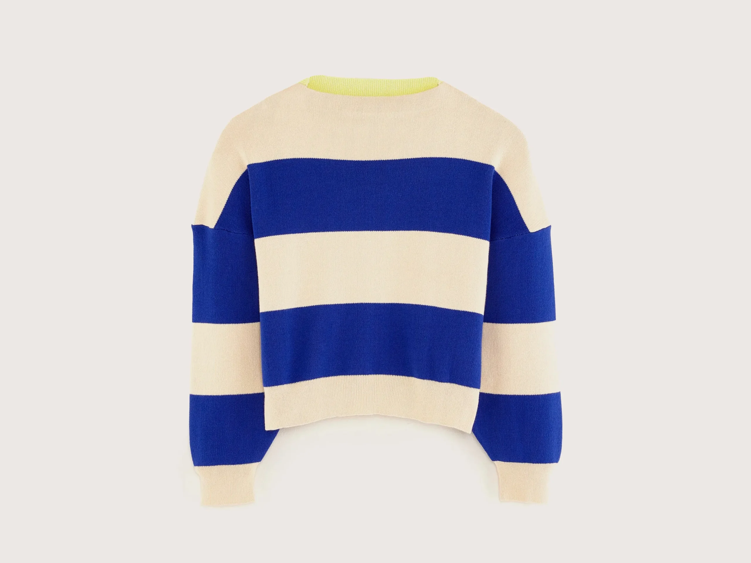 Klassieke trui met lange mouwen en ronde hals, gemaakt van zacht katoengaren met ecru en blauwe strepen.Klassieke pasvor…