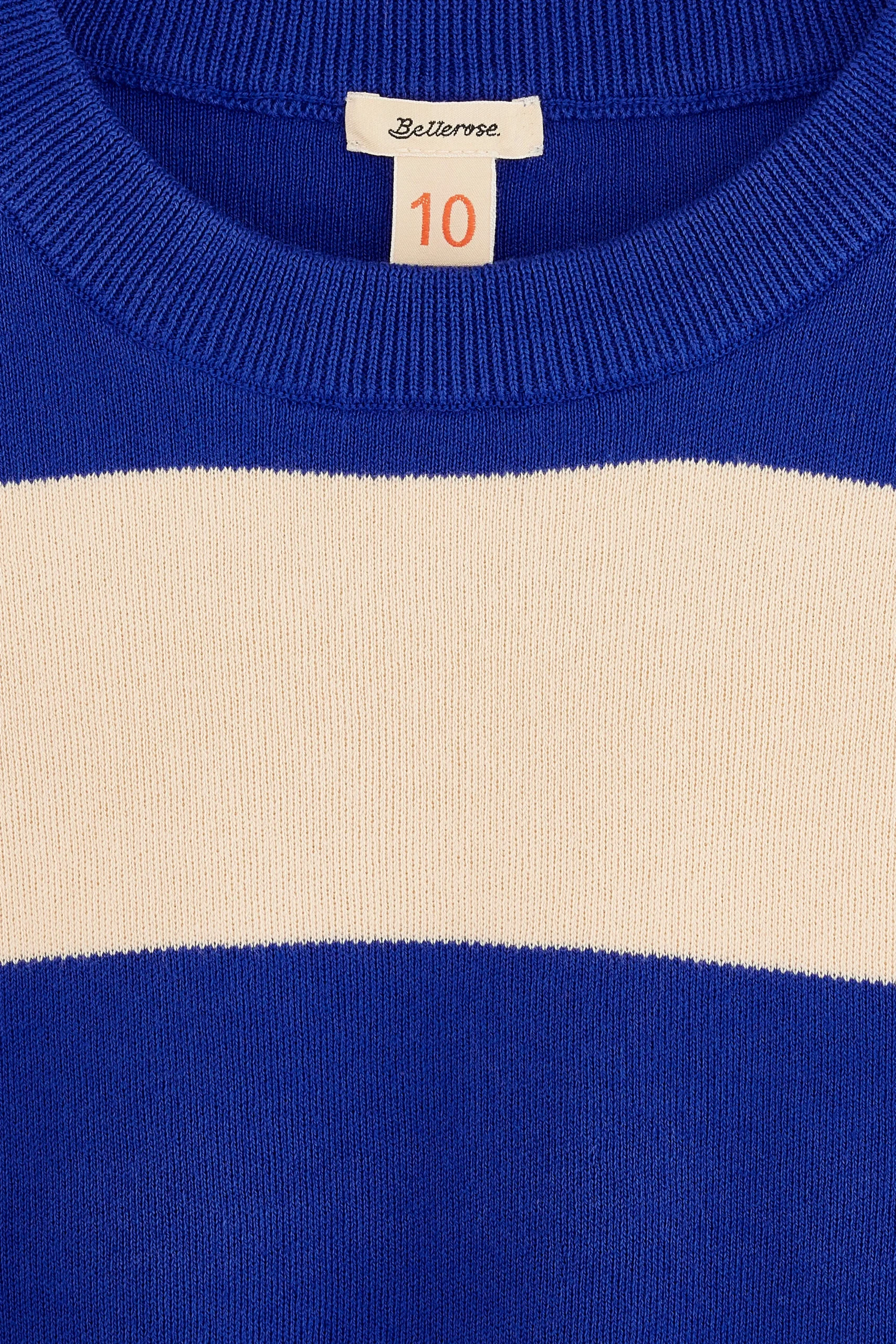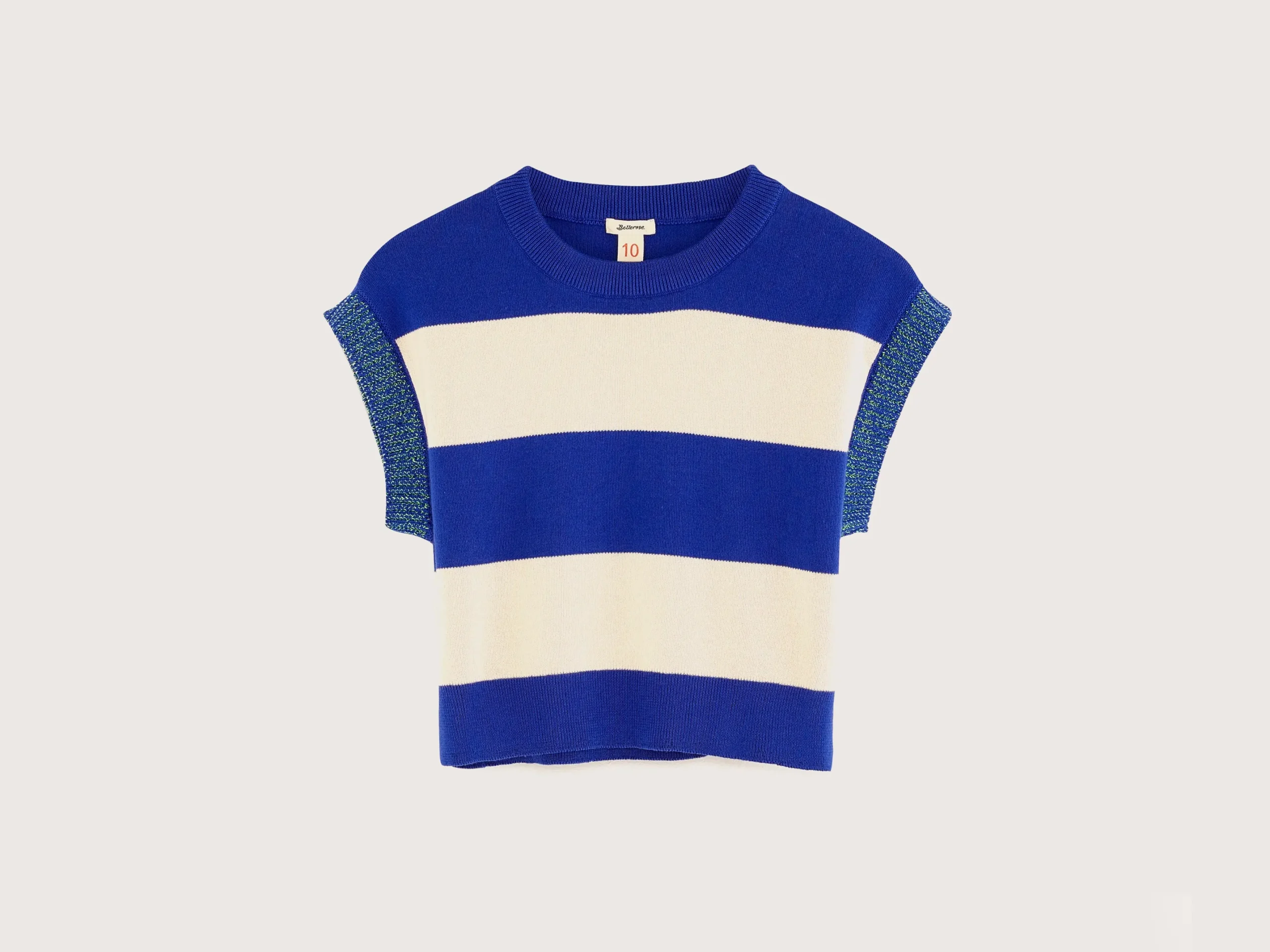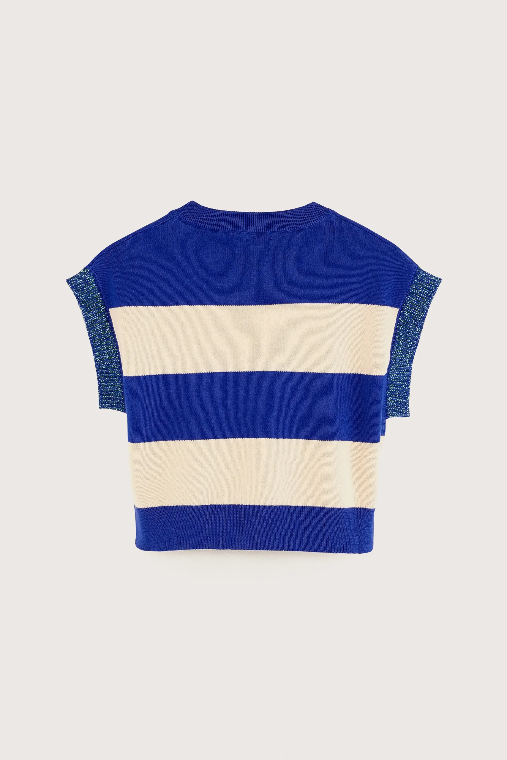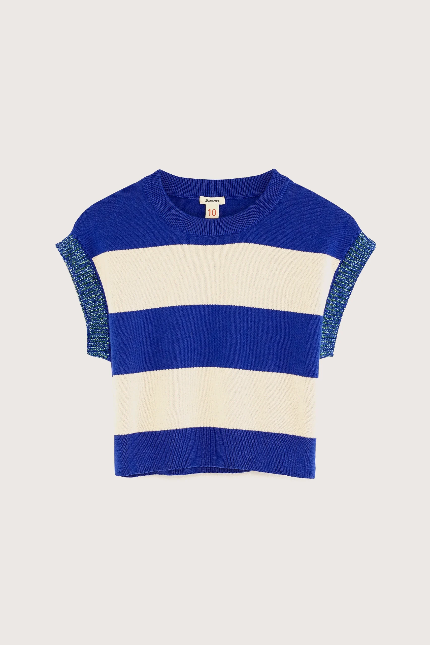 Klassiek gebreid vest met ronde hals, cropped taille met zijsplitten en contrasterende schouderbanden, gemaakt van zachte katoengaren met brede ecru en blauwe strepen.Losse pasvorm Ronde hals CroppedZijsplittenContrasterende schouderbandenGebreid jerseyGeribde boorden Medium gauge