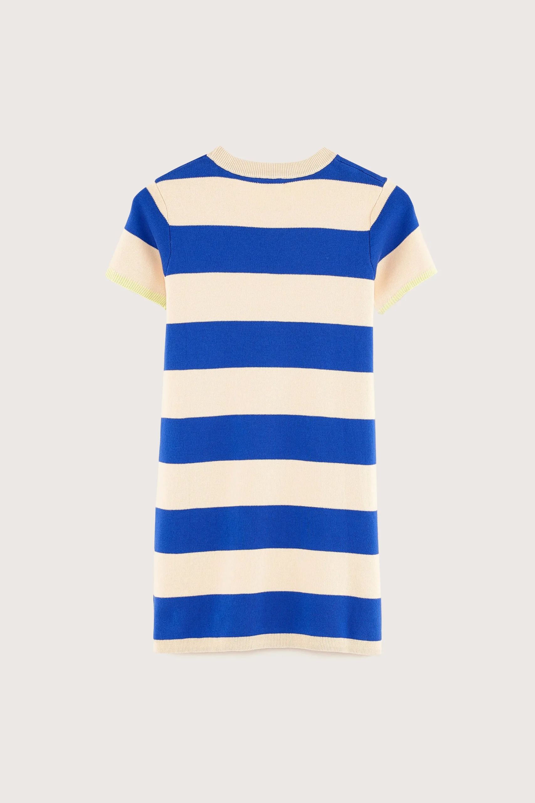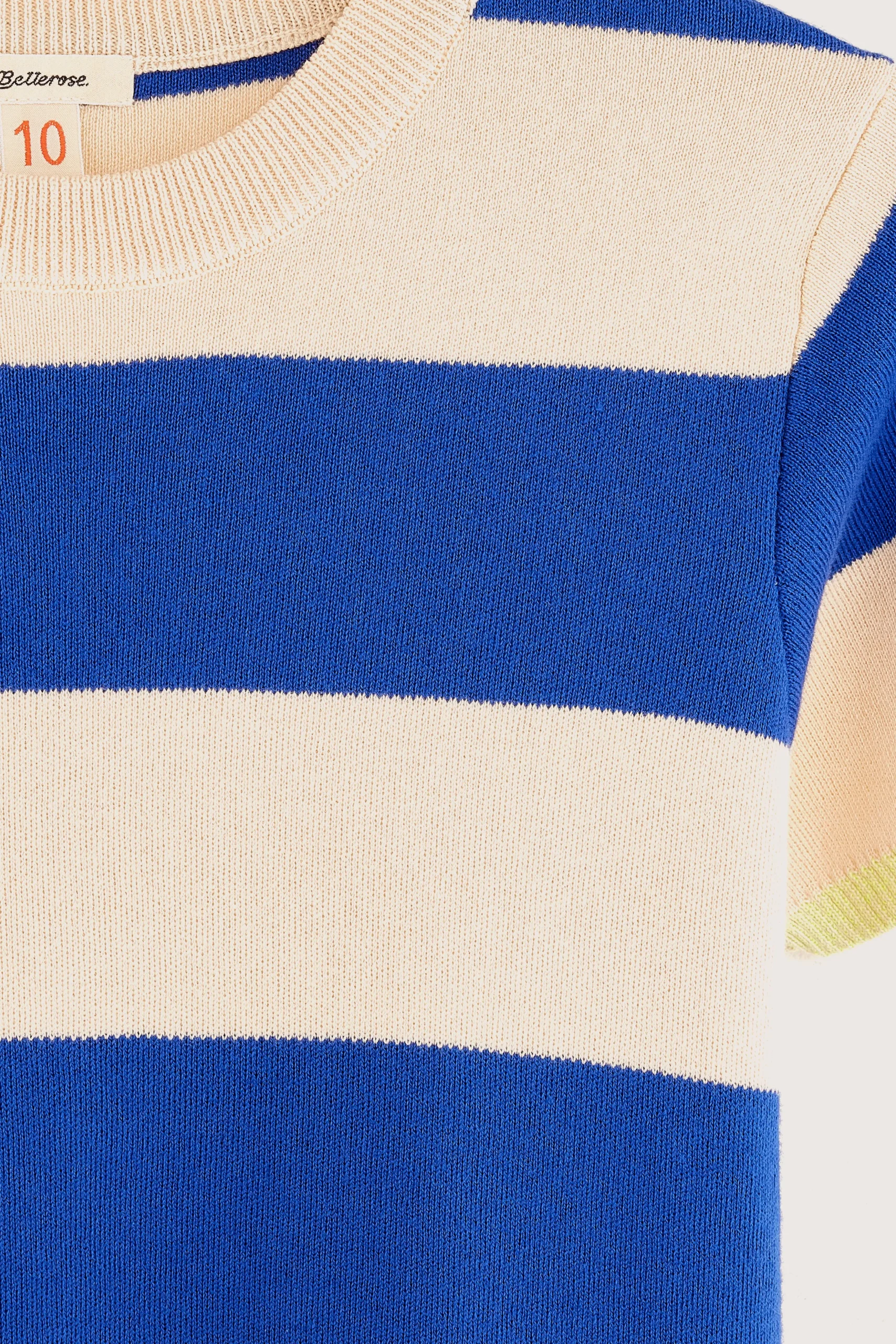 Klassieke gebreide jurk met korte mouwen en ronde hals, gemaakt van zacht katoenen garen met brede ecru en blauwe strepe…