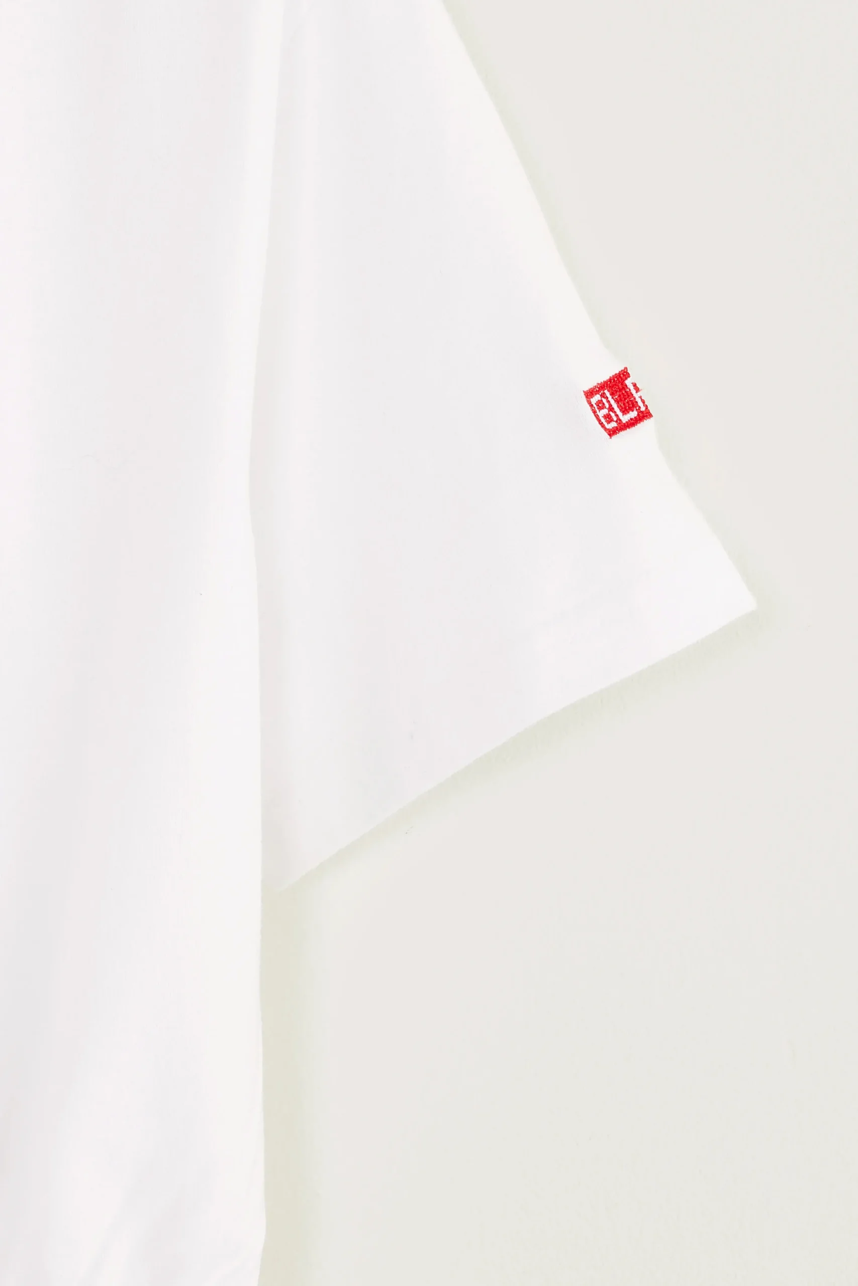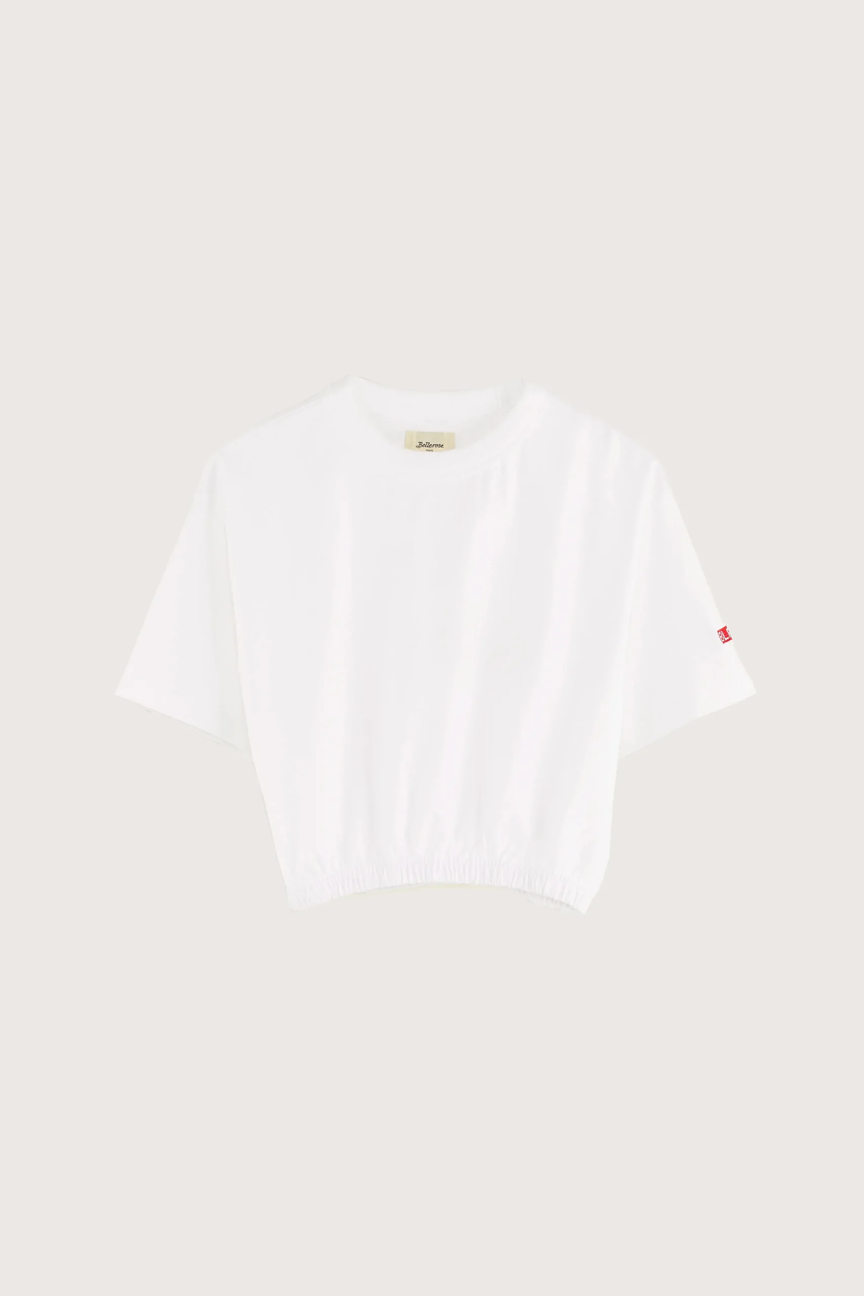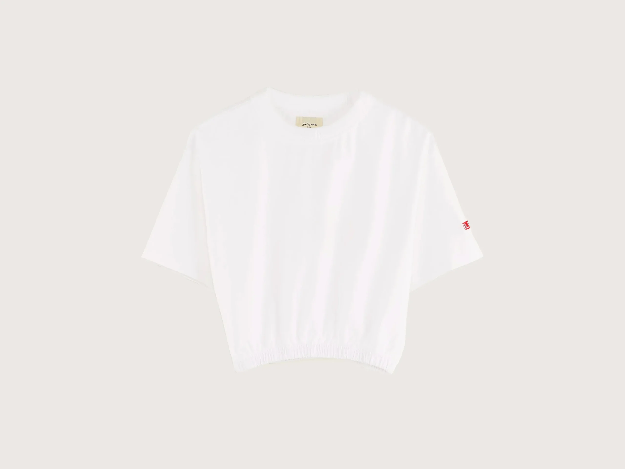 Los T-shirt met korte mouwen, geribde ronde hals en cropped elastische taille, gemaakt van halfzwaar, wit katoenjersey met een BLR89-kruissteekborduursel op de voorkant.Losse pasvorm Ronde halsKorte mouwen Cropped, elastische tailleHalfzwaar katoenjerseyContrasterend BLR89- kruissteekborduursel linksonder