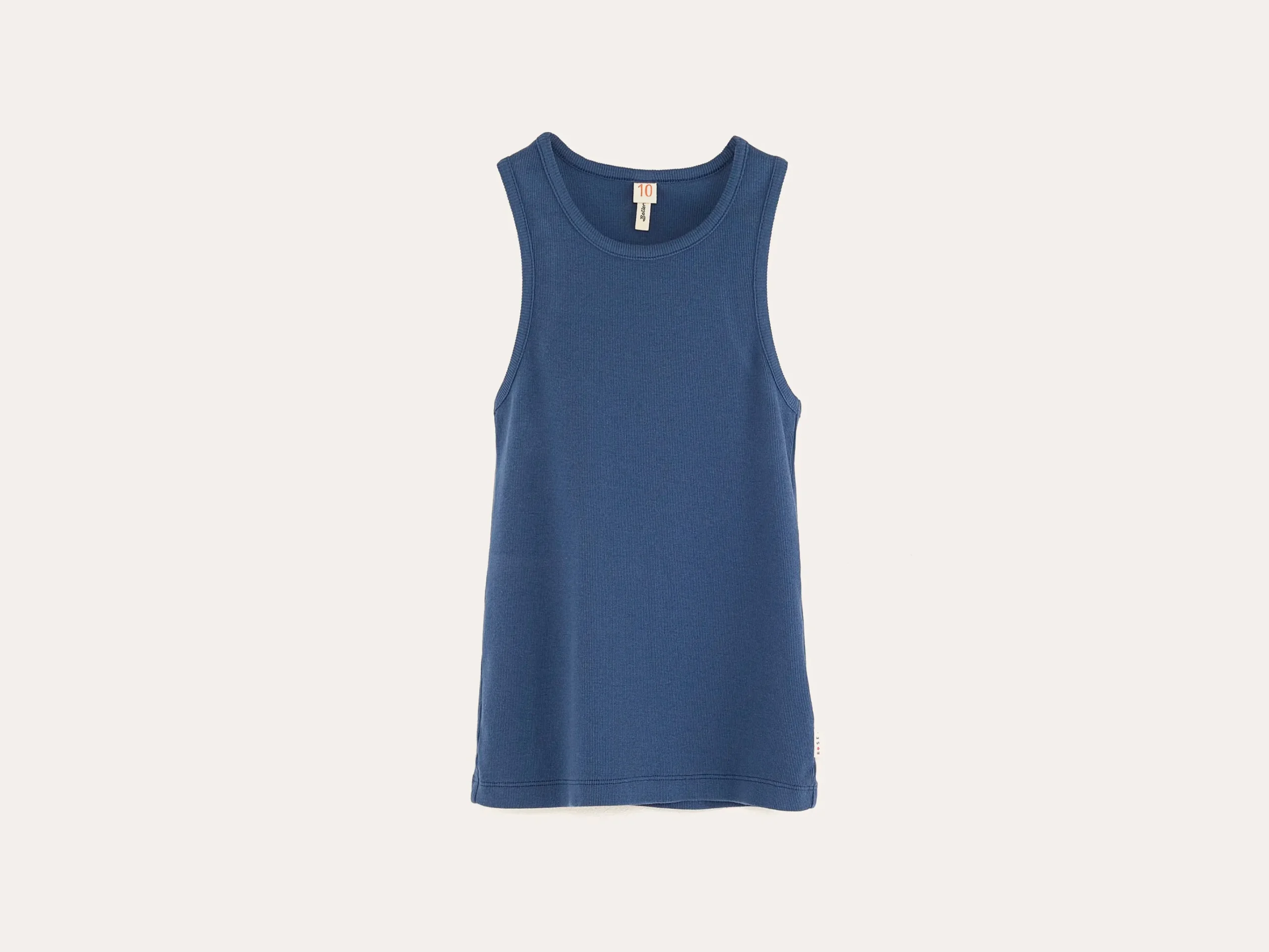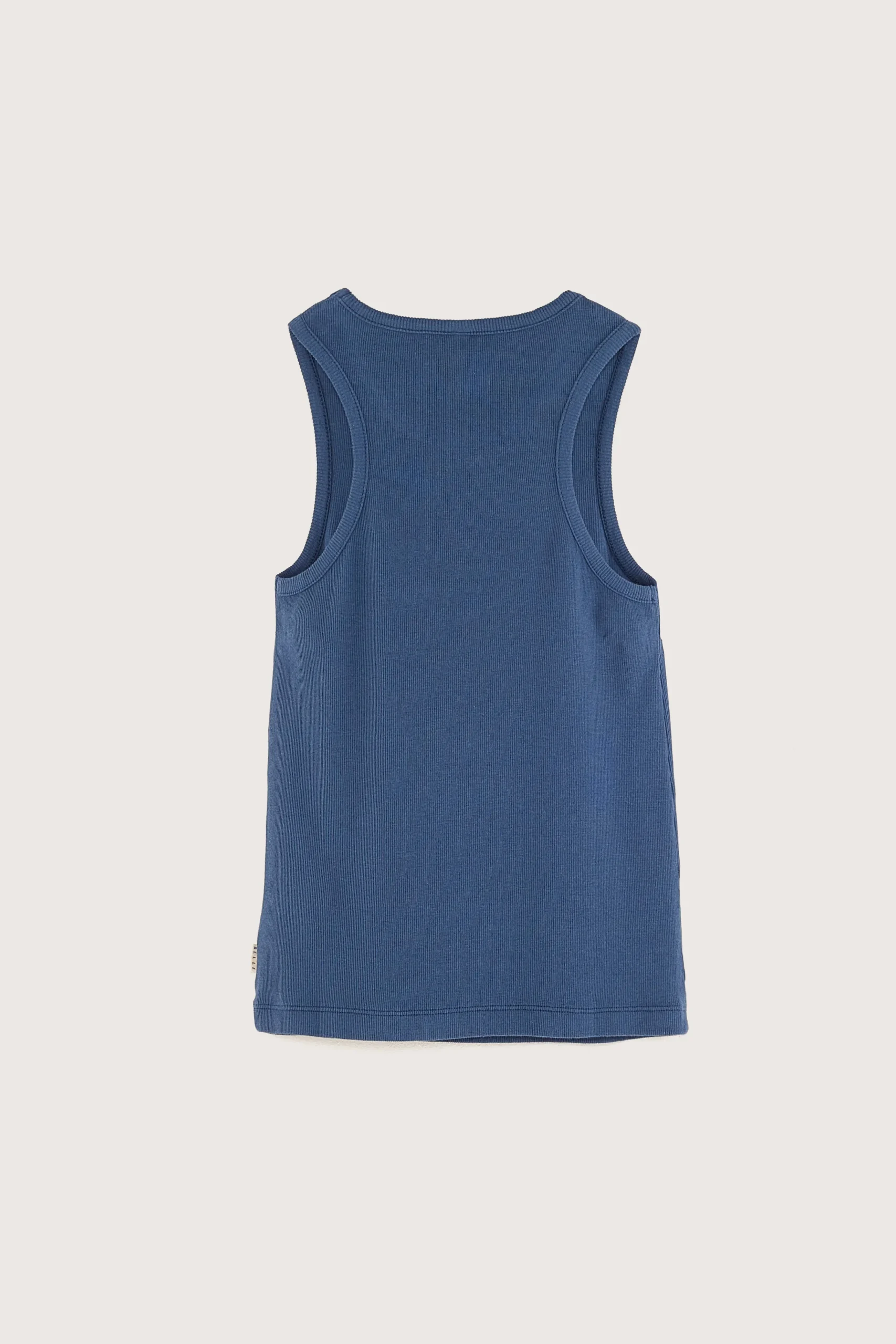 Slim fit racer-back tanktop, gemaakt van geribd, denimblauw katoenjersey.Slim fit Ronde hals Racer-backHalfzwaar geribd katoenjersey