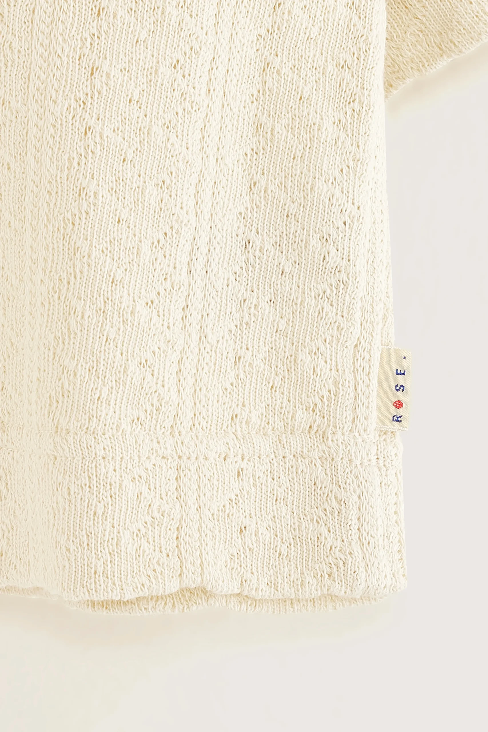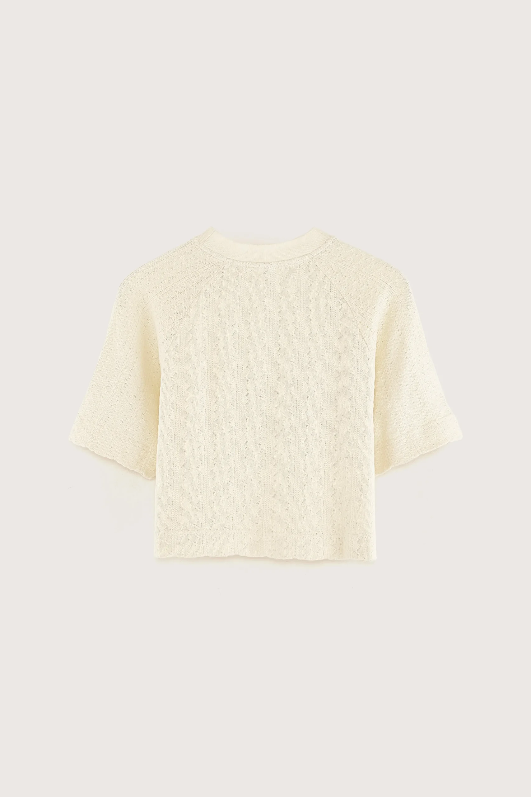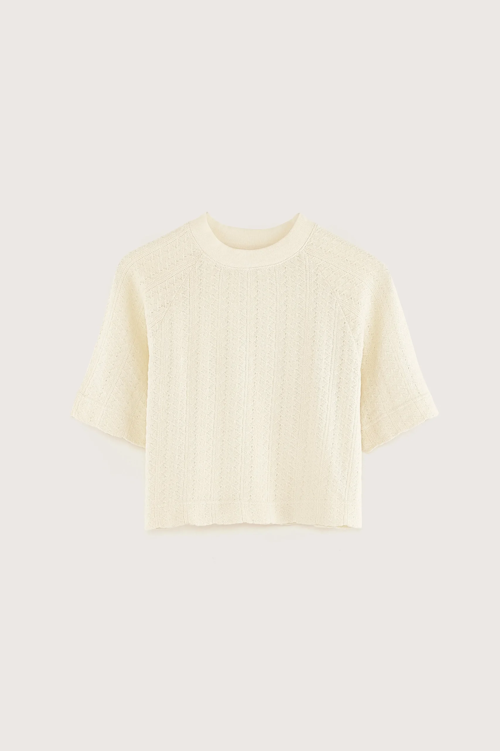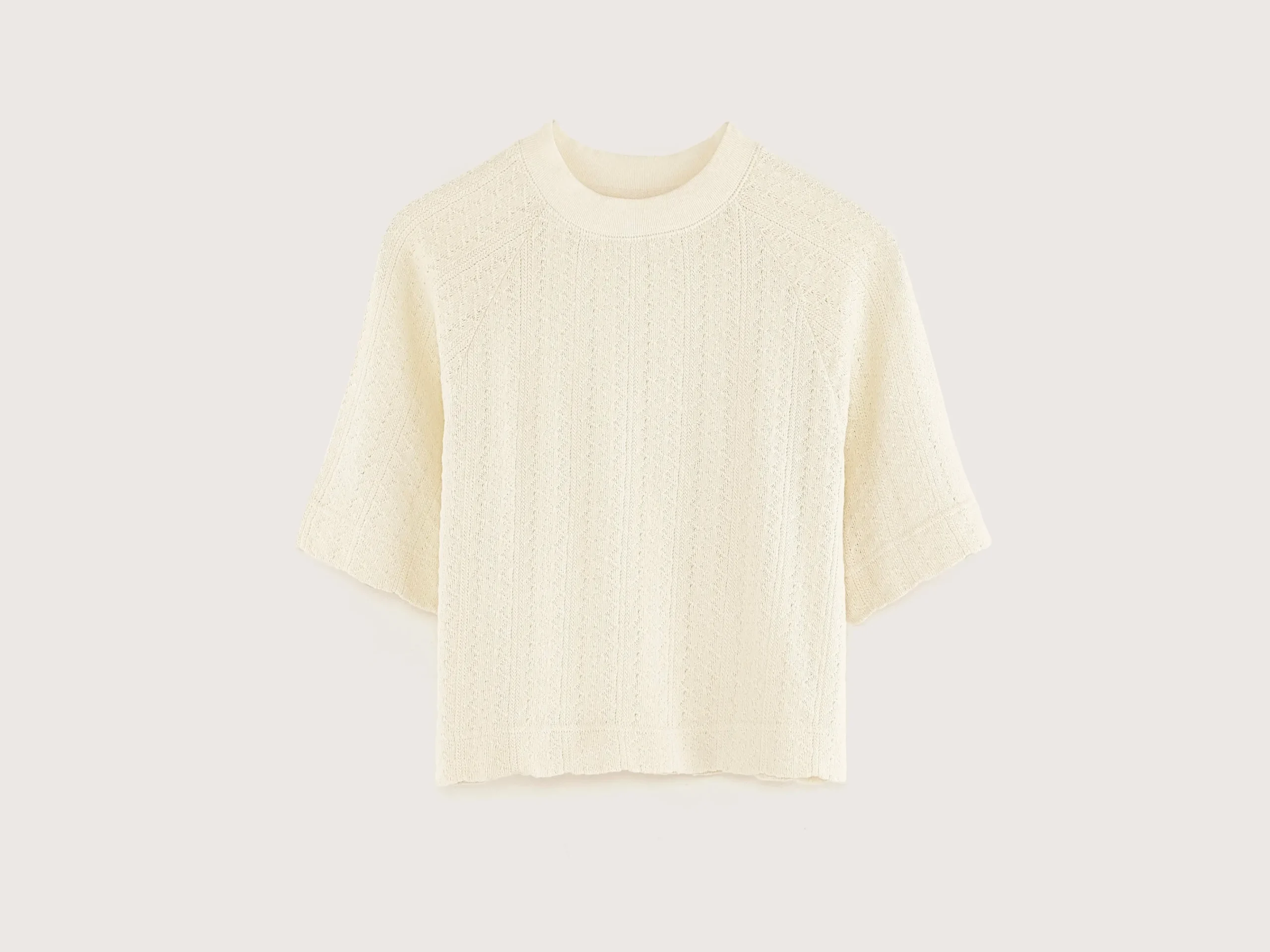 Los T-shirt met korte raglanmouwen en geribde ronde hals, gemaakt van kantachtige, ecru katoenjersey.Losse pasvorm Ronde halsKorte mouwen Katoenenjersey met kantBellerose-logo
