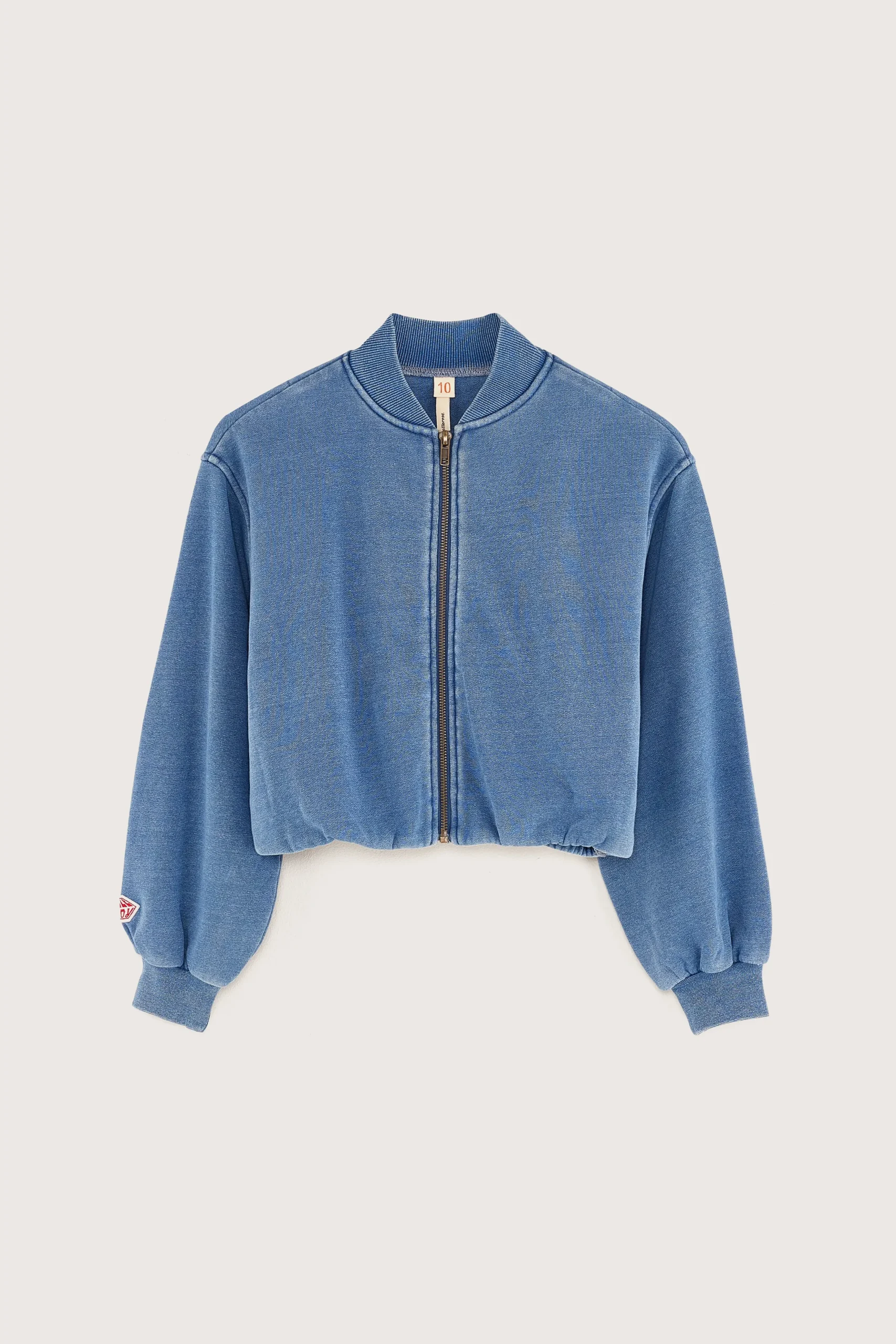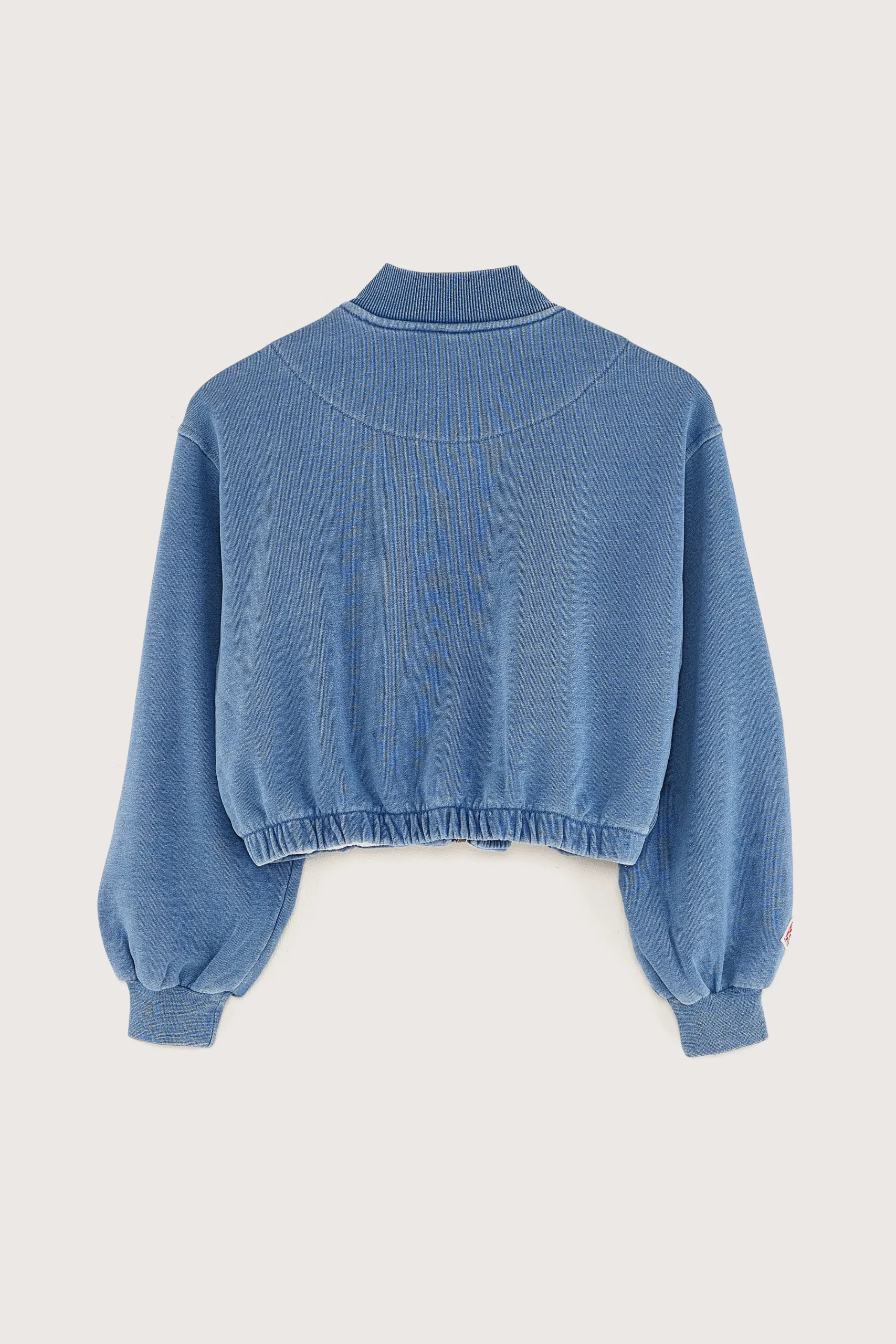 Losse jas in bomber-stijl met ritssluiting, opstaande kraag, geribde boorden en elastische taille met gerimpelde plooien, gemaakt van indigoblauw katoenfleece.Losse pasvorm Opstaande kraagLange mouwen Met ritssluitingElastische tailleGeribde boorden