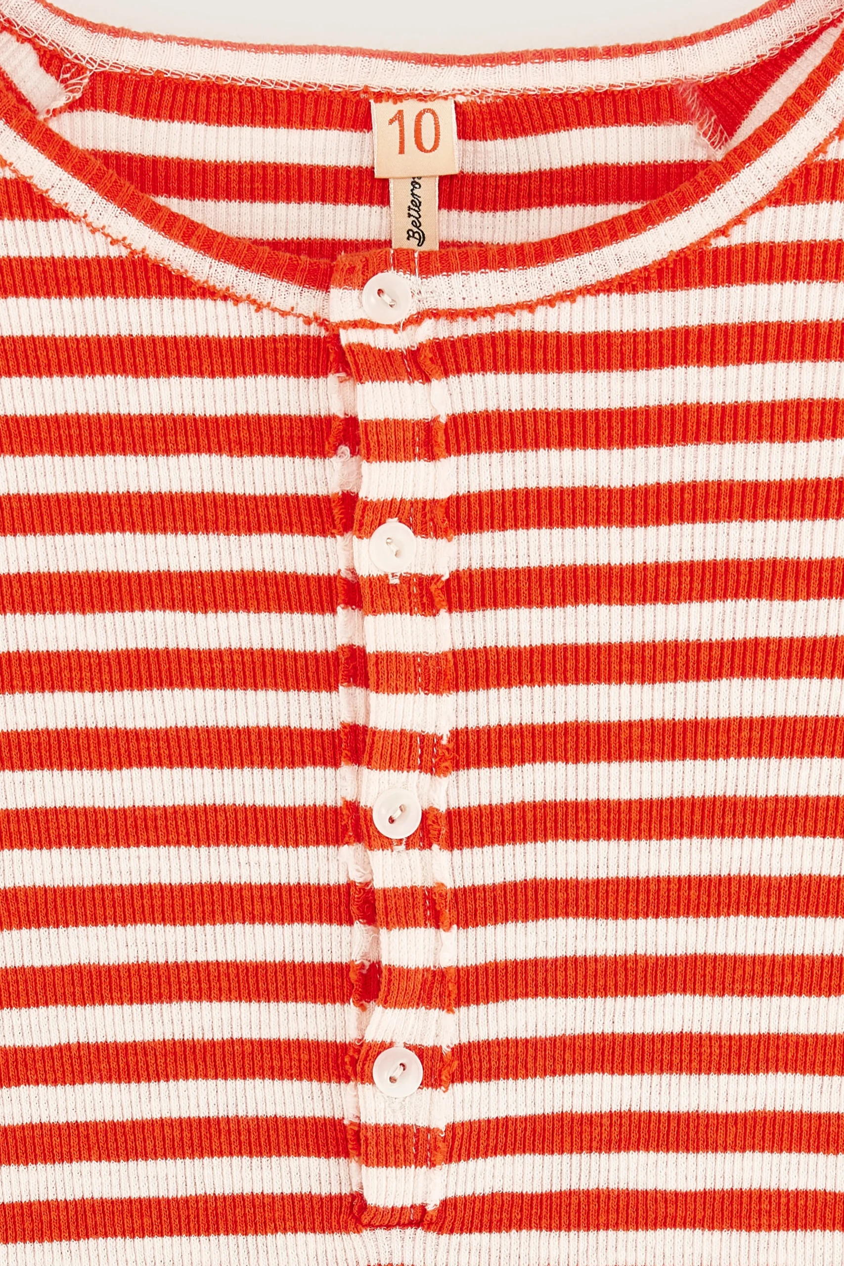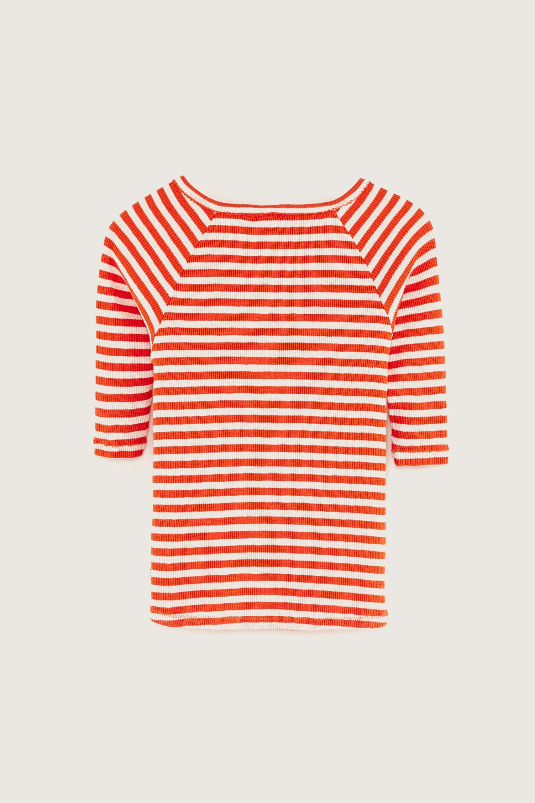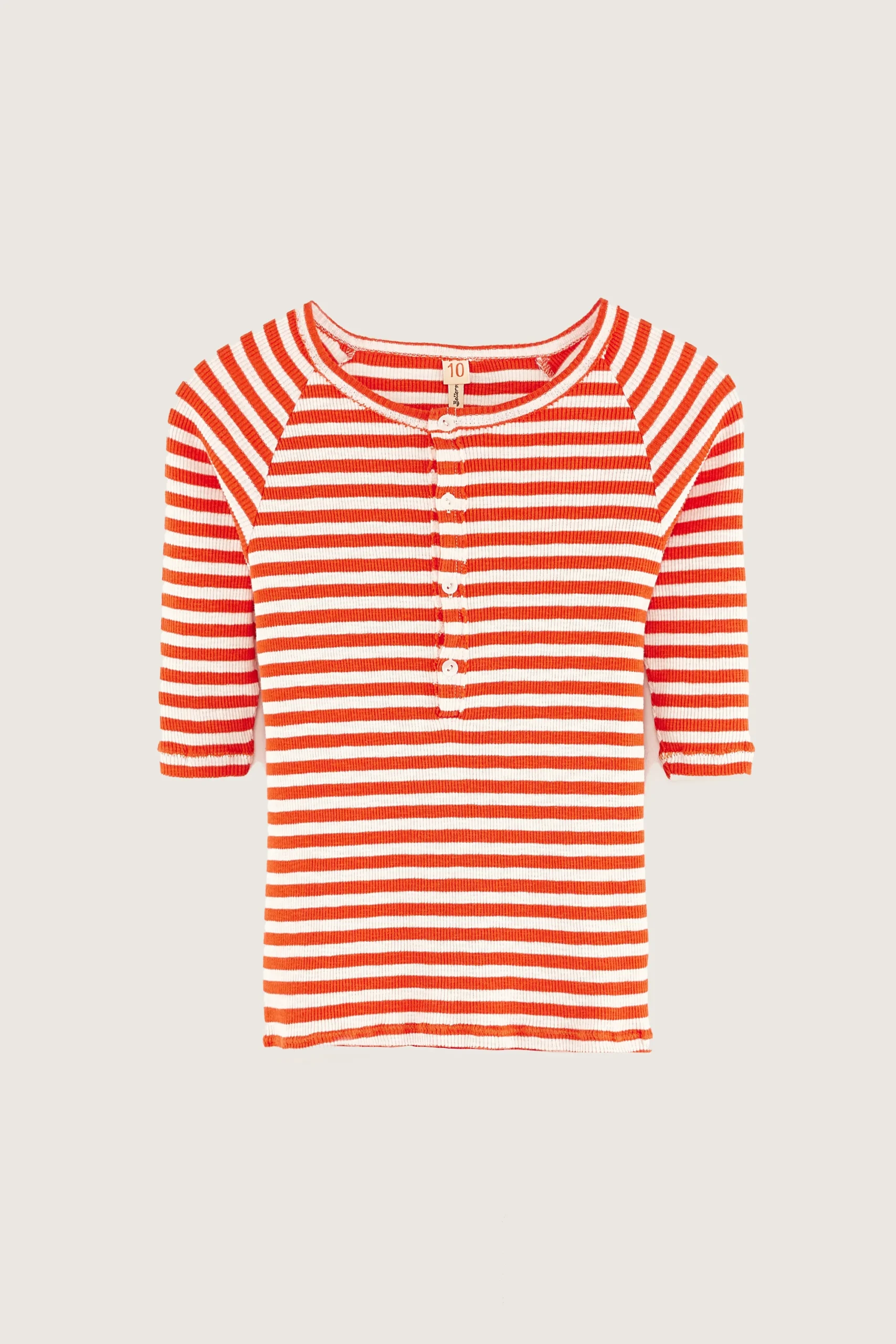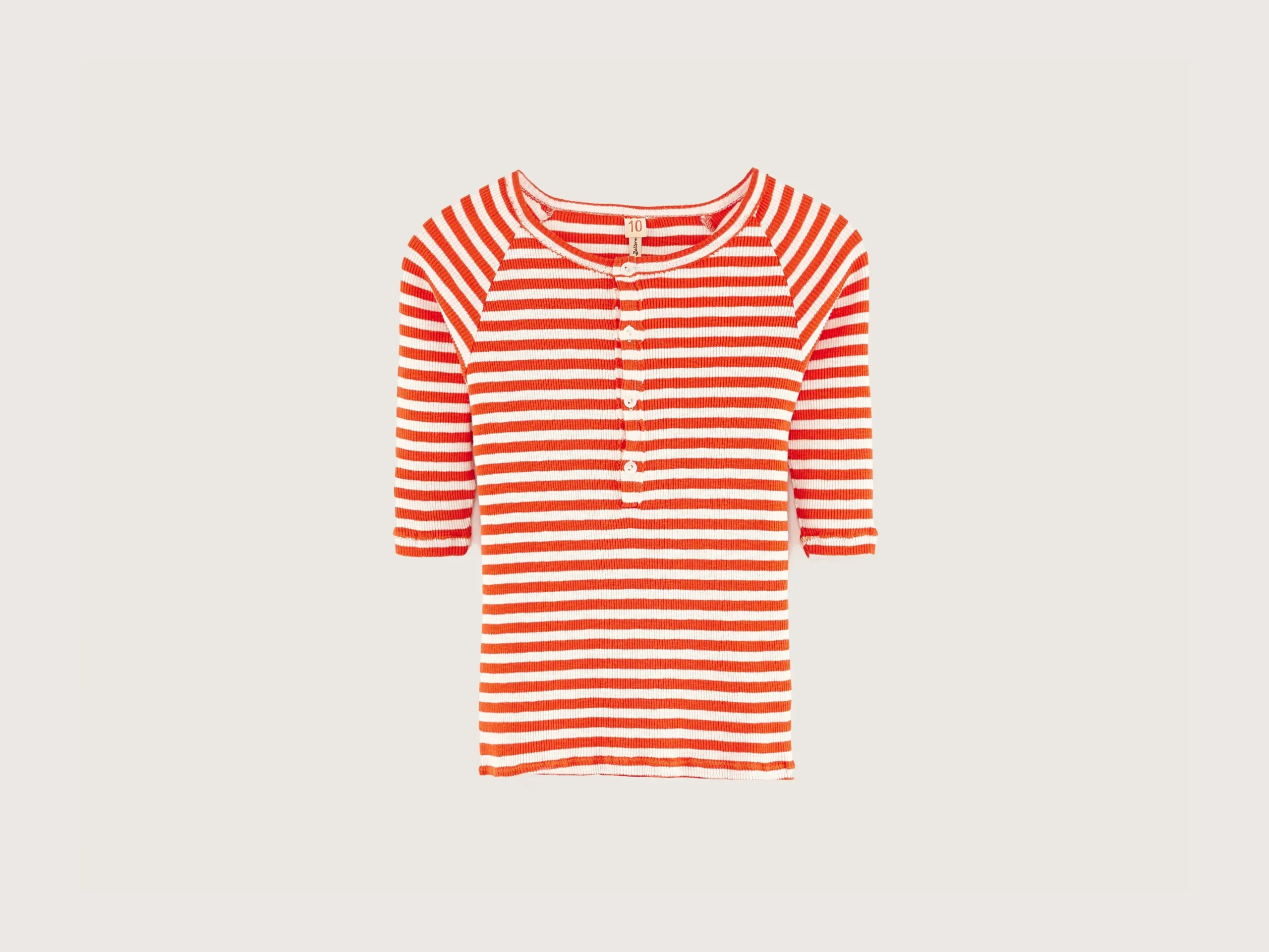 Slim fit henley T-shirt met 3/4-mouwen, geknoopte kraag en onafgewerkte randen, gemaakt van halfzwaar, geribd, ecru jersey met rode strepen.Slim fit Henleykraag3/4-raglanmouwen Halfzwaar geribd jersey