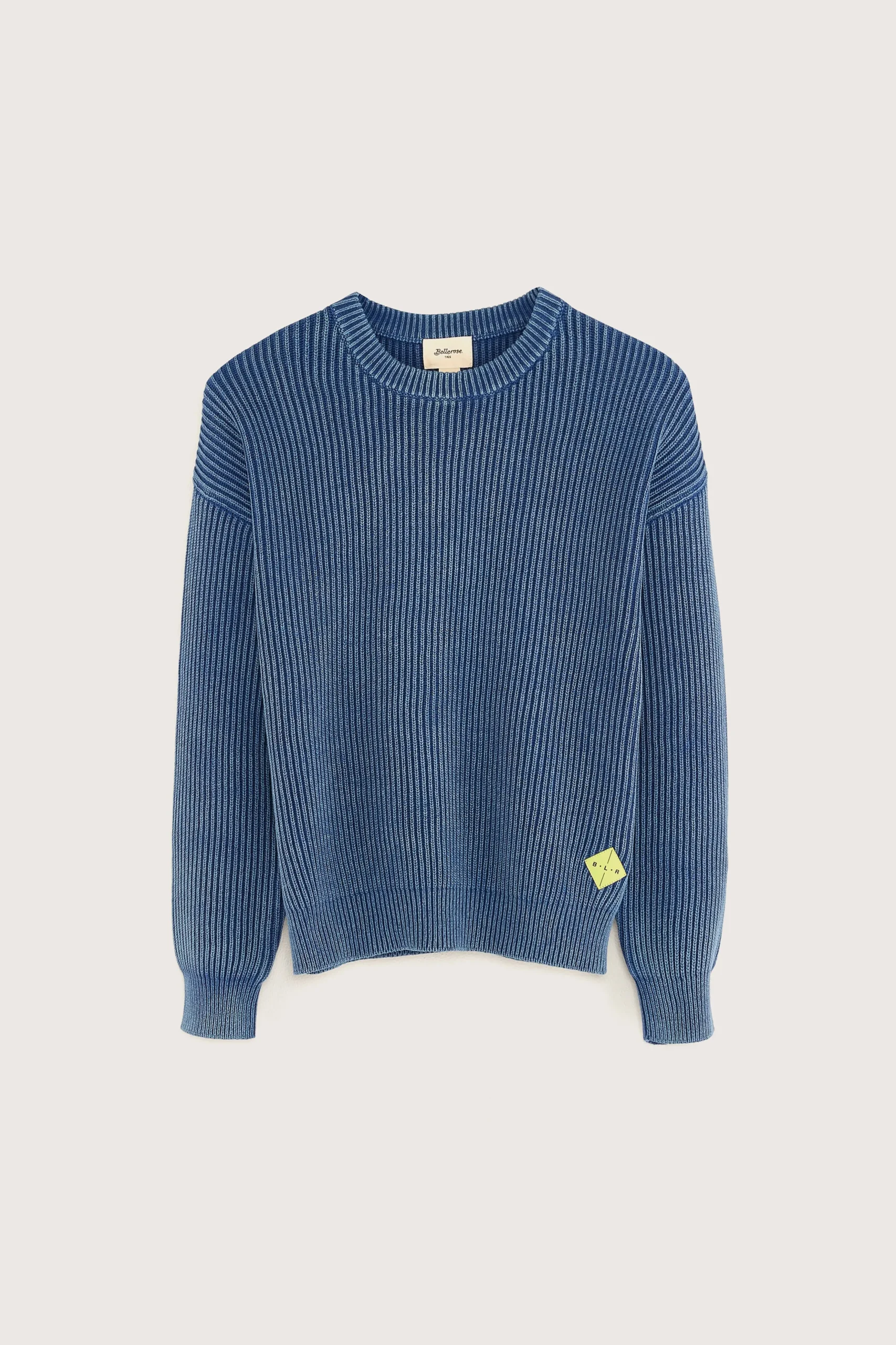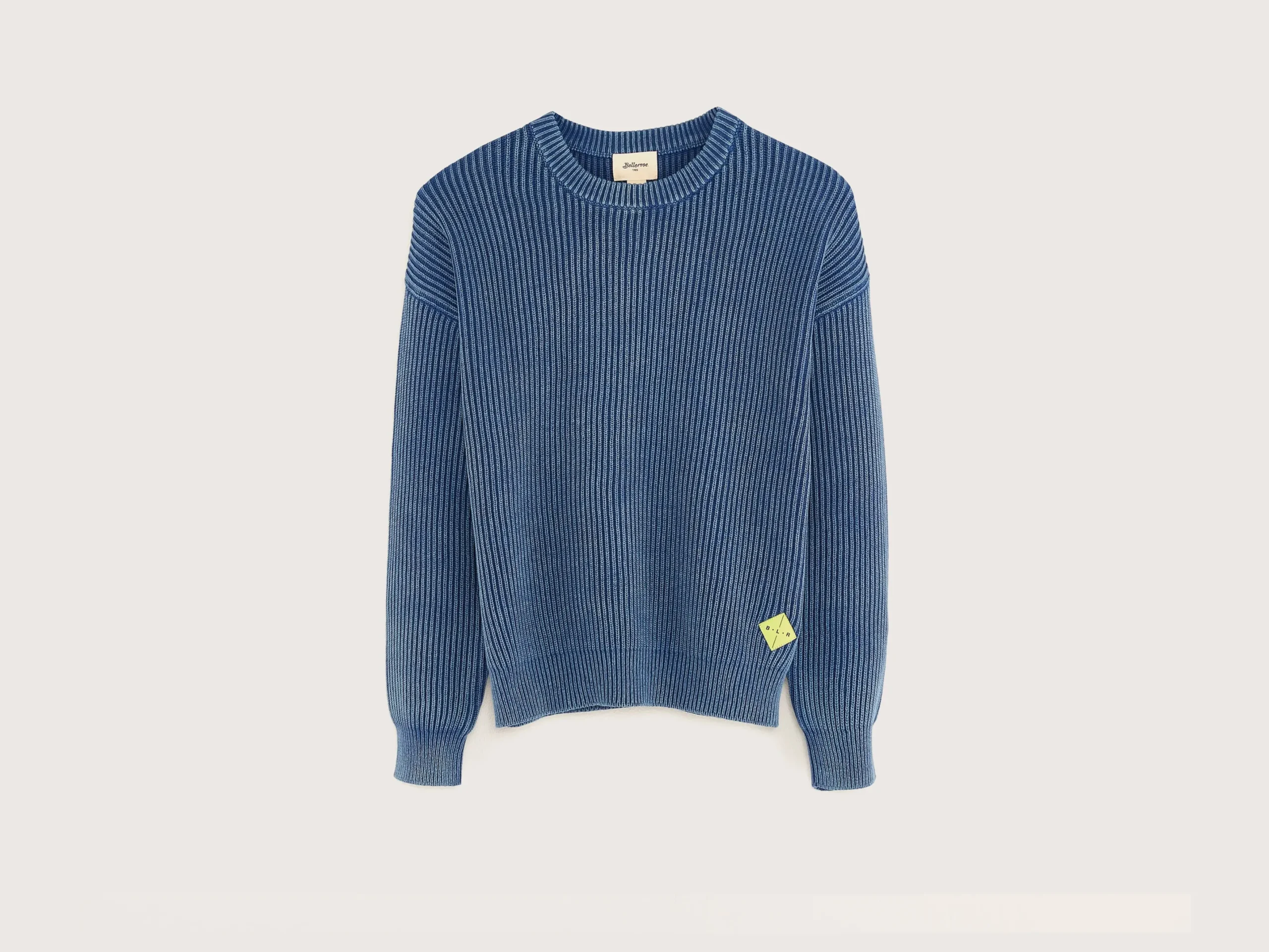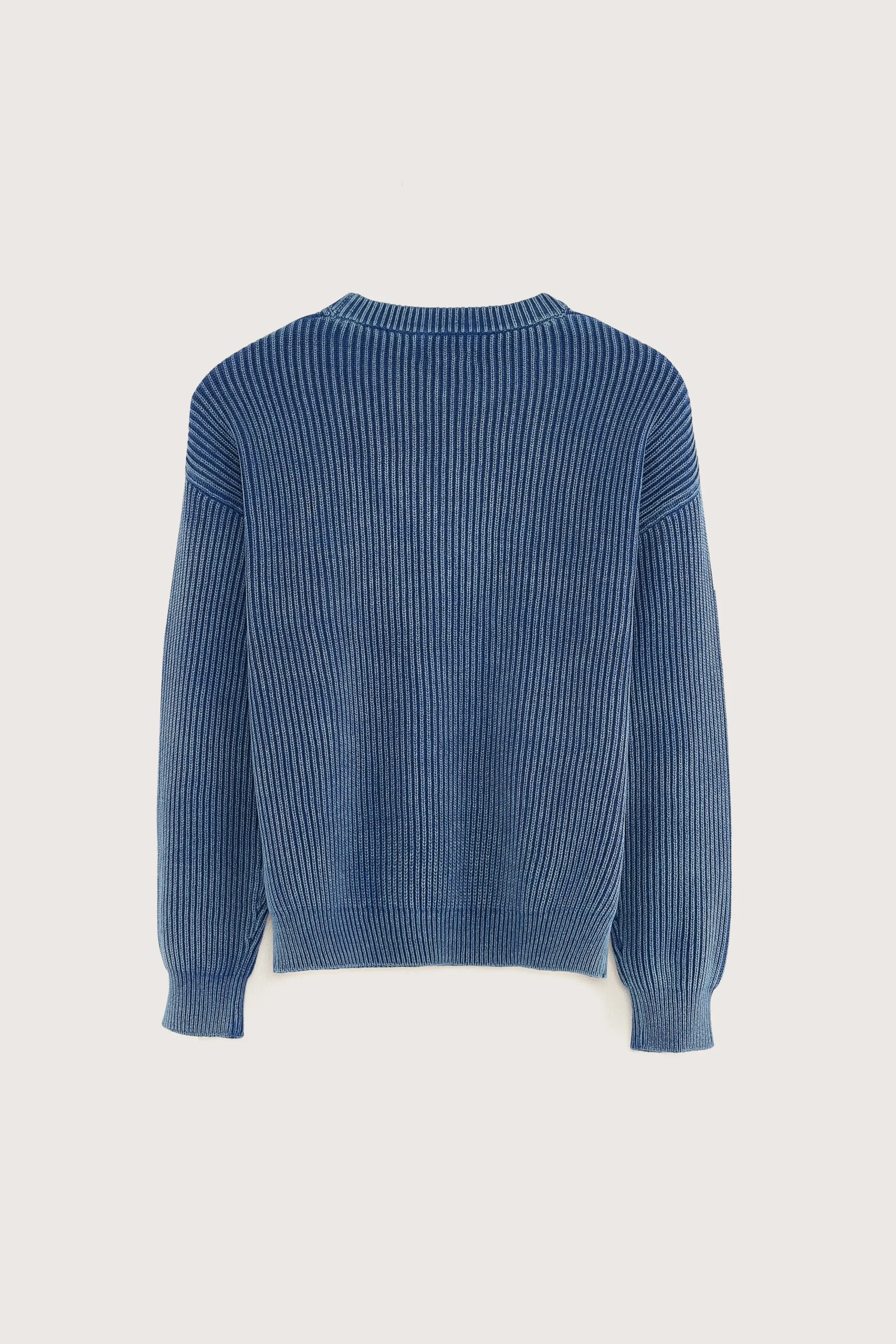 Losse trui met laaghangende schouders en ronde hals, gemaakt van ribgebreide zacht, denimblauw, acid washed katoen.Losse pasvorm Ronde hals Lange mouwen met laaghangende schouders Gebreid ribpatroon Medium gauge Acid washed
