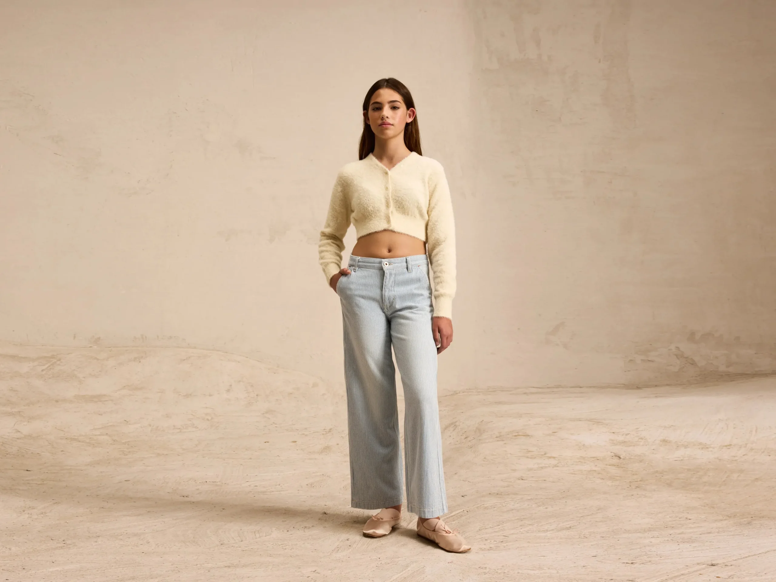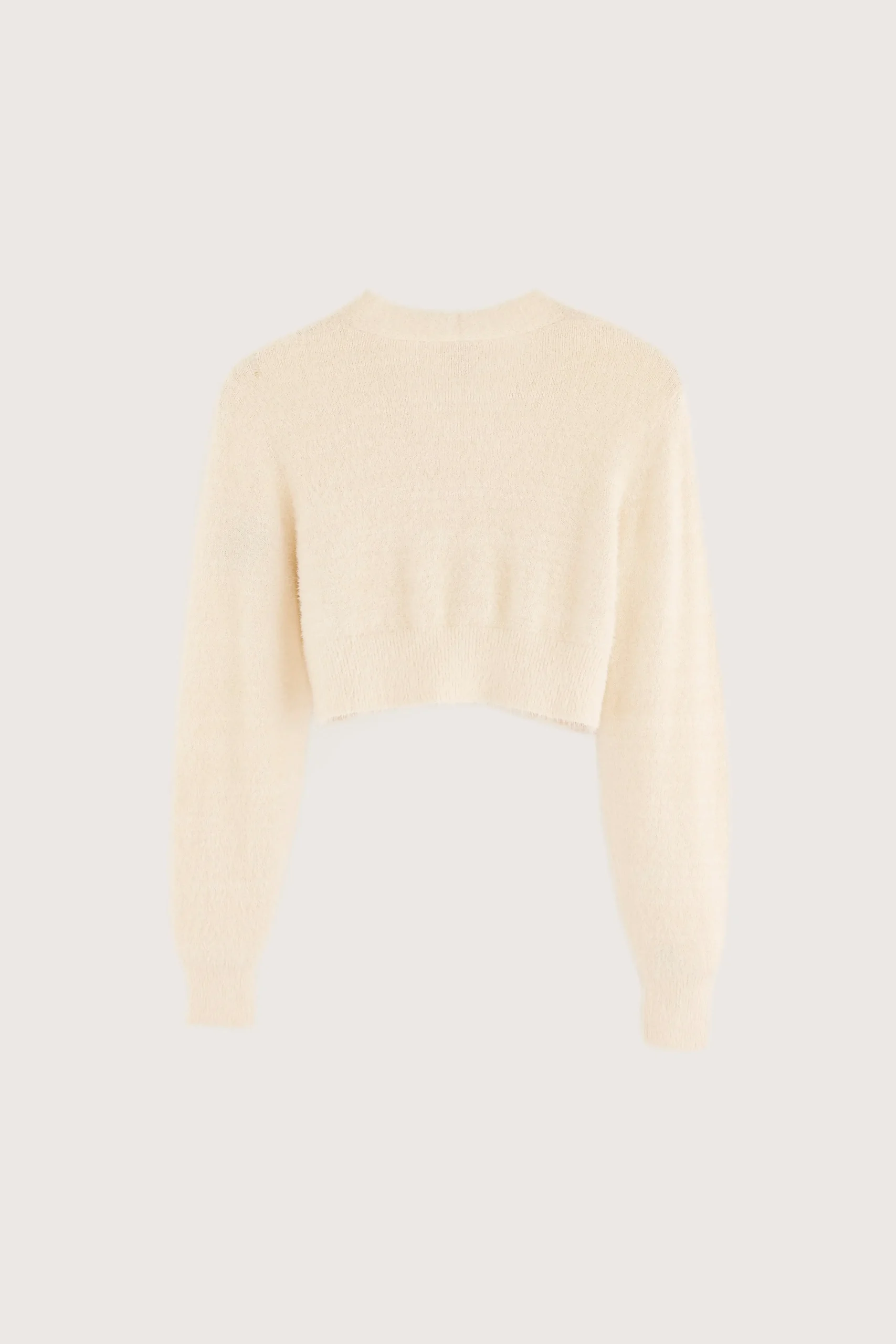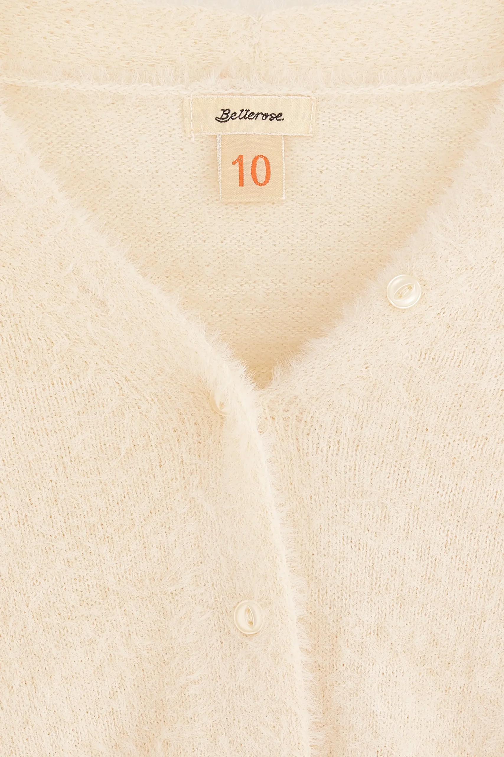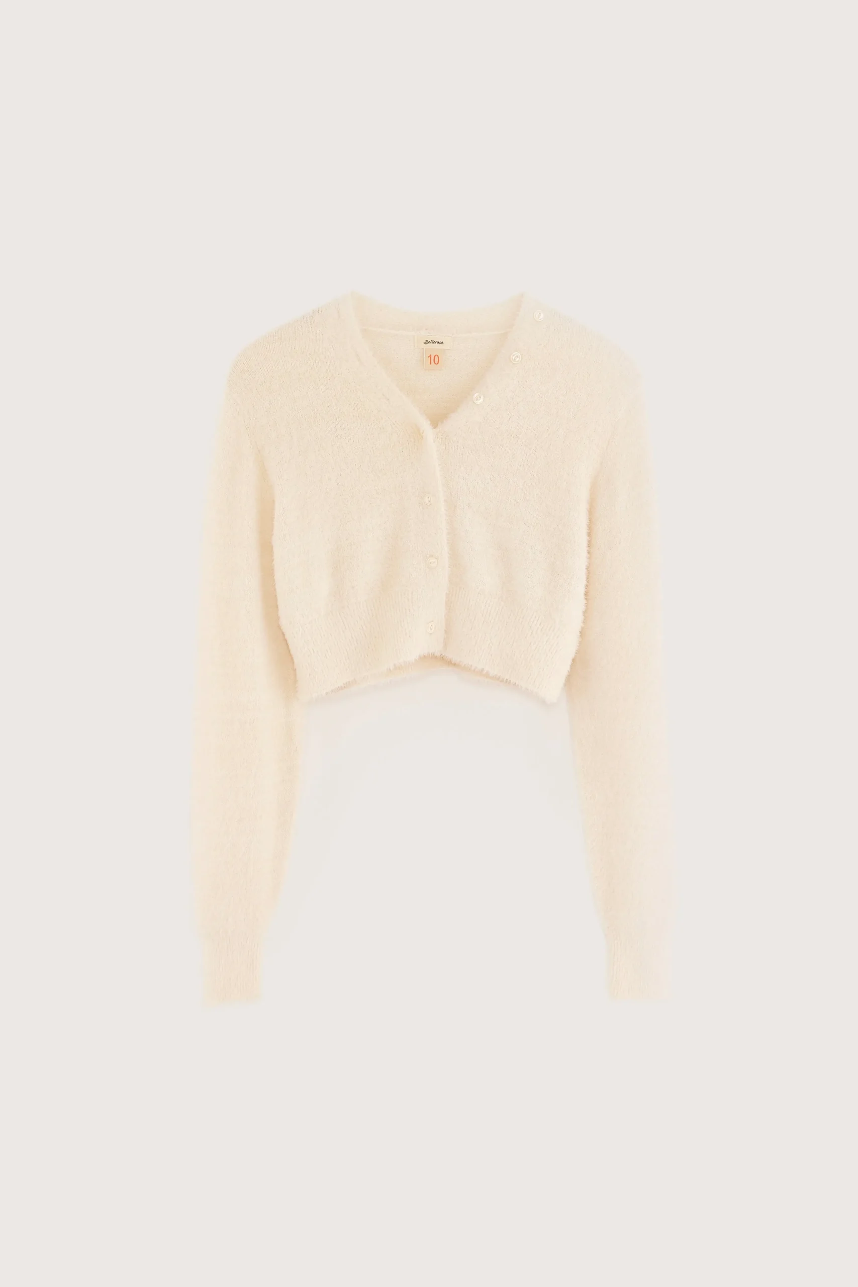 Klassieke cardigan met cropped taille, lange mouwen, v-hals en extra knopen langs de halslijn, gemaakt van zachte en pluizige, ecru garen.Klassieke pasvorm V-hals met extra knopen langs de halsLange mouwen Gebreid jerseyGeribde boordenMedium gauge