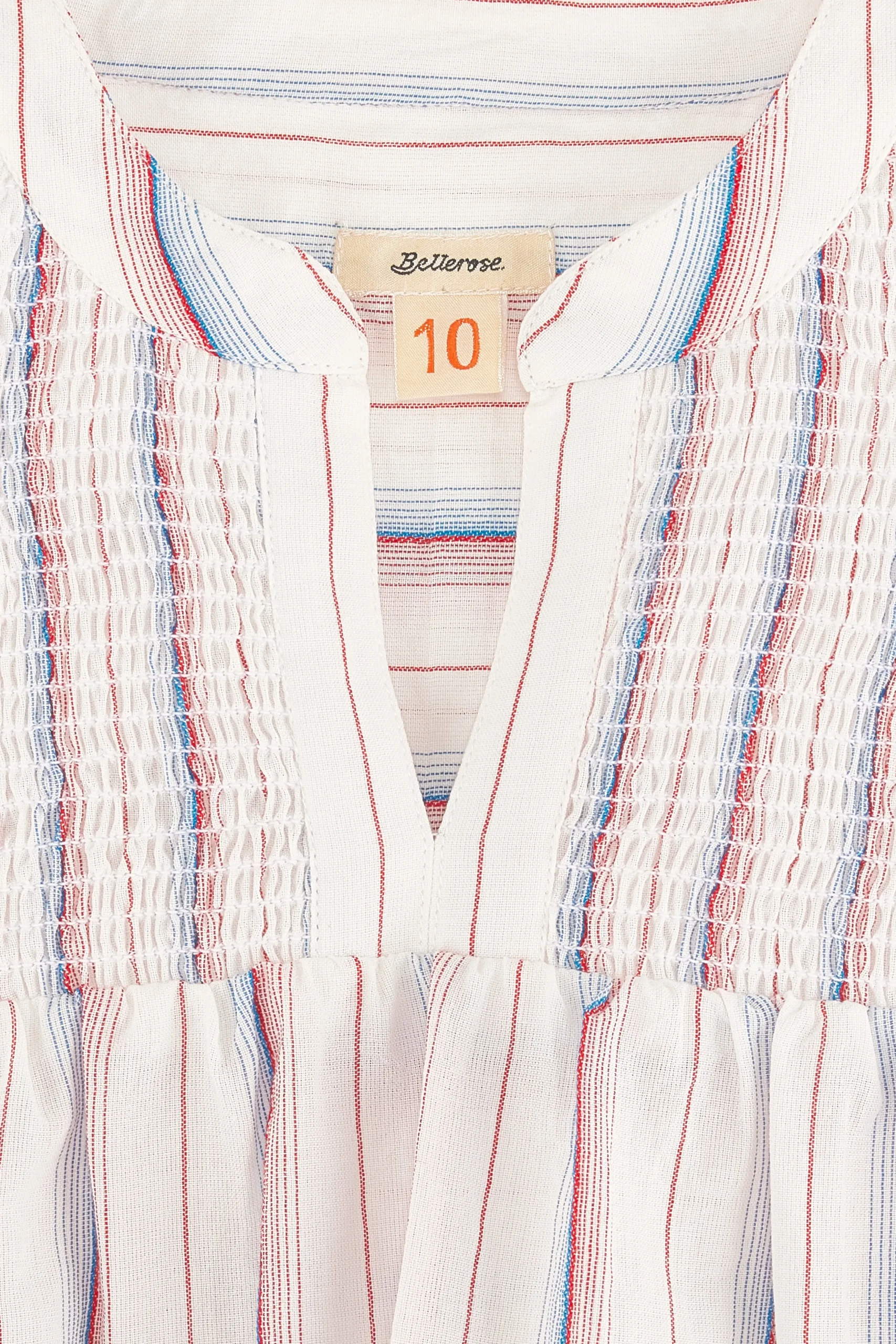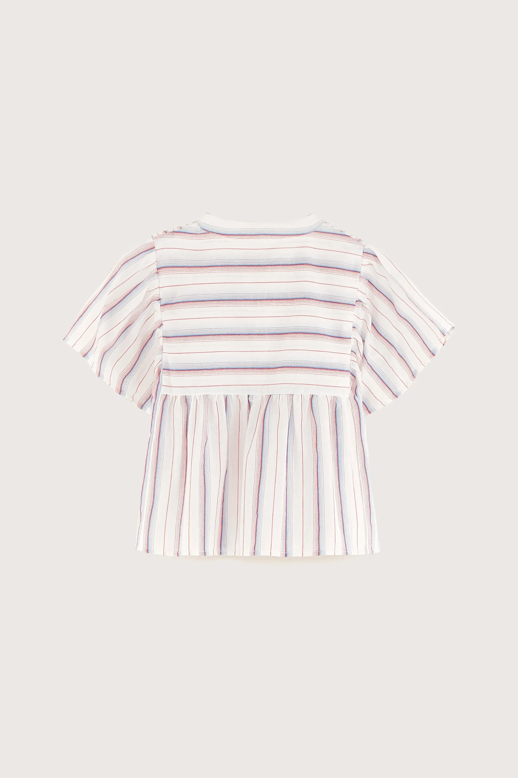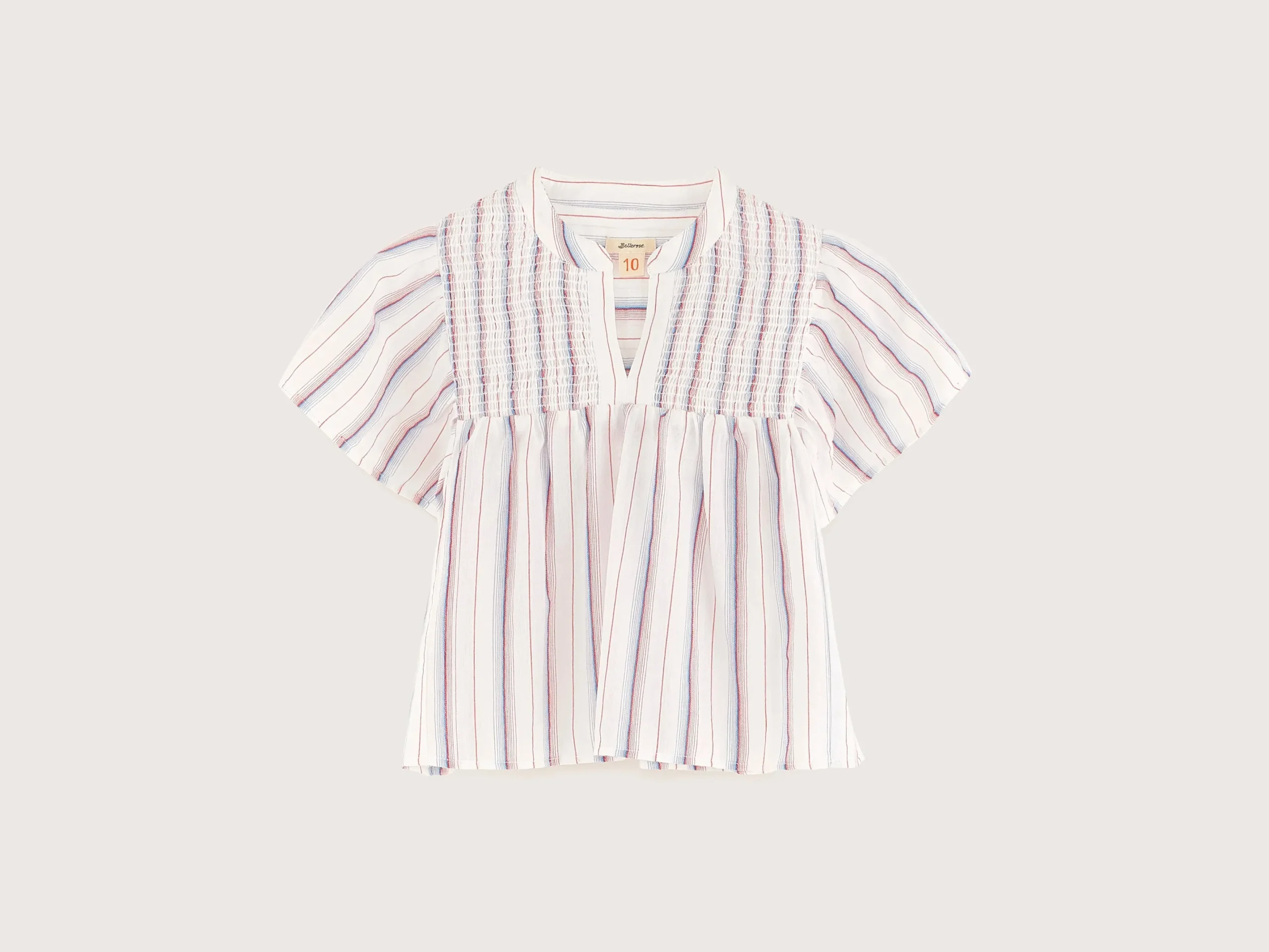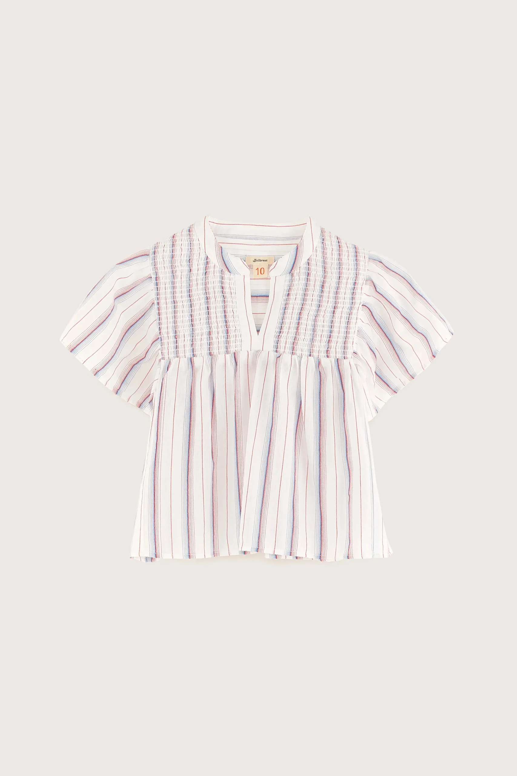 Klassieke, cropped blouse met korte mouwen, gesmokt juk en gerimpelde details, gemaakt van licht katoen met kleurrijke strepen.Klassieke pasvorm Ronde hals met splitKorte mouwenCropped Gesmokt juk aan de voorkantGerimpelde details