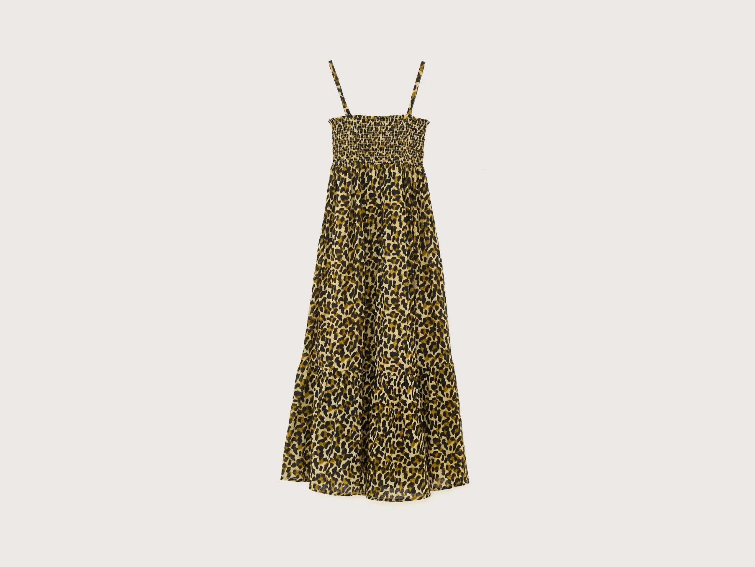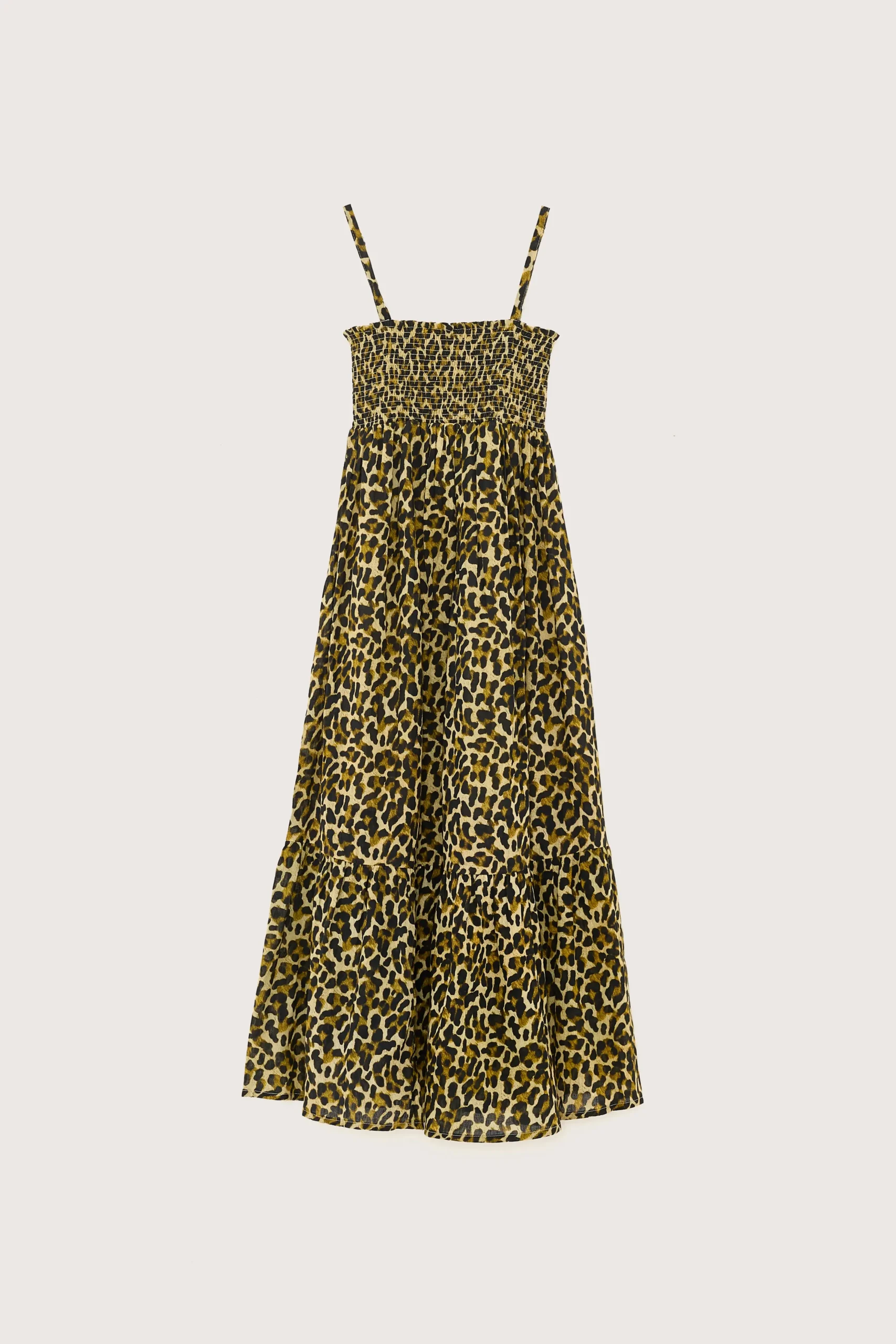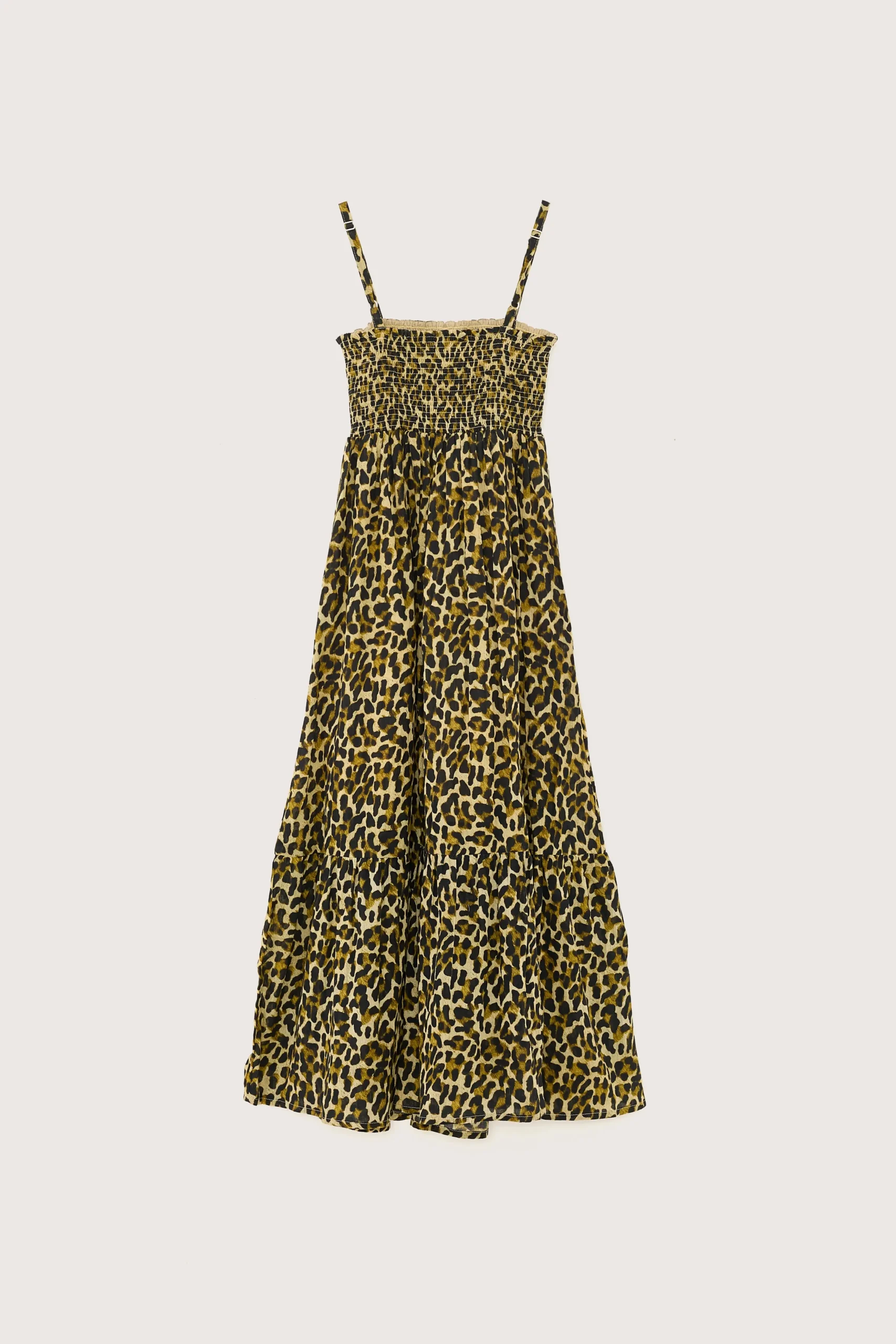 Lange jurk met gesmokt lijfje en verstelbare bandjes, gemaakt van katoen met all-over luipaardprint.Klassieke pasvorm, lange lengteRechte halsVerstelbare bandjes Gesmokt lijfjeA-lijn Gevoerd