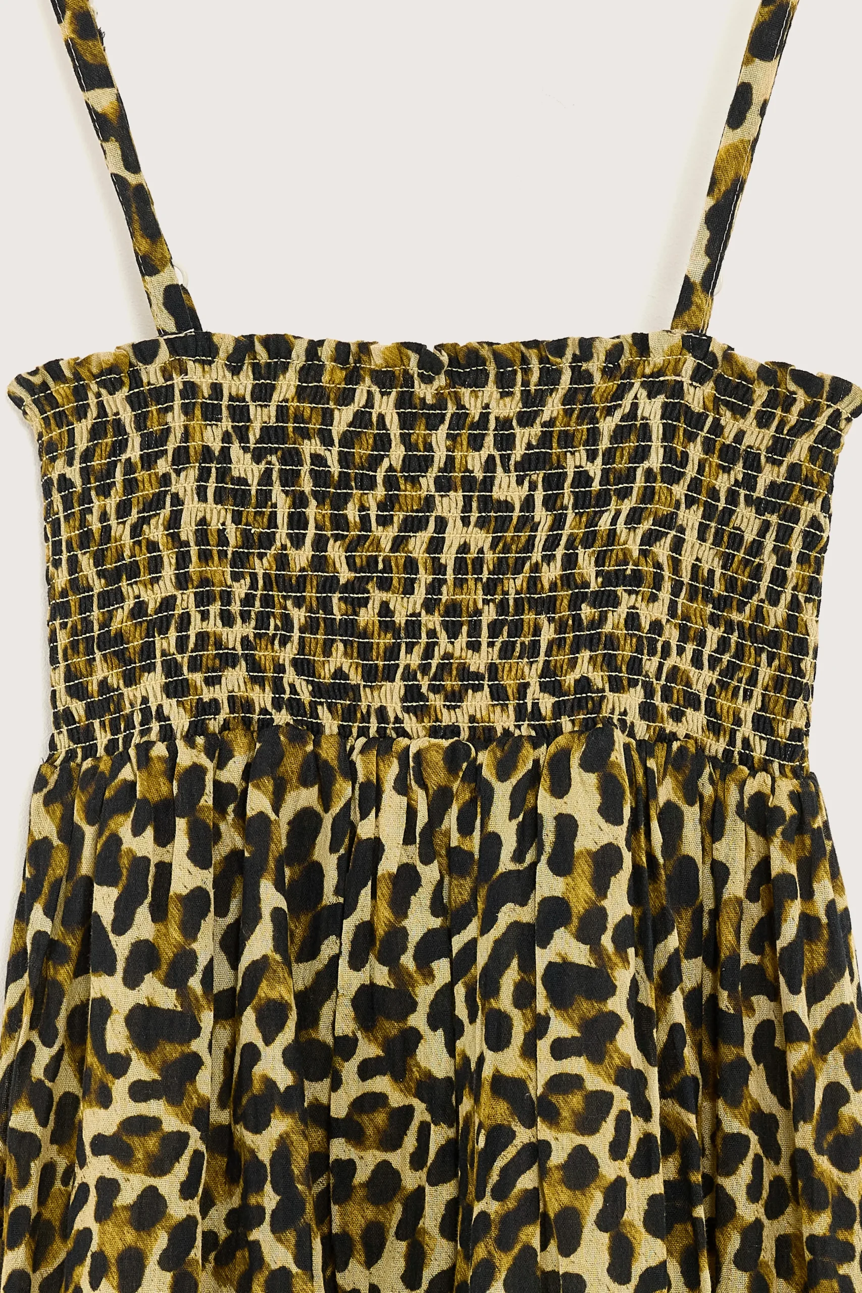 Lange jurk met gesmokt lijfje en verstelbare bandjes, gemaakt van katoen met all-over luipaardprint.Klassieke pasvorm, l…