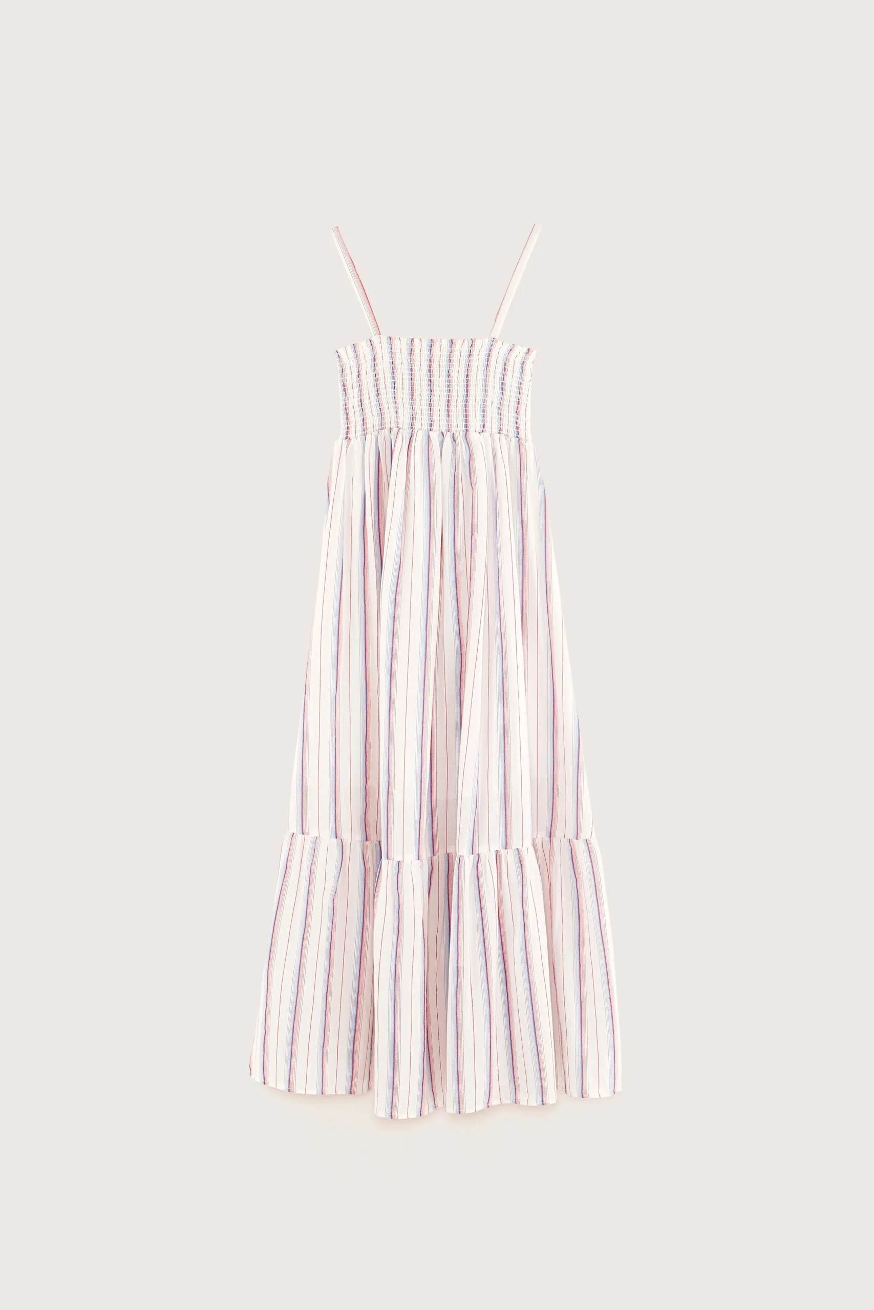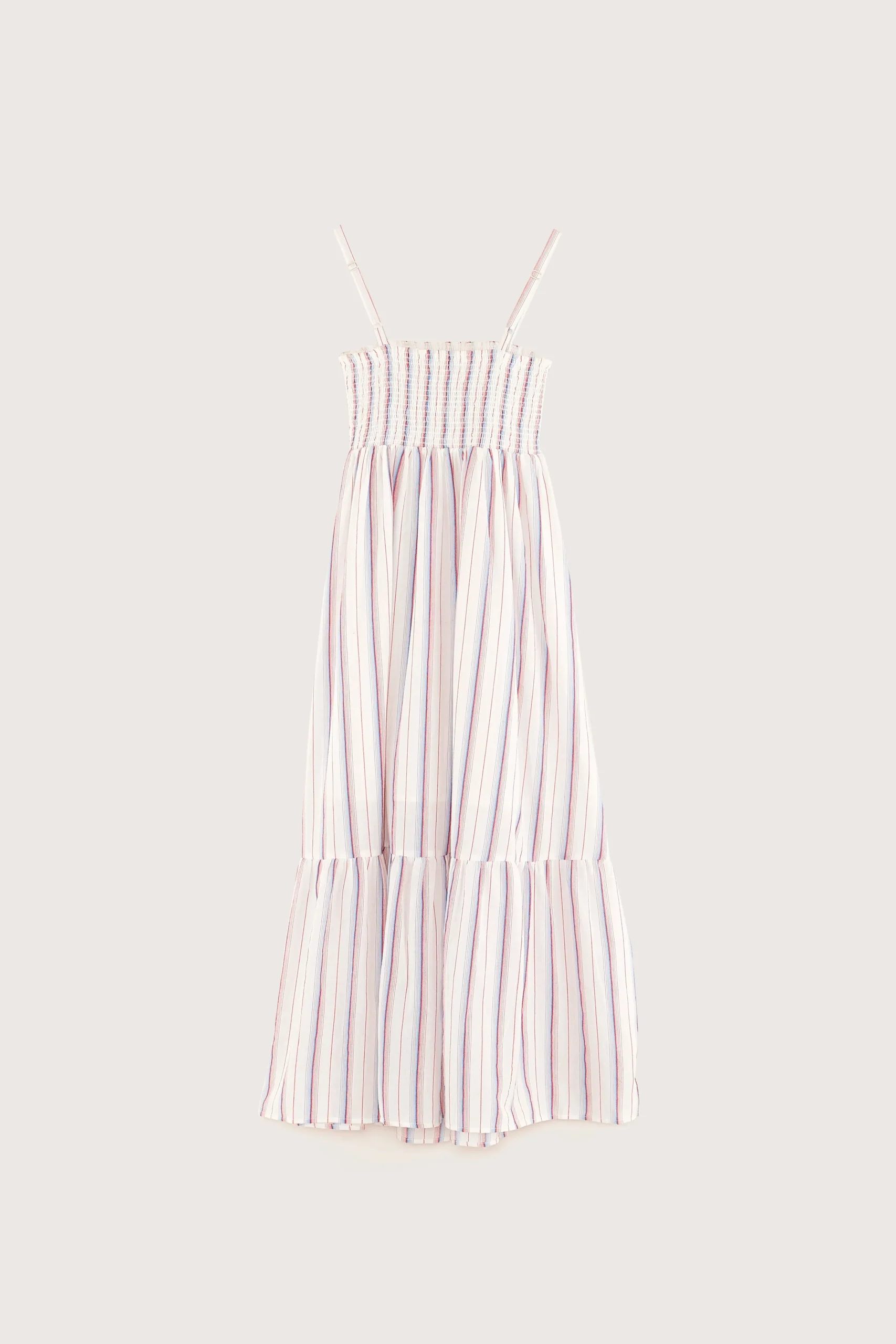 Lange jurk met gesmokt lijfje en verstelbare bandjes, gemaakt van katoen met zomerse en veelkleurige strepen.Klassieke pasvorm, lange lengteRechte halsVerstelbare bandjes Gesmokt lijfjeA-lijn Gevoerd
