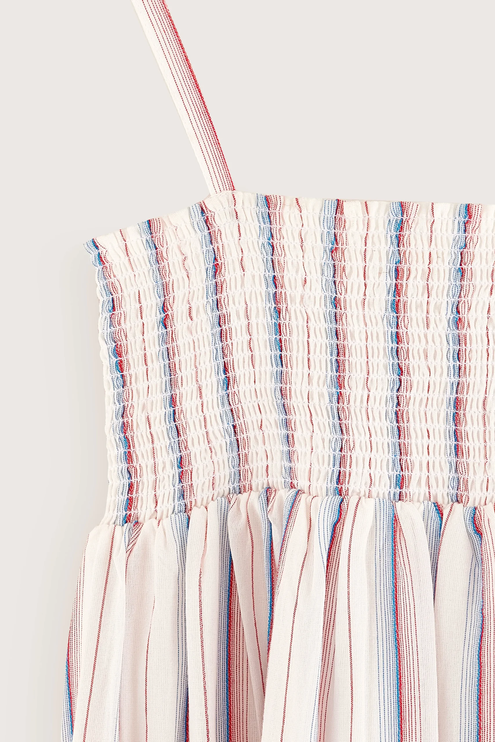 Lange jurk met gesmokt lijfje en verstelbare bandjes, gemaakt van katoen met zomerse en veelkleurige strepen.Klassieke p…
