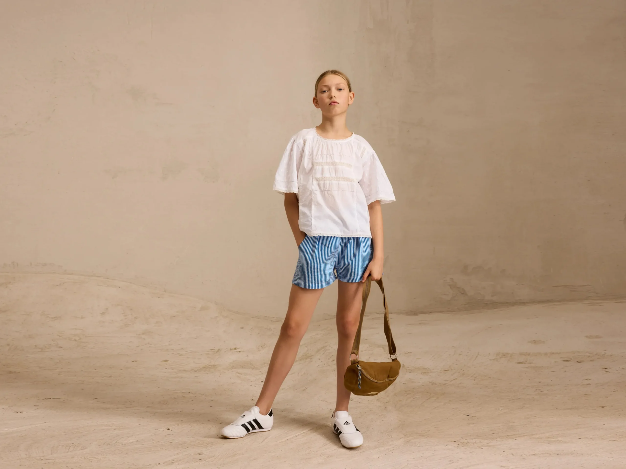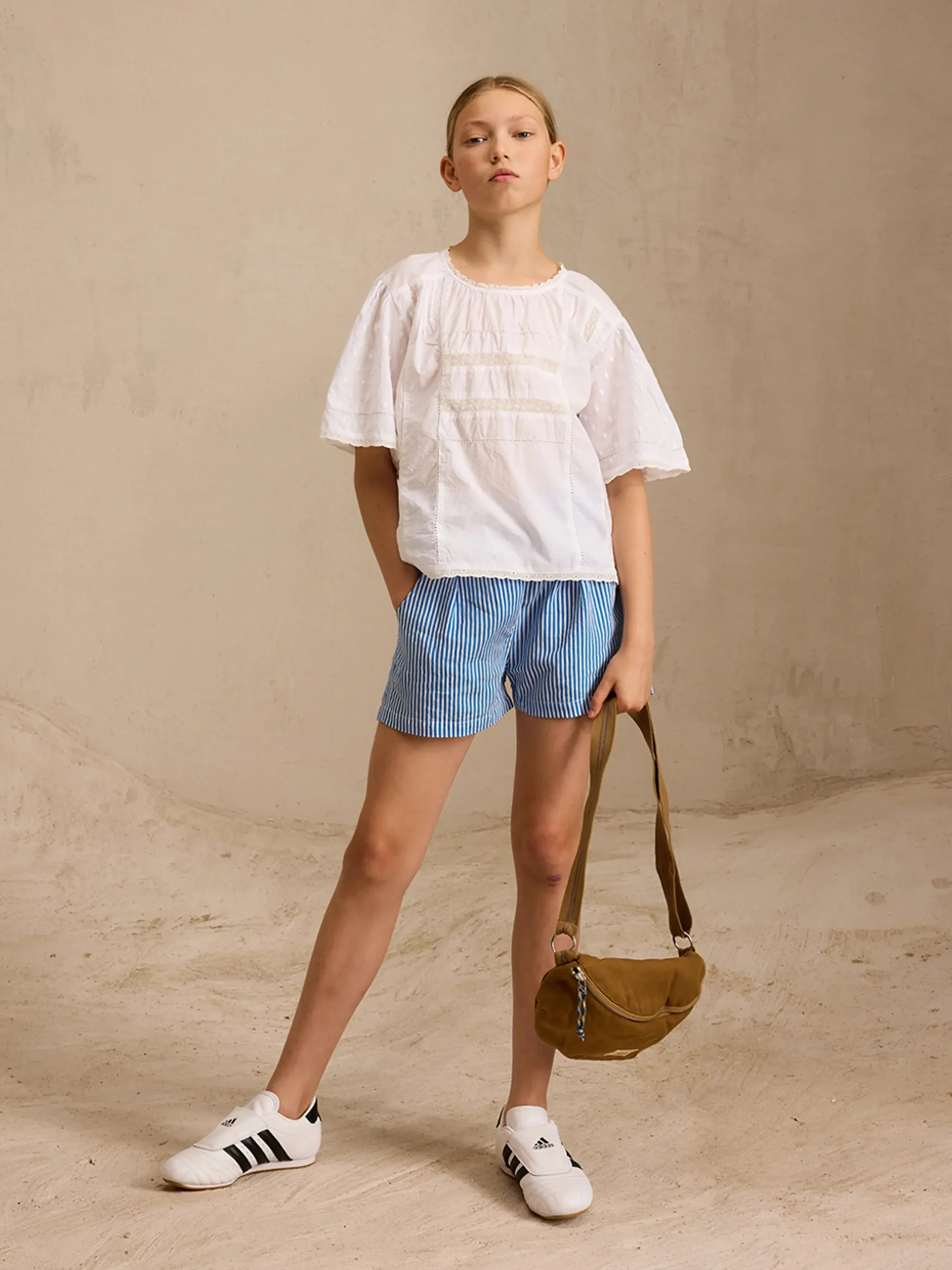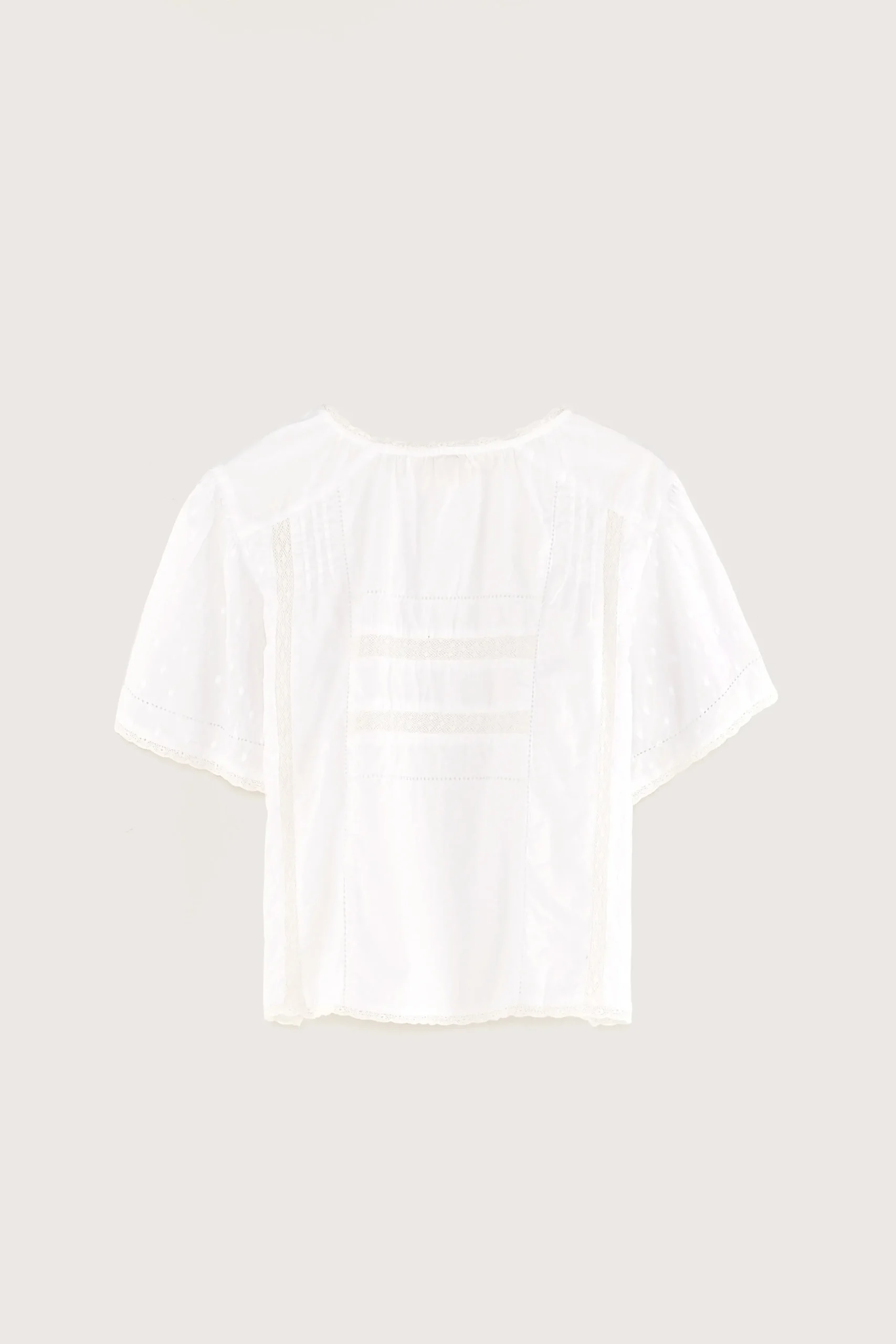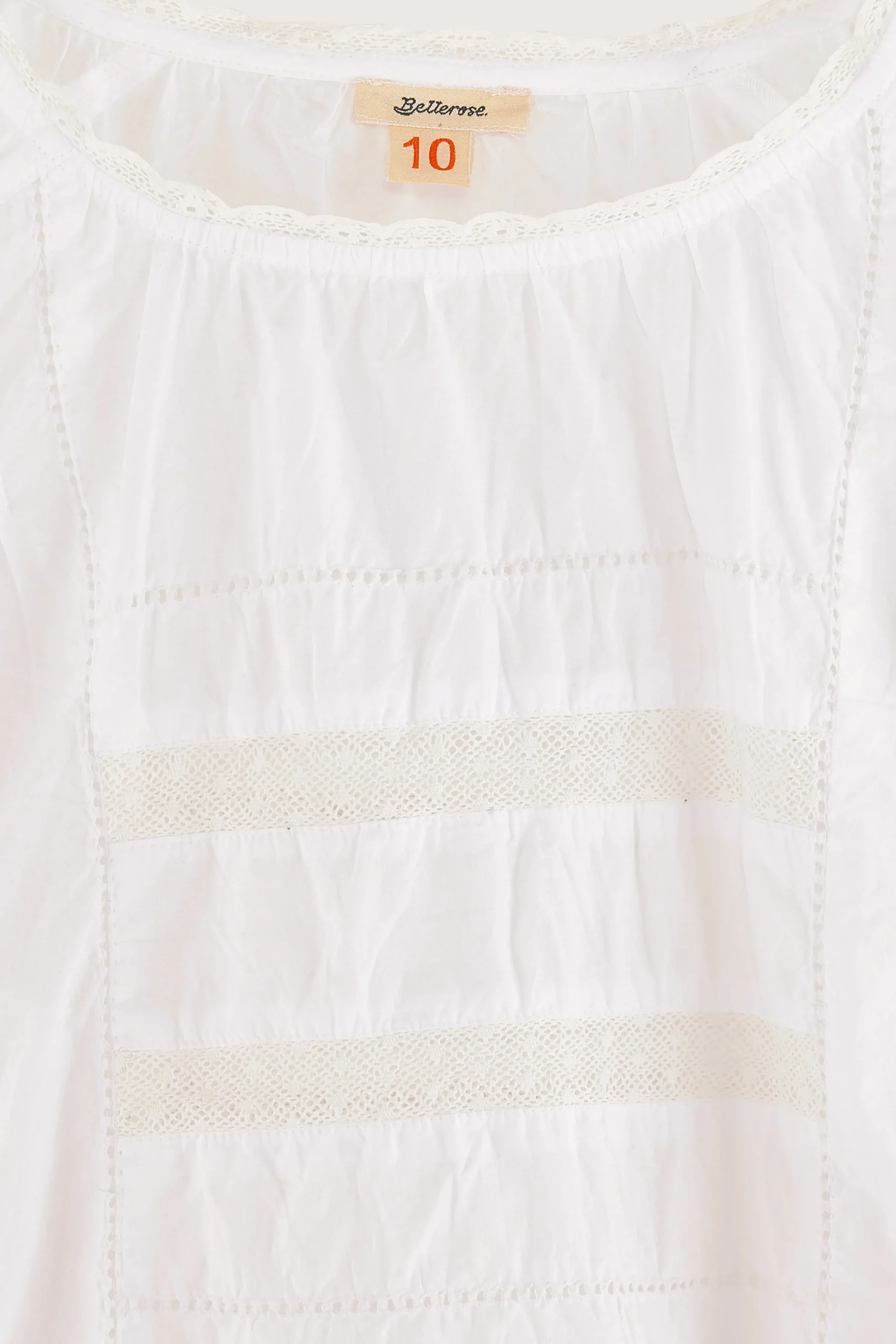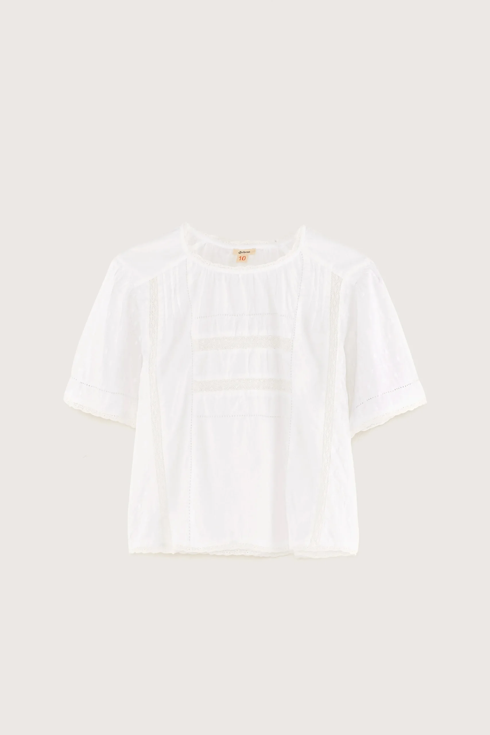 Romantische blouse met klassieke pasvorm, vlindermouwen en kanten details, gemaakt van wit katoensluier.Klassieke pasvorm Ronde hals Korte vlindermouwenKanten, gerimpelde details