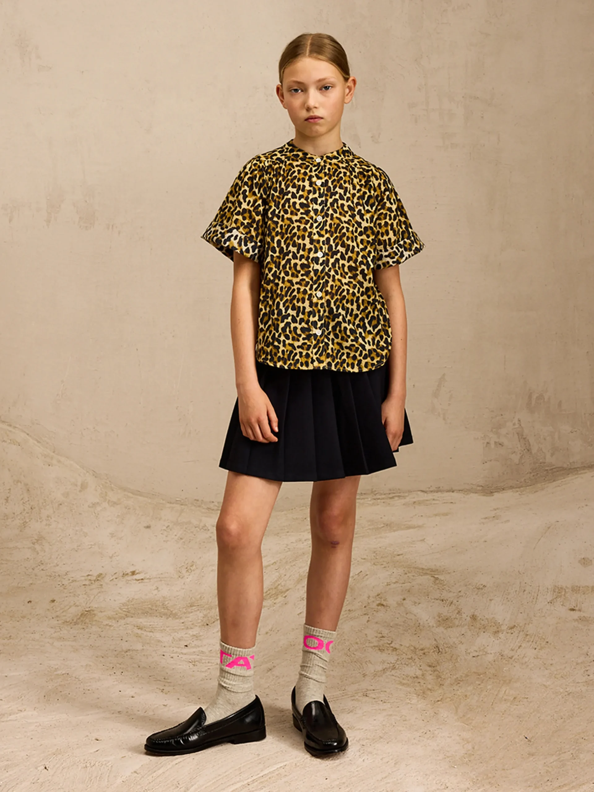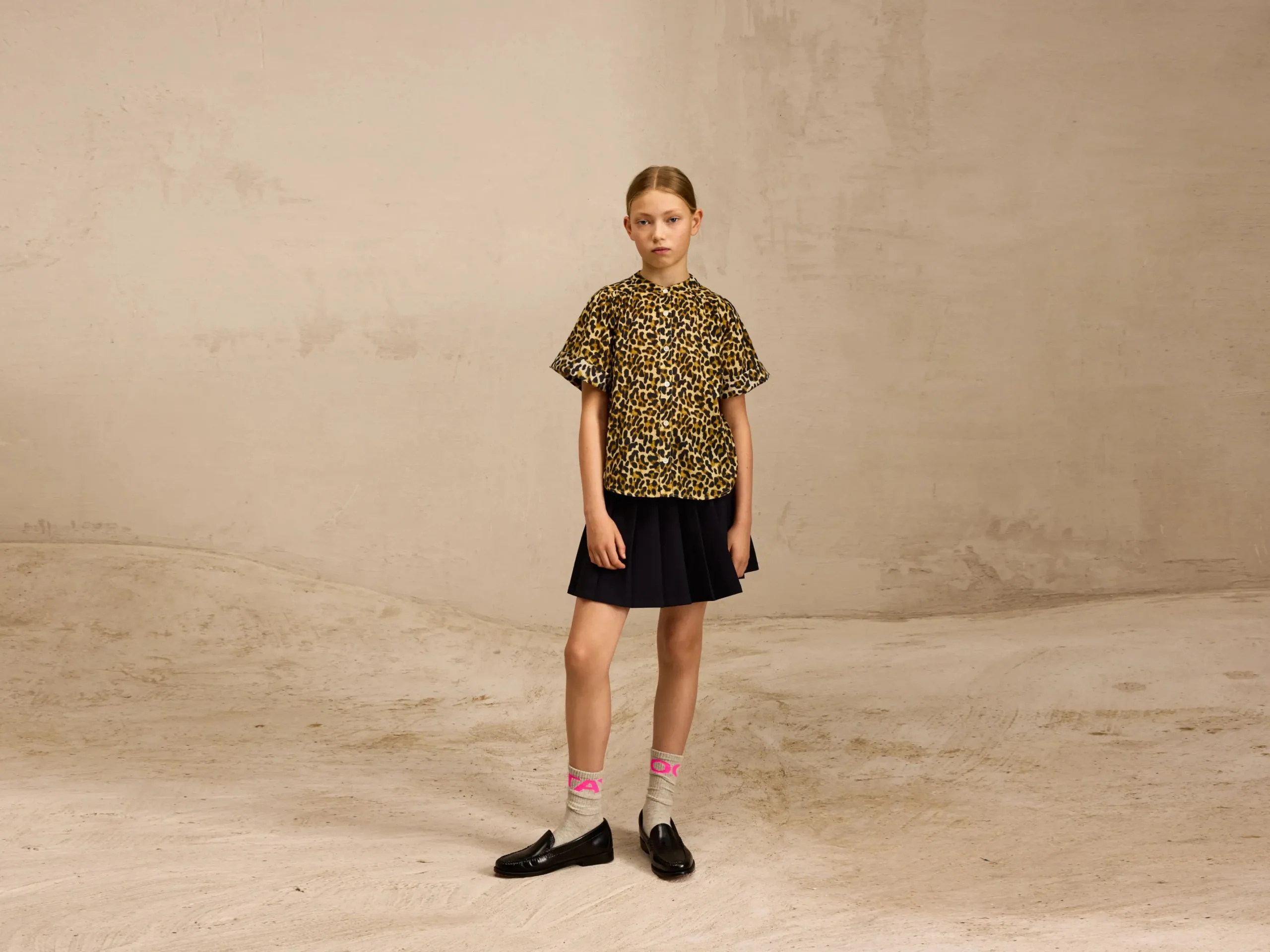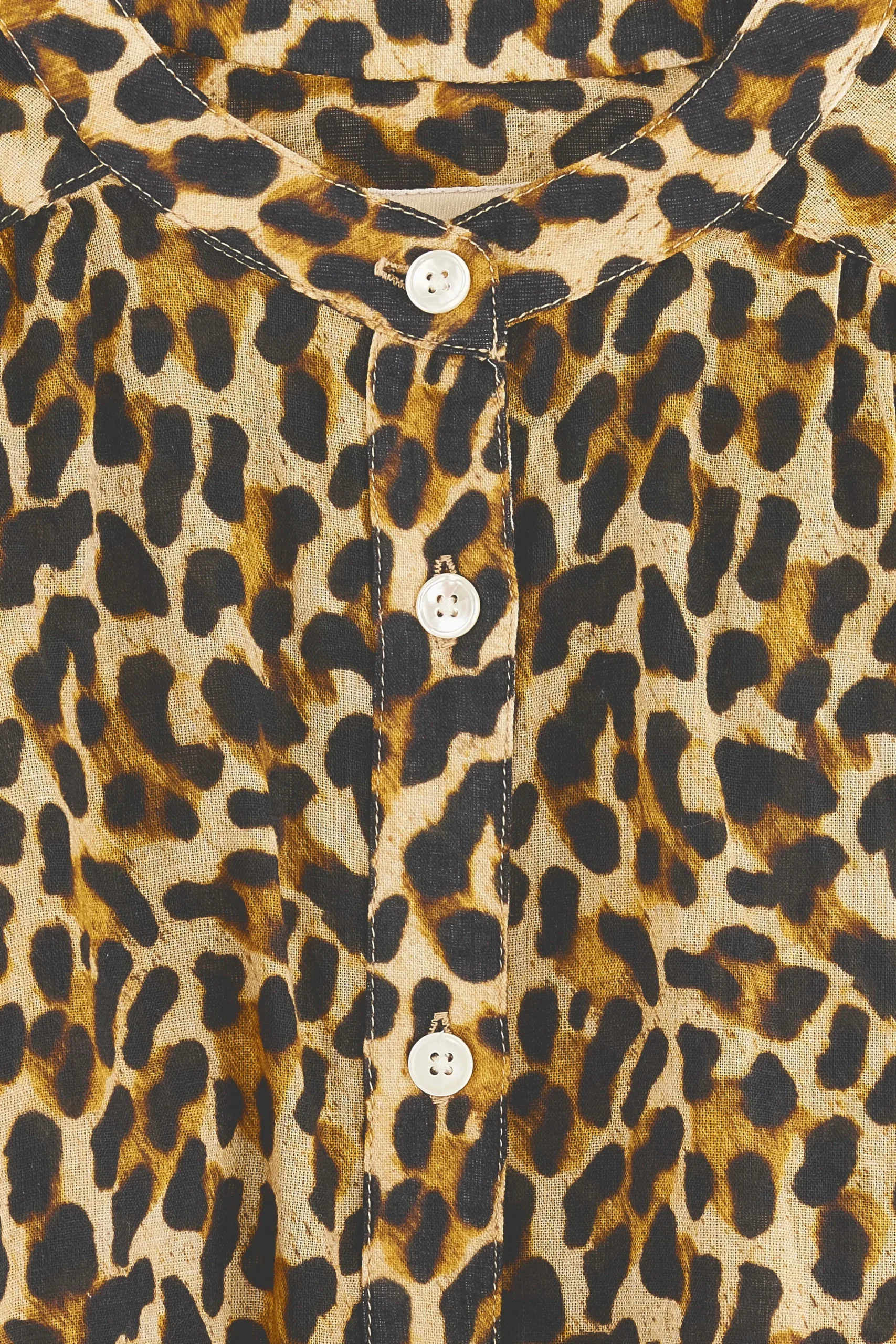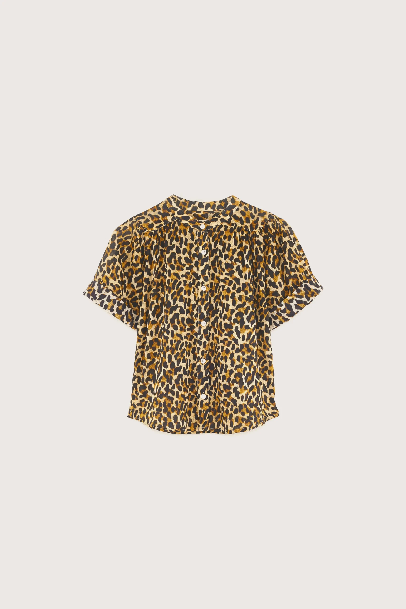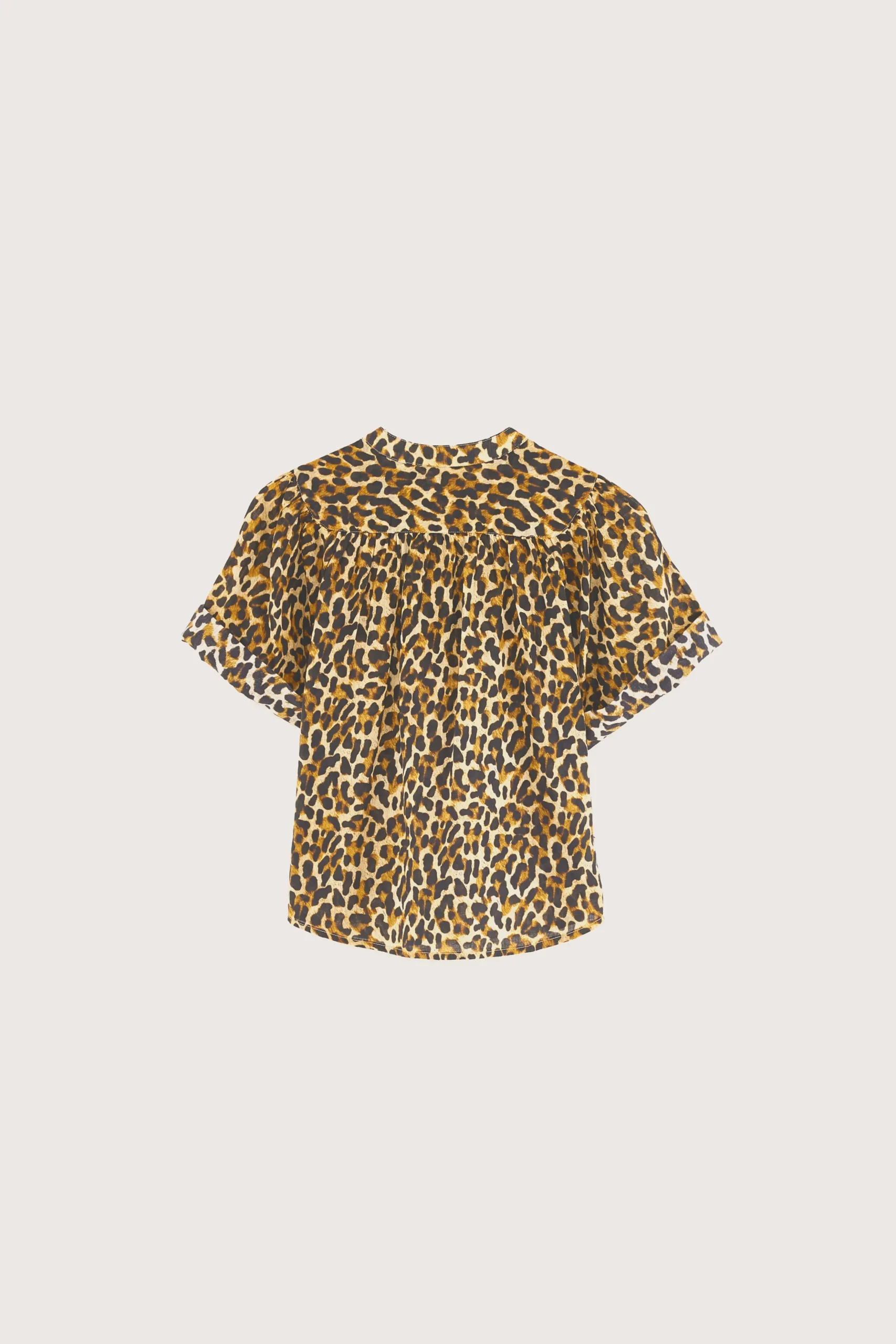 Klassieke blouse met ronde hals en kleine opstaande kraag, knoopsluiting aan de voorkant, wijde korte mouwen en gerimpelde details, gemaakt van licht katoen met all-over luipaardprint.Klassieke pasvorm Ronde hals met kleine opstaande kraagKorte mouwen Knoopsluiting aan de voorkant Gerimpelde details