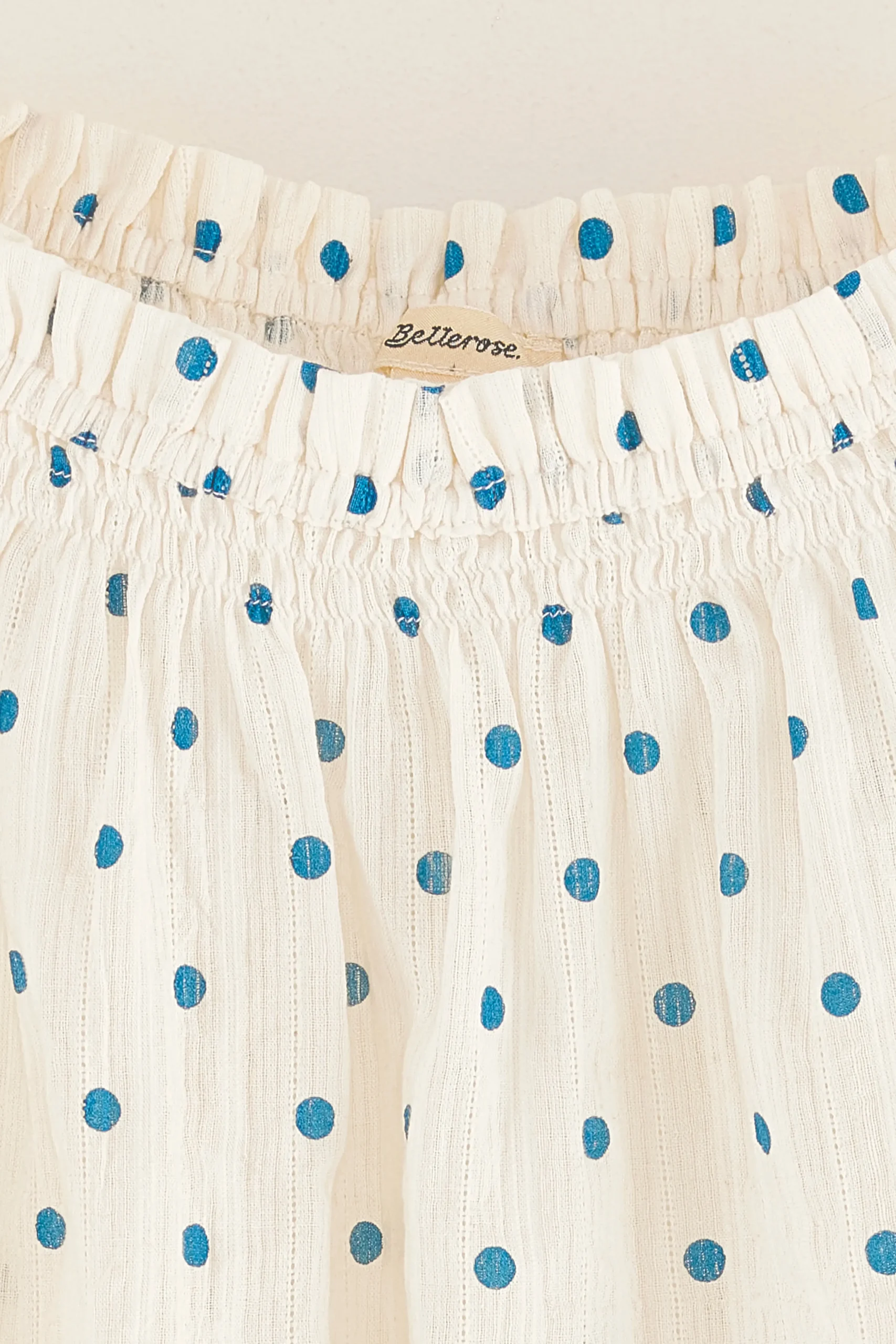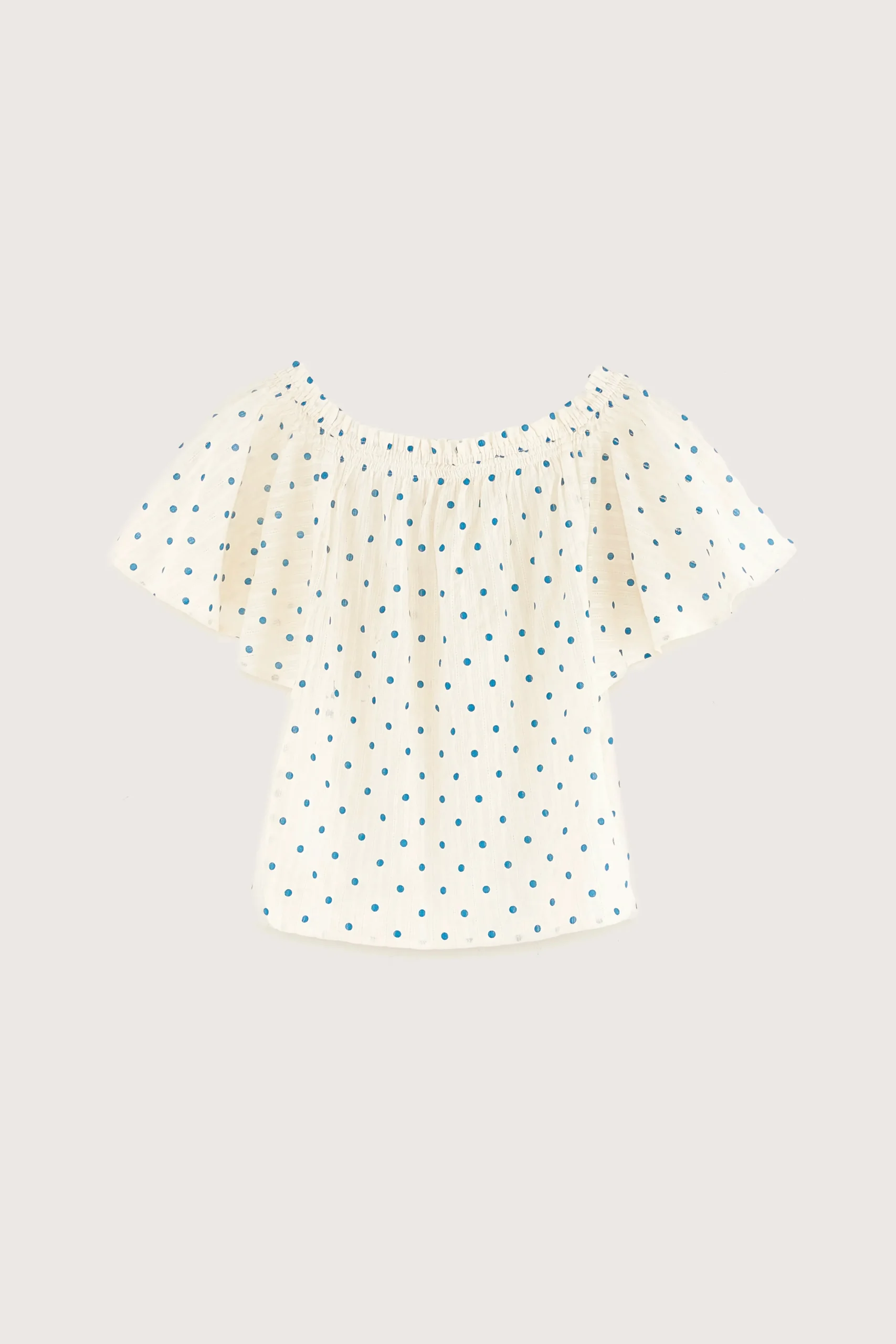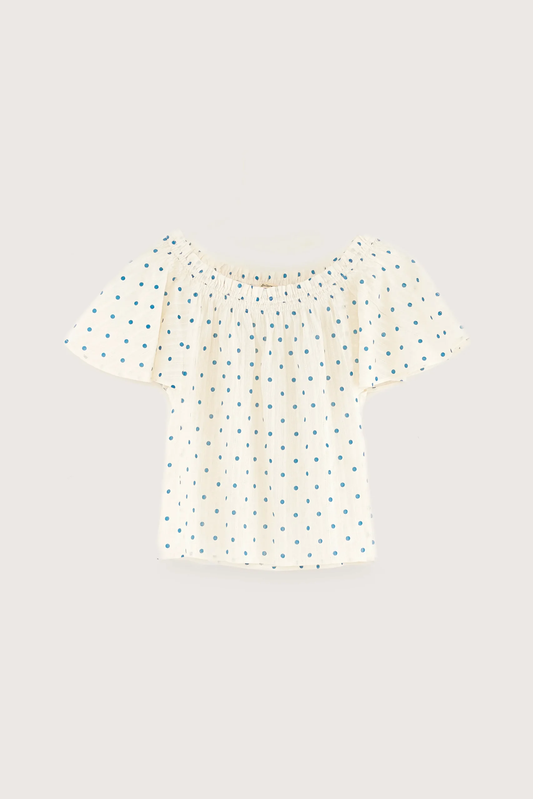 Klassieke blouse met elastische off-shoulder hals en korte vlindermouwen, gemaakt van lichtblauw katoensluier met blauwe stippen.Klassieke pasvorm Elastische hals bij de schoudersKorte vlindermouwenLichte A-lijn