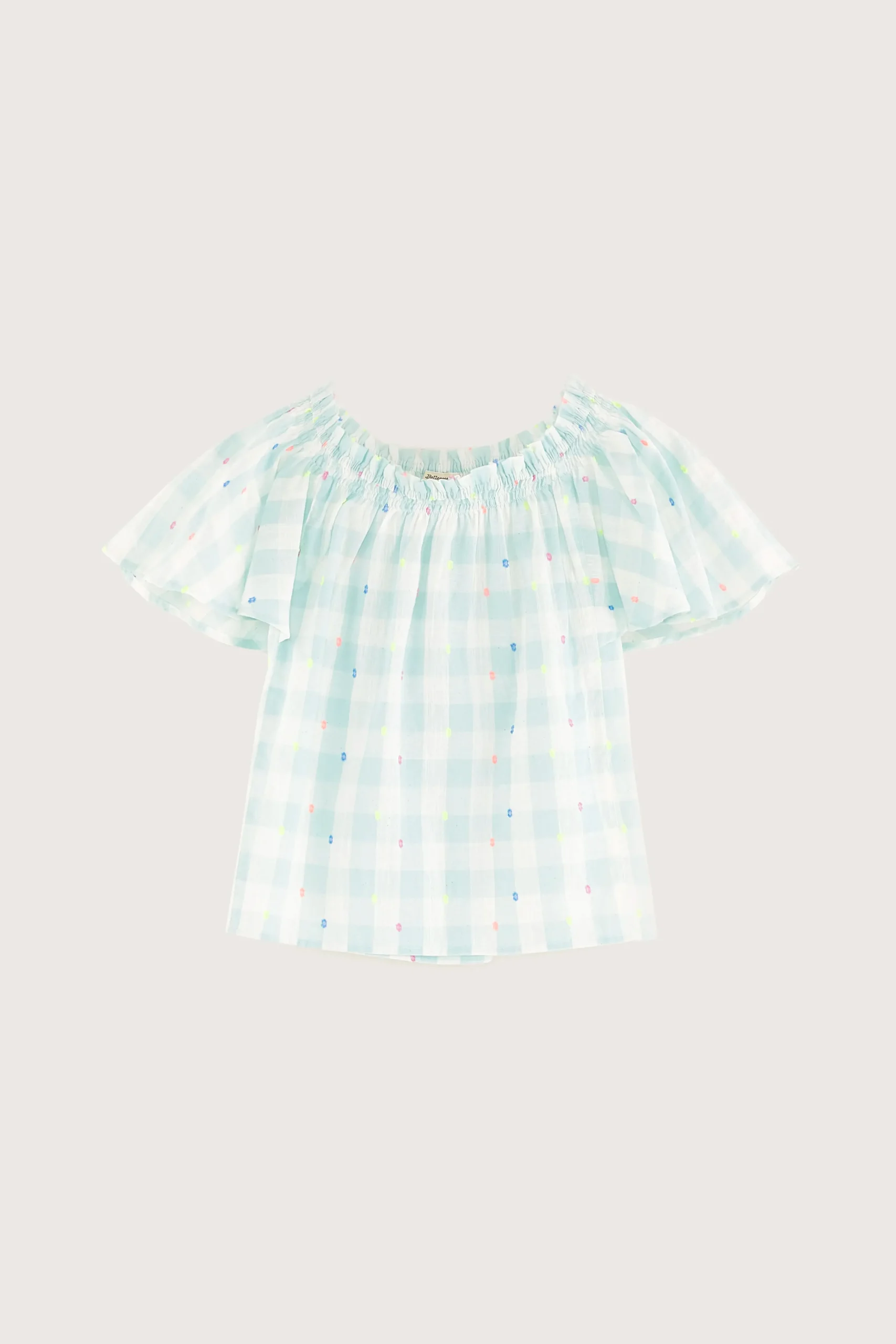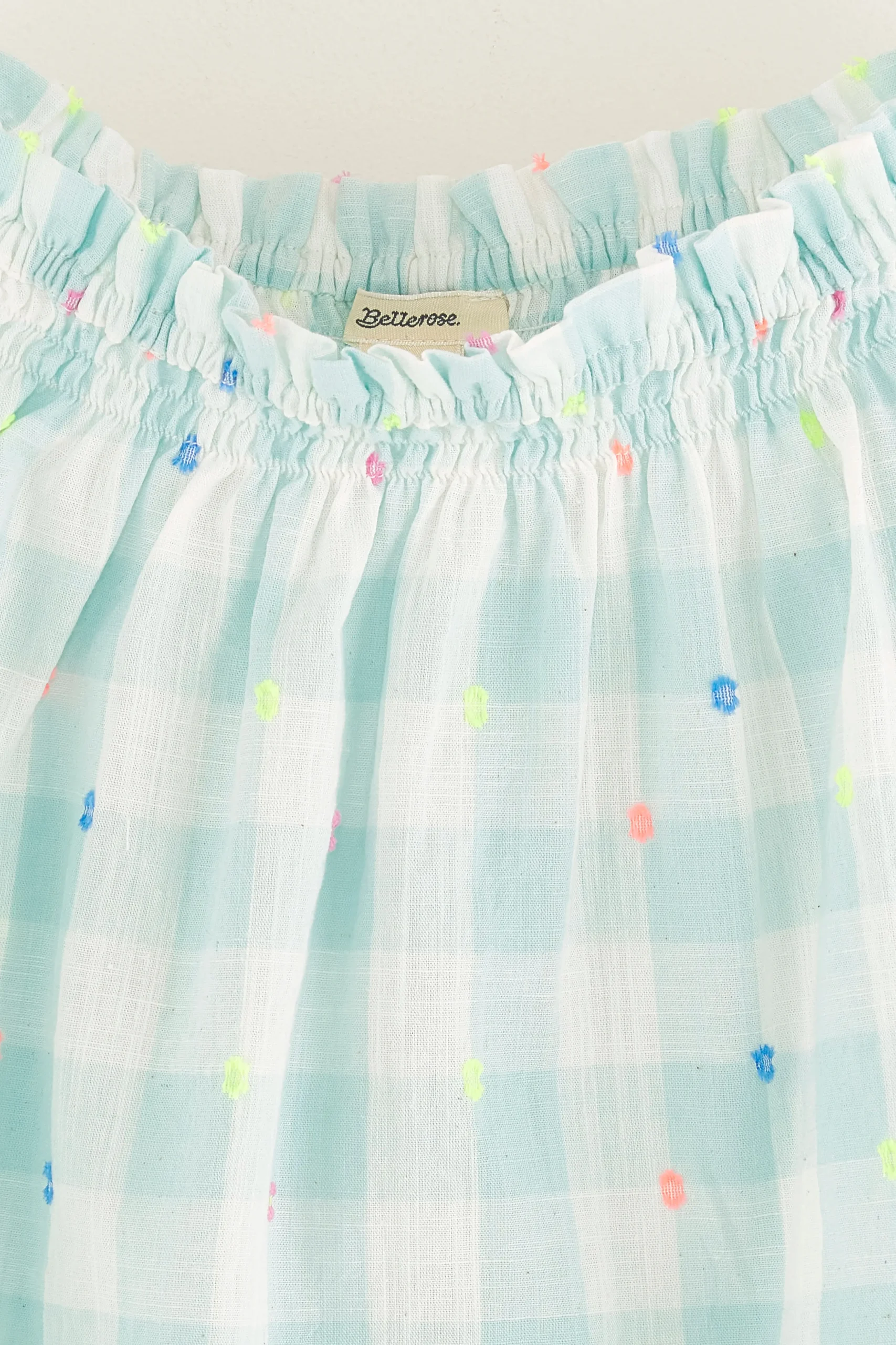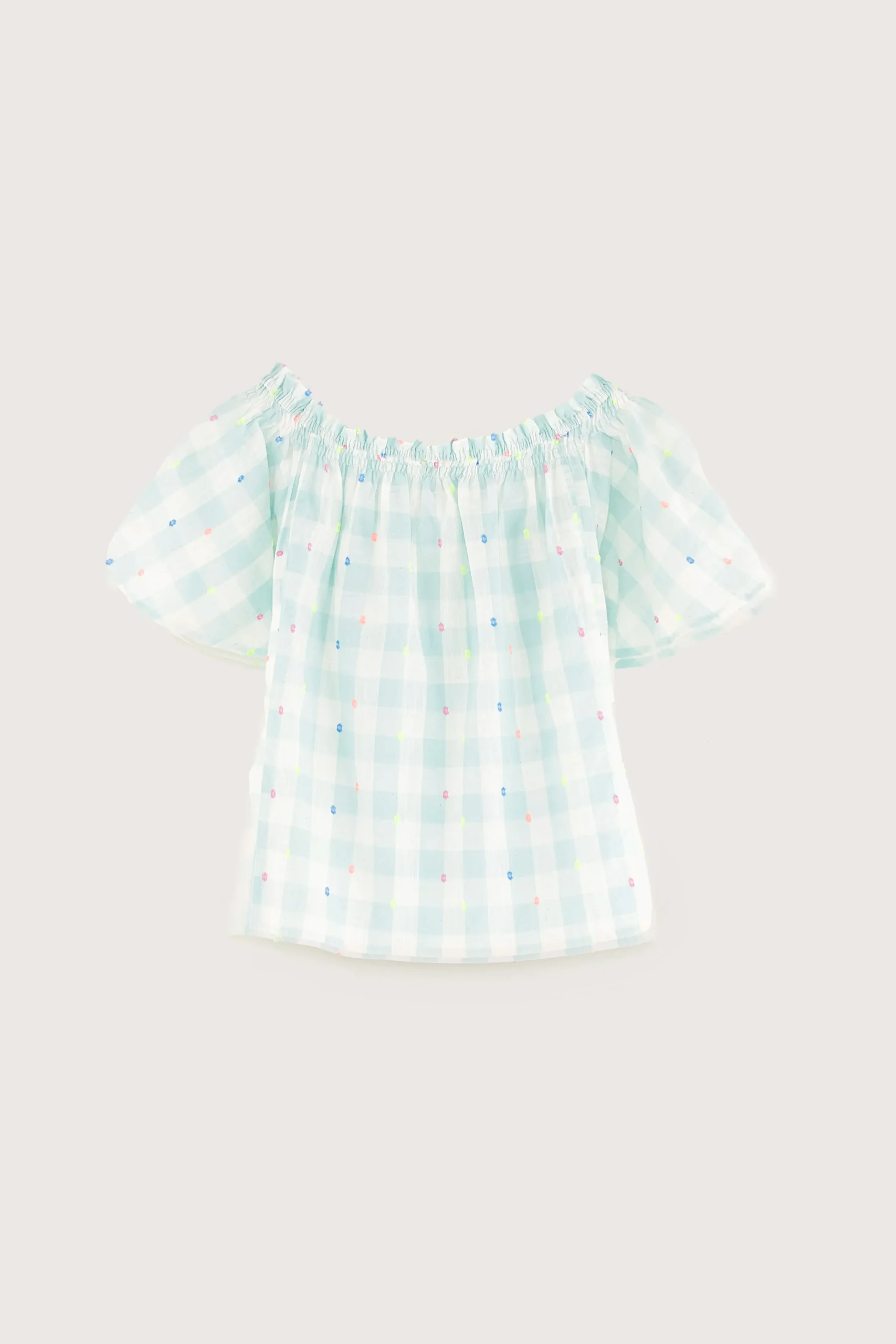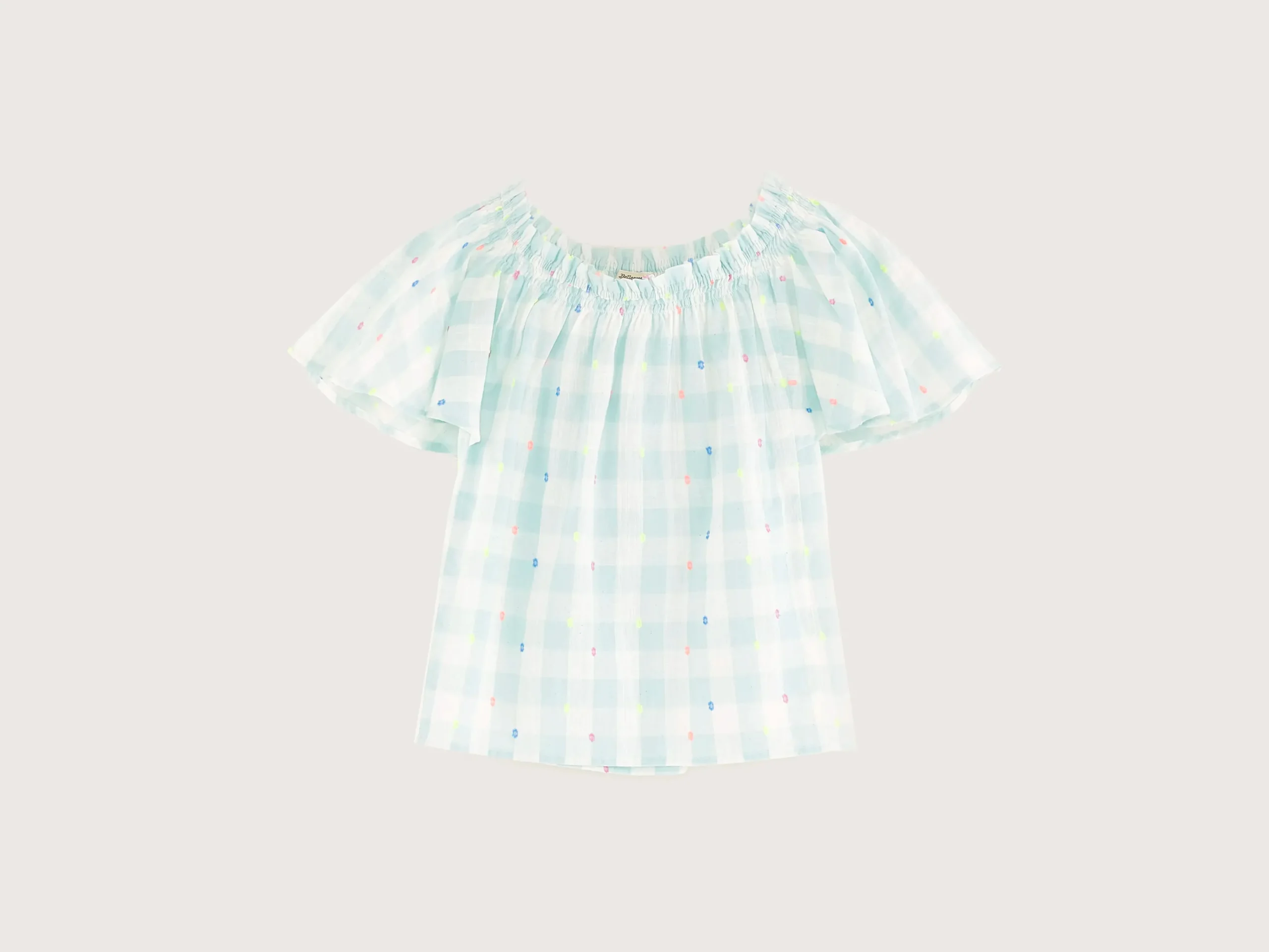 Klassieke blouse met elastische off-shoulder hals en korte vlindermouwen, gemaakt van lichte katoen met lichtblauw geruit motief en all-over multikleurige neps.Klassieke pasvorm Elastische hals bij de schoudersKorte vlindermouwenLichte A-lijn