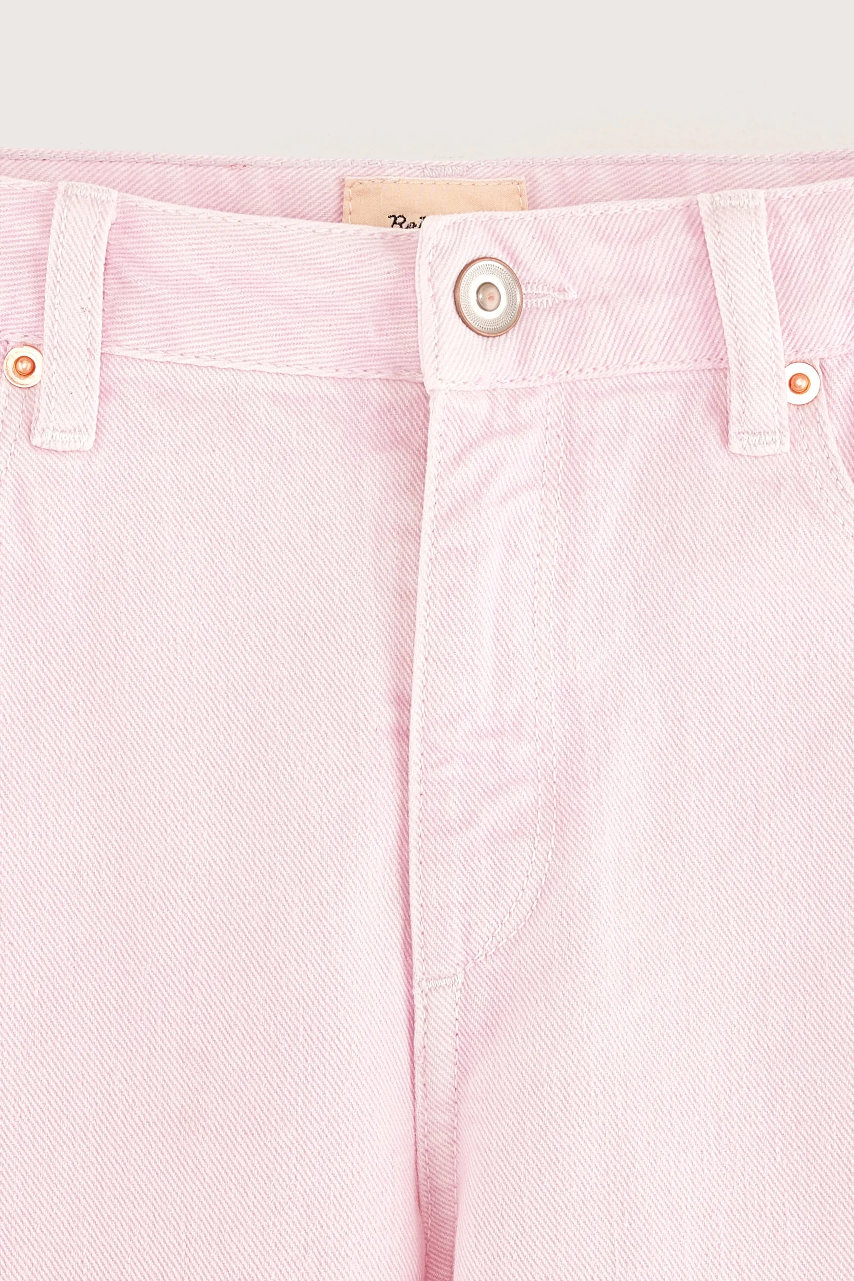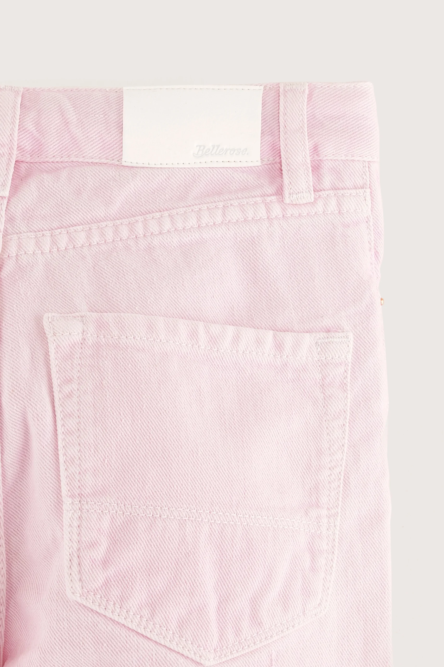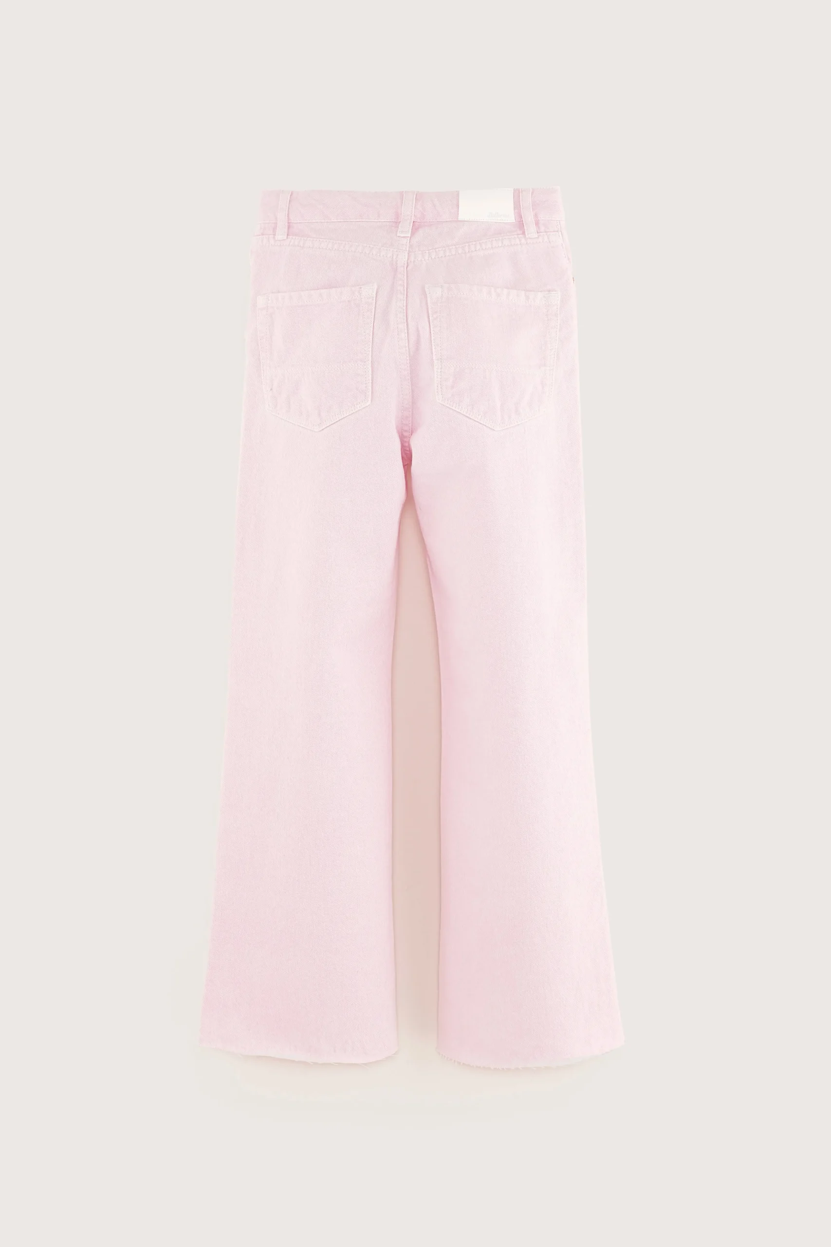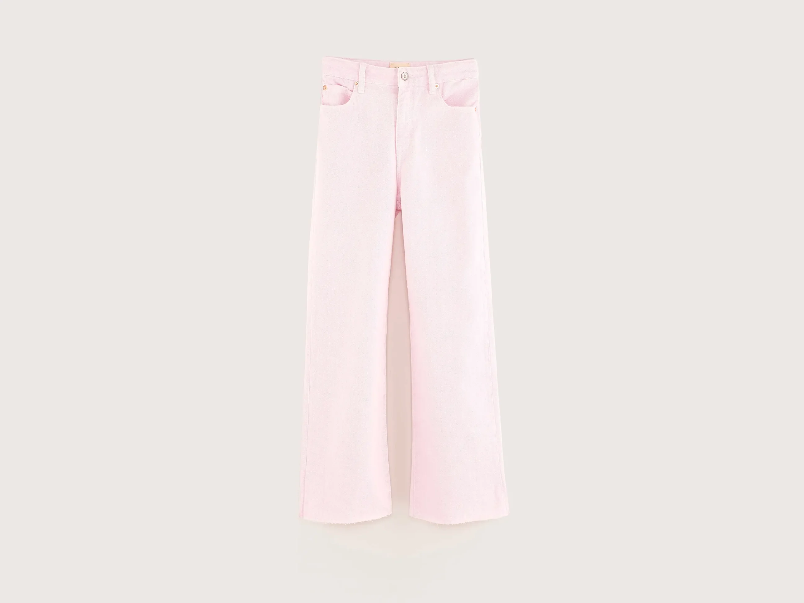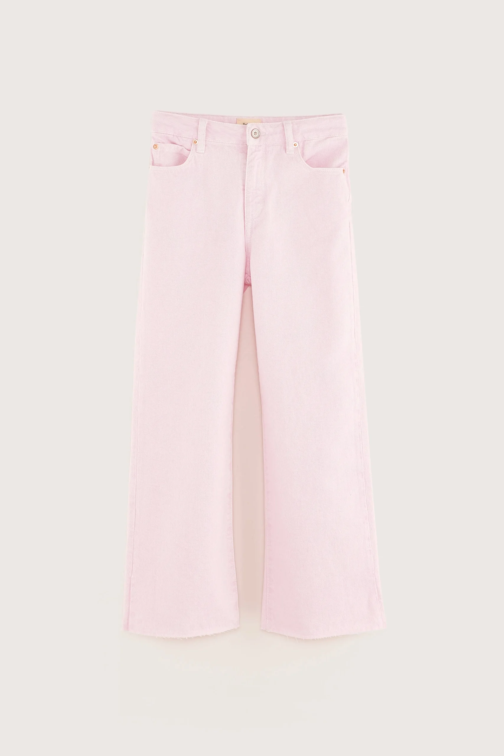 Klassieke 5-pocketbroek met hoge taille en flared pijpen met gezekerde onafgewerkte randen, gemaakt van poederroze katoen en hennep.Klassieke pasvorm Hoge taille, flared pijpen Zomen met onafgewerkte randenMiddelzwaar, geen stretchRitssluiting