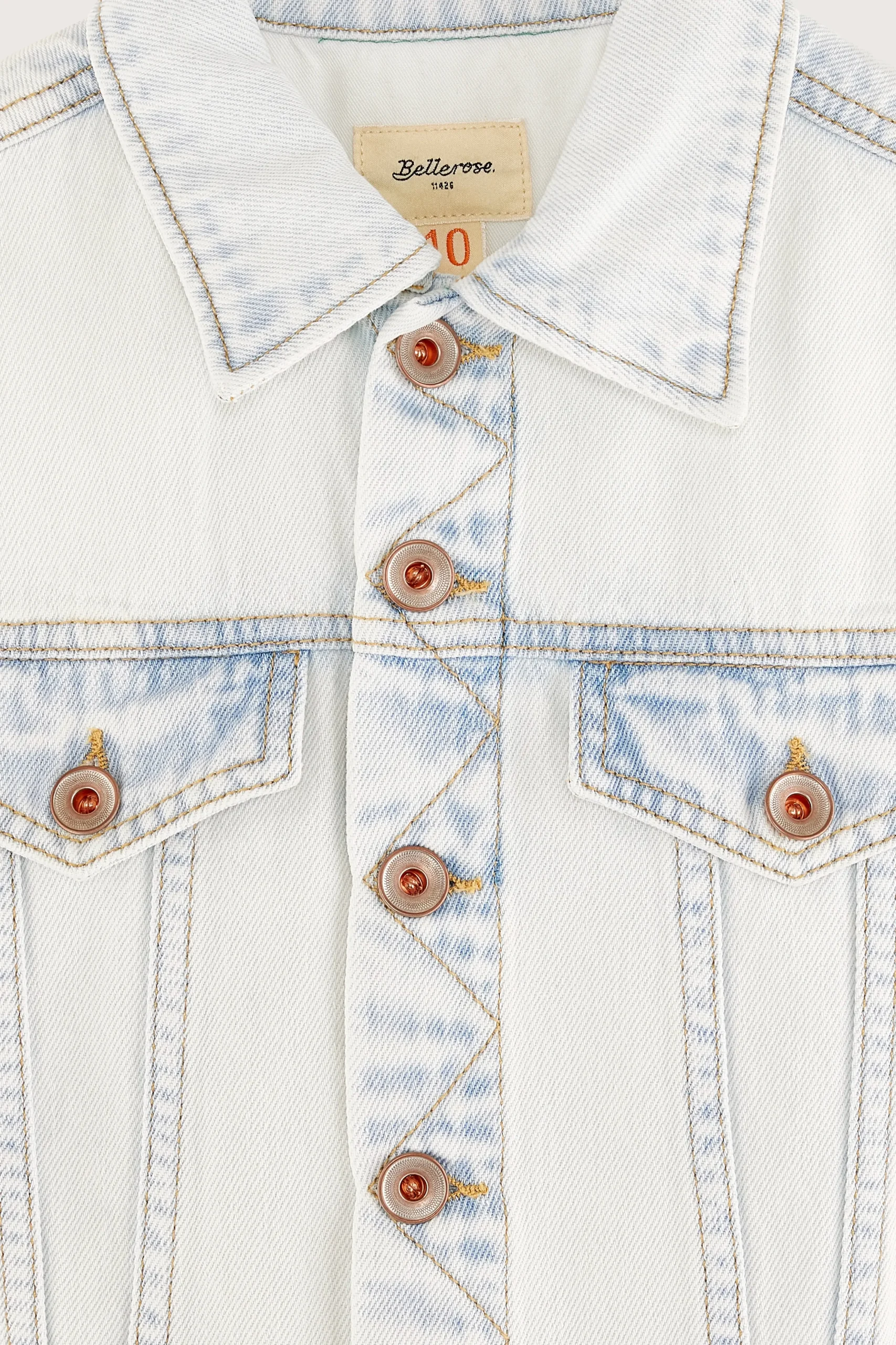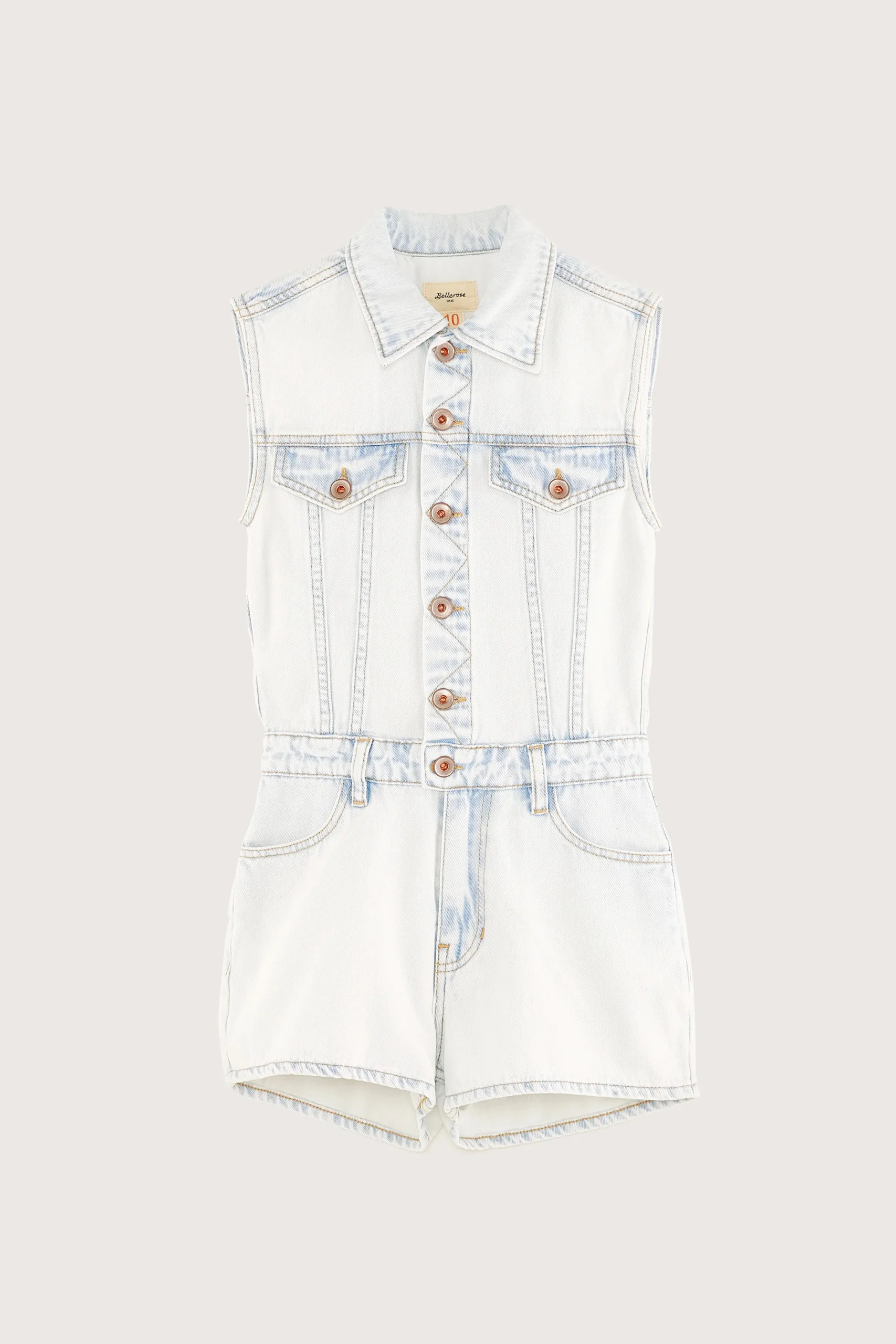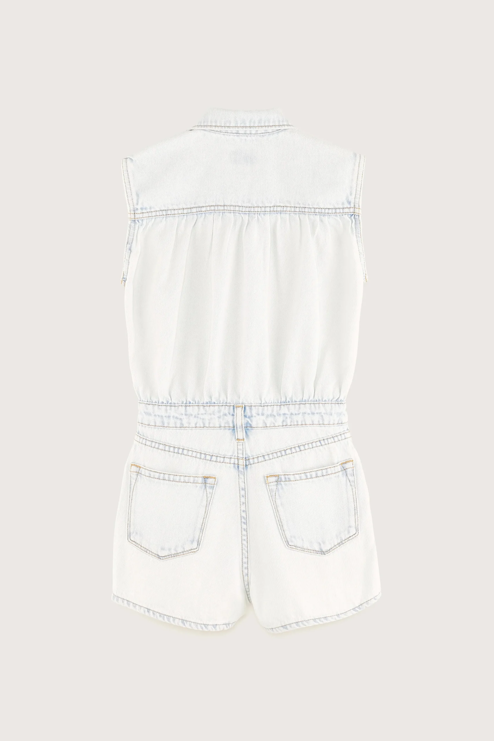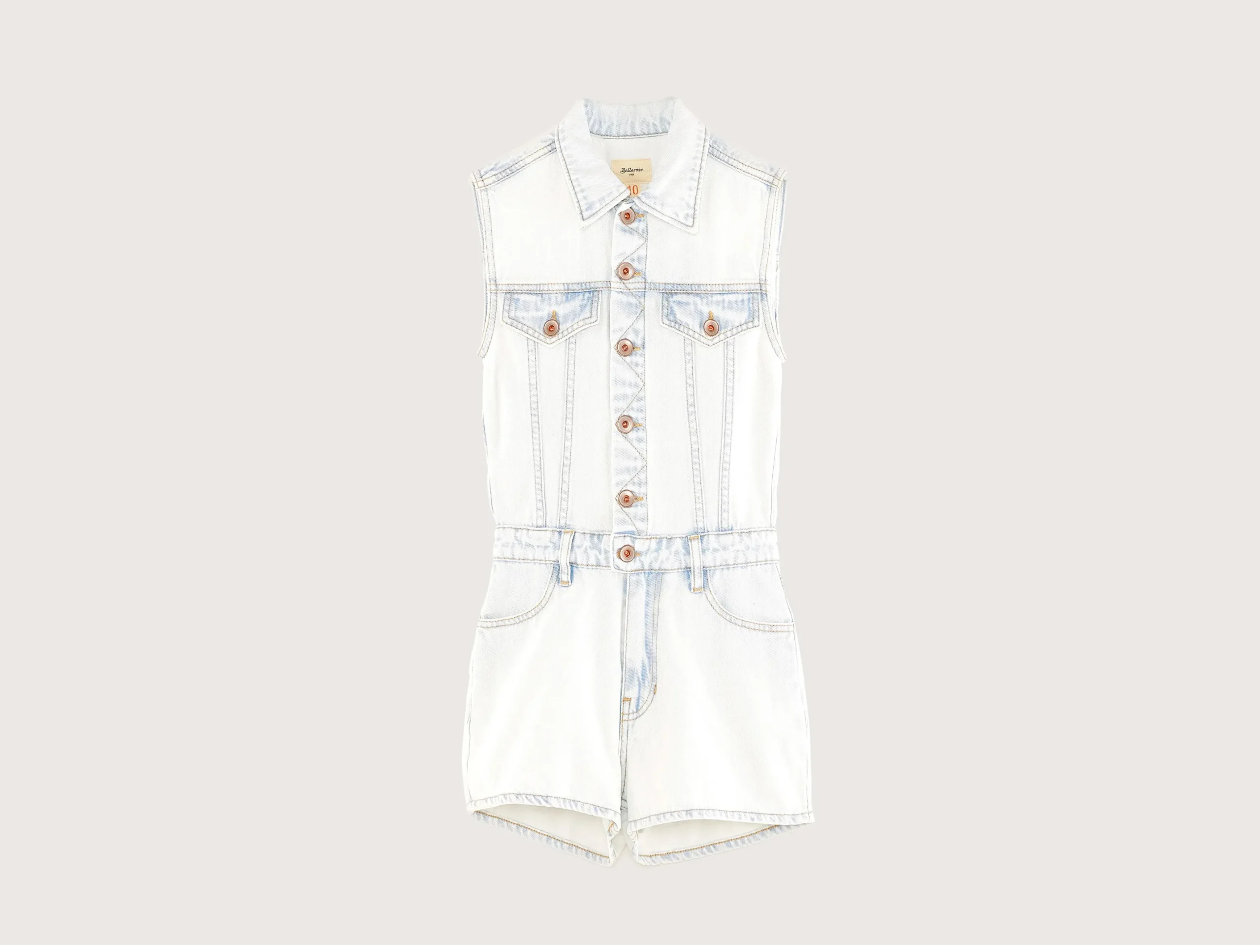 Op een denimjas geïnspireerde, mouwloze, korte jumpsuit met knoopsluiting aan de voorkant, klassieke kraag en klepzakken, gemaakt van lichtblauw gebleekt gewassen katoendenim.Klassieke pasvormKlassieke kraag Mouwloos Klassieke taille Recht juk met gerimpelde plooien op de rug Klepborstzakken met knopen Rechte pijpen