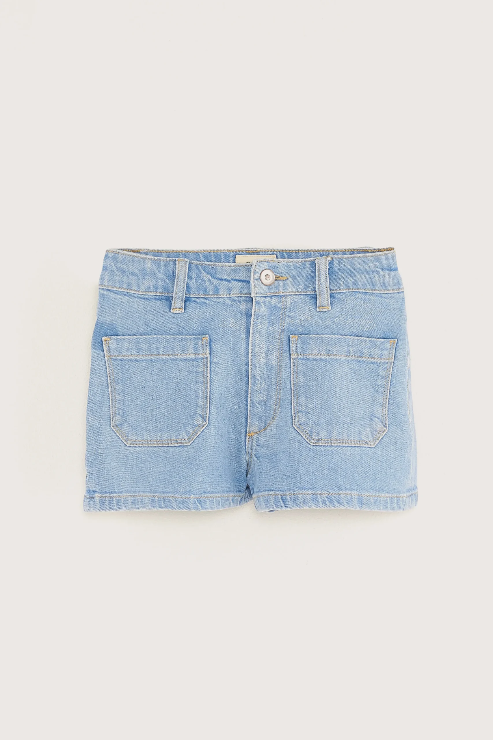 Short met hoge taille, slim fit, rechte pijpen en gepatchte zakken aan de voor- en achterkant, gemaakt van lichtblauw denimblauw, zilverkleurig gecoat katoen.Slim fit Hoge taille, rechte pijpenLicht, lichte stretchGepatchte zakken aan de voor- en achterkant