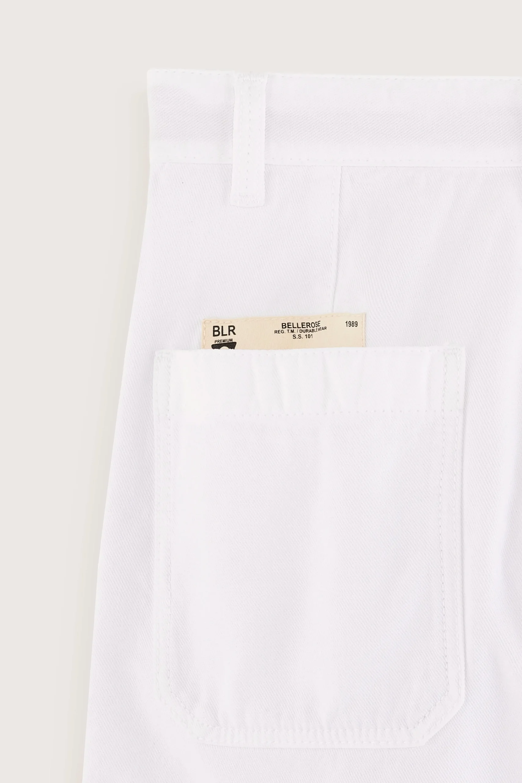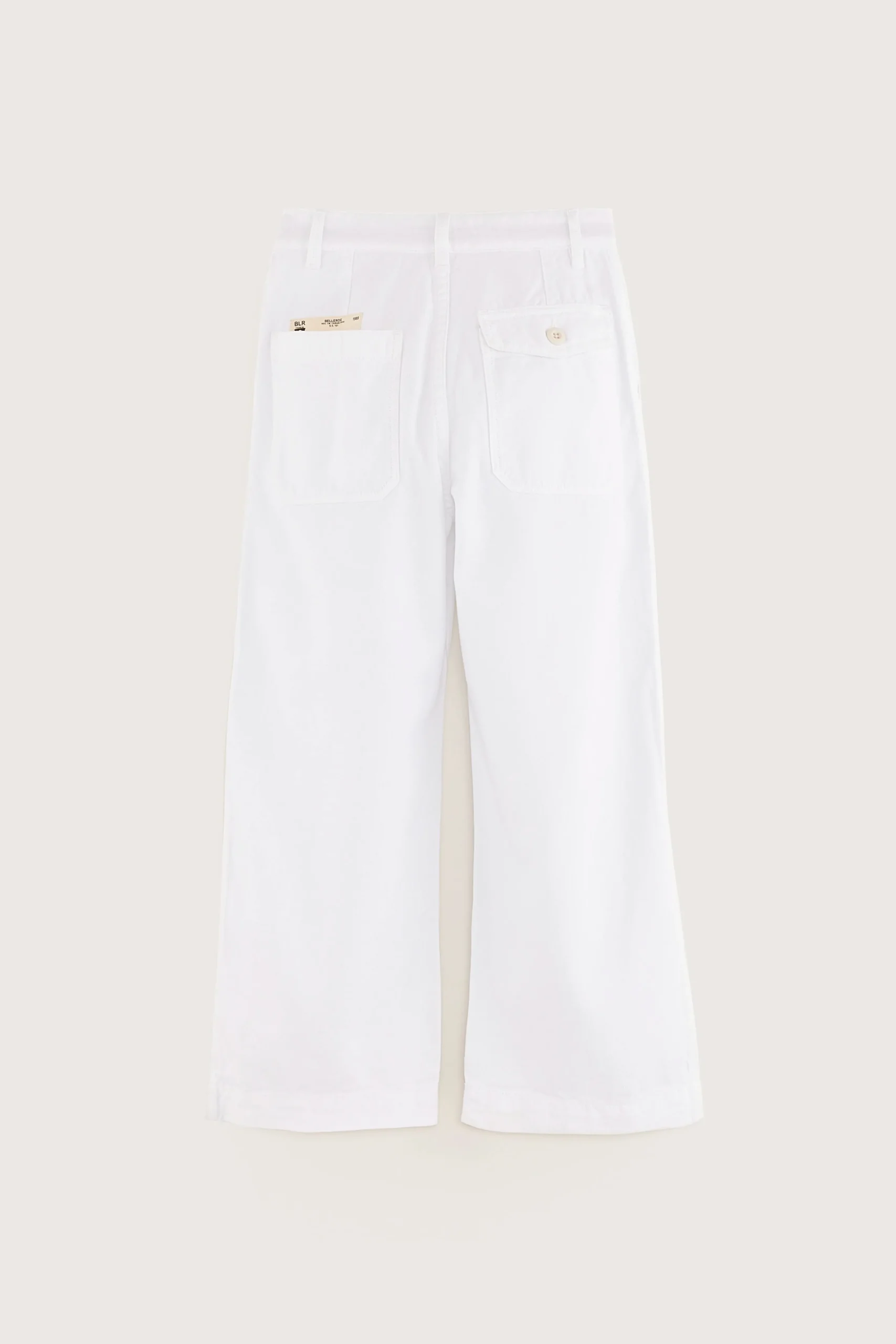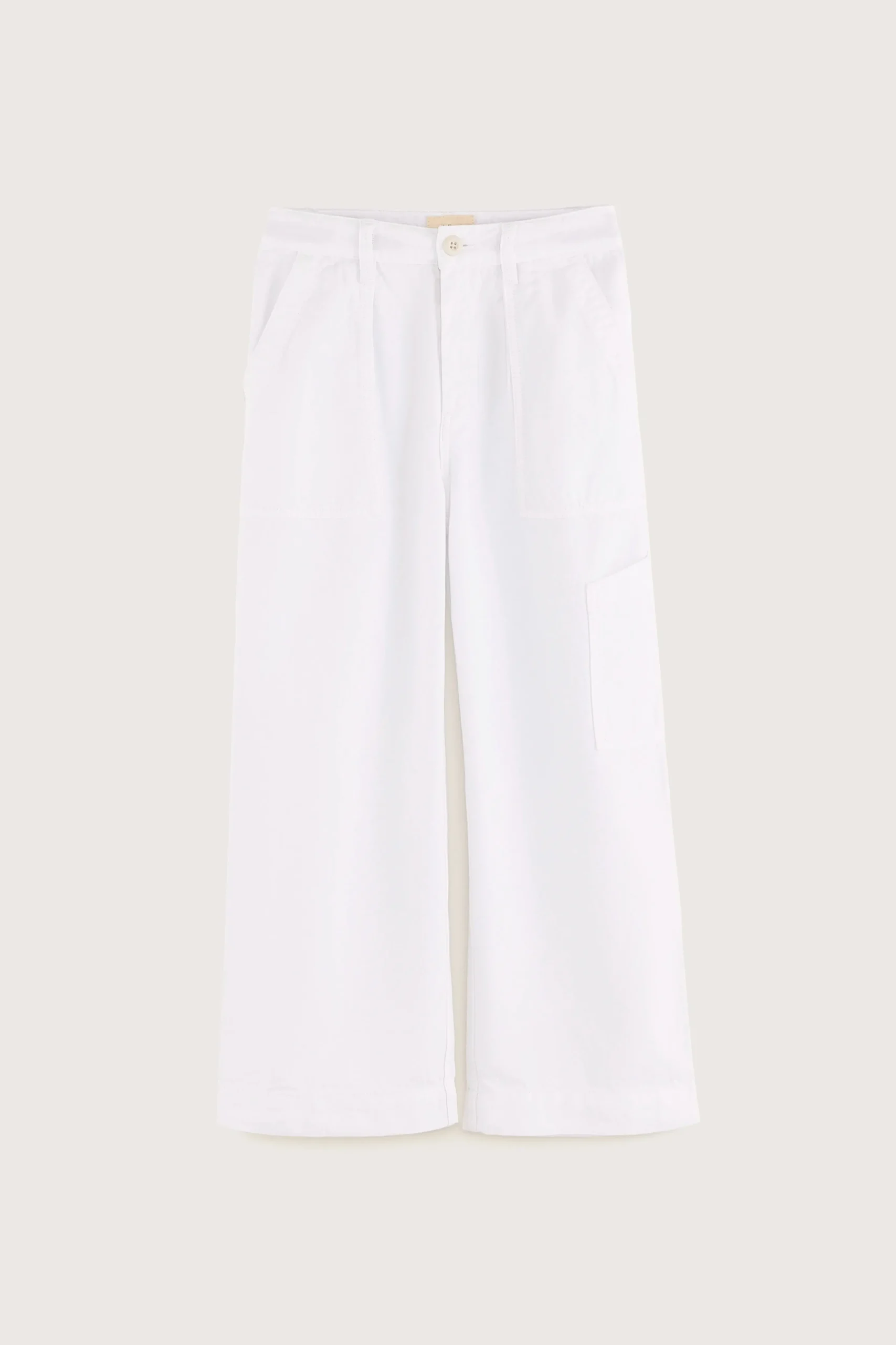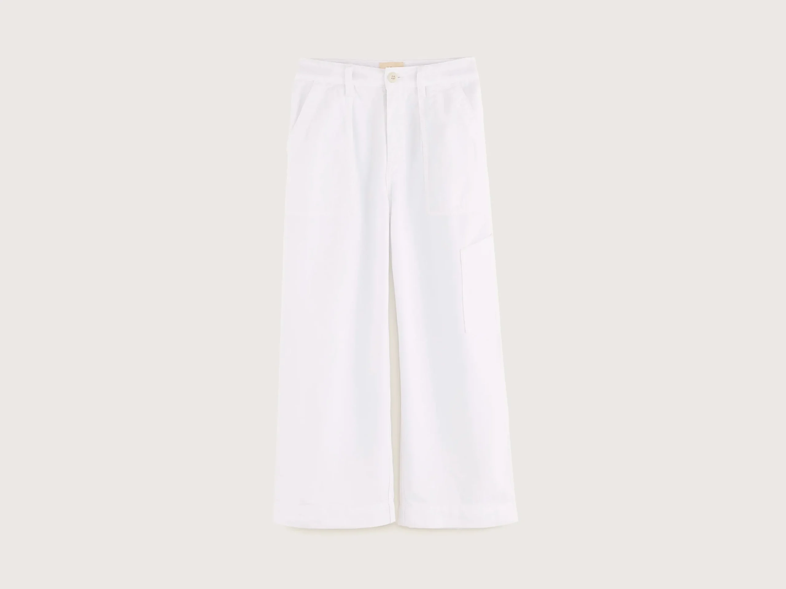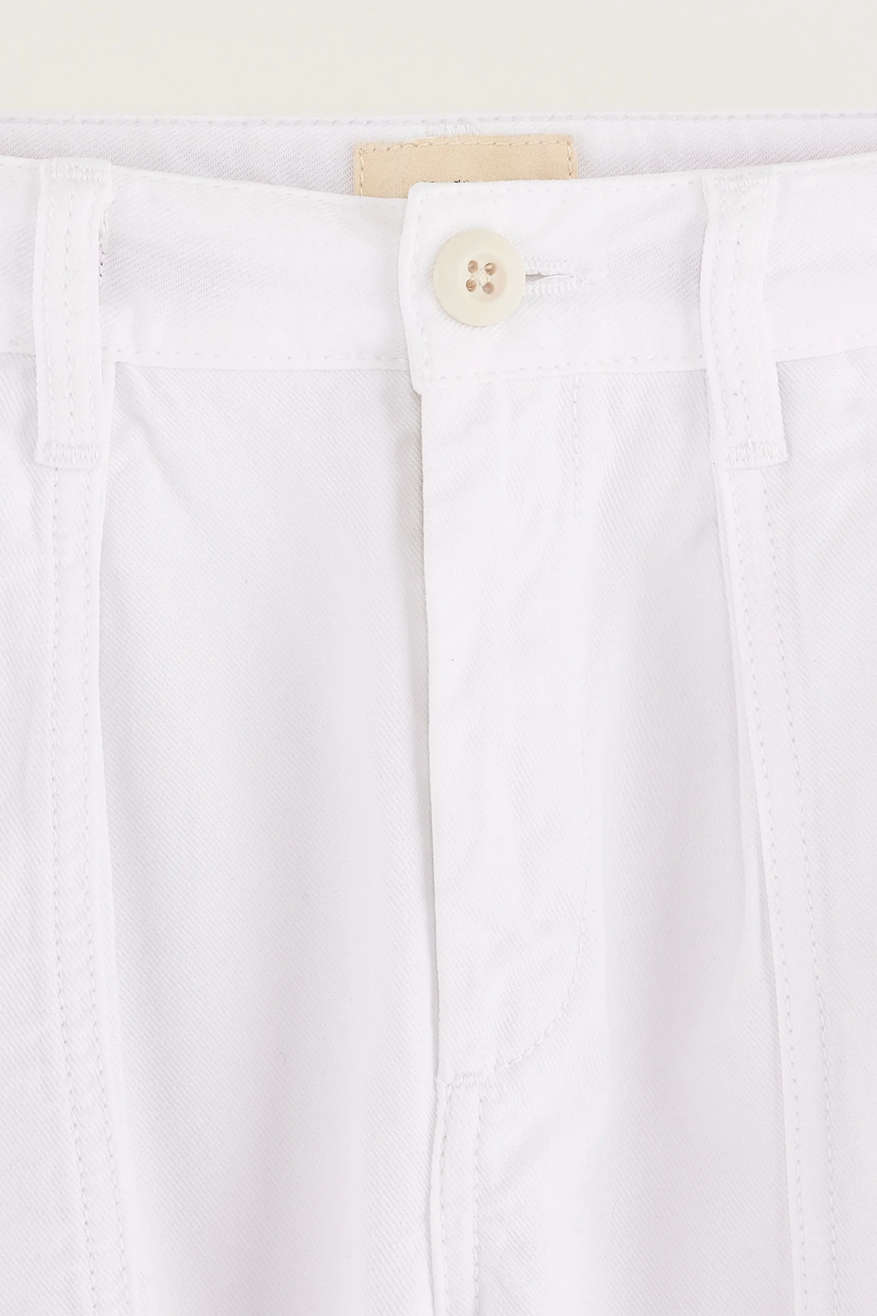 Worker-broek met hoge taille en fatigue voorzakken, gepatchte zak en klepzak en flared pijpen met extra zak op de linkerpijp, gemaakt van soepel, wit Lyocell-katoen.Klassieke pasvorm Hoge taille, flared pijpen Fatigue voorzakken Gepatchte zak en klepzakExtra zak op de linkerpijpRitssluiting