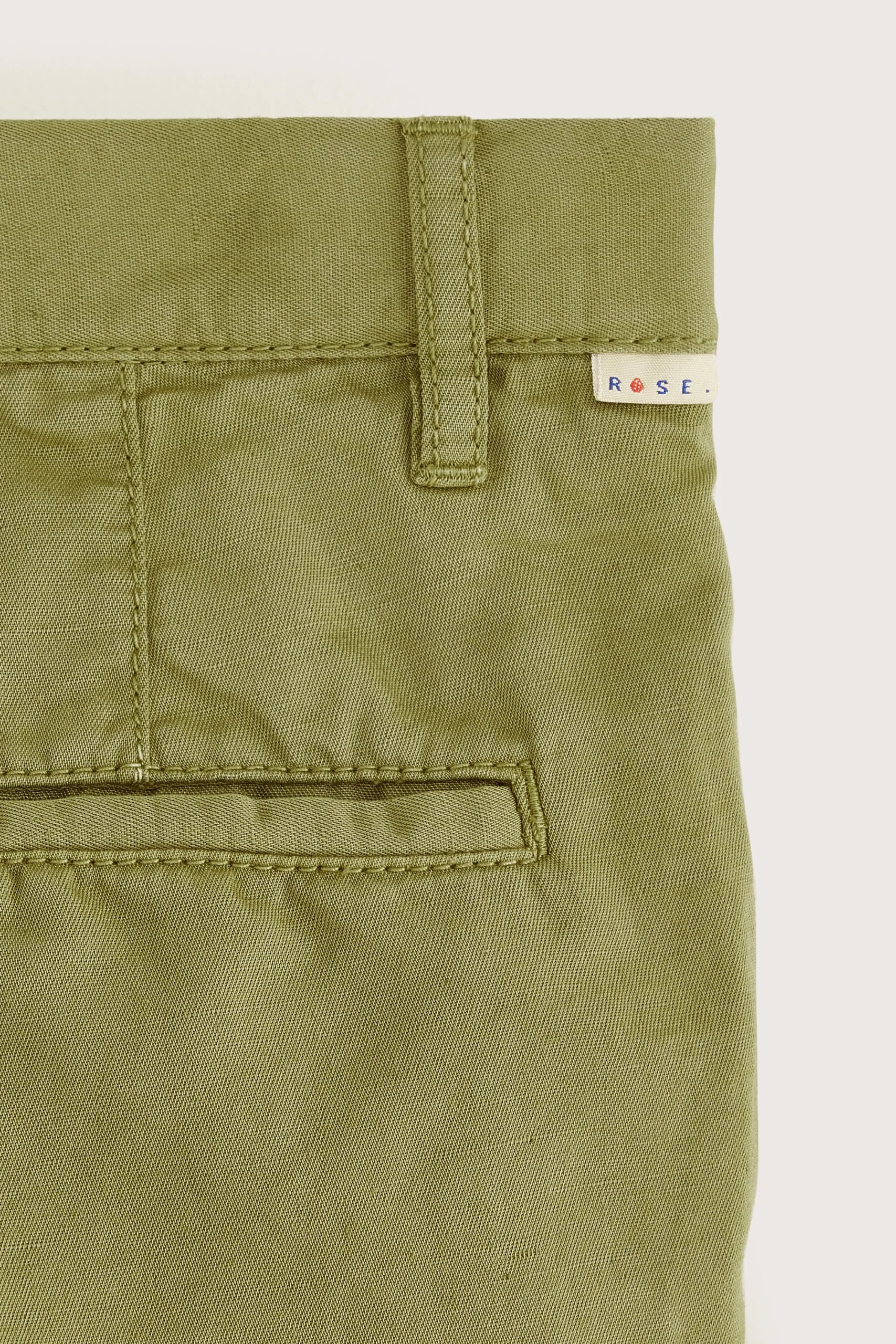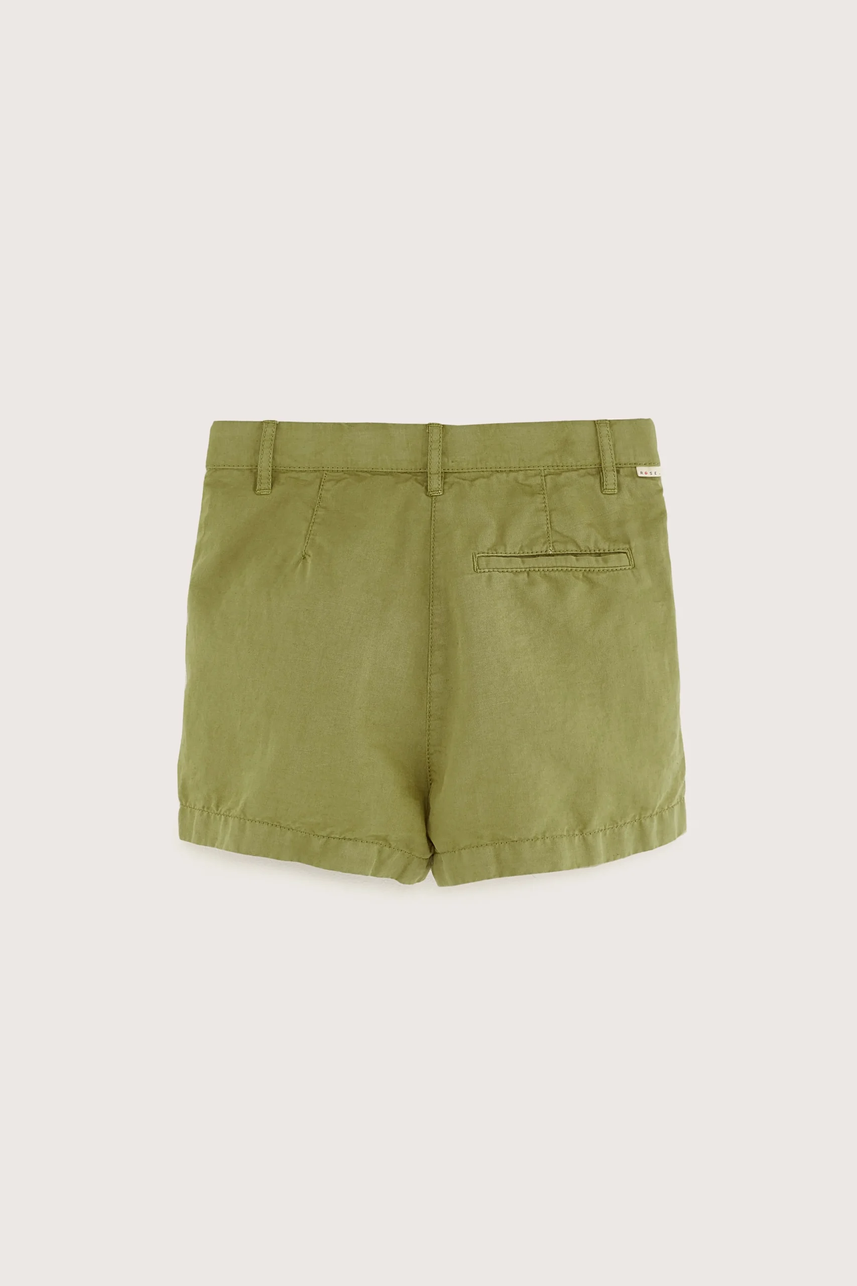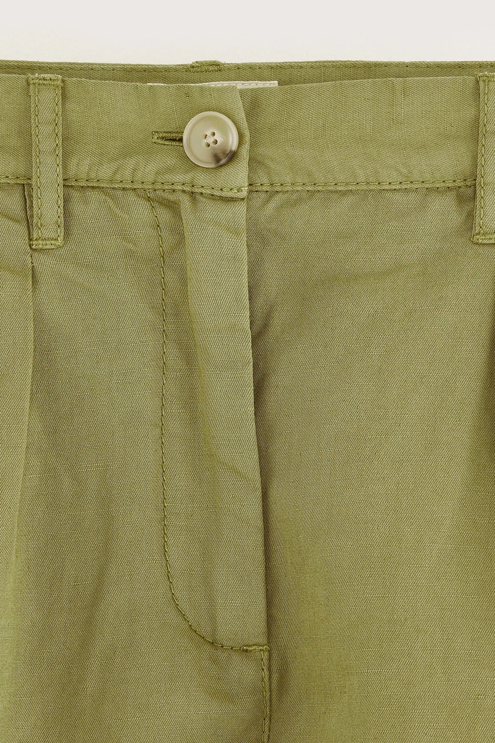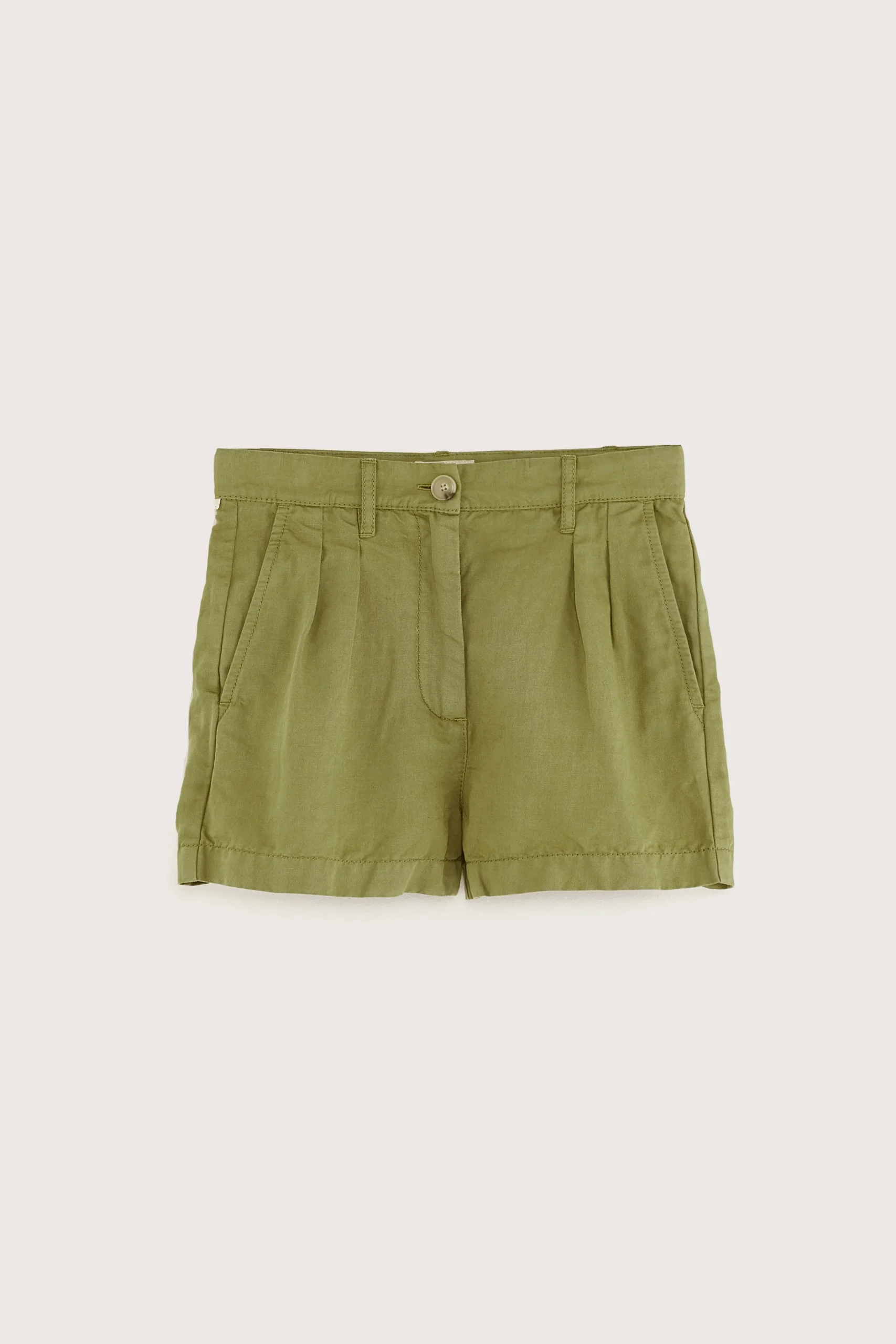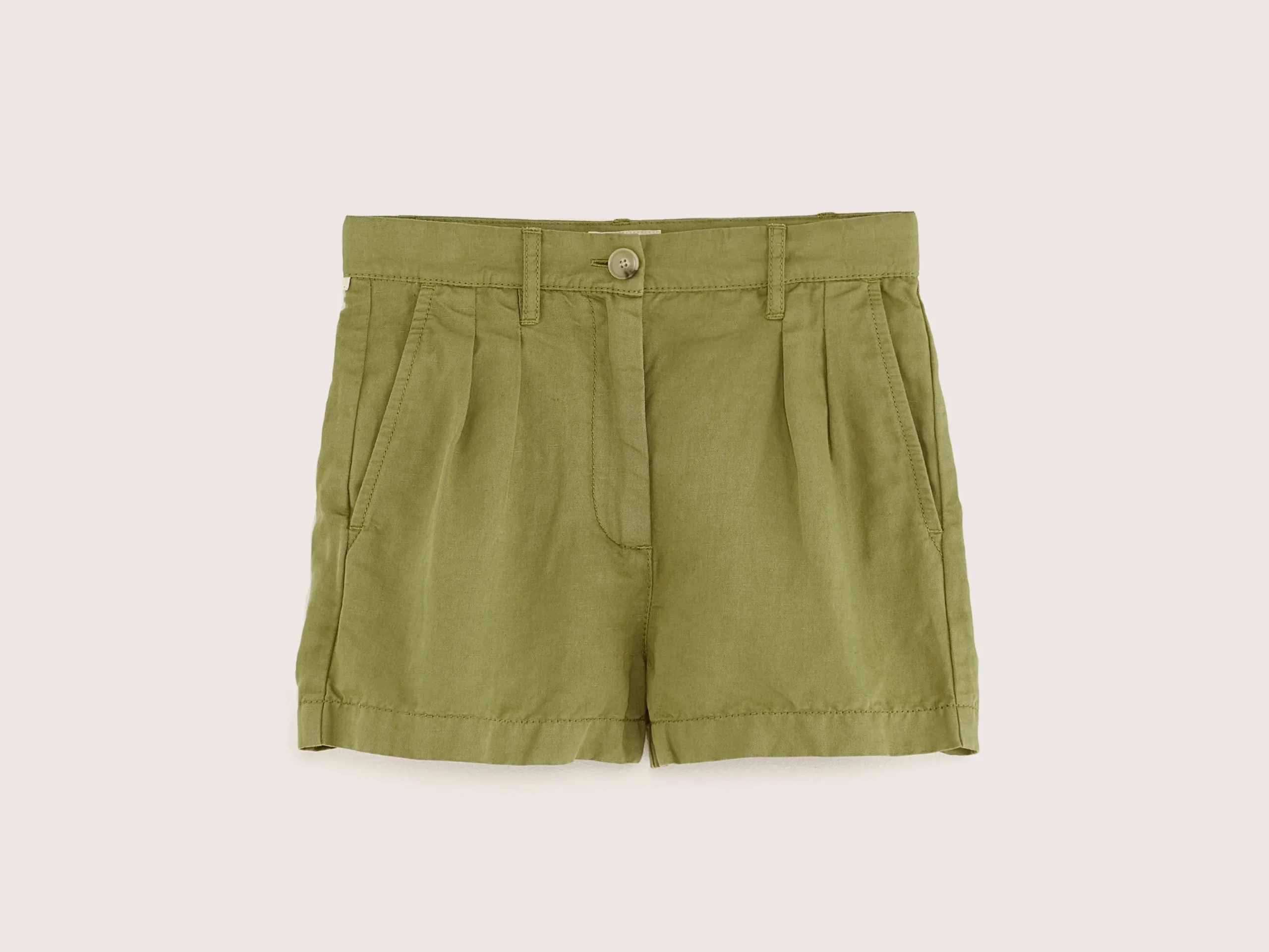 Short met geplooide voorkant en rechte pijpen, gemaakt van soepel, kakigroen katoen- en linnen.Klassieke pasvorm Halfhoge tailleRechte pijpenGeplooide voorkantAchterzak met koord