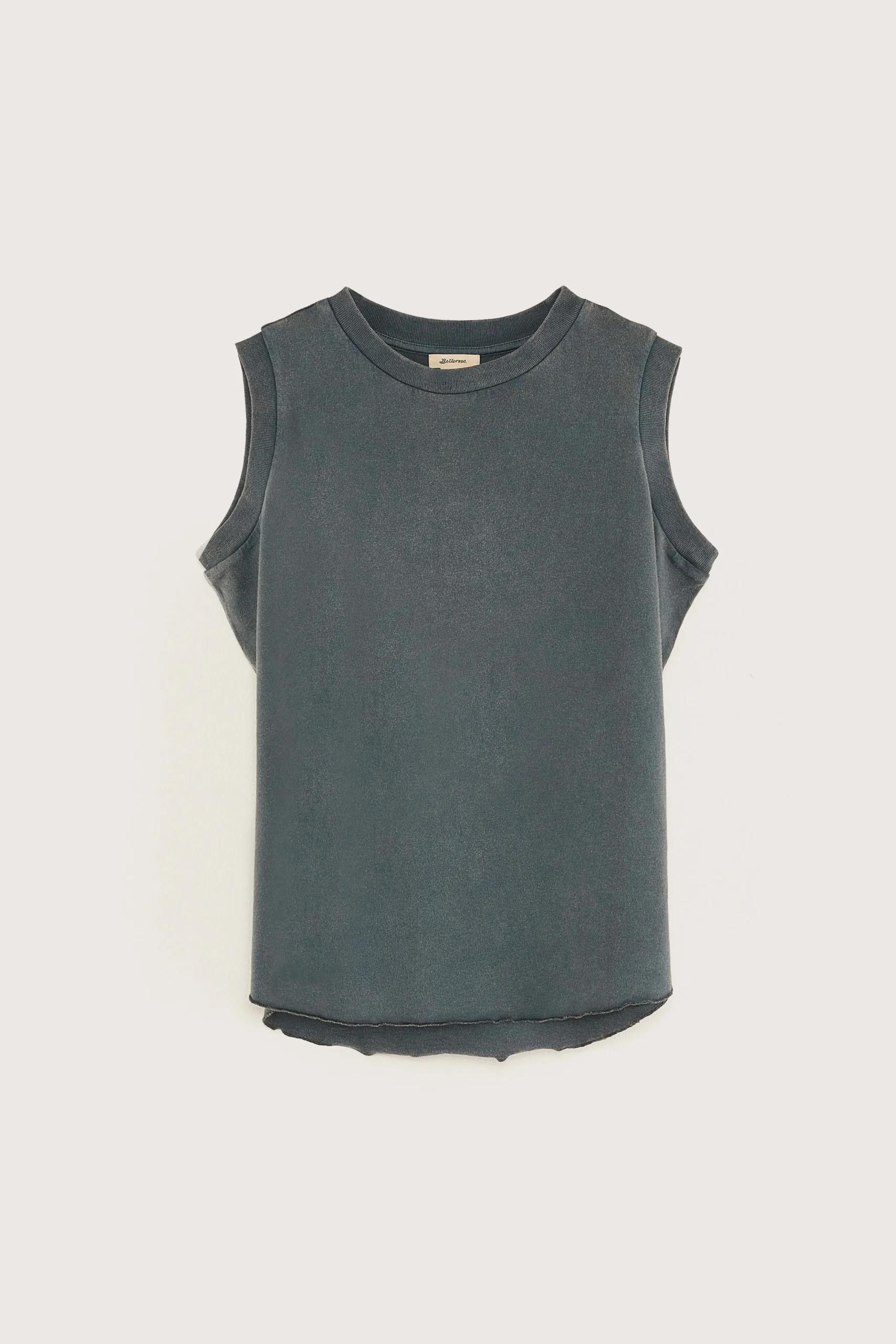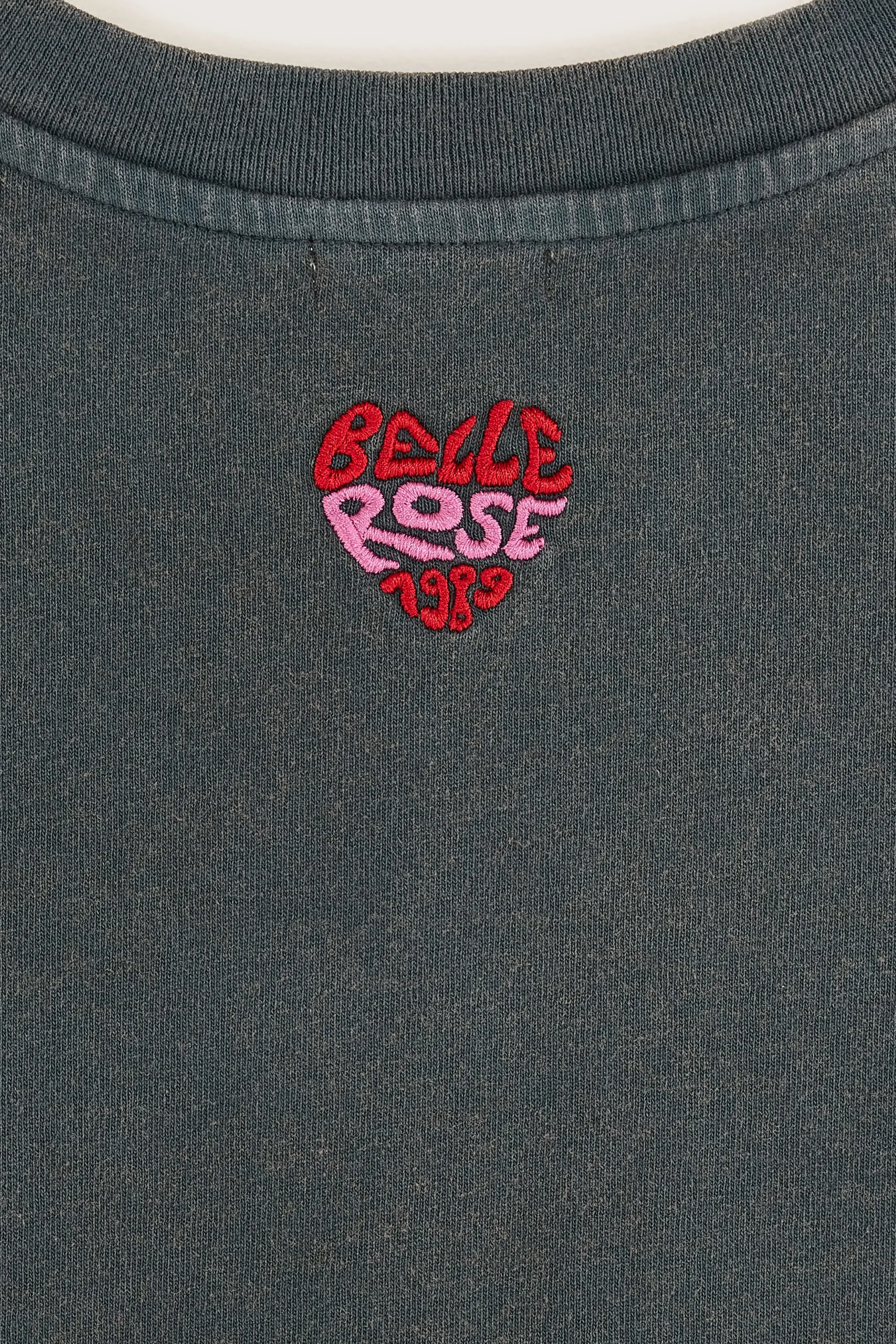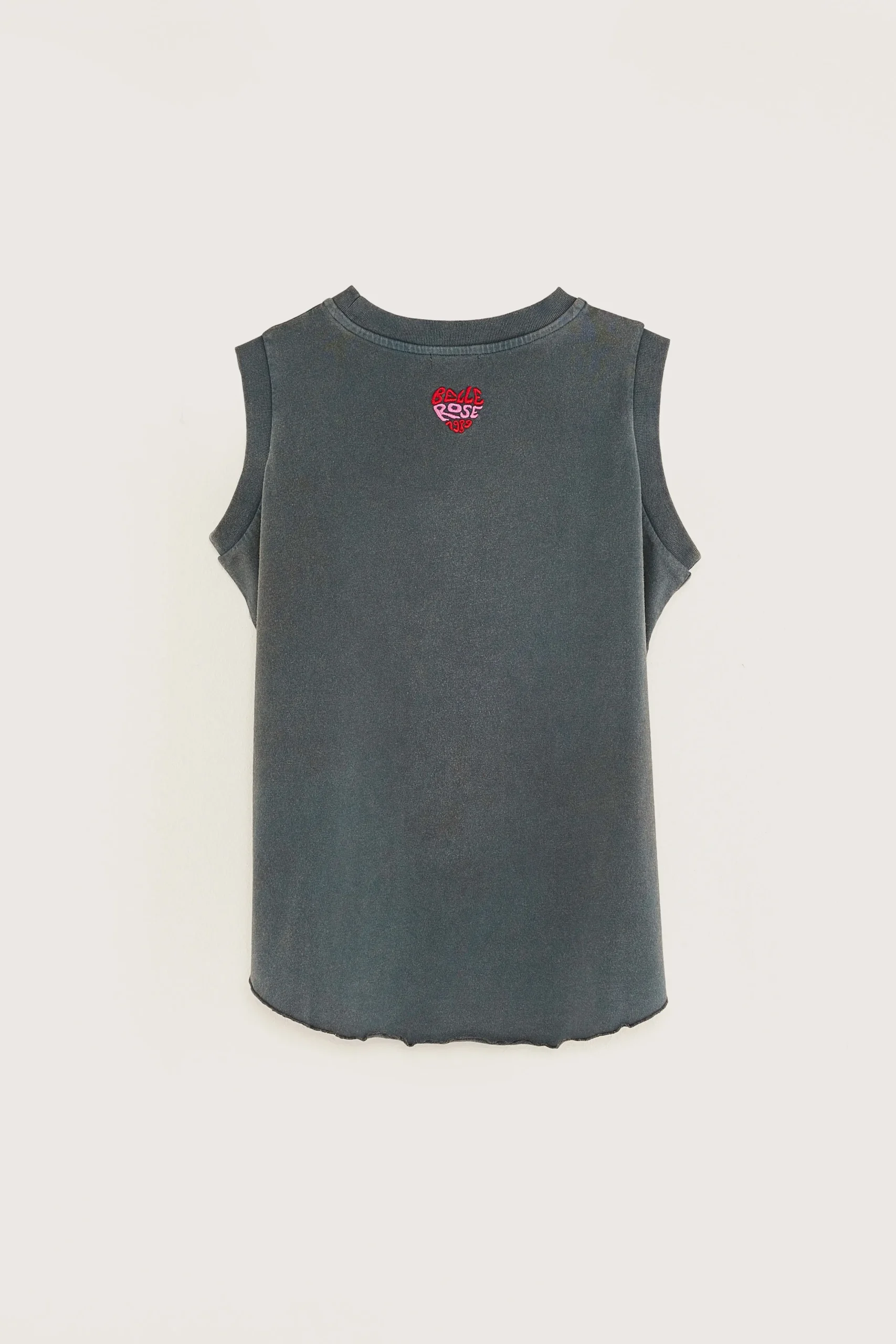 Losse tanktop met geribde boorden, gebogen zoom met gezekerde, onafgewerkte boorden en geborduurd hartje op de rug, gemaakt van halfzwaar, zwart katoenjersey.Losse pasvorm Ronde hals Geribde boorden Gebogen zoom met gezekerde, onafgewerkte randenHalfzwaar katoenjersey Hartvormig Bellerose-borduursel met 1989 op de rug