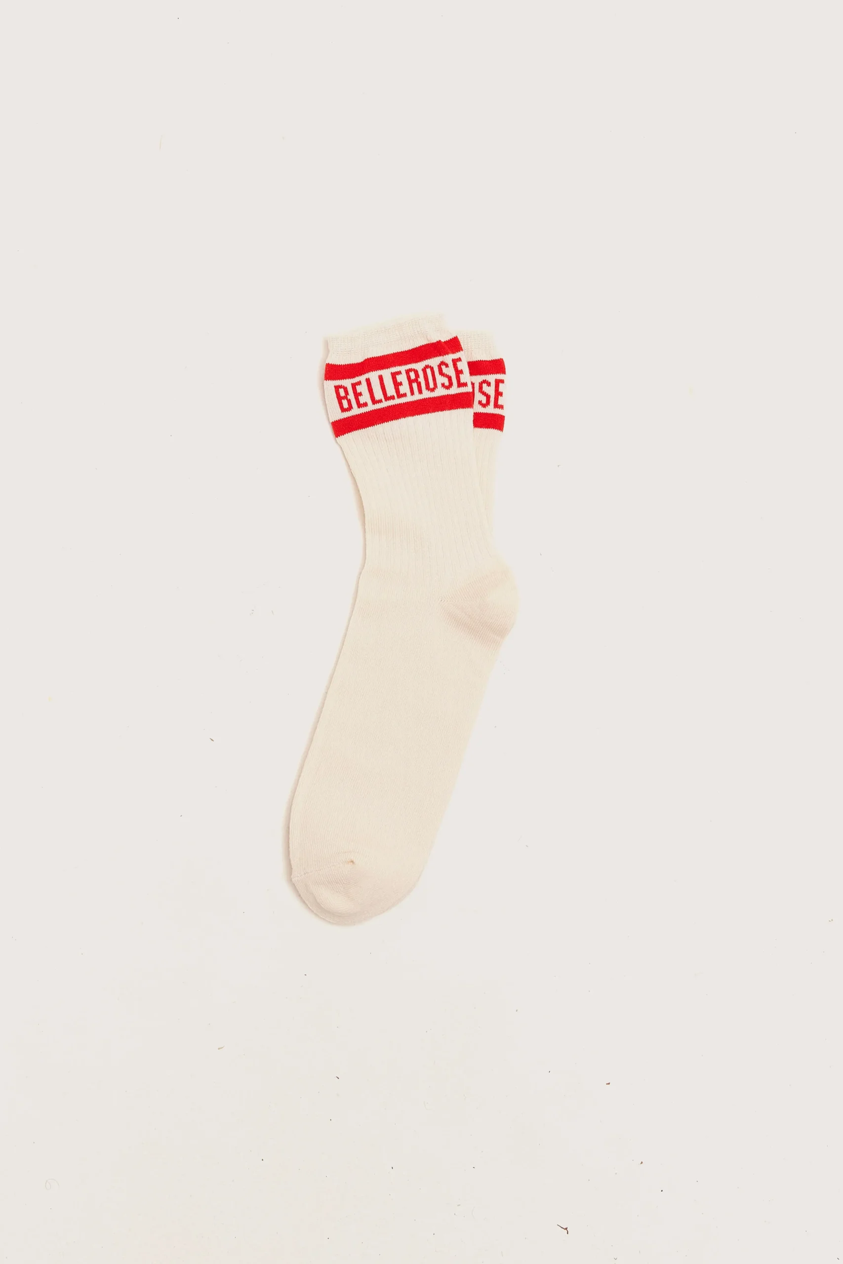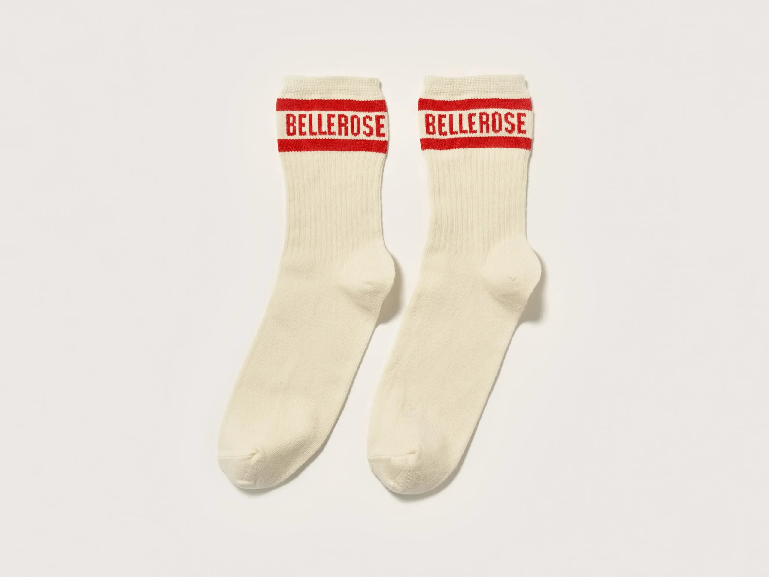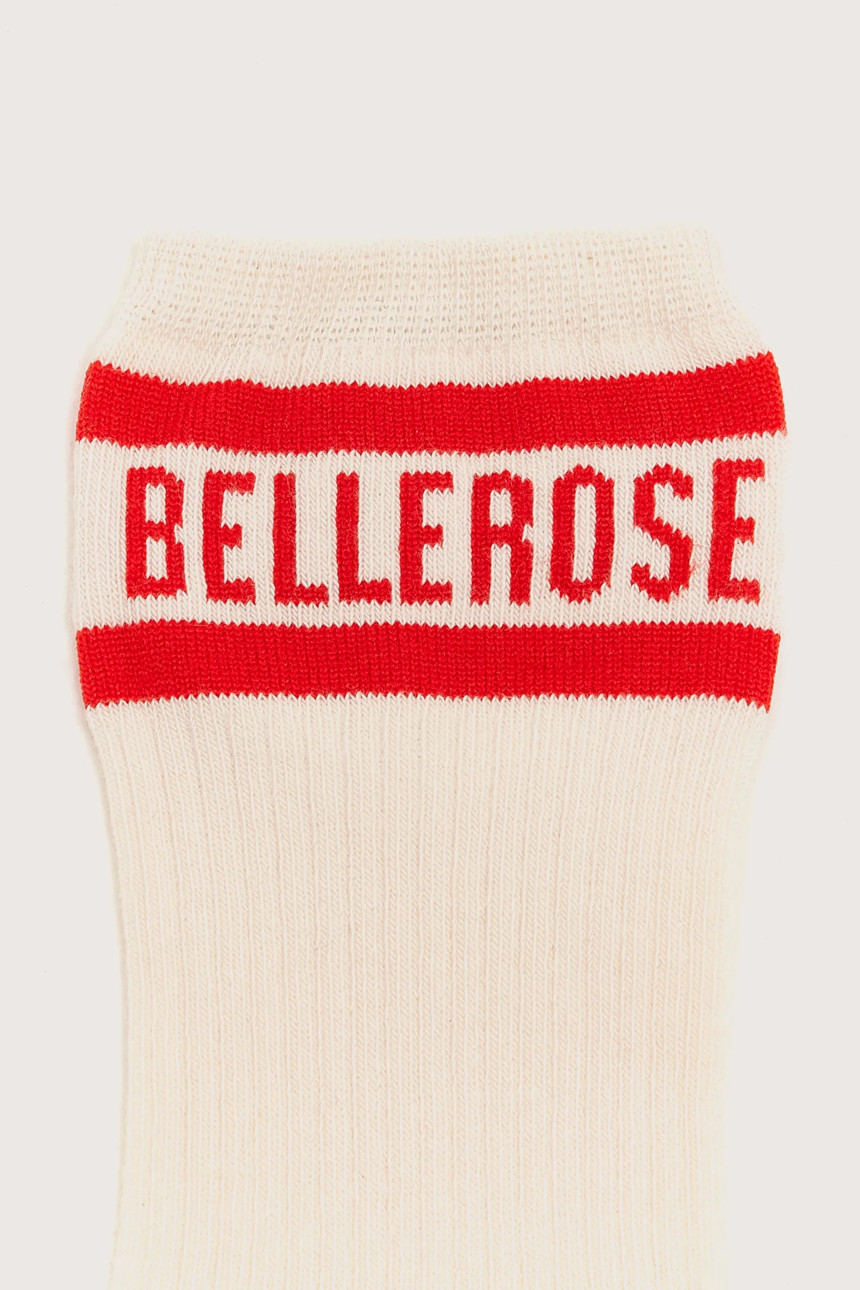 Klassieke sokken in ecru met Bellerose-logo in rood op de enkel.rKlassieke crew pasvormrGeribde enkelsrContrasterend …