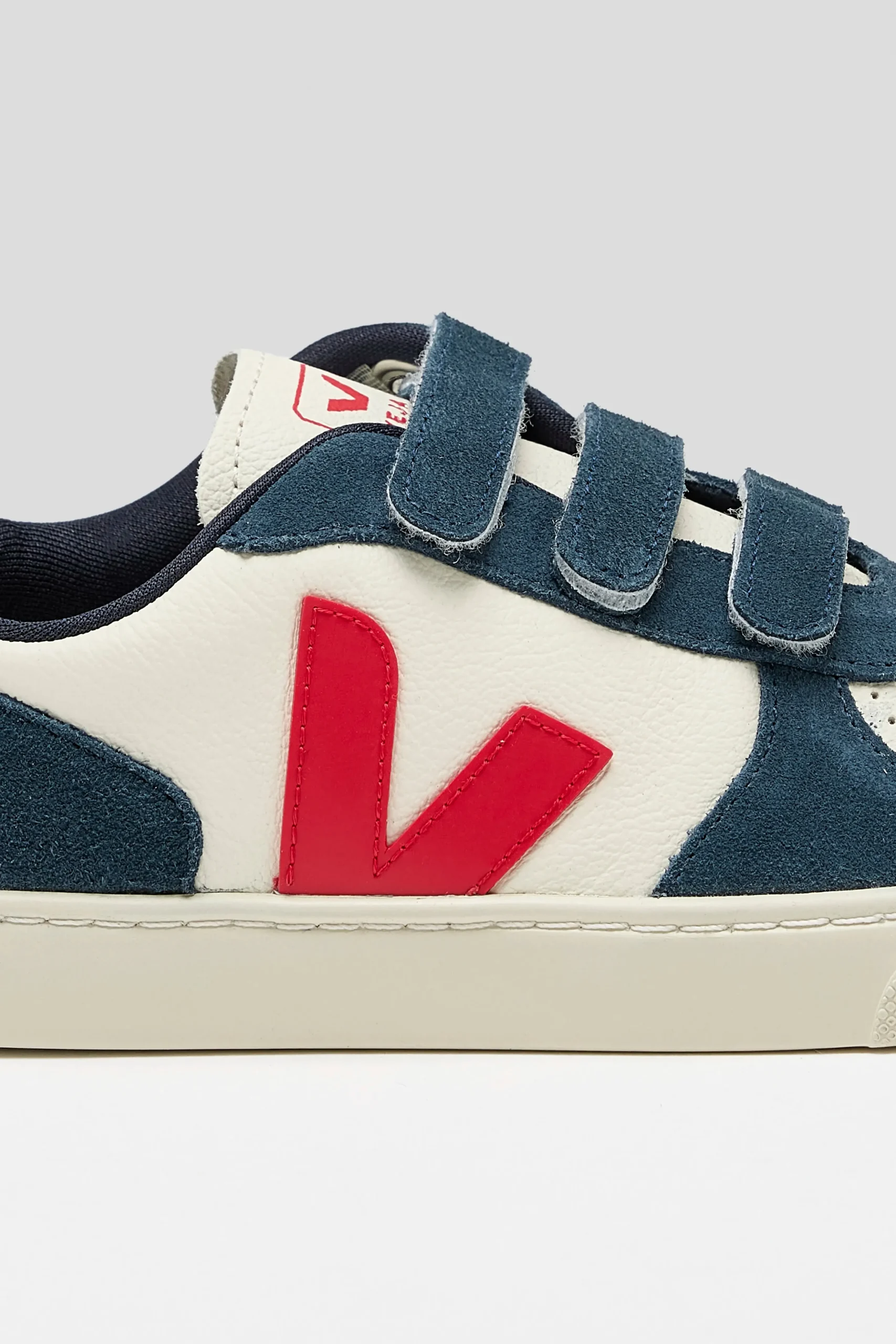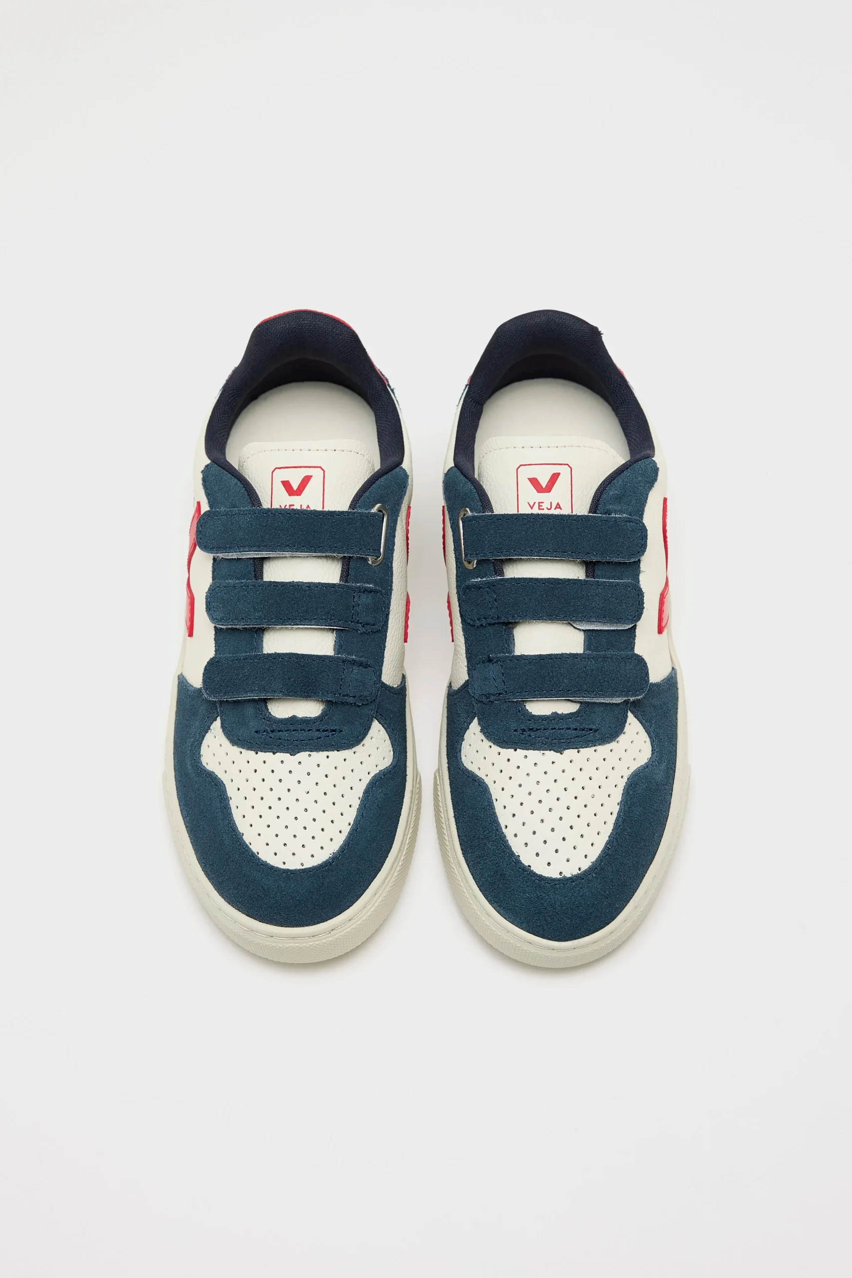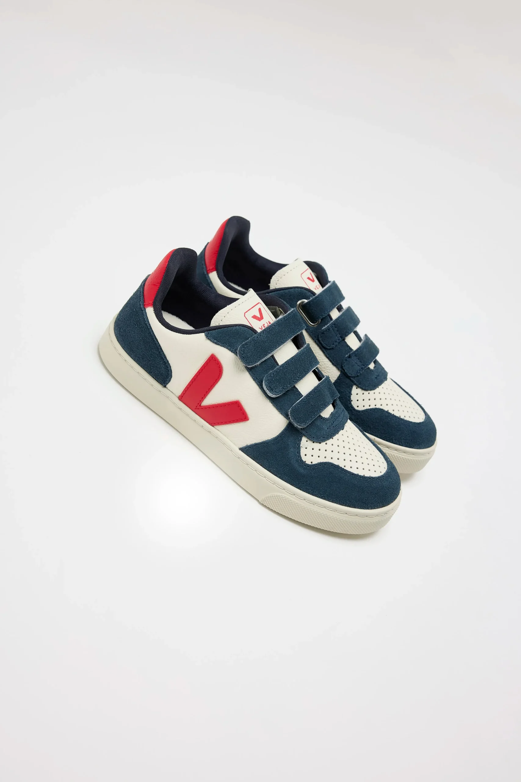 The Veja V-10 lifestyle sneakers for kids feature a Chromefree leather and suede upper with a micro-perforated toe and velcro straps for a secure fit.