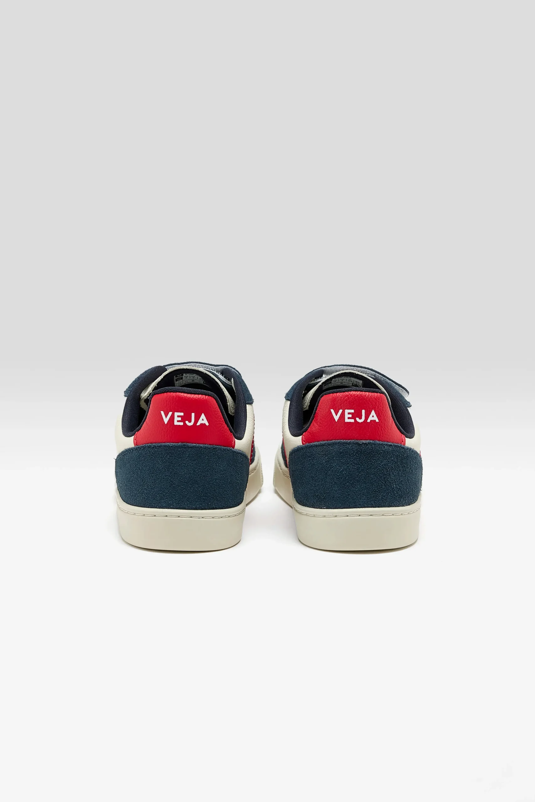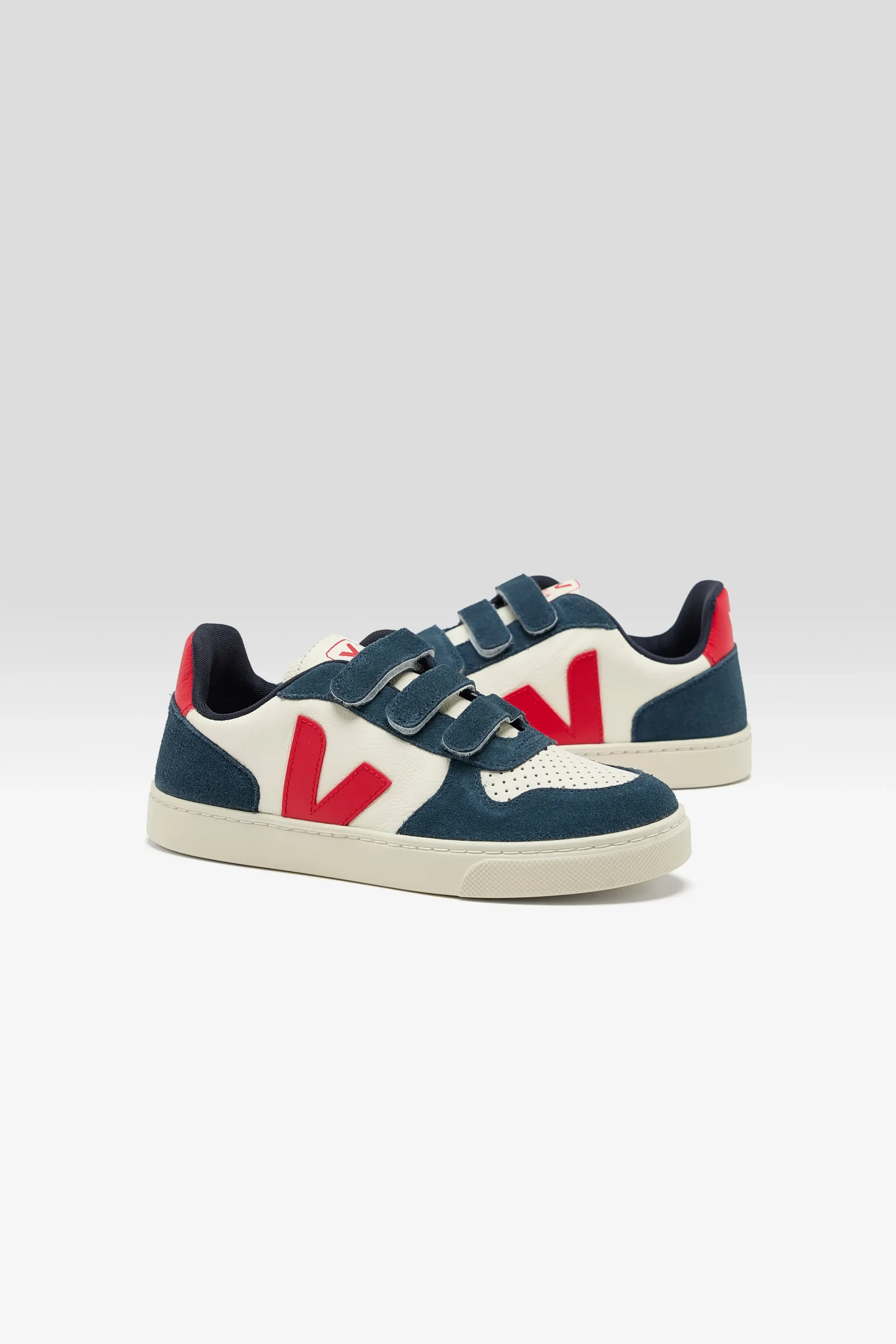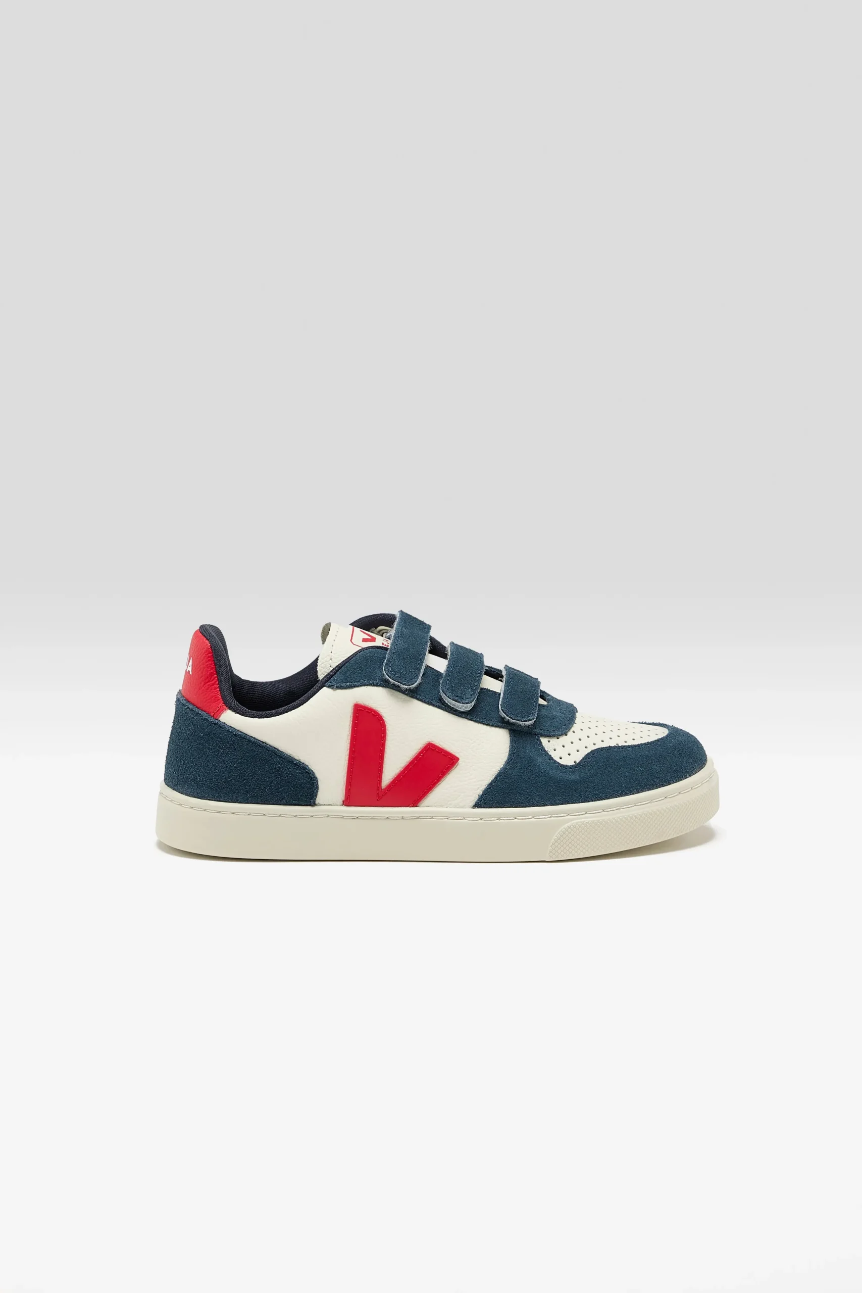 The Veja V-10 lifestyle sneakers for kids feature a Chromefree leather and suede upper with a micro-perforated toe and velcro straps for a secure fit.