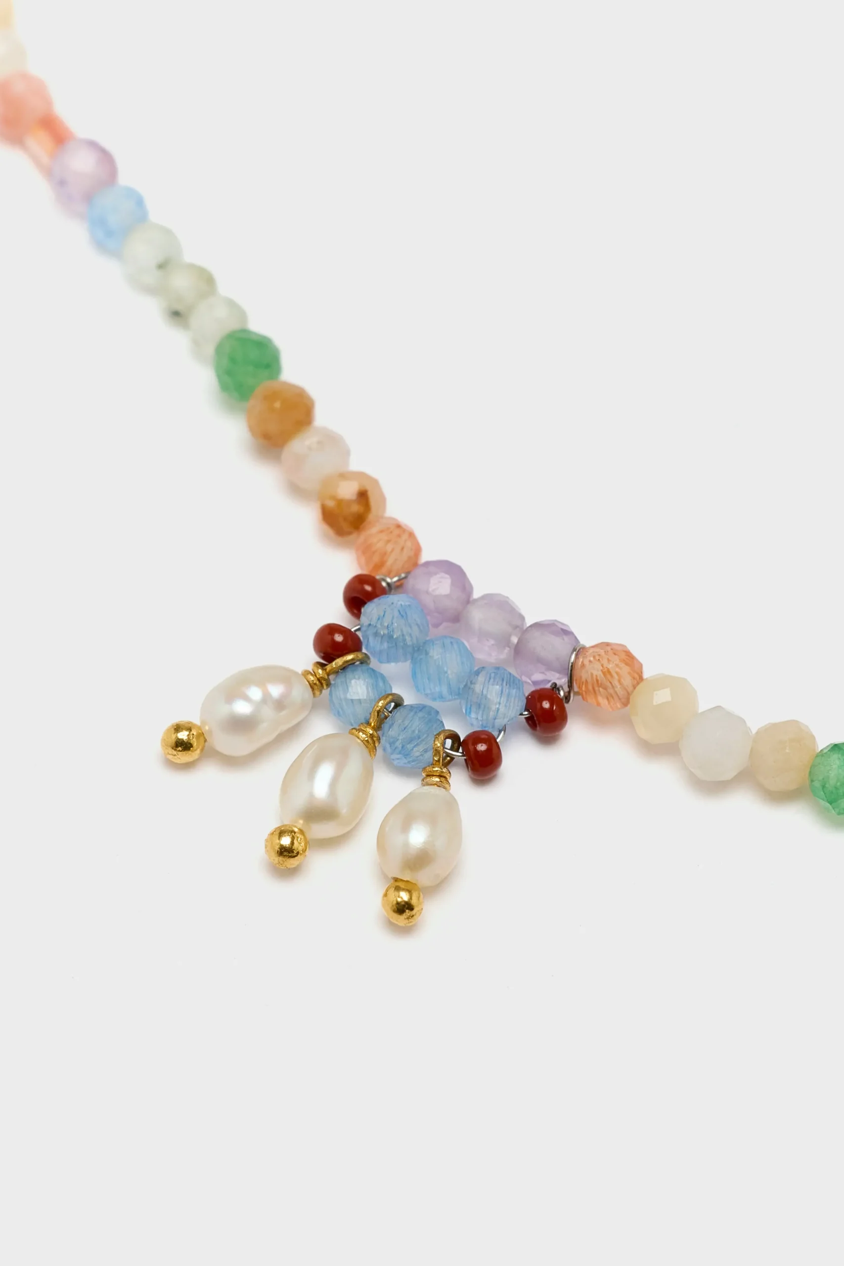The Le Fourbi de Capucine N° 10 necklace features semi-precious gemstones beaded on a gold-plated brass chain with freshwater pearl pendant beads at the centre.