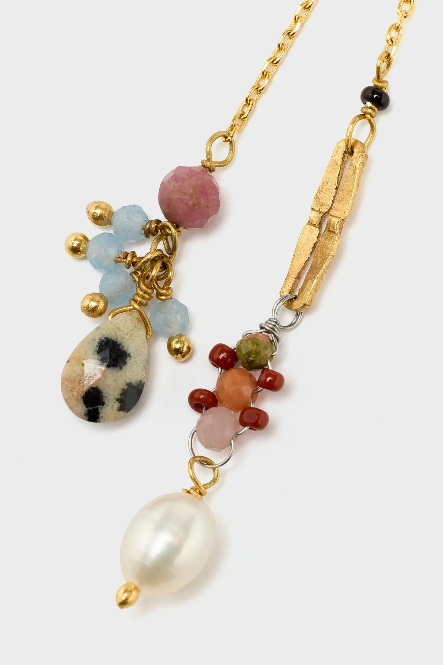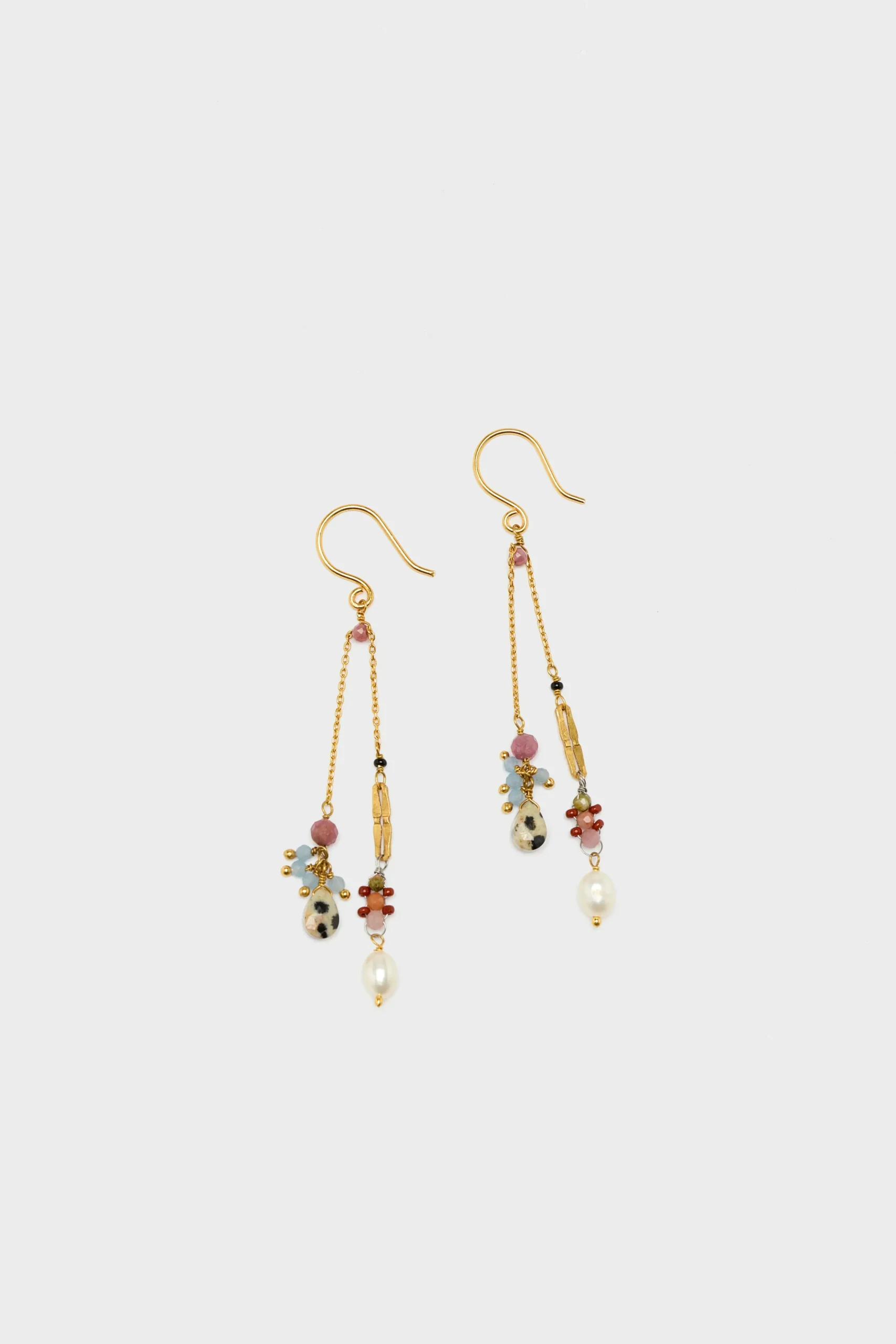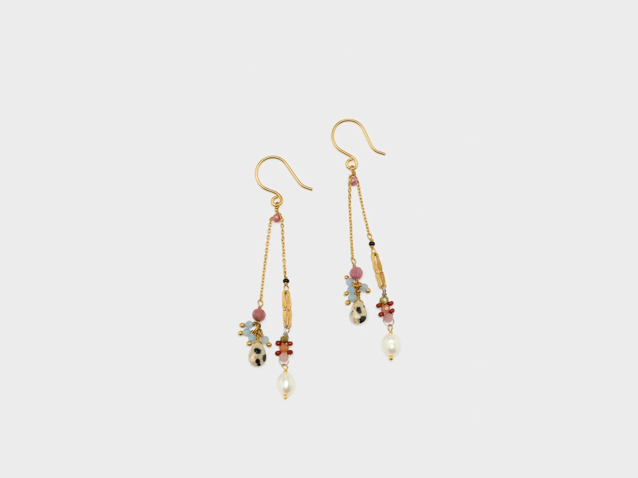 The N° 13 Le Fourbi de Capucine earrings feature a delightful mix of gemstones and freshwater pearl beads on gold-filled brass chains suspended from hooks.