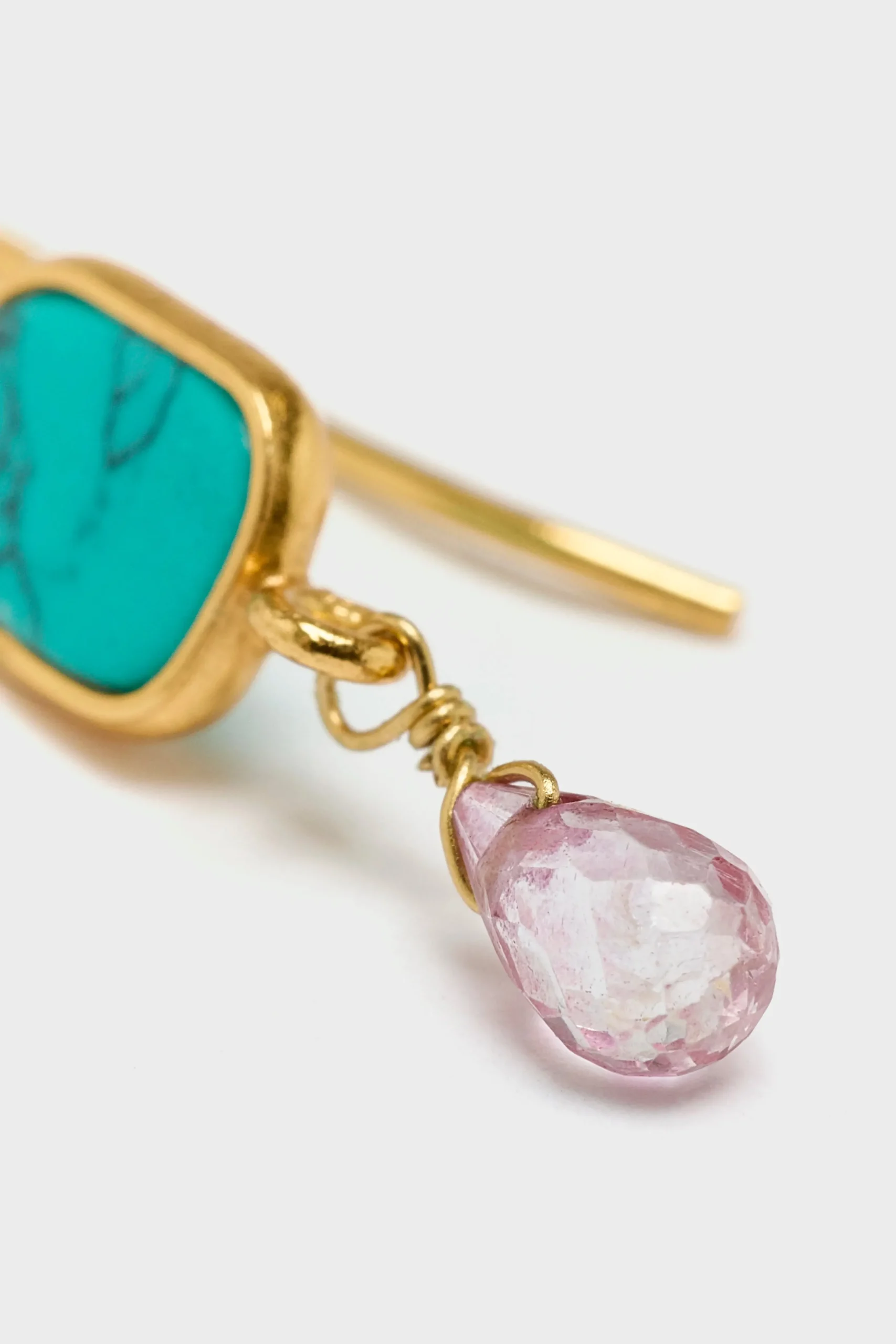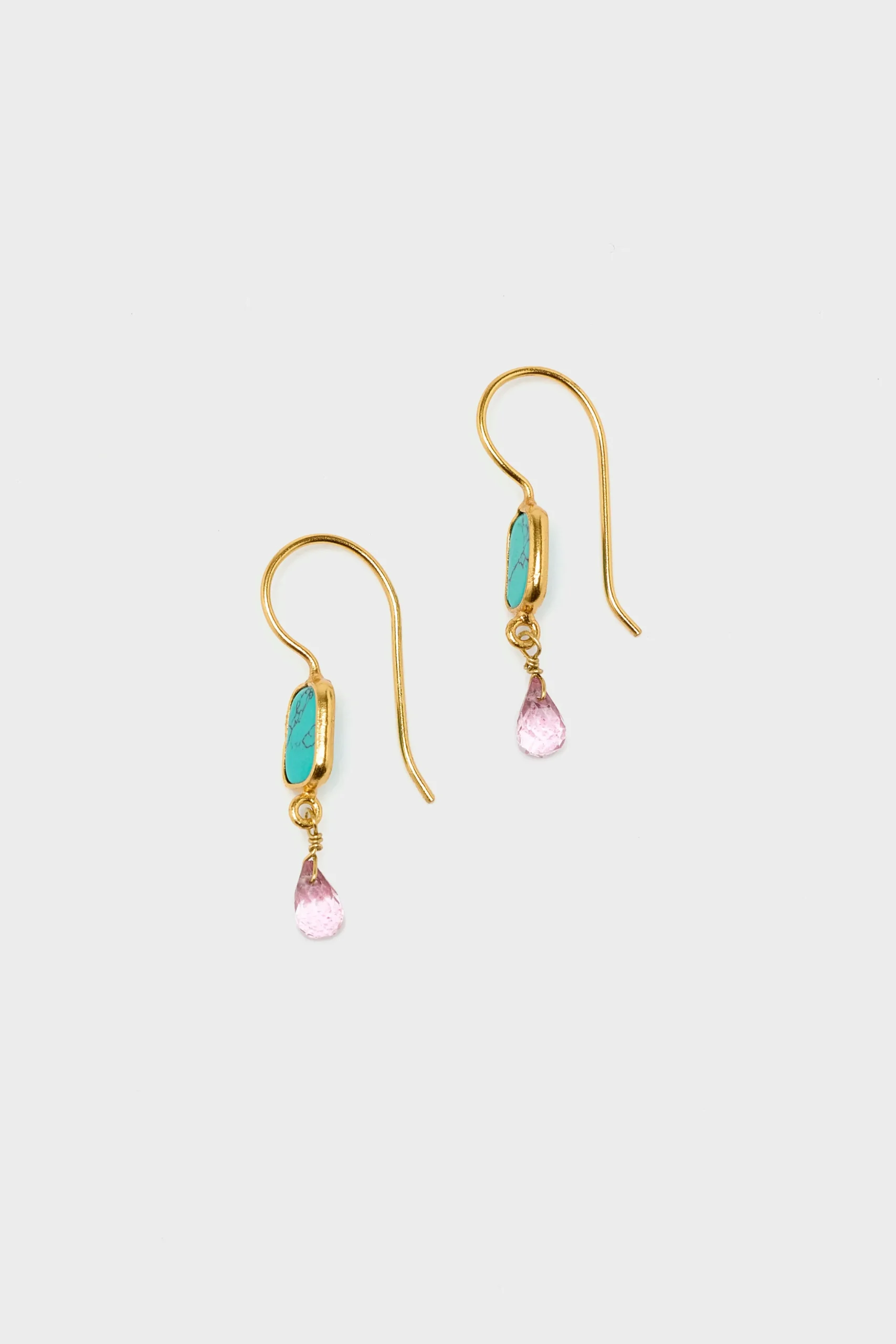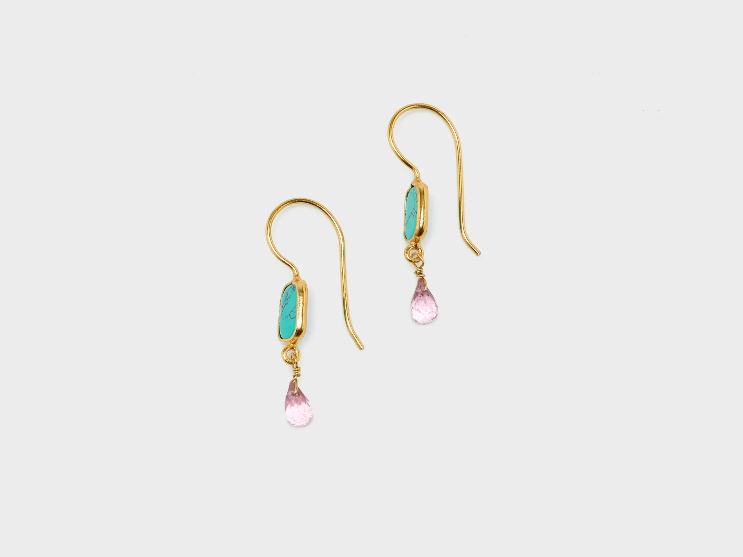 The N° 37 Le Fourbi de Capucine earrings feature blue labradorite and pink quartz stones suspended from gold-plated brass hooks.