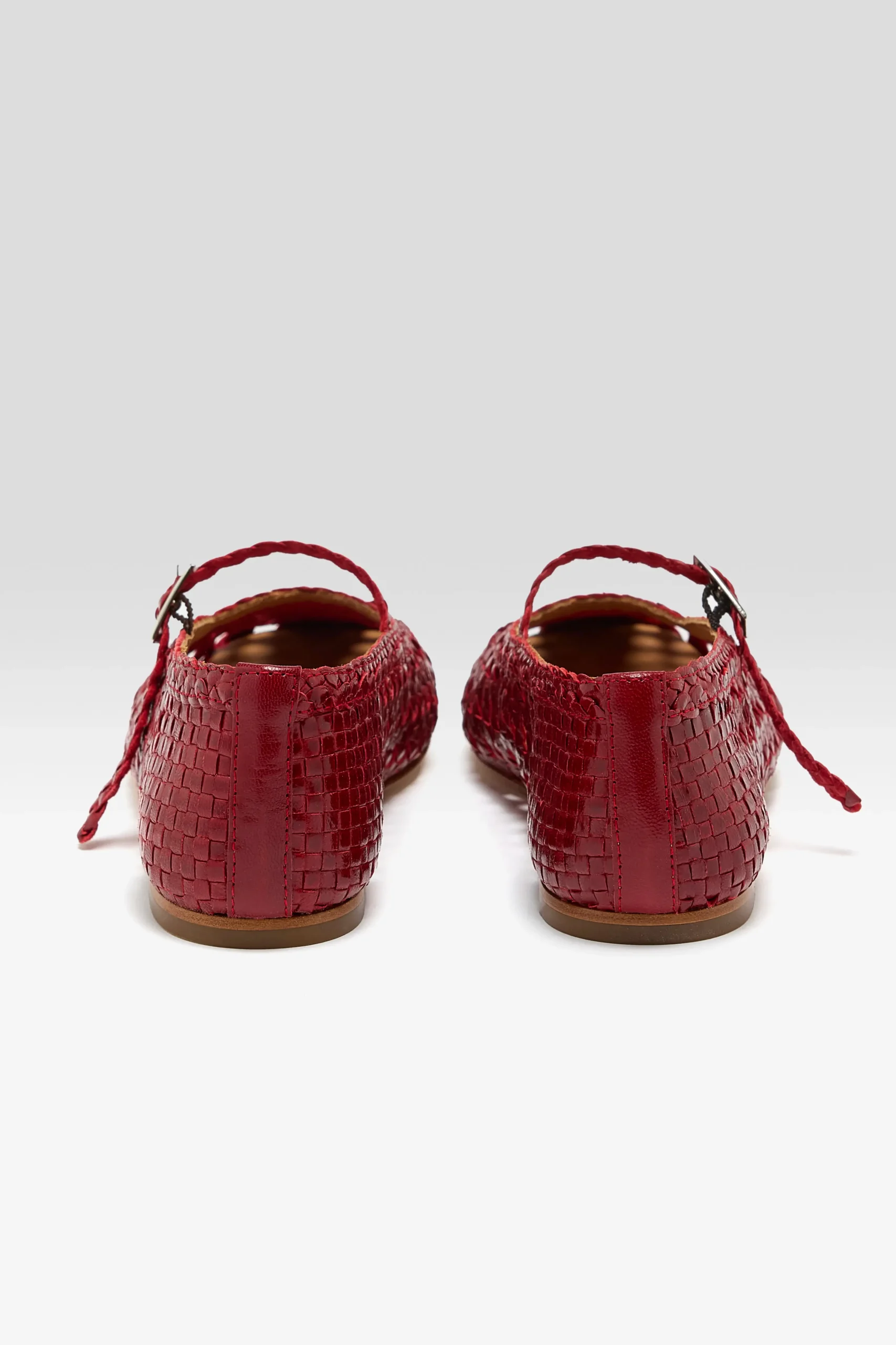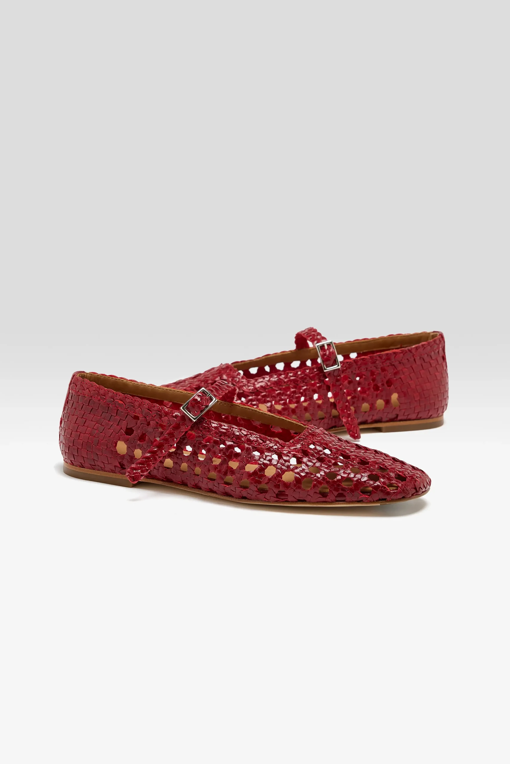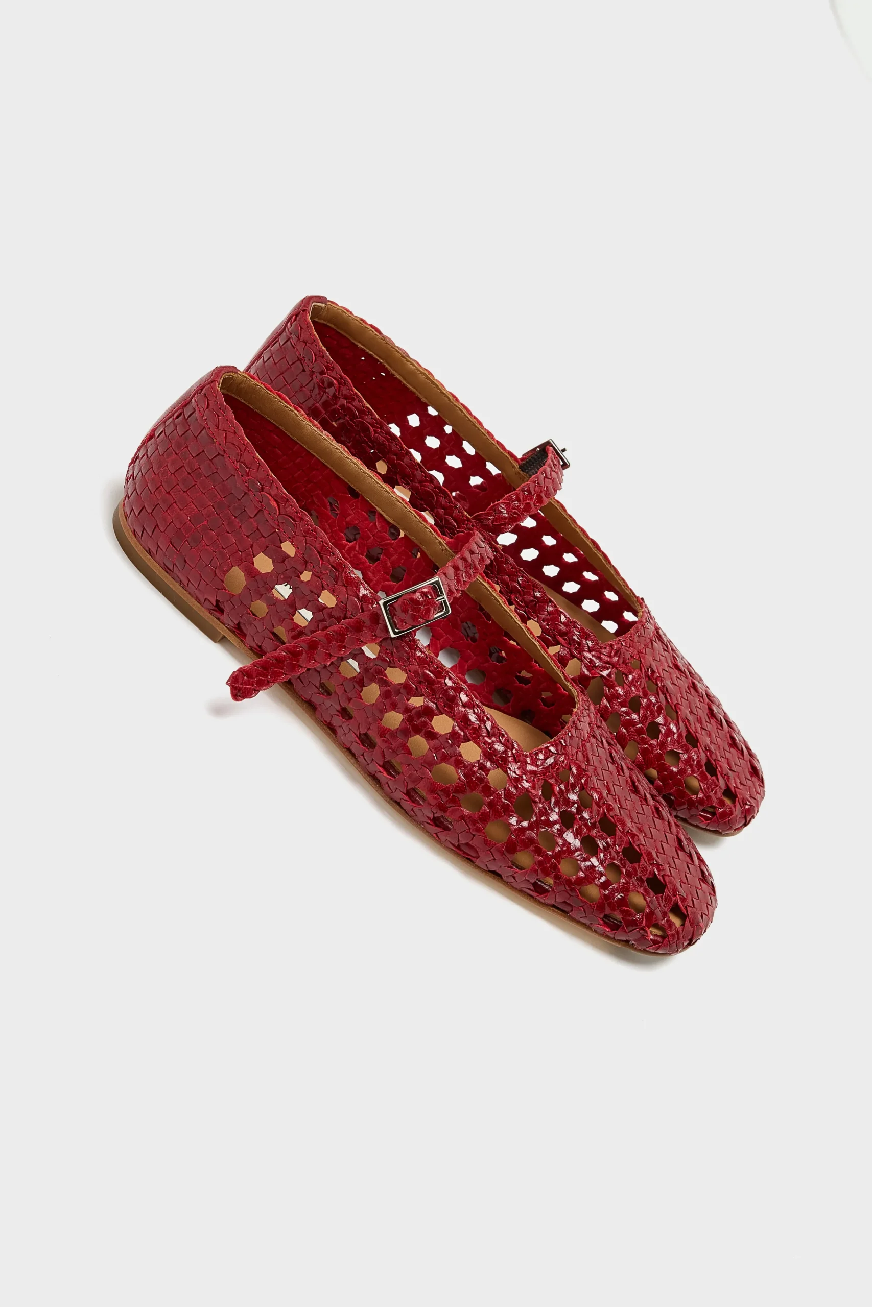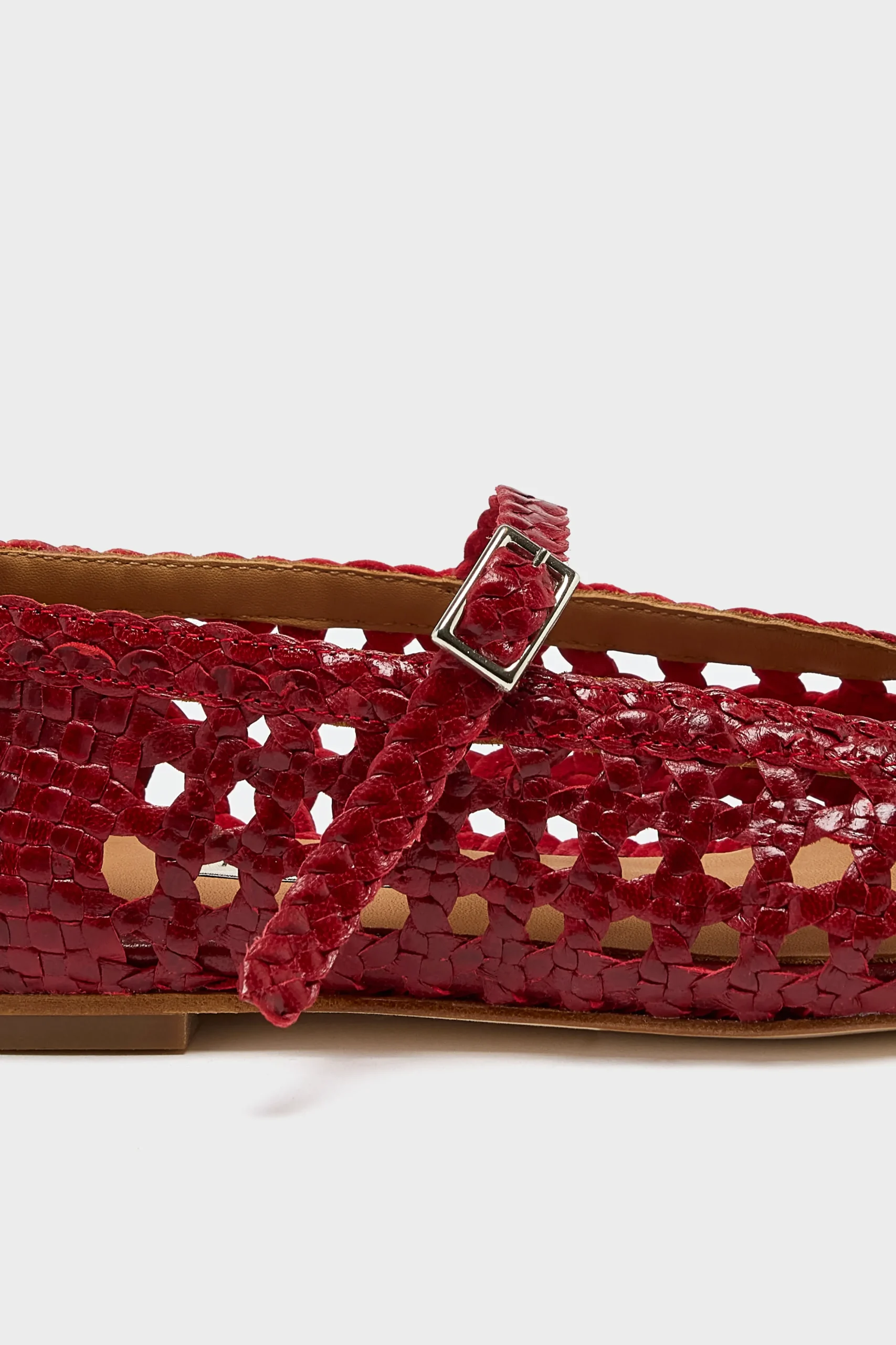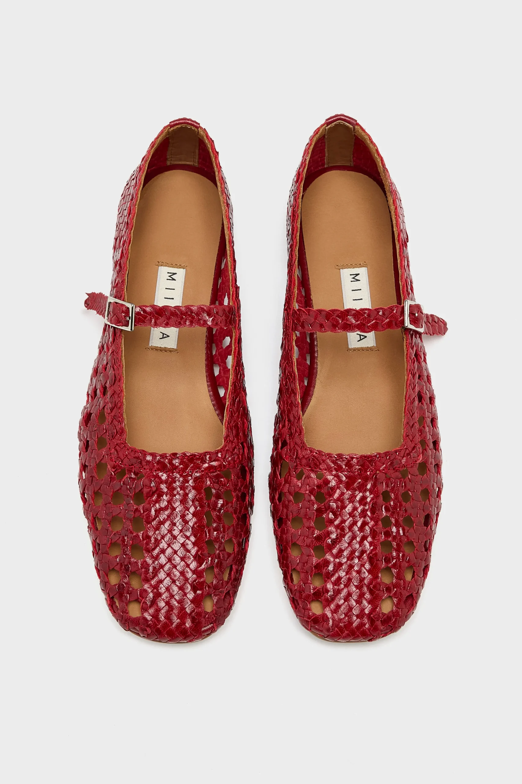 The Miista Yeida Dark Red Ballerinas are handwoven from soft goat leather with a memory foam insole, leather lining, a rubber heel cap, and a rubber-invected toe for a stable step.