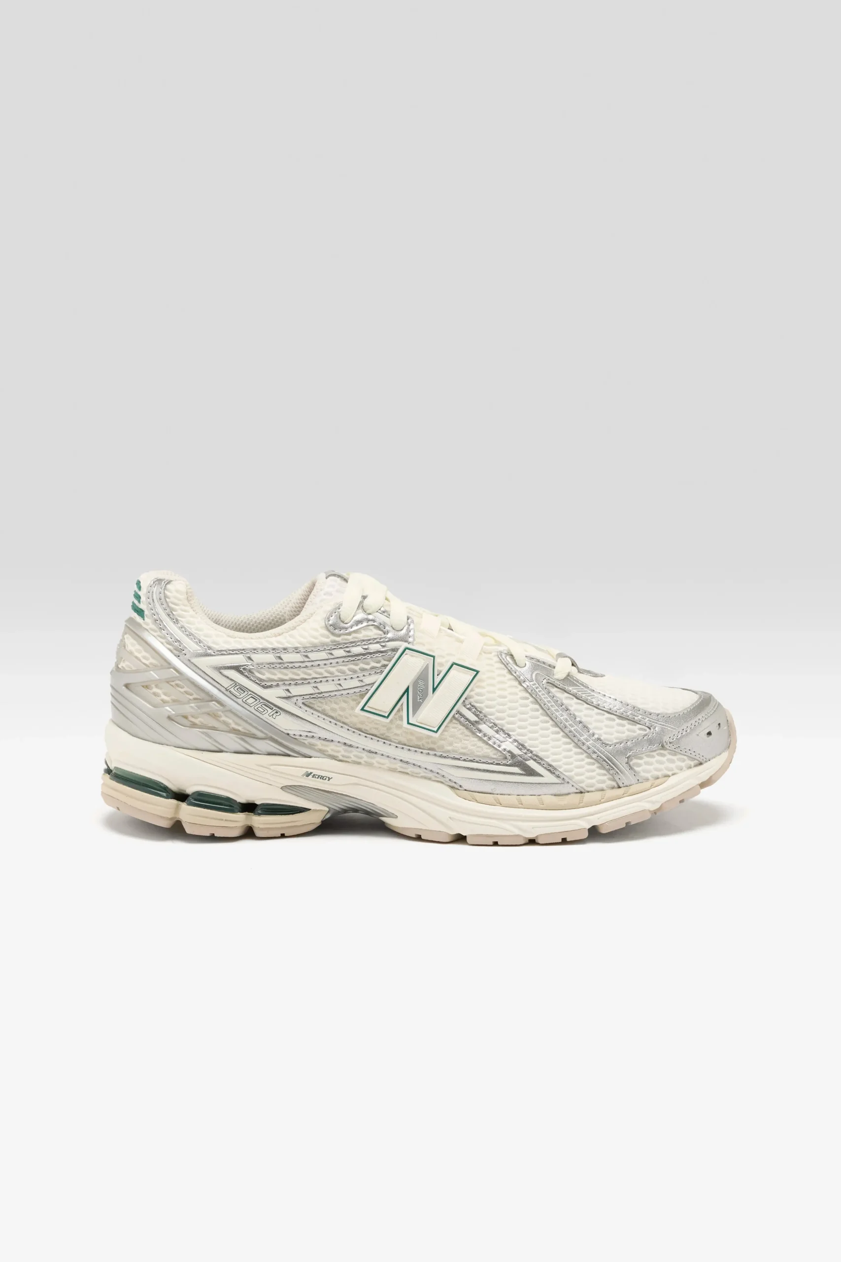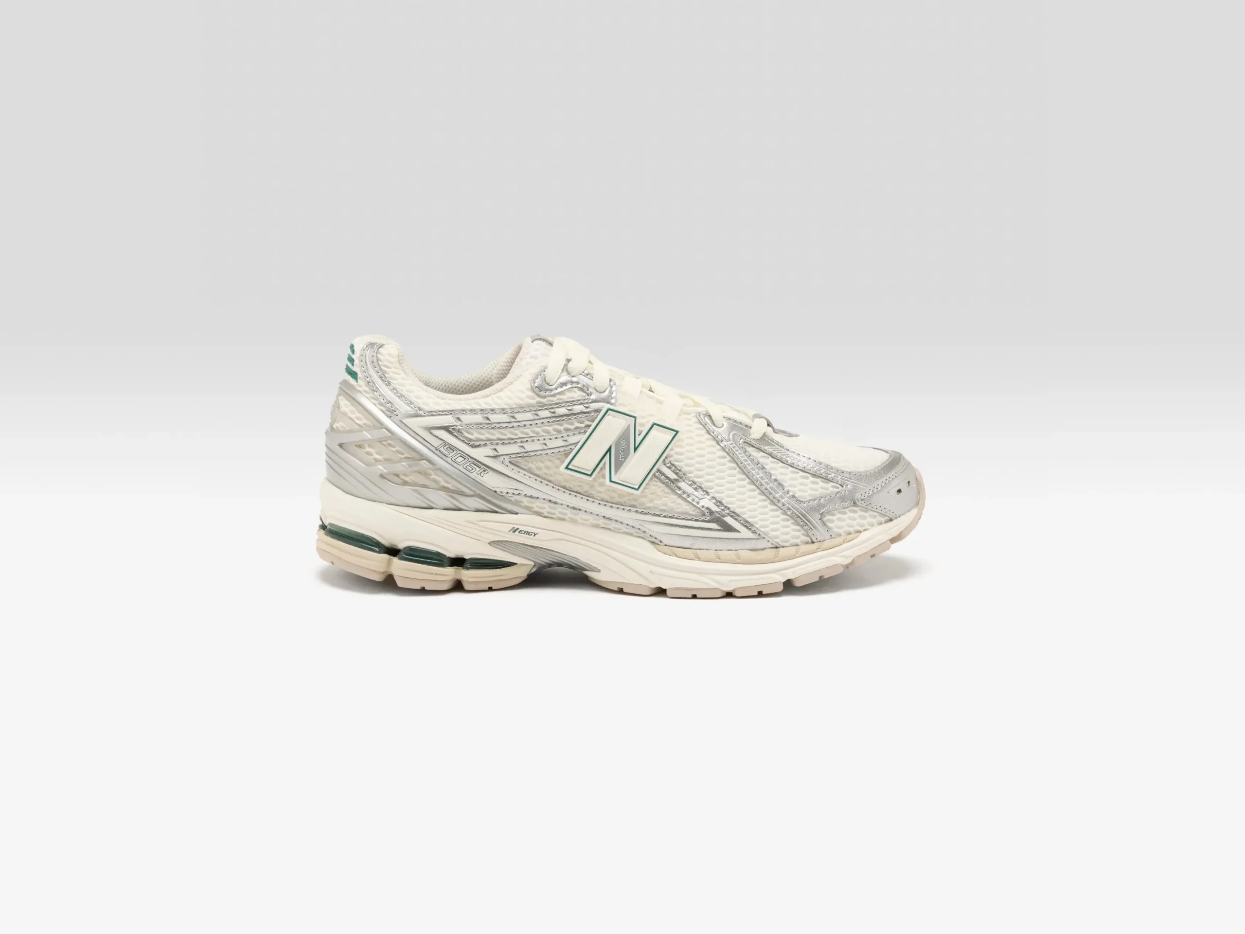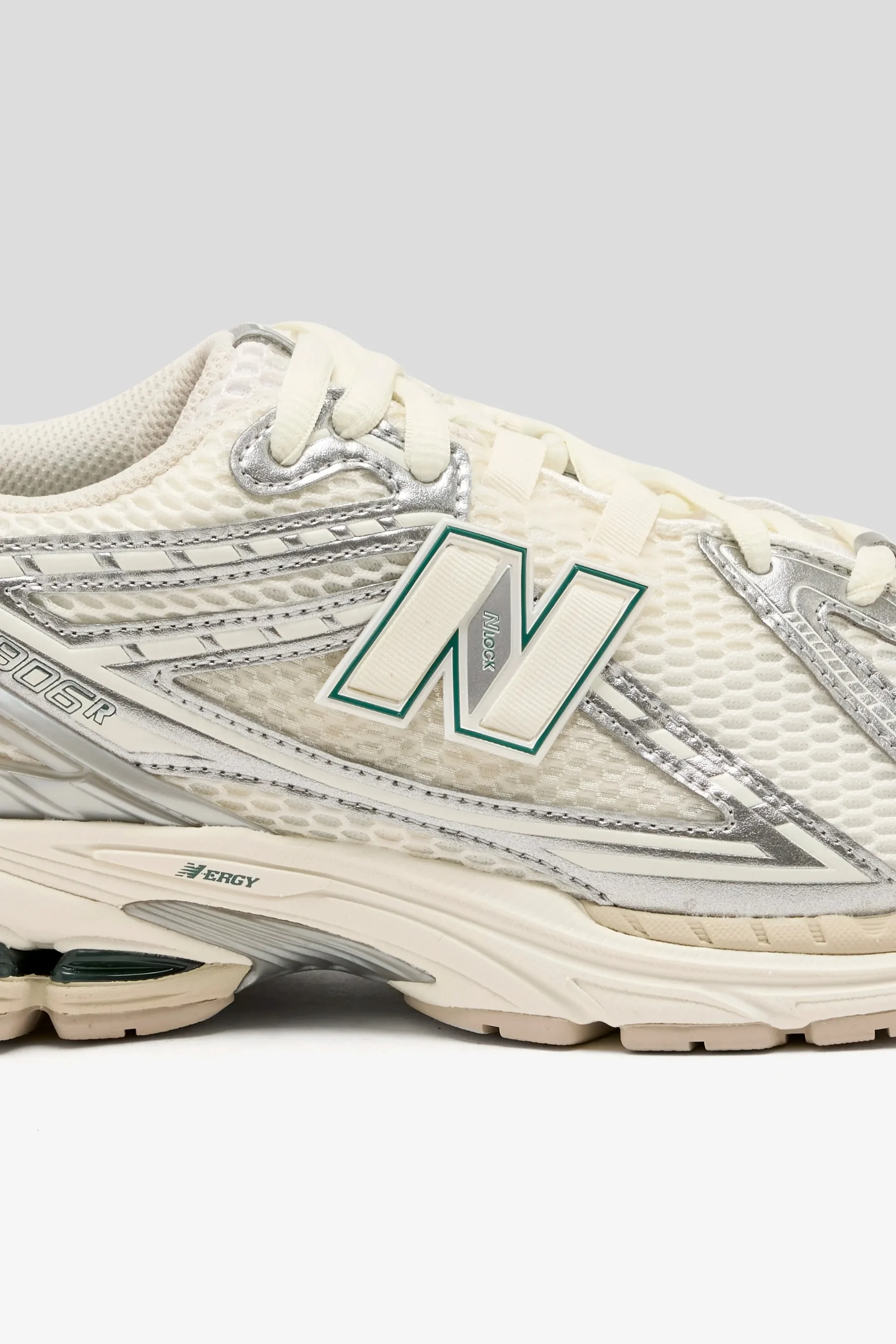 De New Balance 1906R hardloopschoenen hebben een bovenwerk van mesh met synthetische overlays en een dempende ABZORB middenzool en hiel.Stijl: M1906REEKleur: Silver metallic with sea salt and new spruce