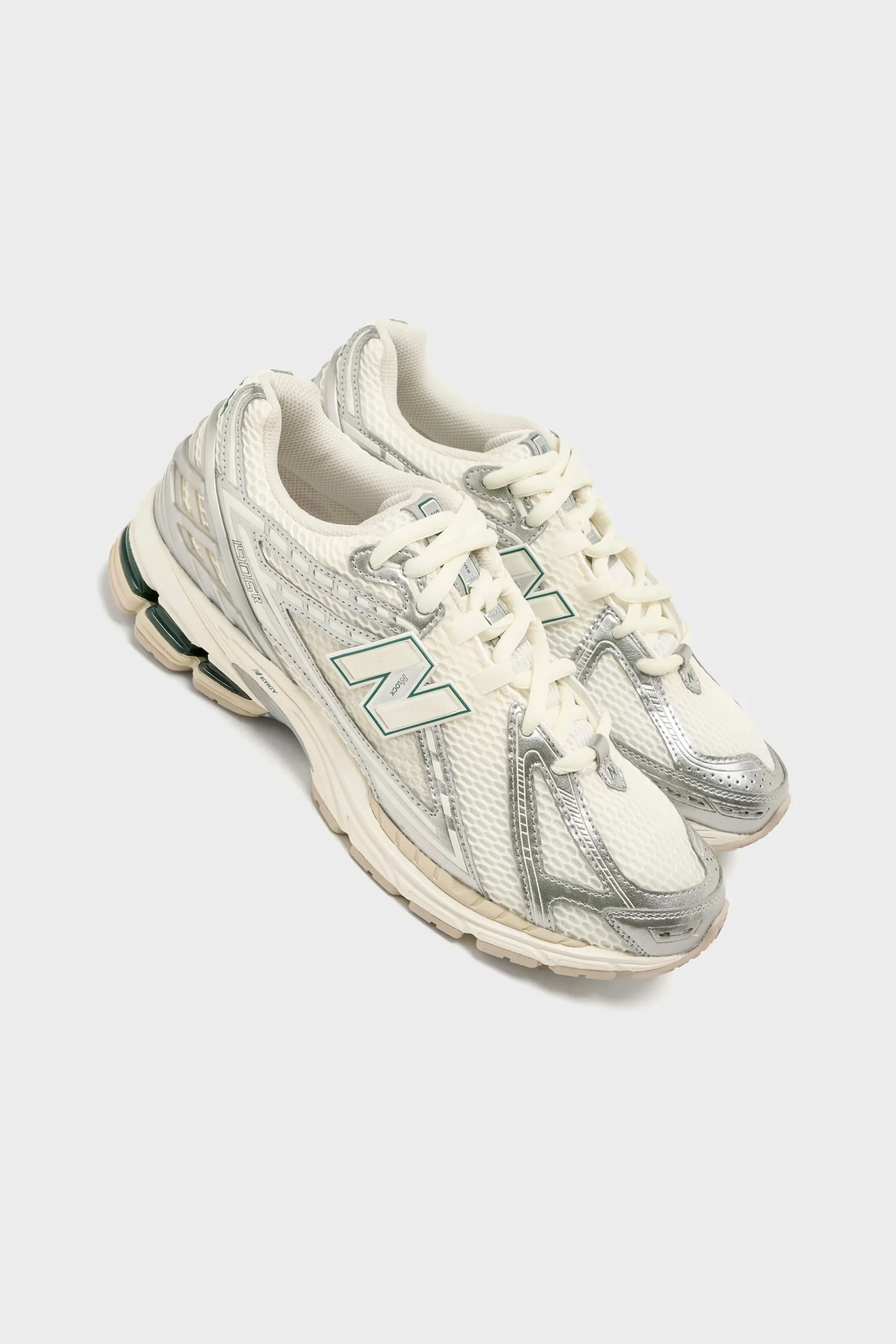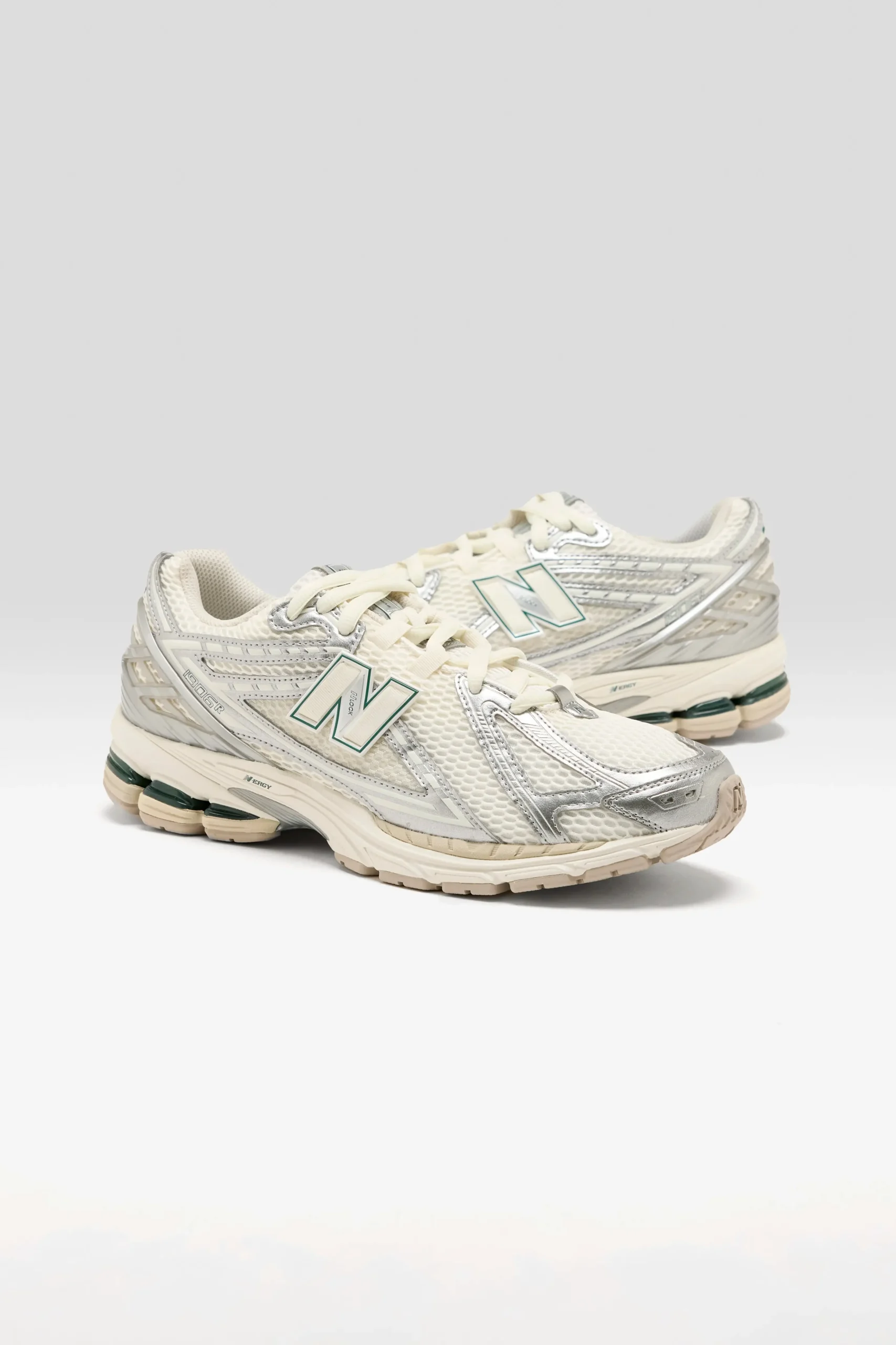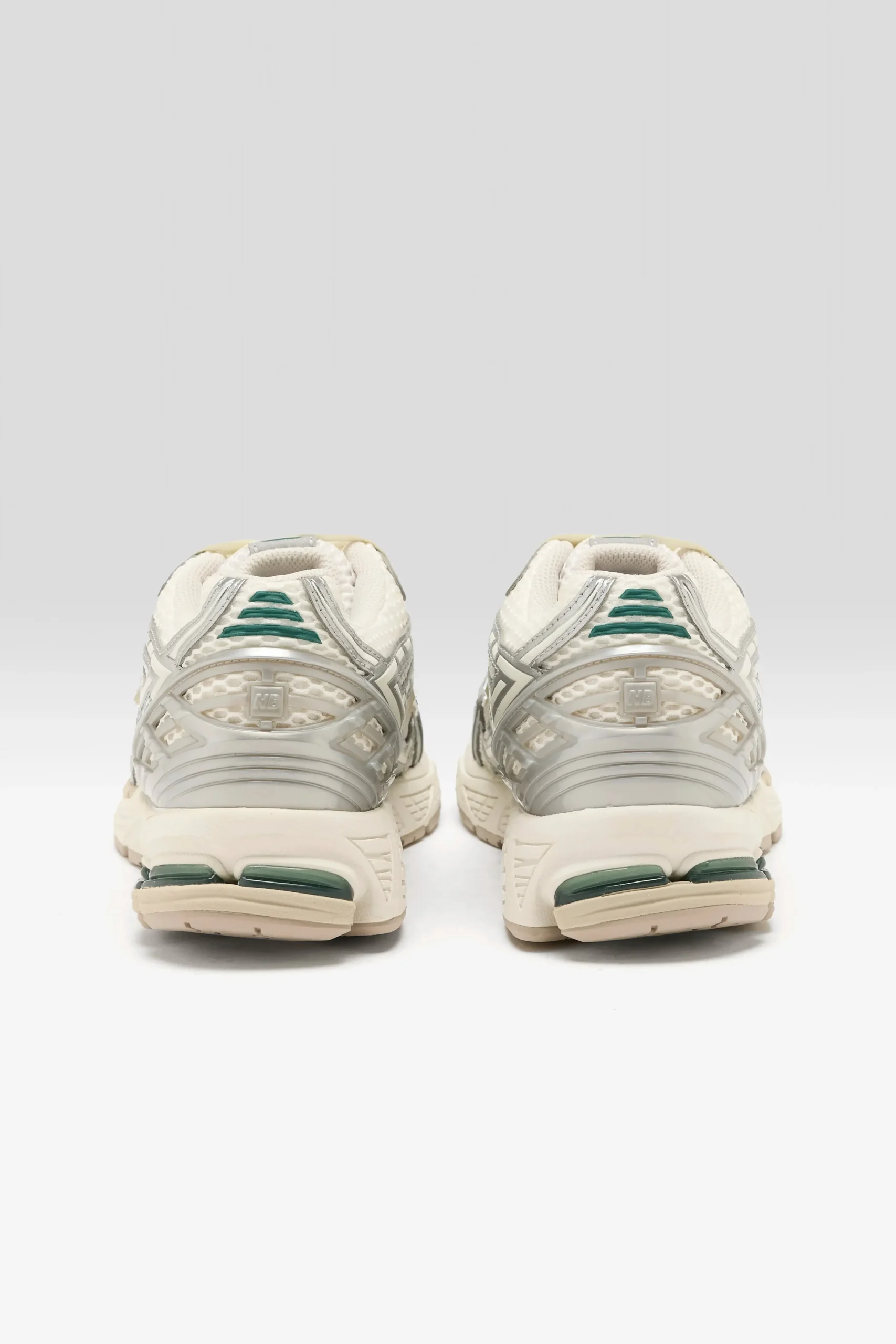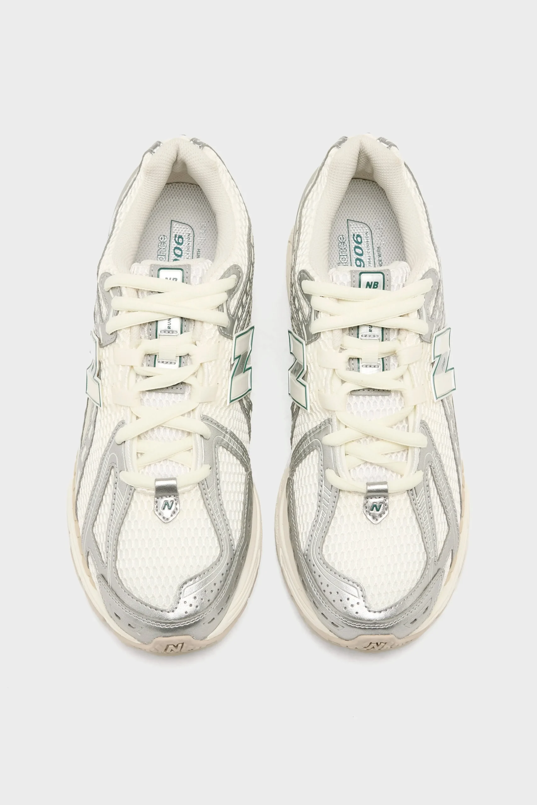 De New Balance 1906R hardloopschoenen hebben een bovenwerk van mesh met synthetische overlays en een dempende ABZORB middenzool en hiel.Stijl: M1906REEKleur: Silver metallic with sea salt and new spruce
