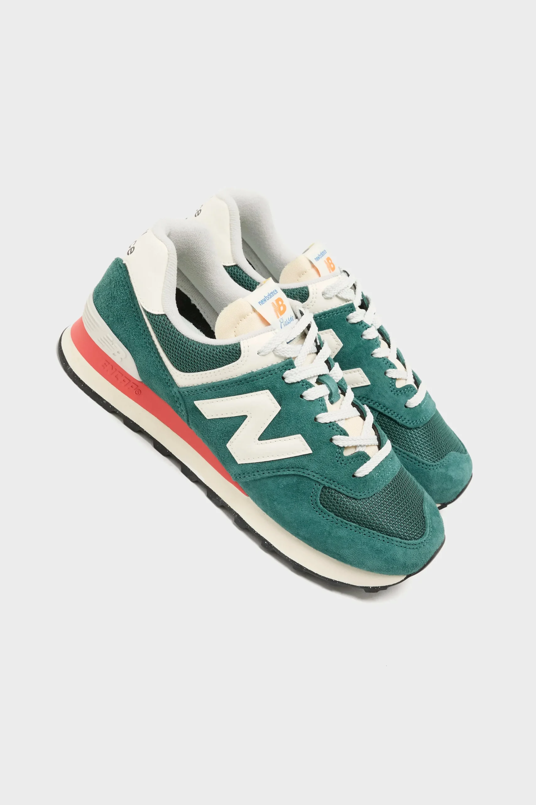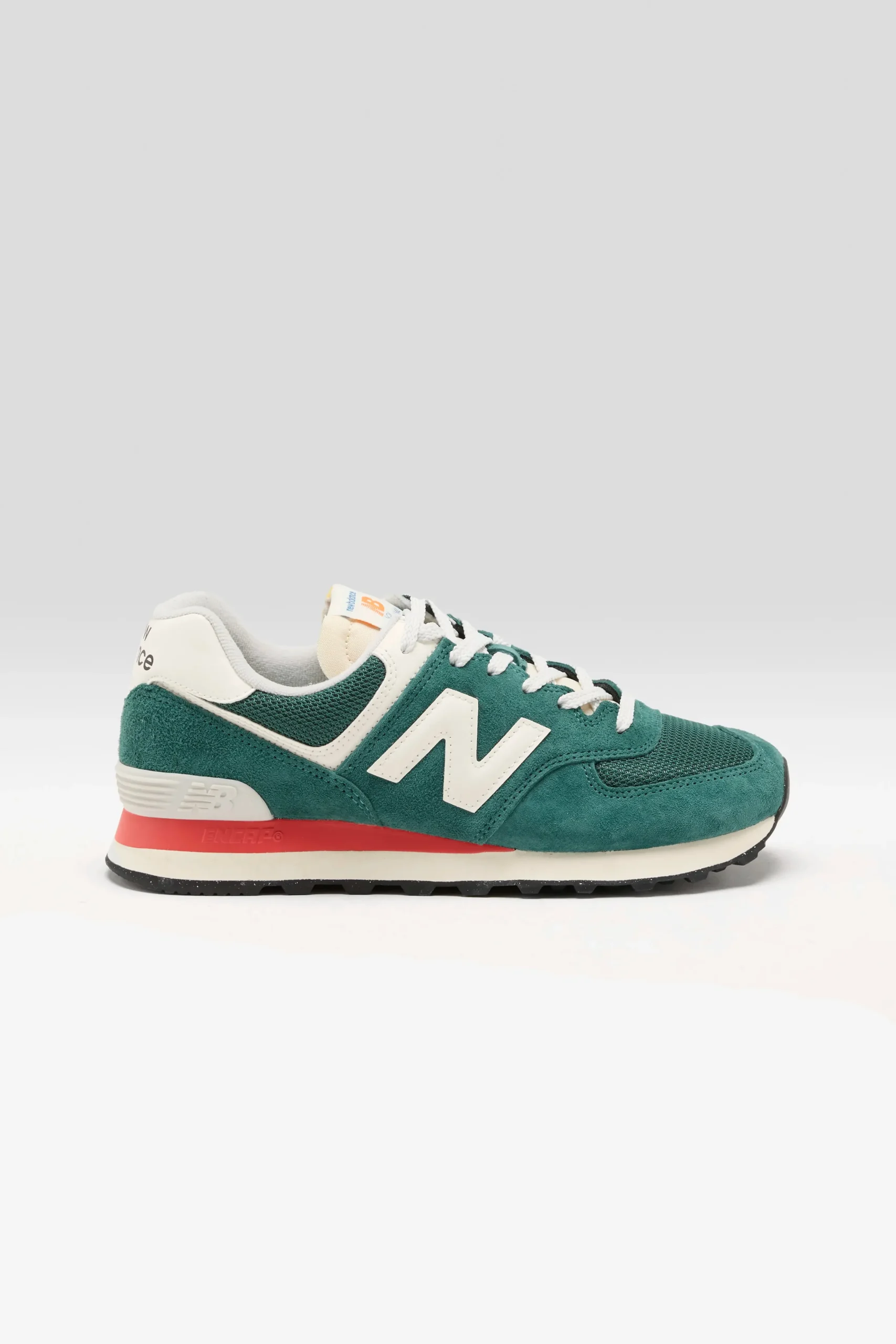 The New Balance 574 sneakers combine a suede upper with mesh underlays on a wide racing sole.