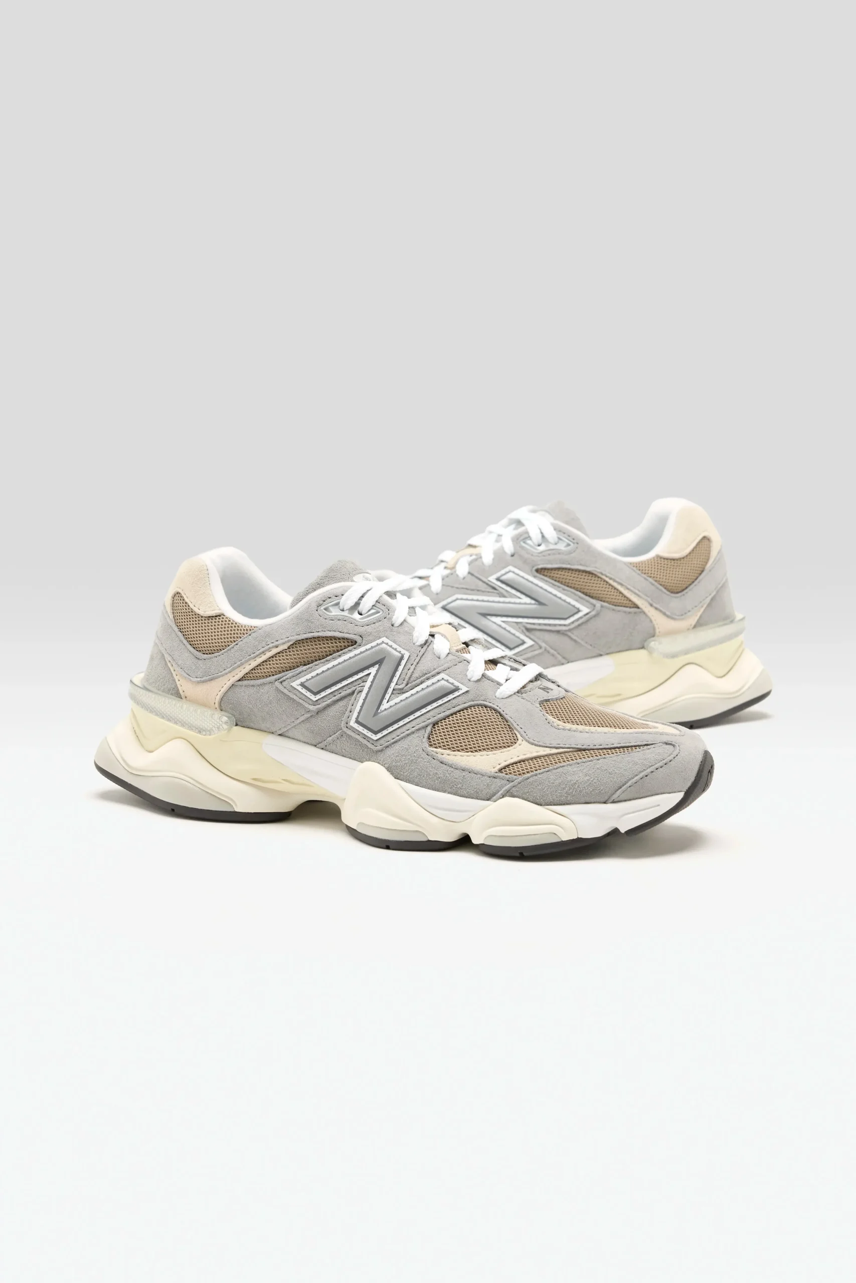 The New Balance 9060 sneakers have a mesh upper, pigskin suede overlays, and a cushioned midsole in a futuristic silhouette.