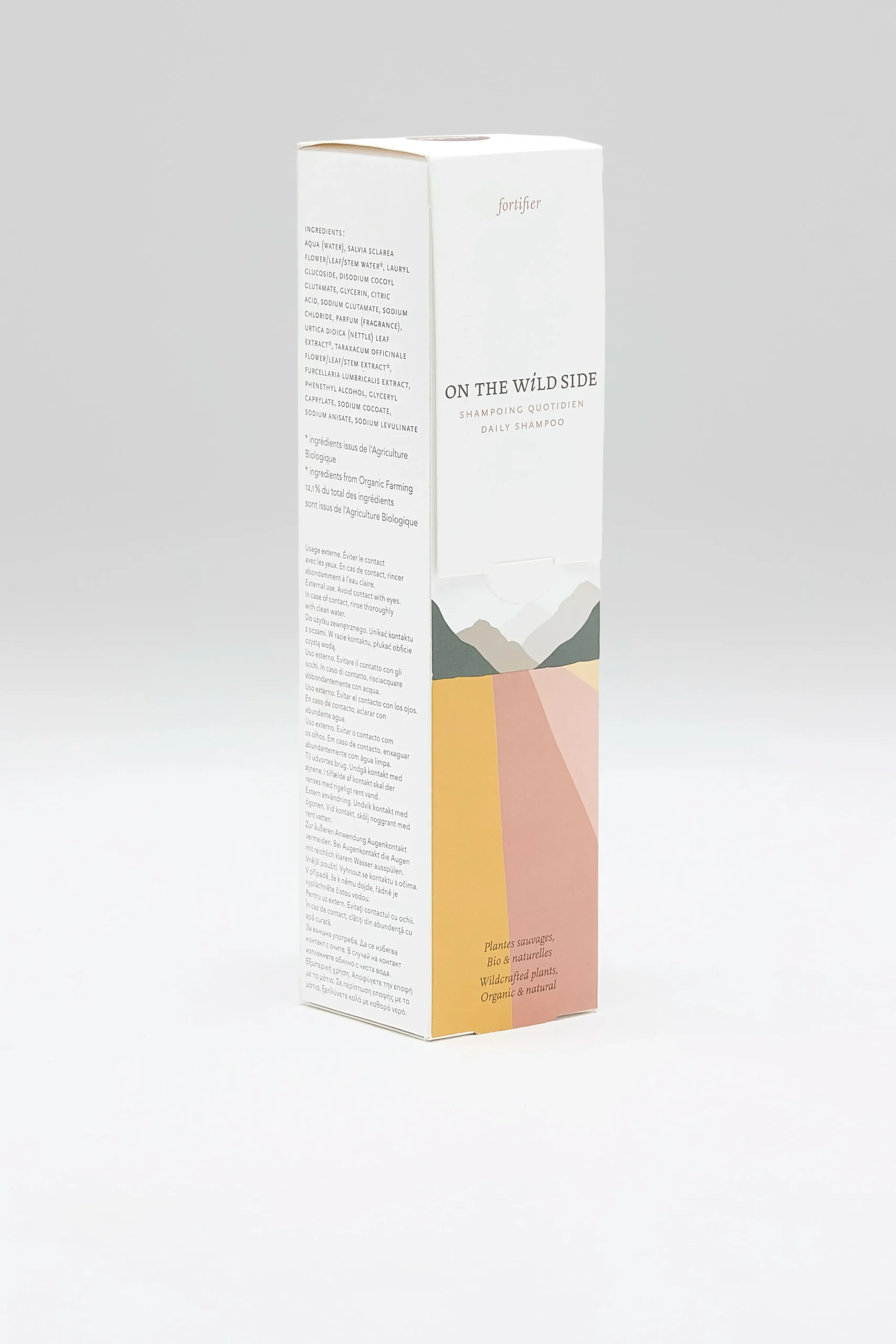 Enriched with certified organic plant oils, On The Wild Side Daily Shampoo enhances hair strength and shine while cleansing and strengthening the scalp.Scent: Natural perfumePrimary ingredients: Certified 100% organic dandelion flower and fortifying nettle. It is silicone, sulphate, and paraben free.Use: Dispense 3 to 4 pumps into the palm of your hand and rub your hands together until you get a lather. Apply to wet hair, massage and rinse thoroughly.External use onlyAvoid contact with your eyes. In case of contact, rinse thoroughly with clean water.Use within 12 months after openingMaterials: Metal bottle with pump