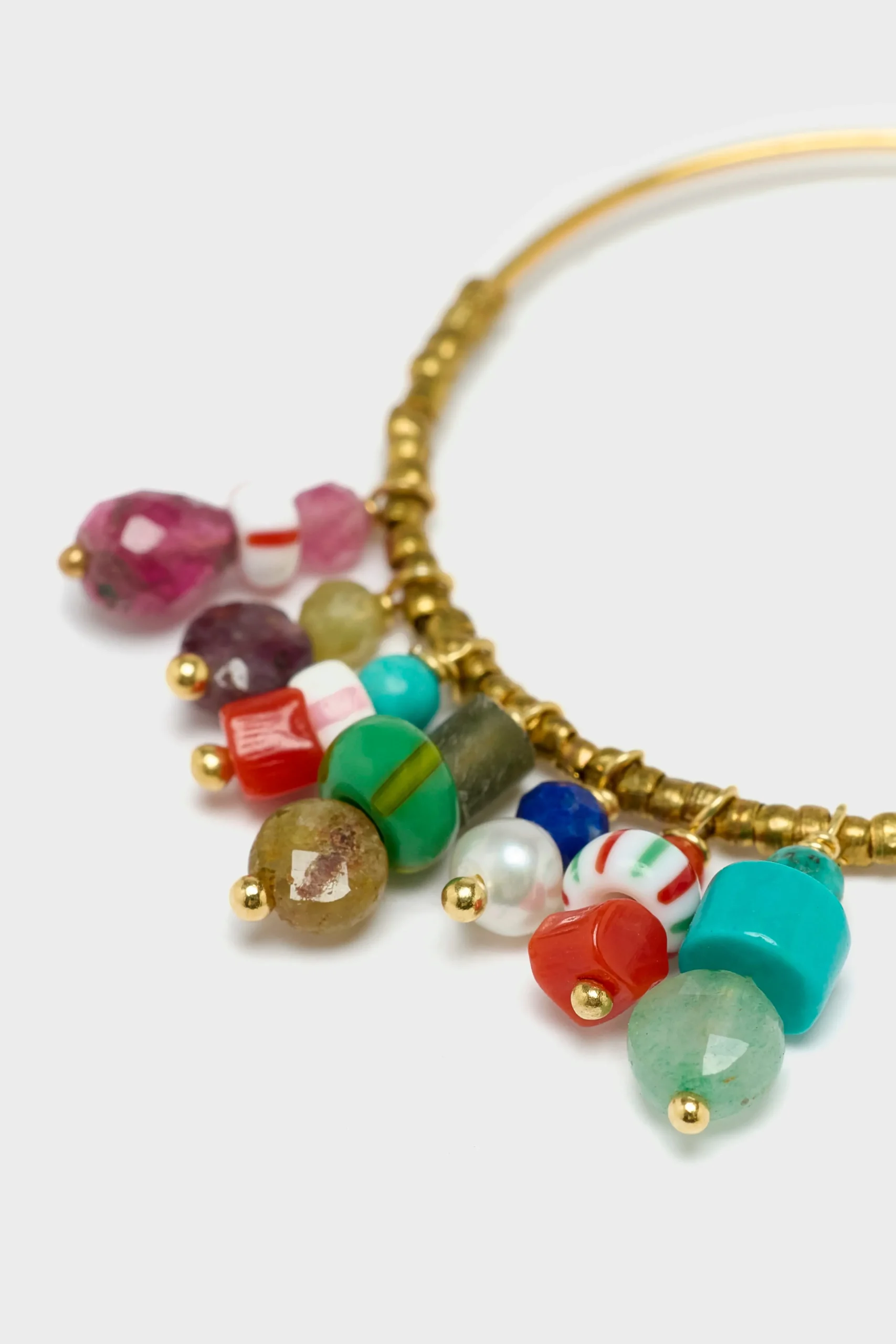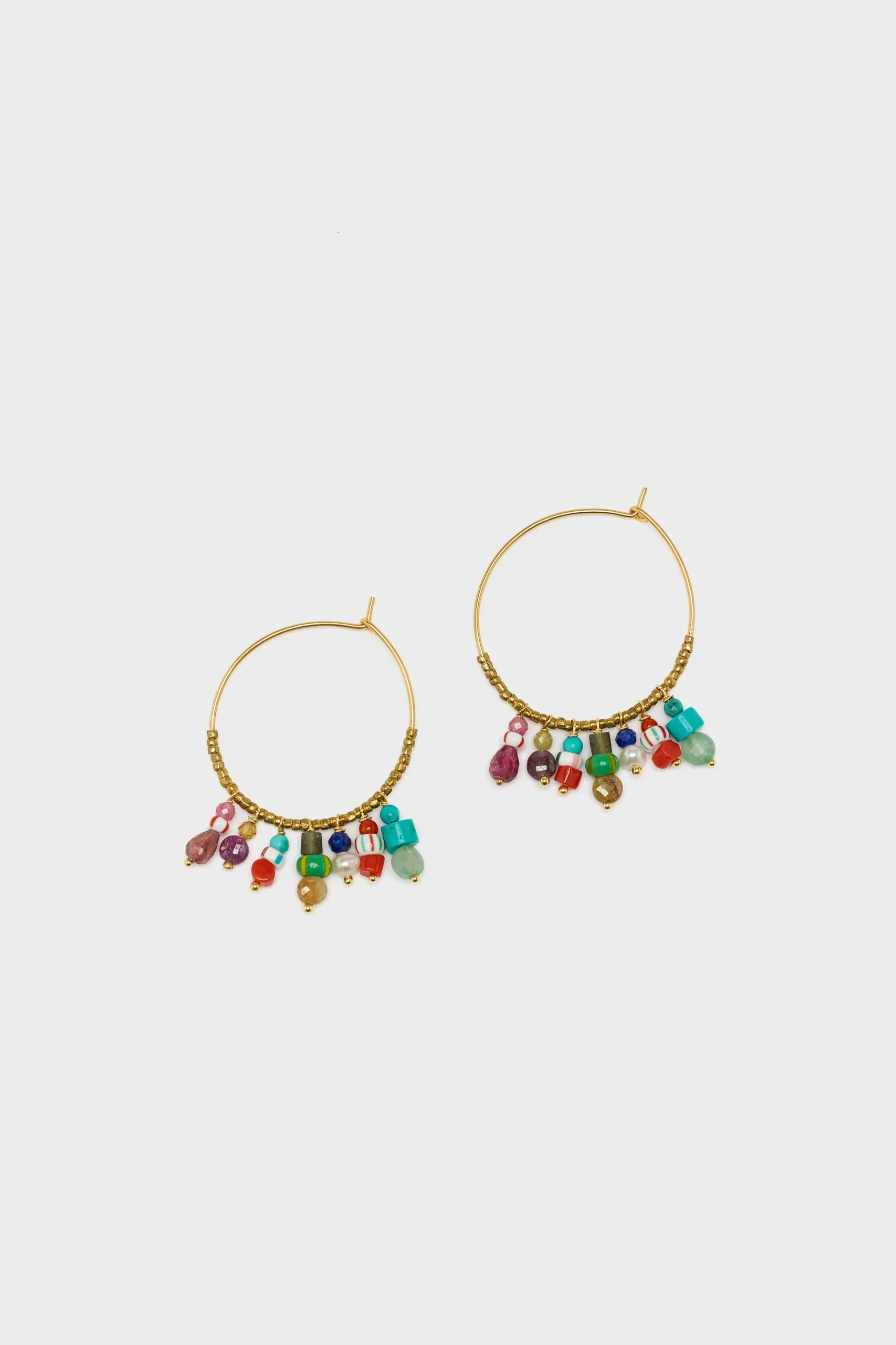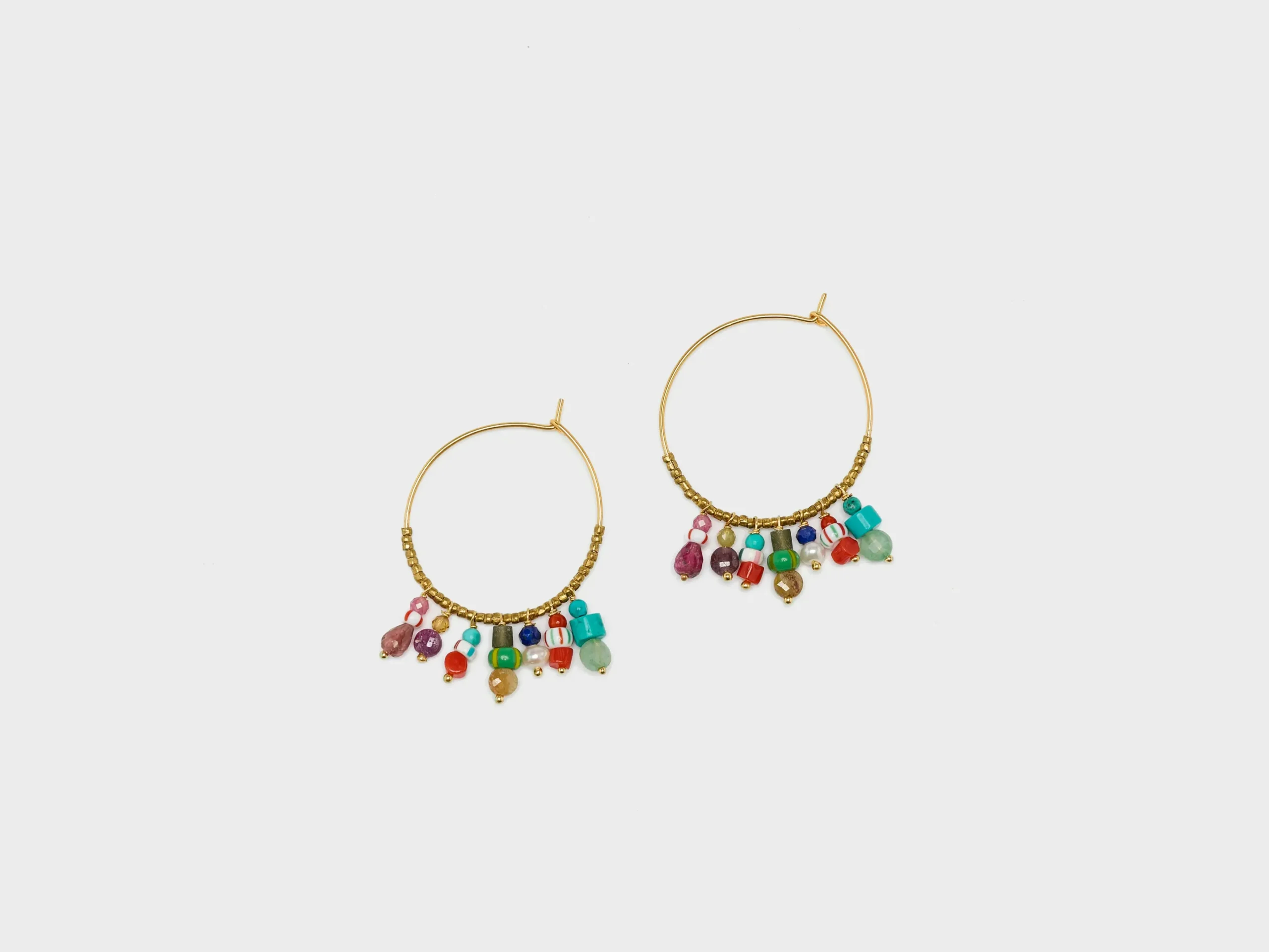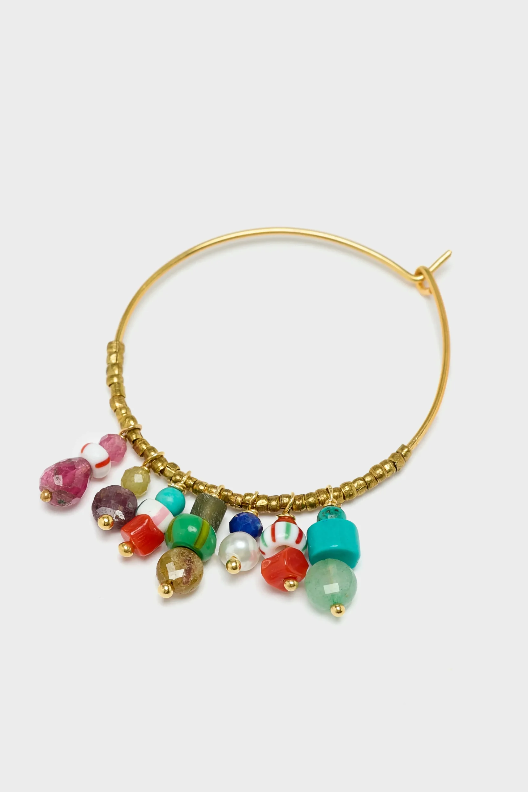 The Untitledition Petra Hoop earrings feature handcrafted brass beads, natural stones, and vintage Venetian trade beads on a vermeil silver 925 hoops.