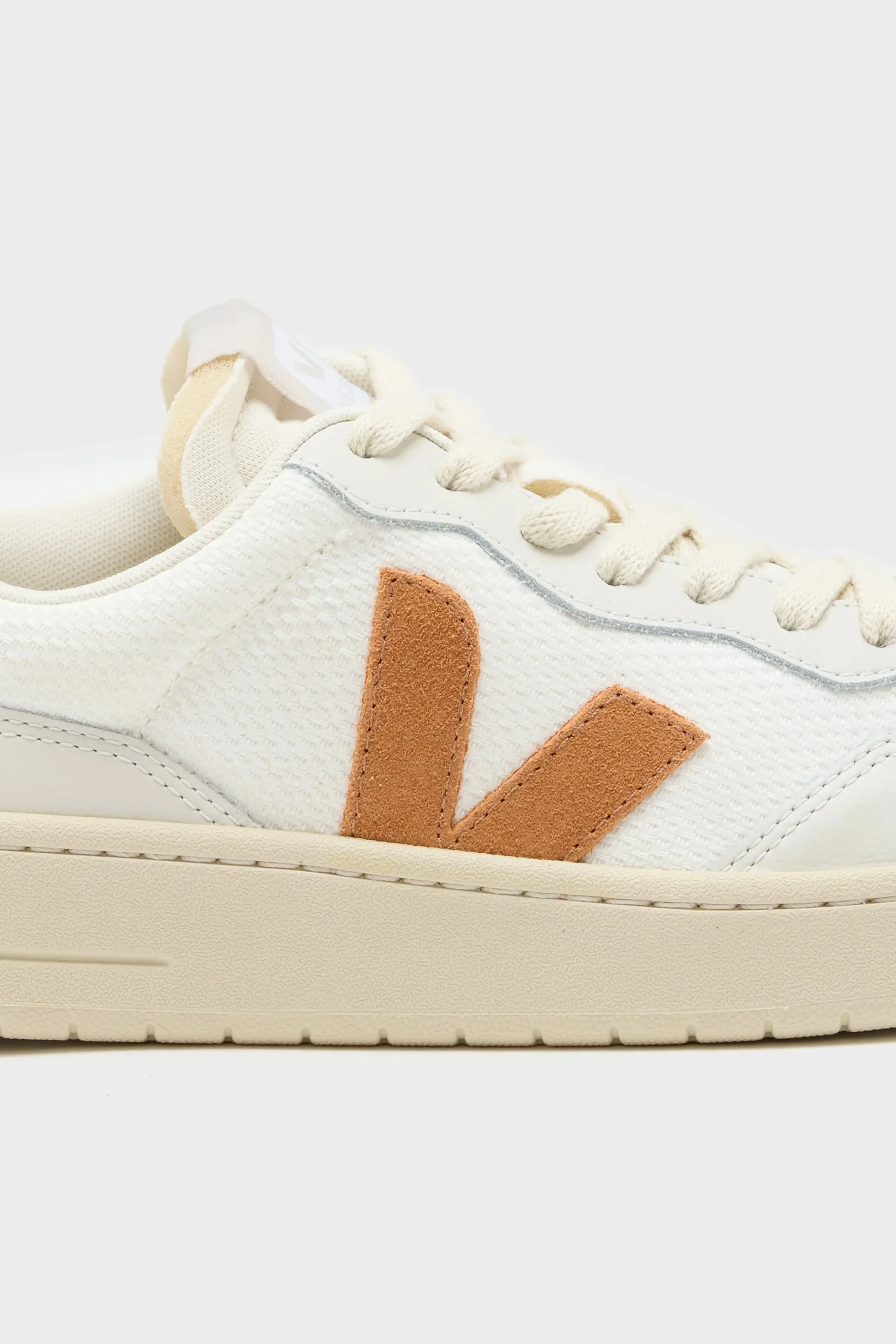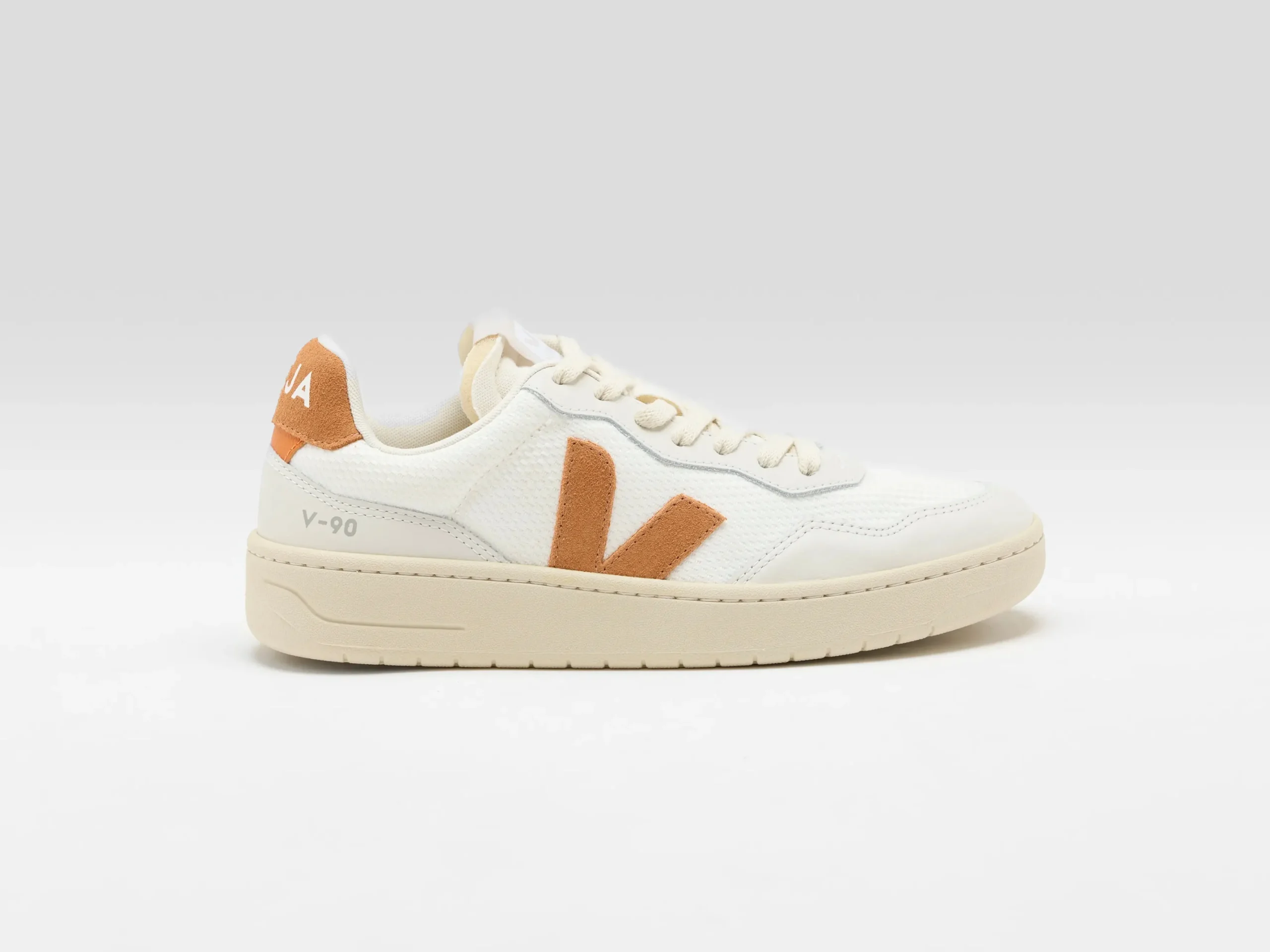 The Veja V-90 B-mesh sneaker features a recycled polyester mesh upper, organically traced leather panels, and a suede V logo.